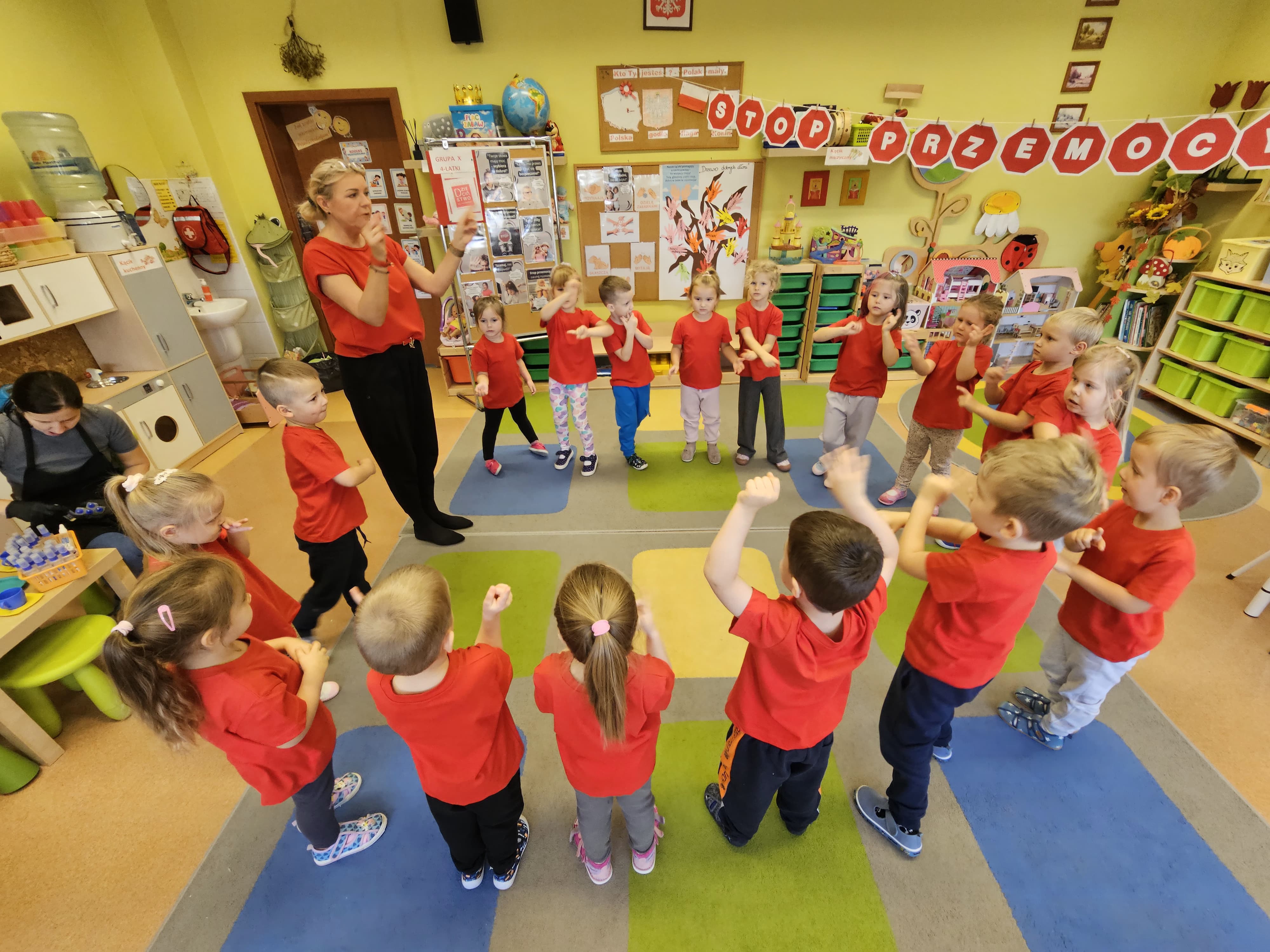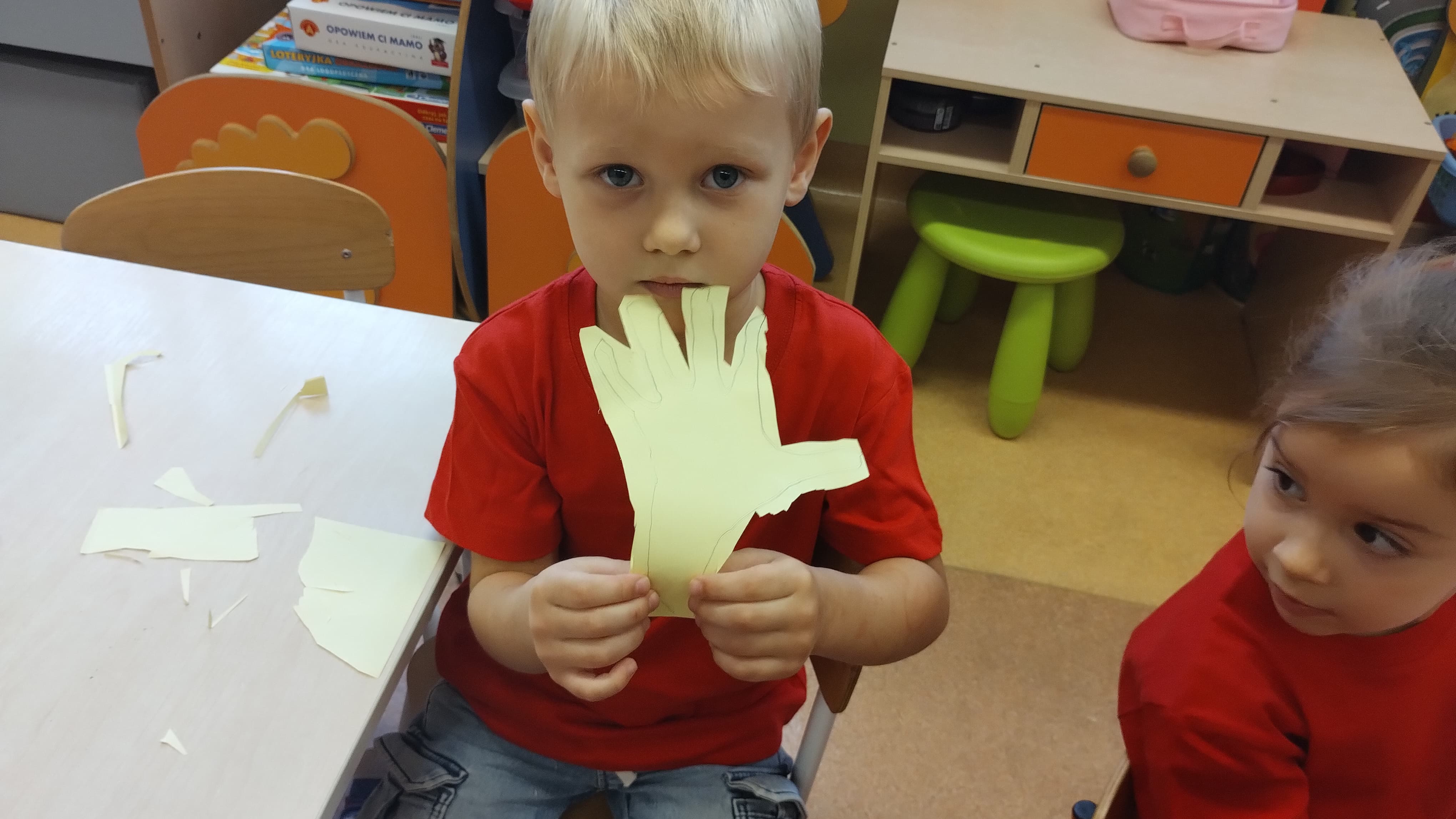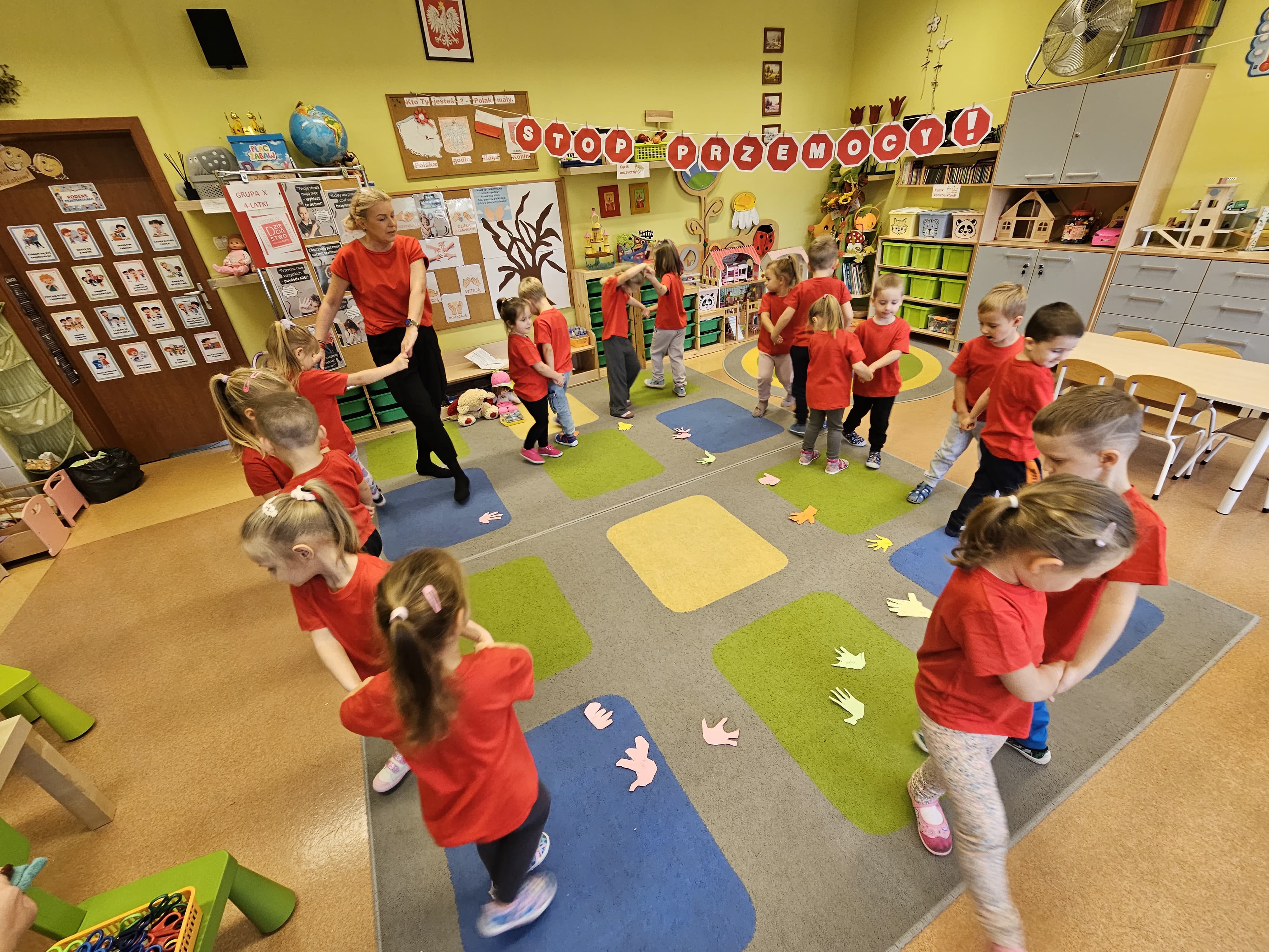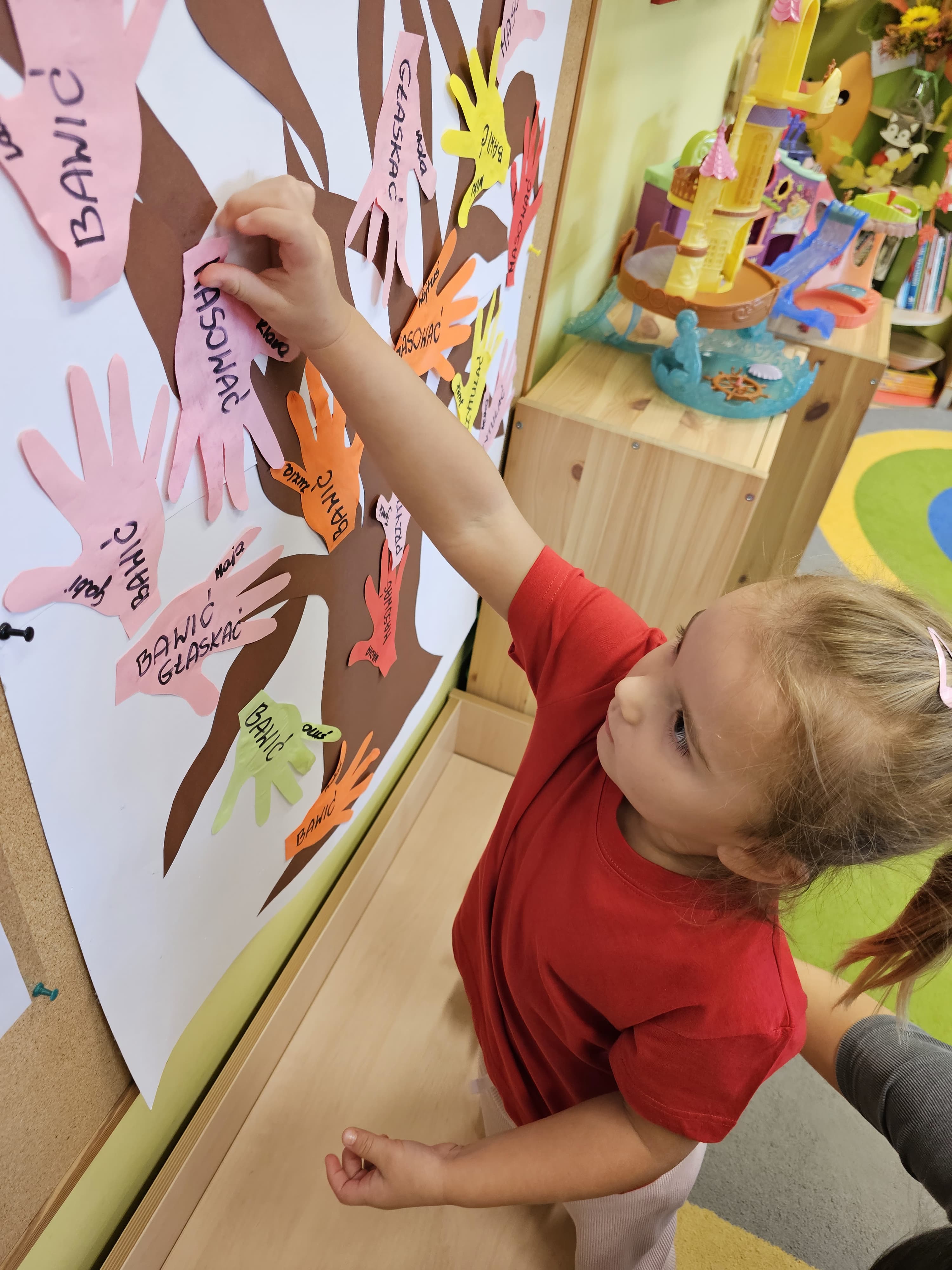13.10. 2025 r. odbyły się wyjątkowe zajęcia w grupie średniaków, pod hasłem „Rączki, które pomagają”, zorganizowane w ramach ogólnopolskiej akcji „Dzieciństwo bez przemocy”. Celem naszych działań było pokazanie dzieciom, że każdy z nas ma moc czynienia dobra – wystarczy uśmiech, dobre słowo i pomocna dłoń. Podczas zajęć przedszkolaki uczestniczyły w zabawach ruchowych, plastycznych i rozmowach , które uczyły, jak ważna jest życzliwość, empatia i współpraca. Dzieci tworzyły własne „Rączki, które pomagają” – wycięte, kolorowe dłonie z zapisanymi dobrymi uczynkami, takimi jak: pomagam, przytulam, dzielę się, przepraszam, głaszczę, witam. Wspólnie powstało piękne „Drzewo dobrych dłoni”, symbol naszej przedszkolnej wspólnoty i wzajemnego wsparcia. Nie zabrakło także opowiadania o Misiu, który nauczył się przepraszać – dzięki niemu dzieci zrozumiały, że każdy może popełnić błąd, ale najważniejsze to umieć go naprawić i powiedzieć „przepraszam”. Na zakończenie każde dziecko otrzymało dyplom uczestnictwa w akcji i obiecało, że jego rączki będą służyć tylko do dobrych uczynków, zgodnie z przesłaniem : „Nasze rączki mogą tworzyć dobro każdego dnia – pomagając, przytulając i niosąc uśmiech innym.”
