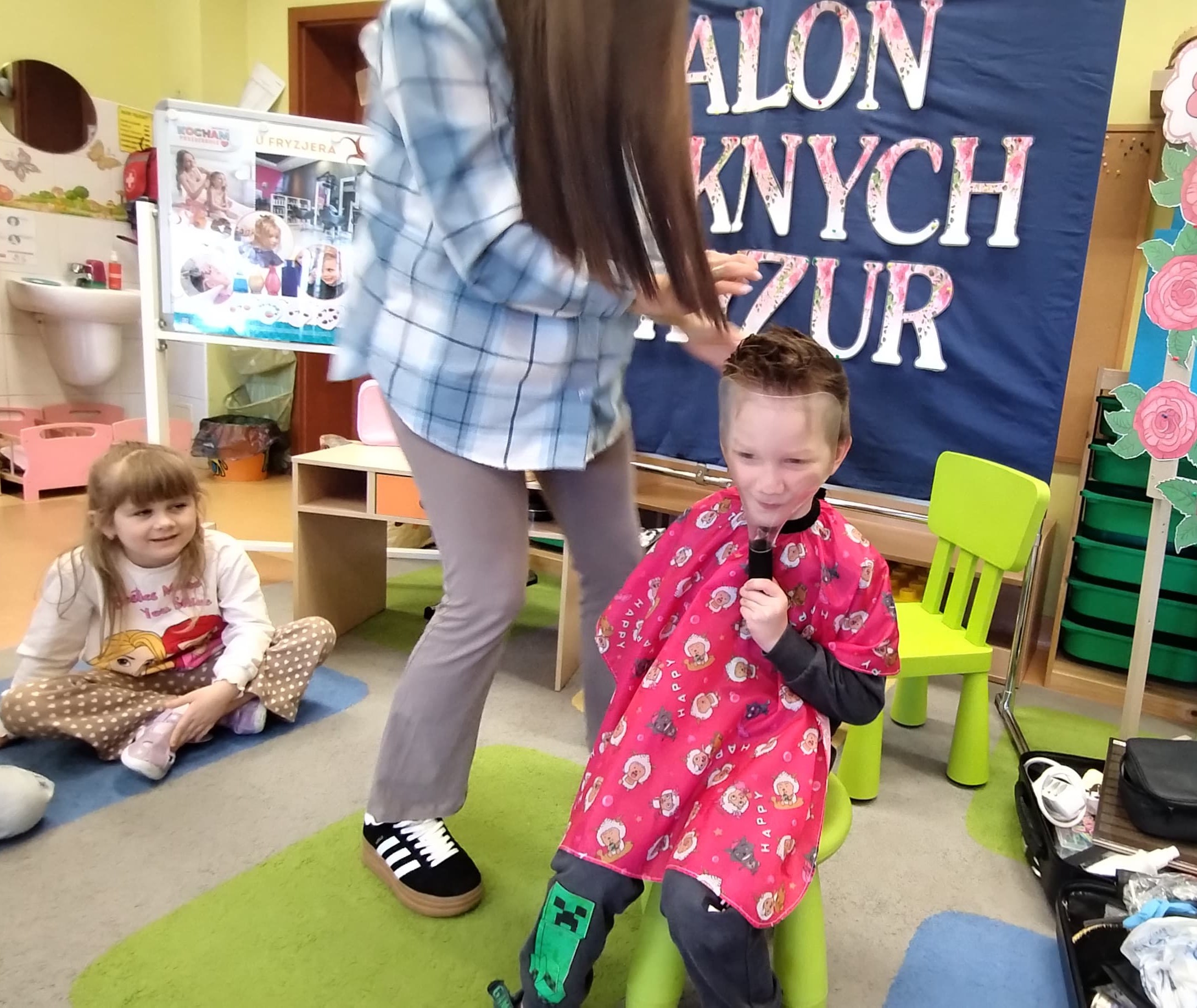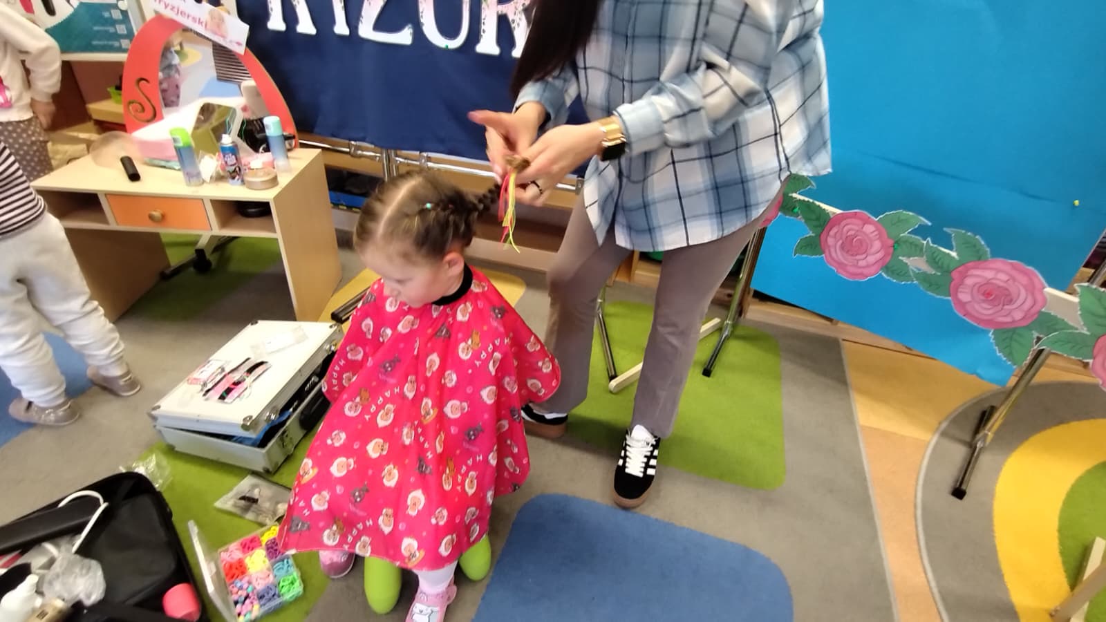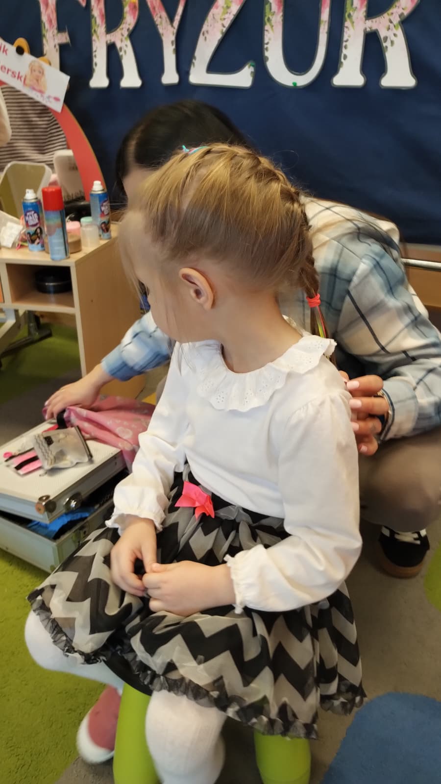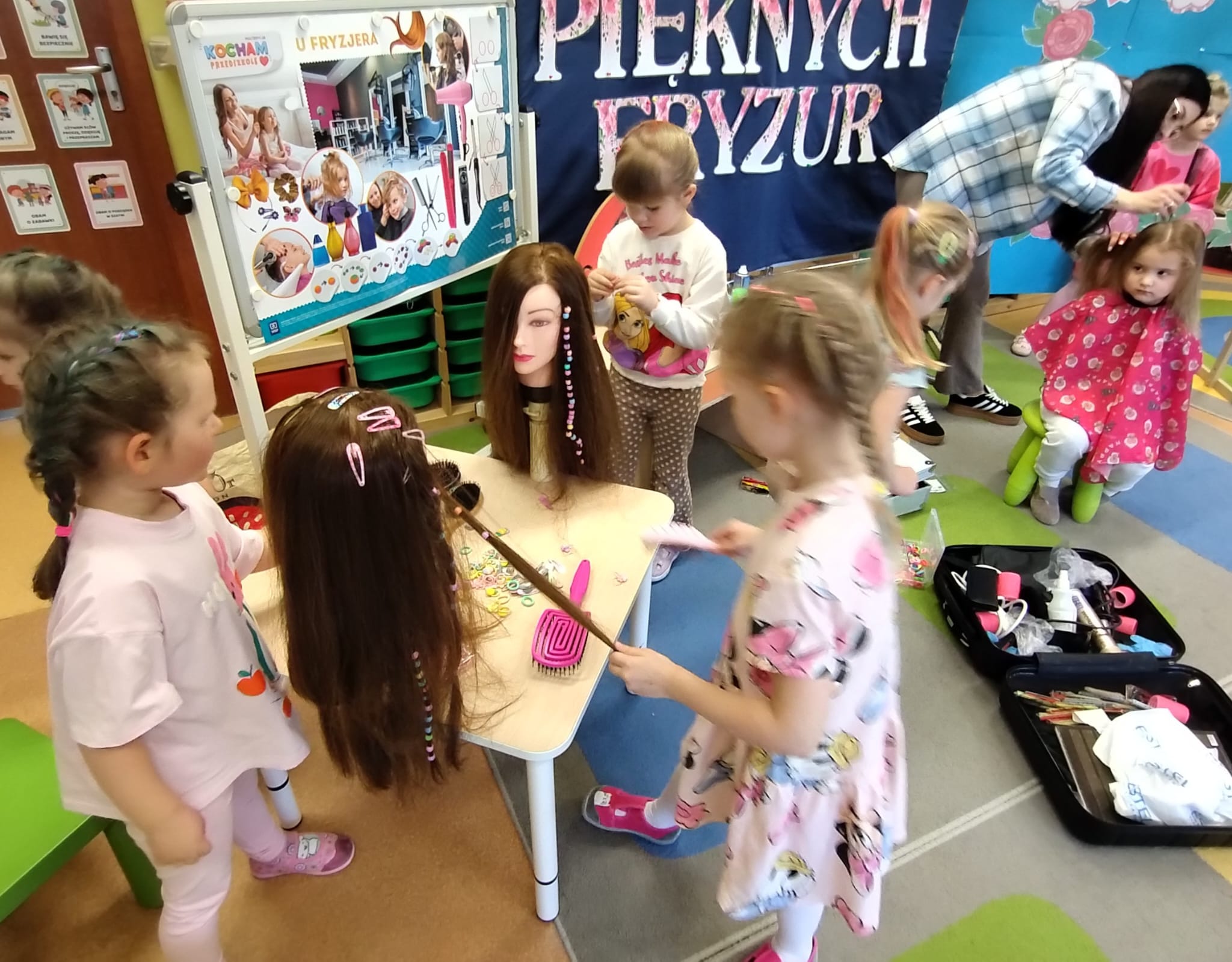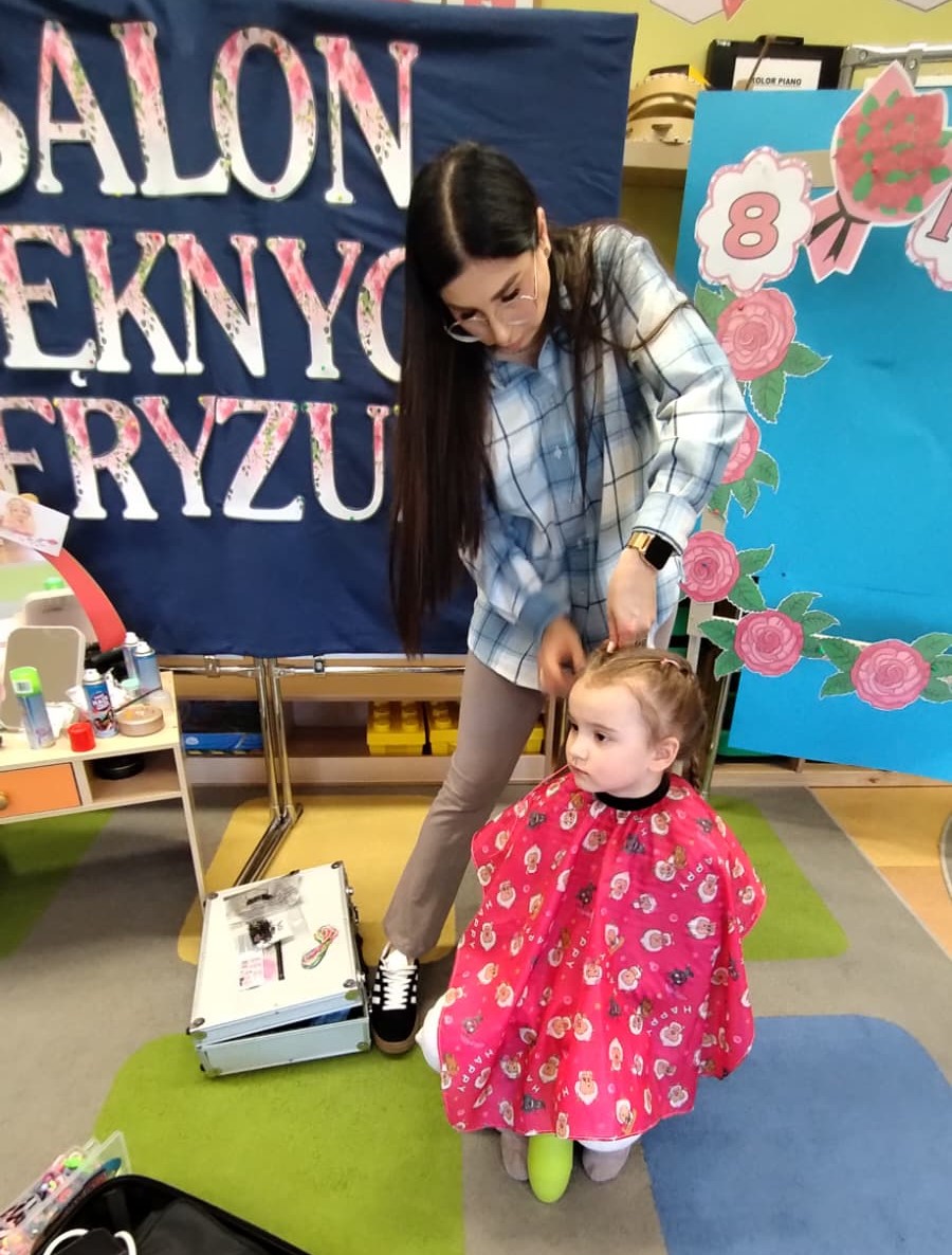 „ …. Być kobietą, być kobietą marzę ciągle będąc dzieckiem …” Która mała dziewczynka nie snuje wyobrażeń o byciu kobietą ??? Chyba każda, a celebrowanie Dnia Kobiet, na pewno pozwoliło przybliżyć te wyobrażenia. Choć Dzień Kobiet kojarzy nam się często z kwiatami, upominkami, których także nie zabrakło, to w grupie X tego dnia, dziewczynki mogły poczuć się, jak w prawdziwym salonie fryzjerskim, a to za sprawą spotkania z panią fryzjerką. Dnia 9. 03. 2026 odwiedziła nas mama Zuzi - pani Klaudia, której pasją i zawodem jest właśnie fryzjerstwo. I to dzięki pani Klaudii, dziewczynki mogły poczuć się tak wyjątkowo. Zanim jednak to nastąpiło, przedszkolaki miały wyjątkową okazję poznać zawód fryzjera! Podczas tej niezwykłej wizyty dzieci dowiedziały się, na czym polega praca fryzjera, jakie narzędzia są niezbędne w salonie fryzjerskim oraz jak prawidłowo dbać o włosy. Największą atrakcją spotkania był pokaz stylizacji fryzur, w którym modelkami zostały nasze dziewczynki oraz chłopcy. Dzieci z zaciekawieniem obserwowały, jak pani Klaudia - tworzy piękne upięcia, warkocze i loki, wykorzystując profesjonalne narzędzia. Same też mogły tworzyć fryzury na profesjonalnym manekinie fryzjerskim. Nie zabrakło również rozmów o różnych fryzjerskich trikach i porad na temat pielęgnacji włosów. Niespodzianka również czekała na chłopców …. „ kolorowy trik” na włosach. To spotkanie było nie tylko świetną zabawą, ale też cenną lekcją o jednym z ciekawszych, artystycznych zawodów. Kto wie, może wśród naszych przedszkolaków rośnie przyszła mistrzyni lub mistrz fryzjerstwa? Serdecznie dziękujemy naszemu gościowi za wizytę, za suuuper zabawę, wystrzałowe fryzury i poświęcony czas. Czekamy na kolejne inspirujące spotkania z naszymi rodzicami! A po obiadku nastąpił ciąg dalszy świętowania Dnia Kobiet w grupie X. Chłopcy wręczyli dziewczynkom upominki, po czym dzieci wspólnie rozpoczęły biesiadowanie przy słodkościach, o które zatroszczyli się niezawodni rodzice naszych przedszkolaków, za co serdecznie dziękujemy. To był naprawdę bardzo radosny, wypełniony wzajemnym szacunkiem i życzliwością dzień.
