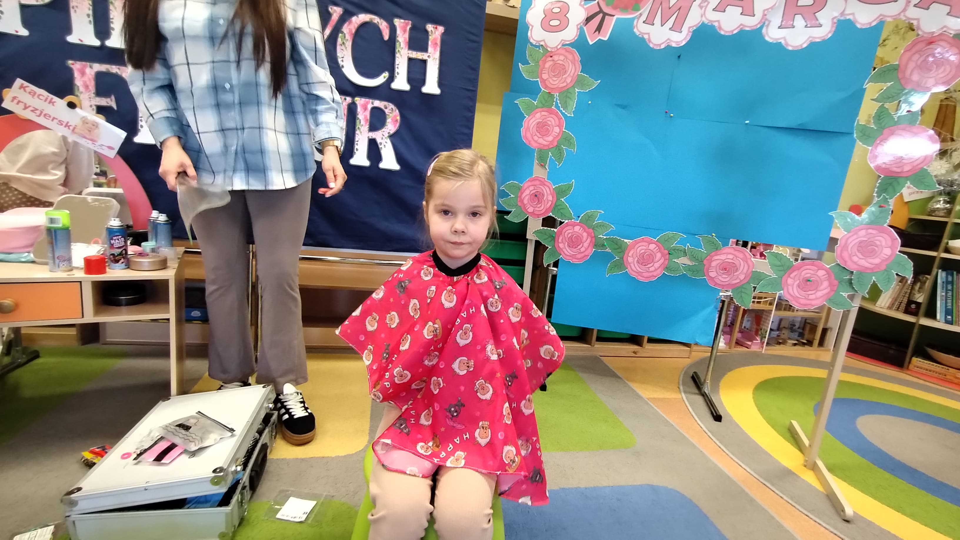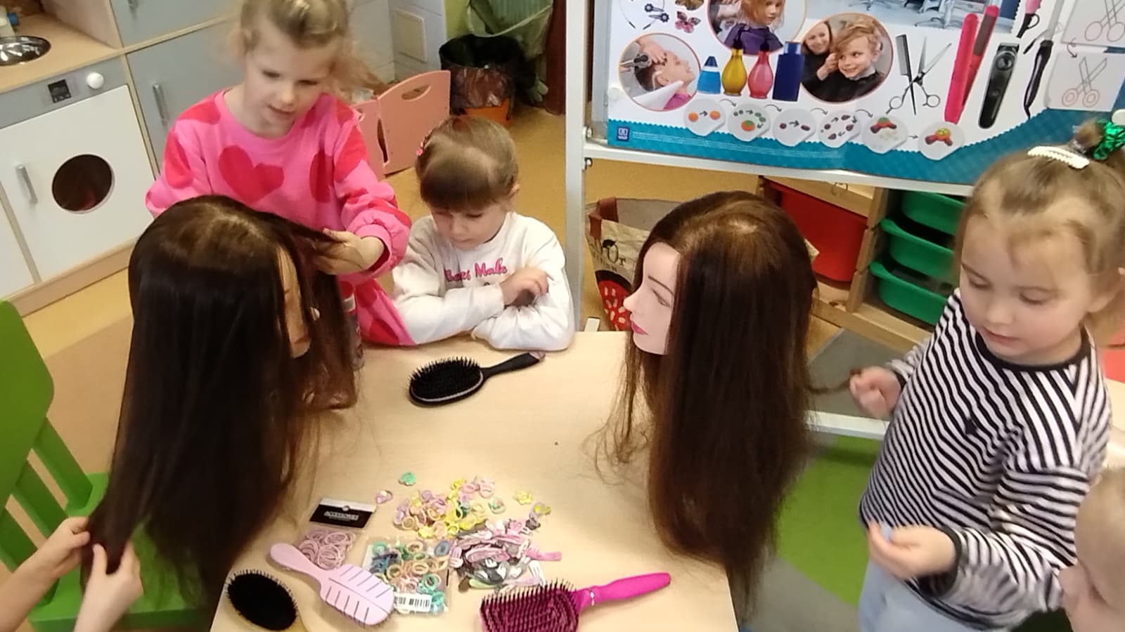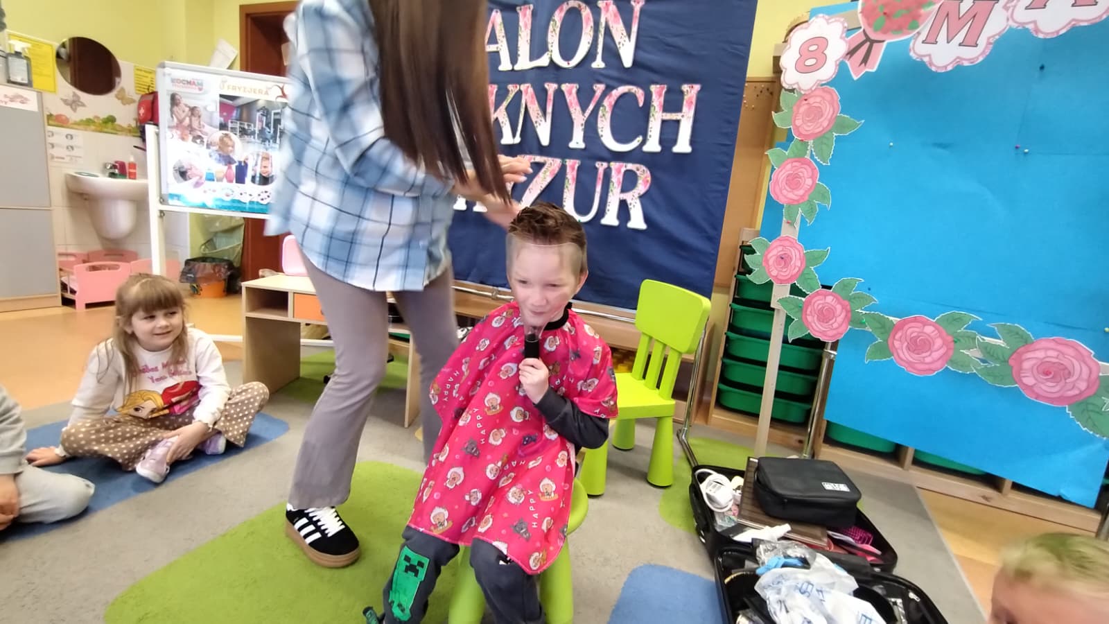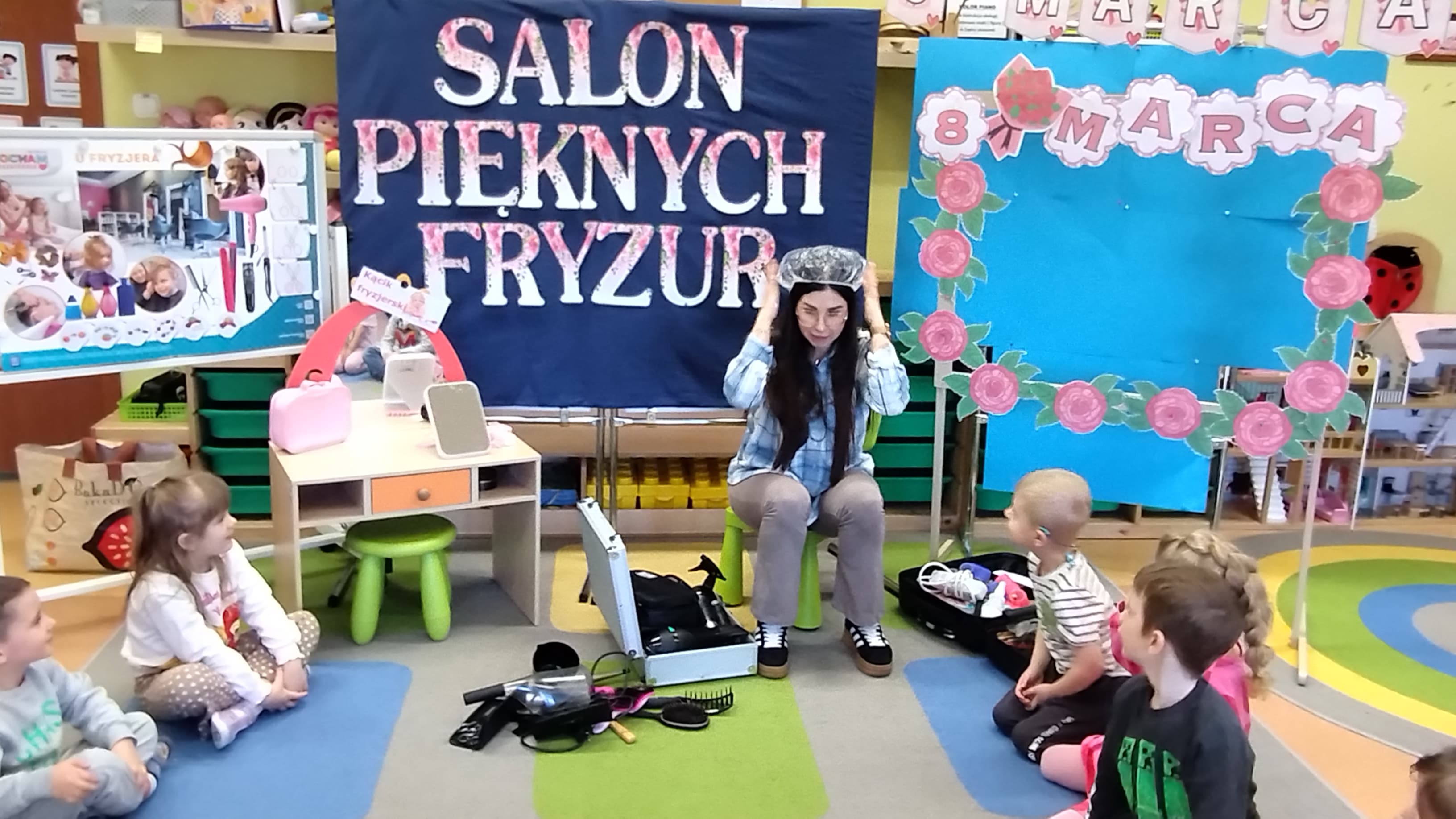 „ …. Być kobietą, być kobietą marzę ciągle będąc dzieckiem …” Która mała dziewczynka nie snuje wyobrażeń o byciu kobietą ??? Chyba każda, a celebrowanie Dnia Kobiet, na pewno pozwoliło przybliżyć te wyobrażenia. Choć Dzień Kobiet kojarzy nam się często z kwiatami, upominkami, których także nie zabrakło, to w grupie X tego dnia, dziewczynki mogły poczuć się, jak w prawdziwym salonie fryzjerskim, a to za sprawą spotkania z panią fryzjerką. Dnia 9. 03. 2026 odwiedziła nas mama Zuzi - pani Klaudia, której pasją i zawodem jest właśnie fryzjerstwo. I to dzięki pani Klaudii, dziewczynki mogły poczuć się tak wyjątkowo. Zanim jednak to nastąpiło, przedszkolaki miały wyjątkową okazję poznać zawód fryzjera! Podczas tej niezwykłej wizyty dzieci dowiedziały się, na czym polega praca fryzjera, jakie narzędzia są niezbędne w salonie fryzjerskim oraz jak prawidłowo dbać o włosy. Największą atrakcją spotkania był pokaz stylizacji fryzur, w którym modelkami zostały nasze dziewczynki oraz chłopcy. Dzieci z zaciekawieniem obserwowały, jak pani Klaudia - tworzy piękne upięcia, warkocze i loki, wykorzystując profesjonalne narzędzia. Same też mogły tworzyć fryzury na profesjonalnym manekinie fryzjerskim. Nie zabrakło również rozmów o różnych fryzjerskich trikach i porad na temat pielęgnacji włosów. Niespodzianka również czekała na chłopców …. „ kolorowy trik” na włosach. To spotkanie było nie tylko świetną zabawą, ale też cenną lekcją o jednym z ciekawszych, artystycznych zawodów. Kto wie, może wśród naszych przedszkolaków rośnie przyszła mistrzyni lub mistrz fryzjerstwa? Serdecznie dziękujemy naszemu gościowi za wizytę, za suuuper zabawę, wystrzałowe fryzury i poświęcony czas. Czekamy na kolejne inspirujące spotkania z naszymi rodzicami! A po obiadku nastąpił ciąg dalszy świętowania Dnia Kobiet w grupie X. Chłopcy wręczyli dziewczynkom upominki, po czym dzieci wspólnie rozpoczęły biesiadowanie przy słodkościach, o które zatroszczyli się niezawodni rodzice naszych przedszkolaków, za co serdecznie dziękujemy. To był naprawdę bardzo radosny, wypełniony wzajemnym szacunkiem i życzliwością dzień.