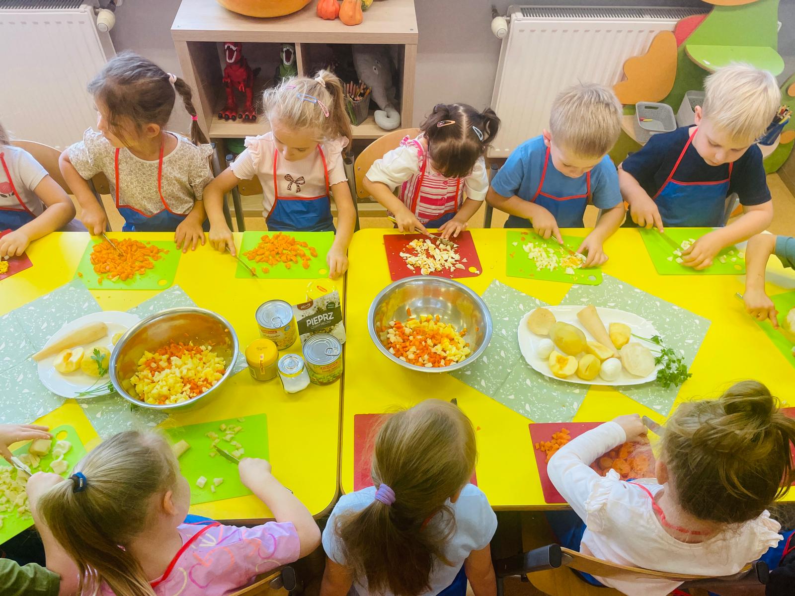 Jesień wielu kojarzy się z deszczową pogodą i szarugą. Ale w naszym przedszkolu udowodniliśmy już wiele razy, że ta pora roku potrafi być również niezwykle kolorowa. A co, jeśli kolory miałyby również smak i zapach? Realizując projekt edukacyjny „Smaki jesieni” , podczas jesiennych atrakcji kulinarnych w gr. XI przedszkolaki sprawdziły, że kolorowe warzywa i owoce, również te sezonowe, smakują i pachną wyśmienicie. Szczególnie jeśli się je ze sobą połączy. Wszyscy podkreślaliśmy walory zdrowotne owoców i warzyw. W ten oto sposób powstały zdrowe sałatki pełne pięknych barw, które przedszkolaki mogły samodzielnie spałaszować.