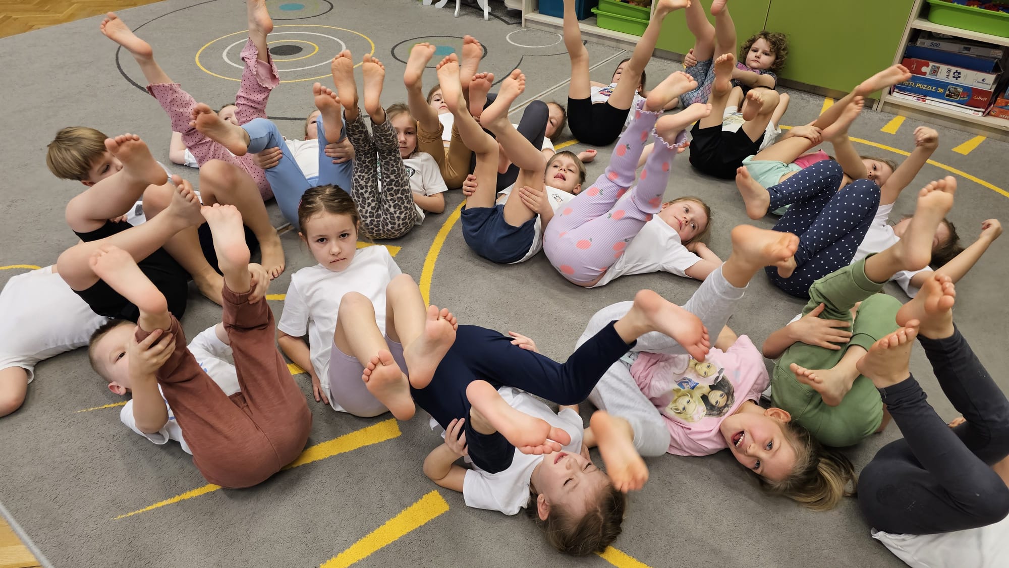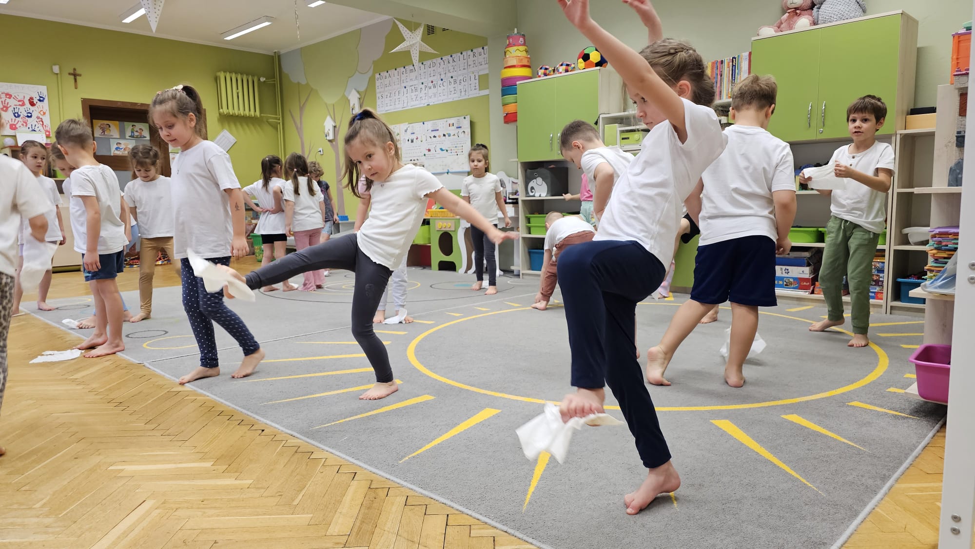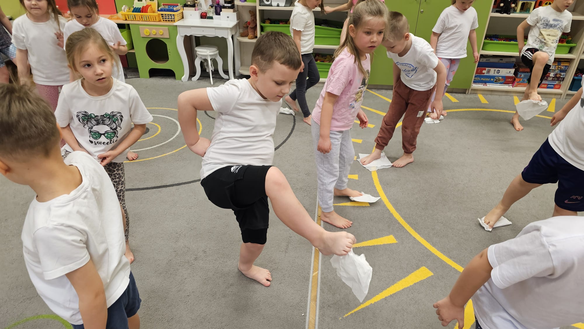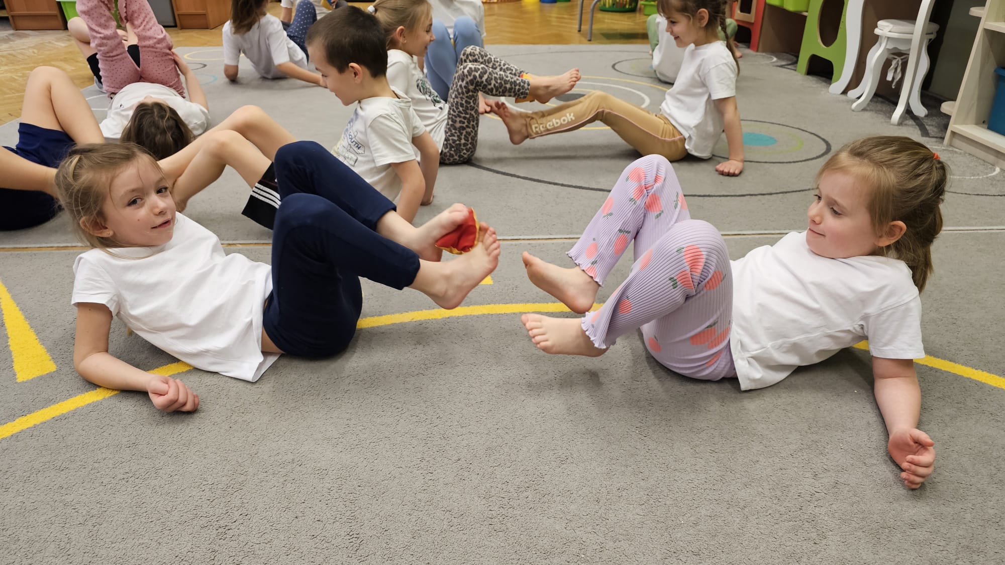 W oczekiwaniu na bardziej sprzyjającą aurę, by bezpiecznie uprawiać Nordic Walking w terenie, grupa IV starszaków nie próżnuje, ale ćwiczy i wzmacnia poszczególne grupy mięśniowe. Tym razem jest to stopa – bardzo ważna część, bo to przecież podstawa całego ciała. To ona jako pierwsza styka się z podłożem i przenosi ciężar na wyższe partie układu ruchu. Prawidłowo wykształcone mięśnie i sklepienia stopy zapewniają amortyzację, stabilność oraz właściwe ustawienie nóg, miednicy i kręgosłupa. Regularne ćwiczenia stóp mają bardzo duże znaczenie w przygotowaniu i prawidłowym uprawianiu Nordic Walkingu, ponieważ stopa stanowi podstawę całego łańcucha ruchu podczas marszu z kijkami. Wzmocnione mięśnie stóp zapewniają lepszą stabilizację i amortyzację, co pozwala na prawidłowe przetaczanie stopy od pięty do palców. Dzięki temu krok staje się dłuższy, bardziej sprężysty i ekonomiczny, a odbicie z palców skuteczniejsze, co bezpośrednio wpływa na tempo marszu i pracę kończyn górnych z kijkami. Dobra sprawność stóp poprawia równowagę i kontrolę postawy, szczególnie na nierównym podłożu, które często występuje podczas marszu w terenie. Zmniejsza to ryzyko przeciążeń stawów skokowych, kolan i kręgosłupa oraz zapobiega urazom. Prawidłowo funkcjonujące sklepienia stopy wspomagają stabilne ustawienie kończyn dolnych i miednicy, co umożliwia zachowanie wyprostowanej sylwetki, aktywnej pracy tułowia i efektywnej współpracy rąk z kijami. W efekcie Nordic Walking staje się bardziej płynny, bezpieczny i korzystny dla całego układu ruchu. Mając to wszystko na uwadze dzieci z ochotą i dużym zaangażowaniem wykonywały zaproponowane im ćwiczenia i zabawy czerpiąc radość oraz satysfakcję.