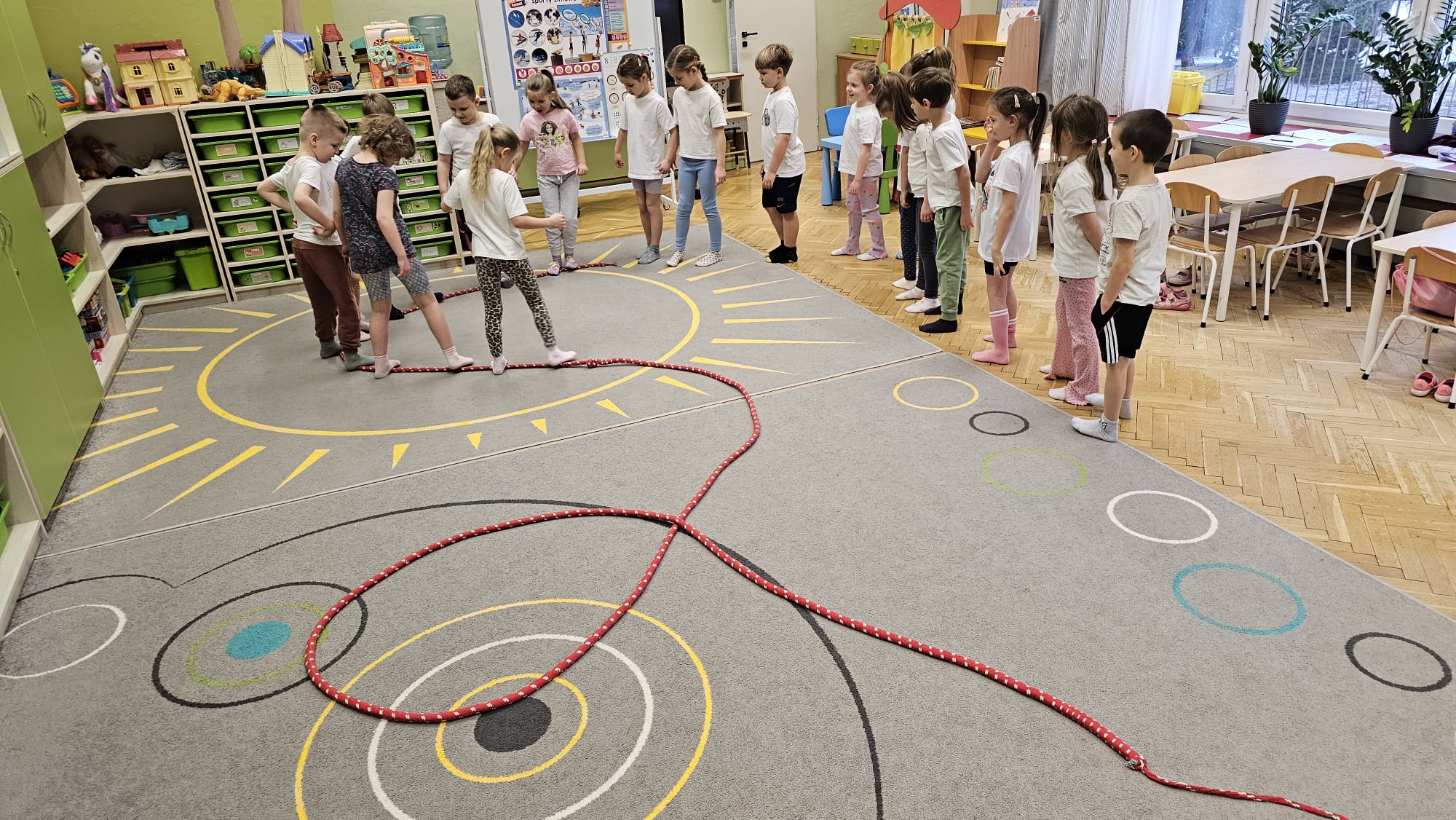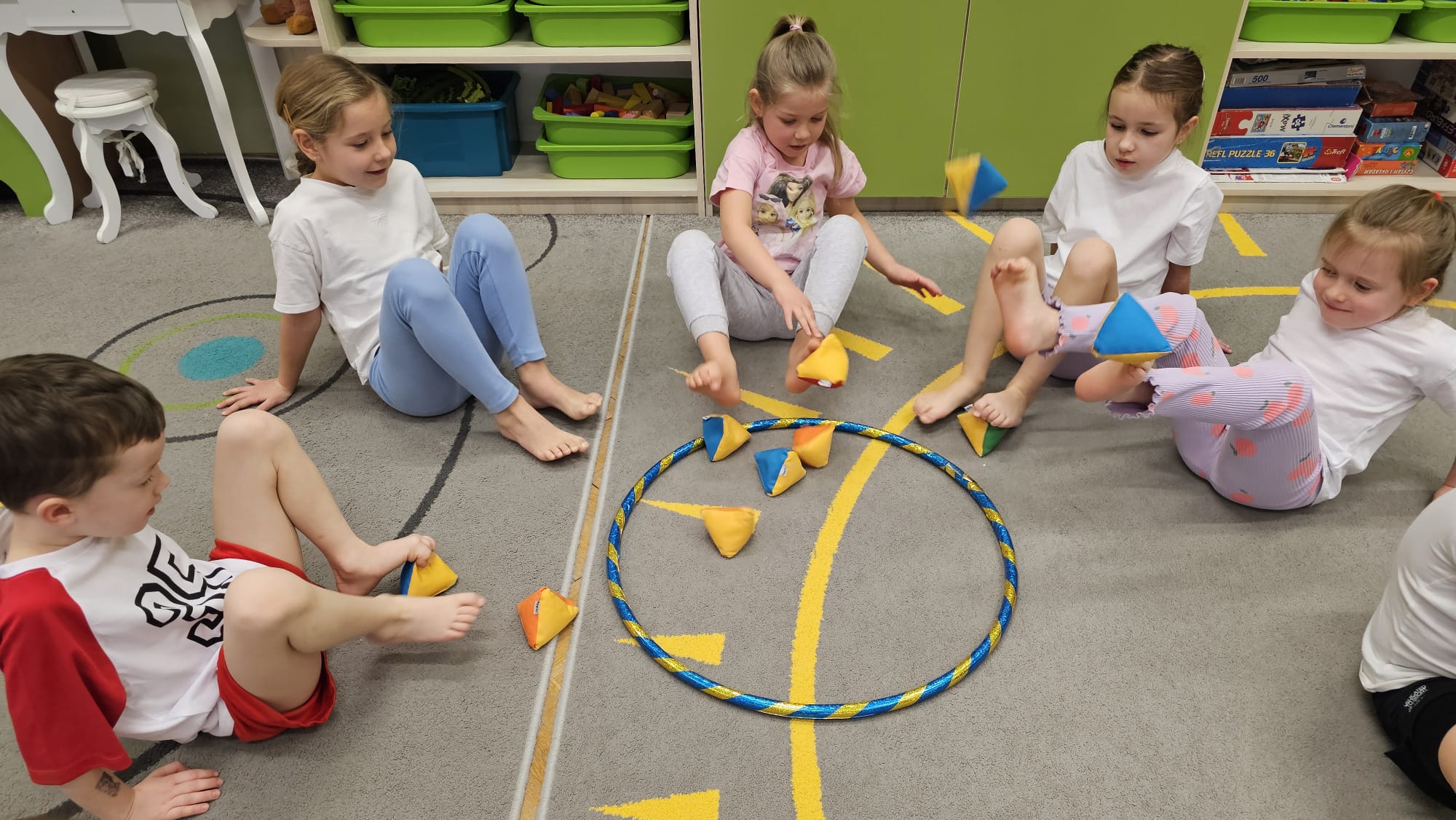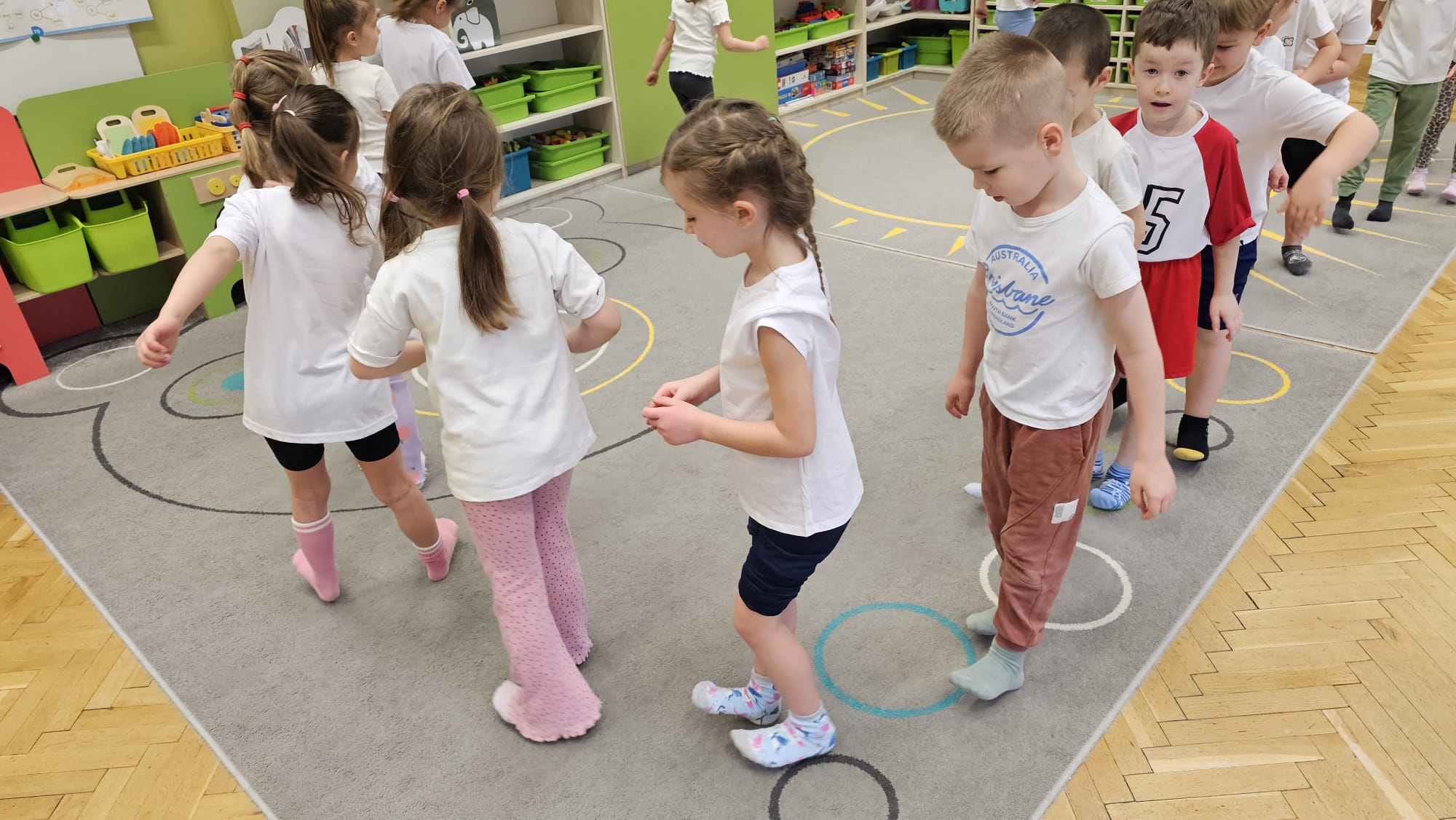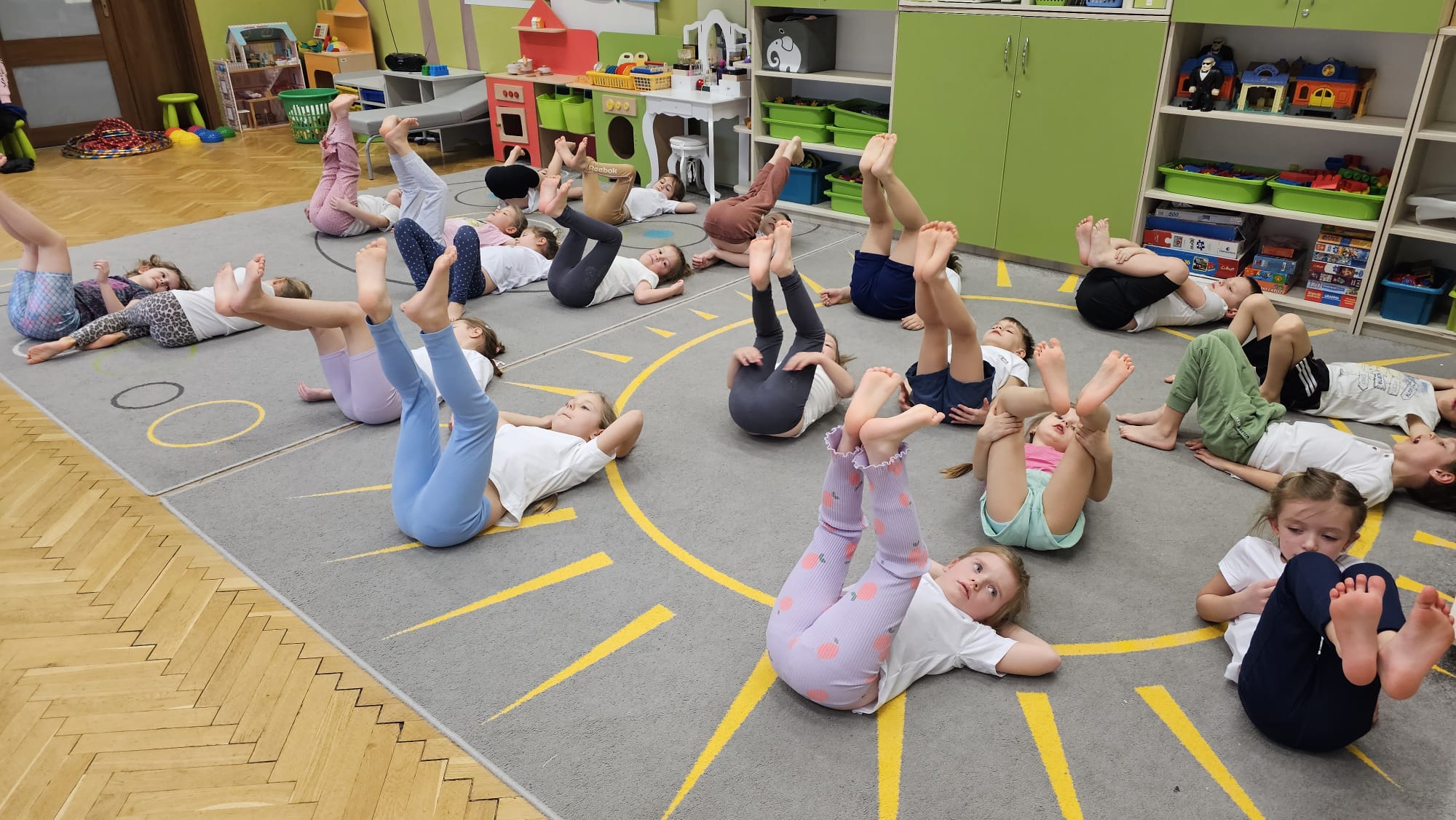 W oczekiwaniu na bardziej sprzyjającą aurę, by bezpiecznie uprawiać Nordic Walking w terenie, grupa IV starszaków nie próżnuje, ale ćwiczy i wzmacnia poszczególne grupy mięśniowe. Tym razem jest to stopa – bardzo ważna część, bo to przecież podstawa całego ciała. To ona jako pierwsza styka się z podłożem i przenosi ciężar na wyższe partie układu ruchu. Prawidłowo wykształcone mięśnie i sklepienia stopy zapewniają amortyzację, stabilność oraz właściwe ustawienie nóg, miednicy i kręgosłupa. Regularne ćwiczenia stóp mają bardzo duże znaczenie w przygotowaniu i prawidłowym uprawianiu Nordic Walkingu, ponieważ stopa stanowi podstawę całego łańcucha ruchu podczas marszu z kijkami. Wzmocnione mięśnie stóp zapewniają lepszą stabilizację i amortyzację, co pozwala na prawidłowe przetaczanie stopy od pięty do palców. Dzięki temu krok staje się dłuższy, bardziej sprężysty i ekonomiczny, a odbicie z palców skuteczniejsze, co bezpośrednio wpływa na tempo marszu i pracę kończyn górnych z kijkami. Dobra sprawność stóp poprawia równowagę i kontrolę postawy, szczególnie na nierównym podłożu, które często występuje podczas marszu w terenie. Zmniejsza to ryzyko przeciążeń stawów skokowych, kolan i kręgosłupa oraz zapobiega urazom. Prawidłowo funkcjonujące sklepienia stopy wspomagają stabilne ustawienie kończyn dolnych i miednicy, co umożliwia zachowanie wyprostowanej sylwetki, aktywnej pracy tułowia i efektywnej współpracy rąk z kijami. W efekcie Nordic Walking staje się bardziej płynny, bezpieczny i korzystny dla całego układu ruchu. Mając to wszystko na uwadze dzieci z ochotą i dużym zaangażowaniem wykonywały zaproponowane im ćwiczenia i zabawy czerpiąc radość oraz satysfakcję.