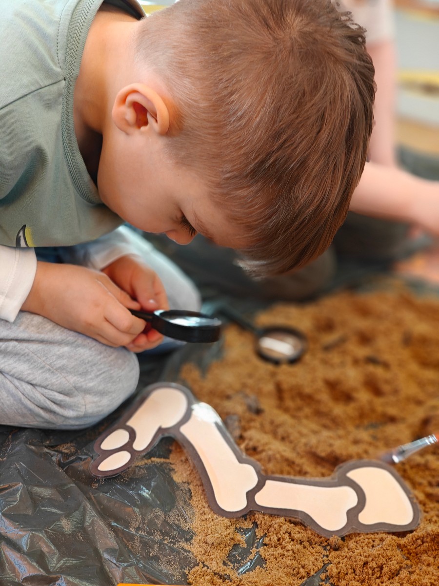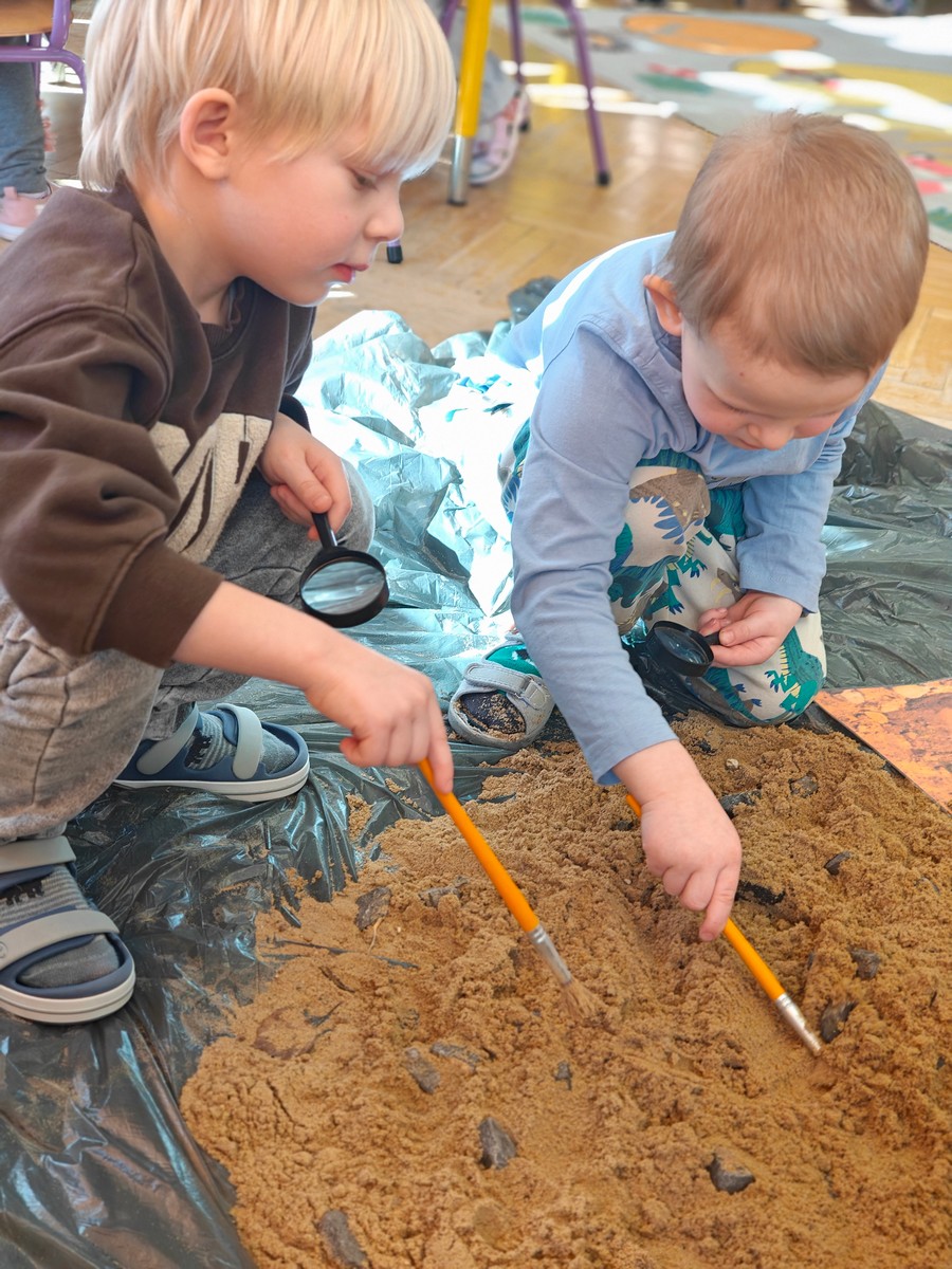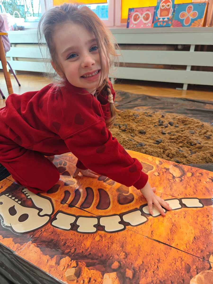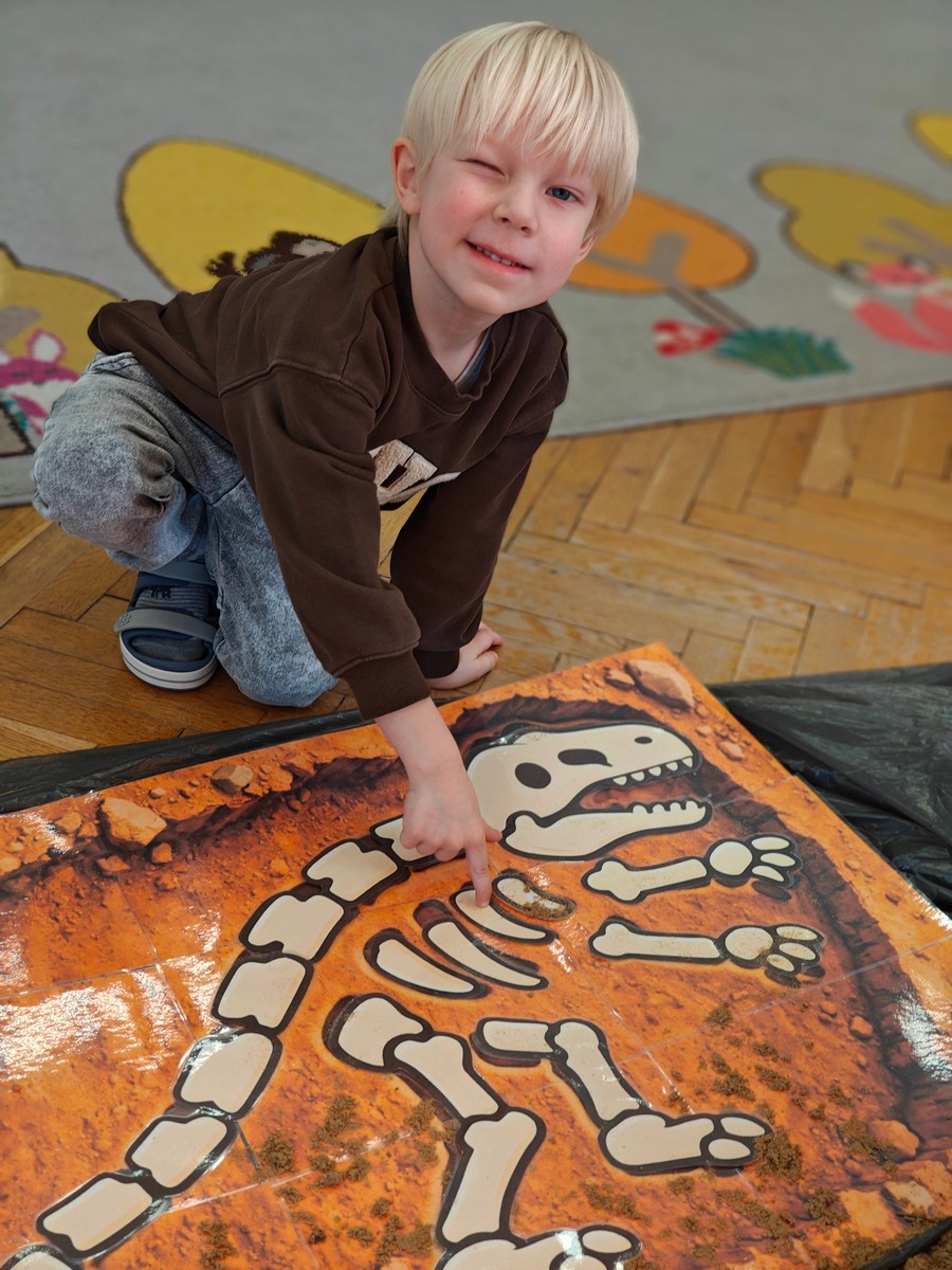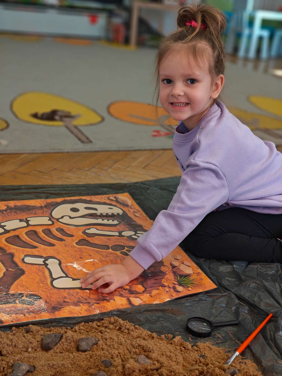 Dzieci z ogromnym zainteresowaniem przeniosły się w odległe czasy, aby poznać niezwykły świat dinozaurów i dowiedzieć się, jak wyglądało życie na Ziemi miliony lat temu. Podczas zajęć przedszkolaki poznawały różne gatunki dinozaurów, ich wygląd, sposób życia oraz ciekawostki związane z prehistorycznym światem. Dzieci z zaciekawieniem oglądały książki i ilustracje, słuchały opowiadań i uczestniczyły w rozmowach. W trakcie realizacji projektu nie zabrakło wielu ciekawych aktywności. Dużym zainteresowaniem cieszyły się zajęcia badawcze i eksperymenty. Dzieci obserwowały eksperyment przedstawiający wybuch wulkanu, dzięki czemu mogły dowiedzieć się, jakie zjawiska przyrodnicze występowały na Ziemi w czasach prehistorycznych. Przedszkolaki wcielały się w rolę małych paleontologów, poszukiwały „dinozaurowe skamieniałości”, tropiły ślady dinozaurów oraz brały udział w zabawach ruchowych i dydaktycznych związanych z tematyką prehistorii. Realizacja projektu była dla dzieci fascynującą przygodą i okazją do zdobywania nowej wiedzy poprzez zabawę, doświadczenia i wspólne odkrywanie tajemnic prehistorycznego świata dinozaurów. Zapraszamy do galerii!