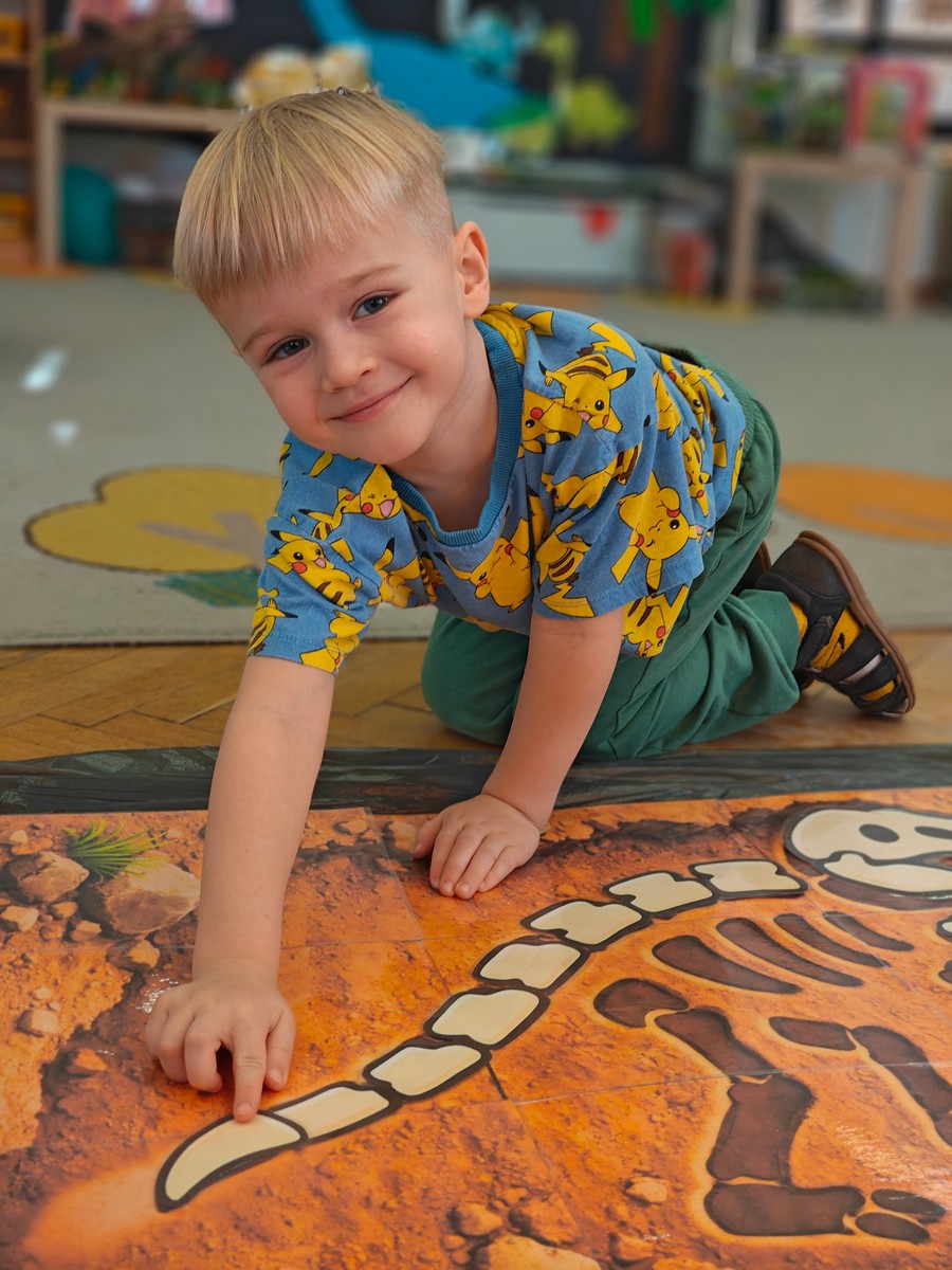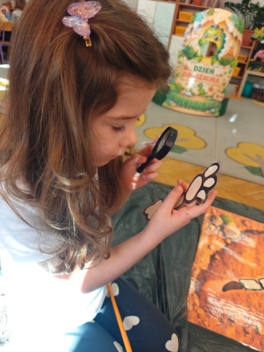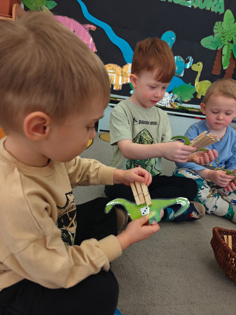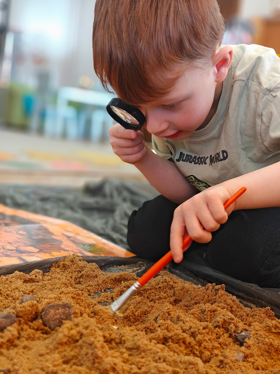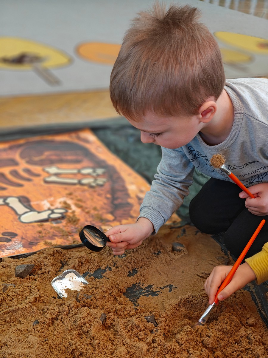 Dzieci z ogromnym zainteresowaniem przeniosły się w odległe czasy, aby poznać niezwykły świat dinozaurów i dowiedzieć się, jak wyglądało życie na Ziemi miliony lat temu. Podczas zajęć przedszkolaki poznawały różne gatunki dinozaurów, ich wygląd, sposób życia oraz ciekawostki związane z prehistorycznym światem. Dzieci z zaciekawieniem oglądały książki i ilustracje, słuchały opowiadań i uczestniczyły w rozmowach. W trakcie realizacji projektu nie zabrakło wielu ciekawych aktywności. Dużym zainteresowaniem cieszyły się zajęcia badawcze i eksperymenty. Dzieci obserwowały eksperyment przedstawiający wybuch wulkanu, dzięki czemu mogły dowiedzieć się, jakie zjawiska przyrodnicze występowały na Ziemi w czasach prehistorycznych. Przedszkolaki wcielały się w rolę małych paleontologów, poszukiwały „dinozaurowe skamieniałości”, tropiły ślady dinozaurów oraz brały udział w zabawach ruchowych i dydaktycznych związanych z tematyką prehistorii. Realizacja projektu była dla dzieci fascynującą przygodą i okazją do zdobywania nowej wiedzy poprzez zabawę, doświadczenia i wspólne odkrywanie tajemnic prehistorycznego świata dinozaurów. Zapraszamy do galerii!