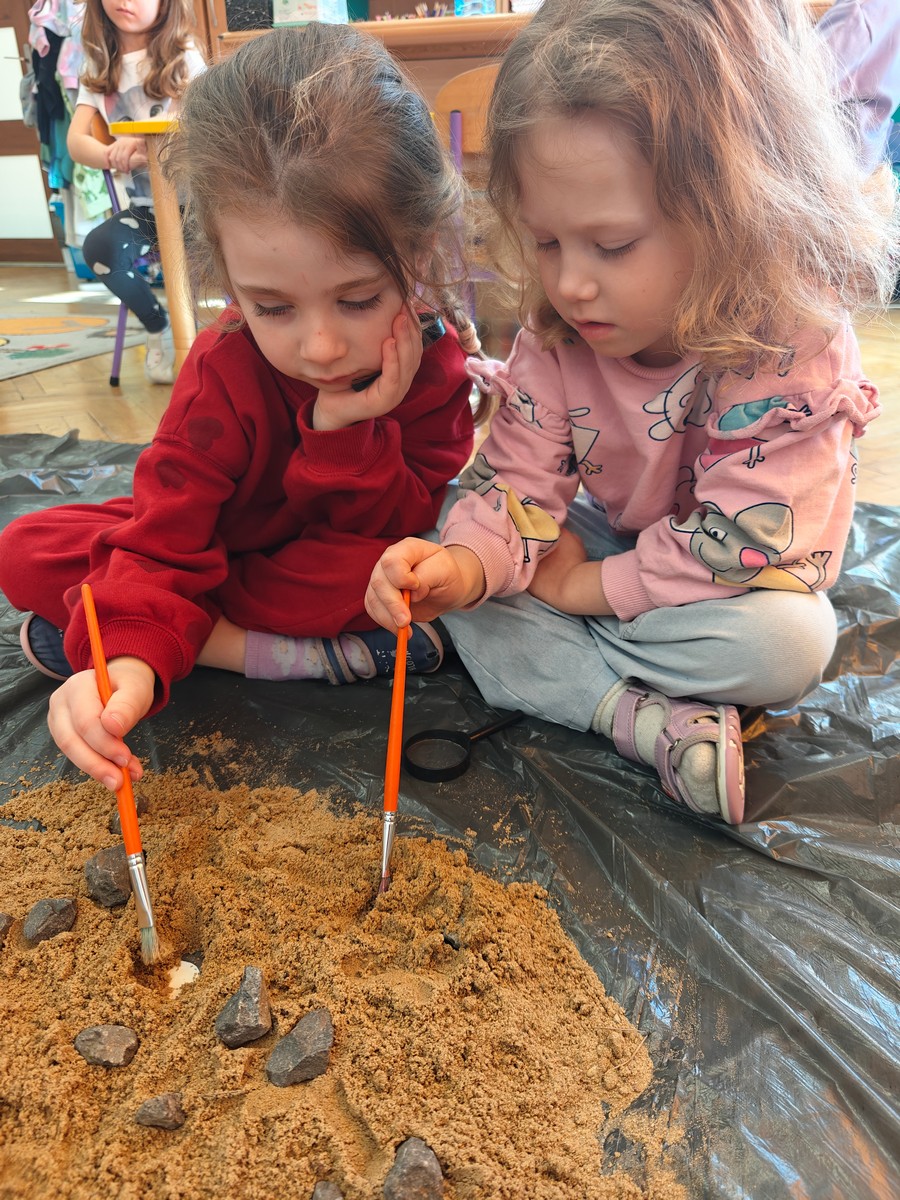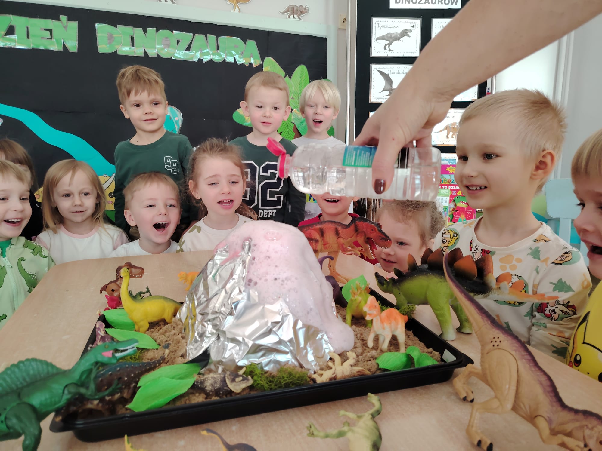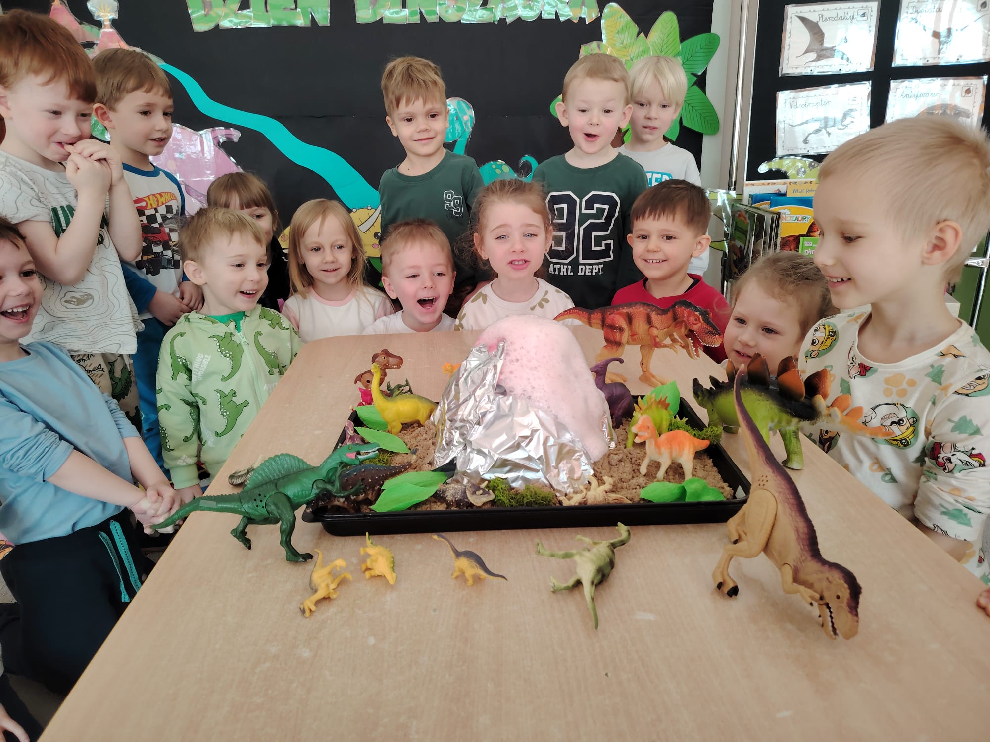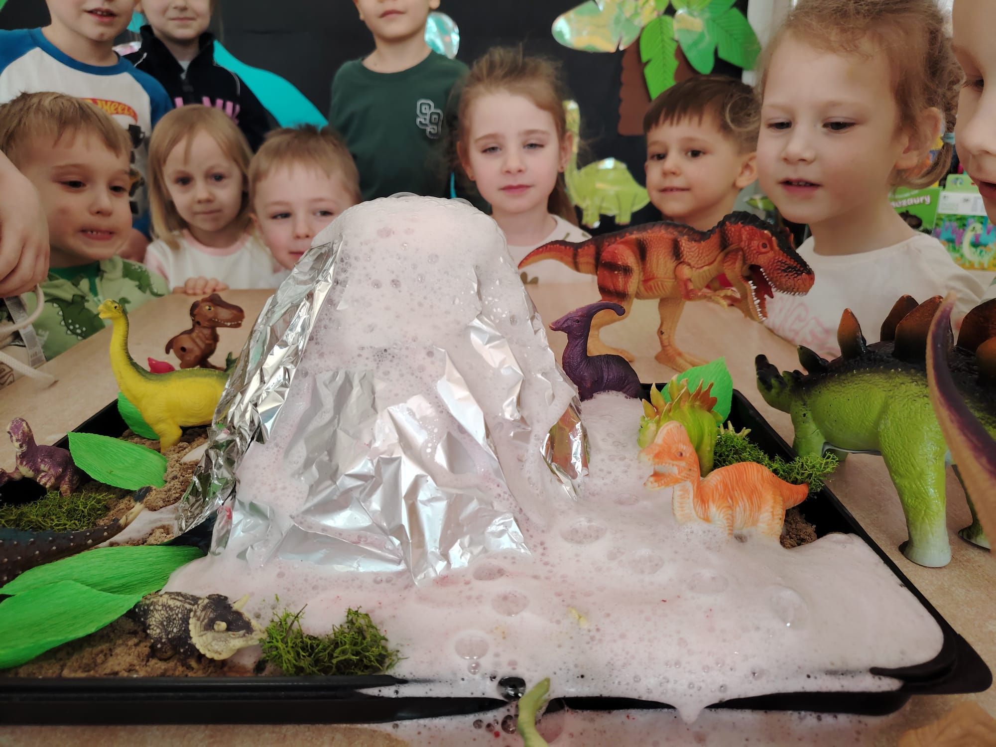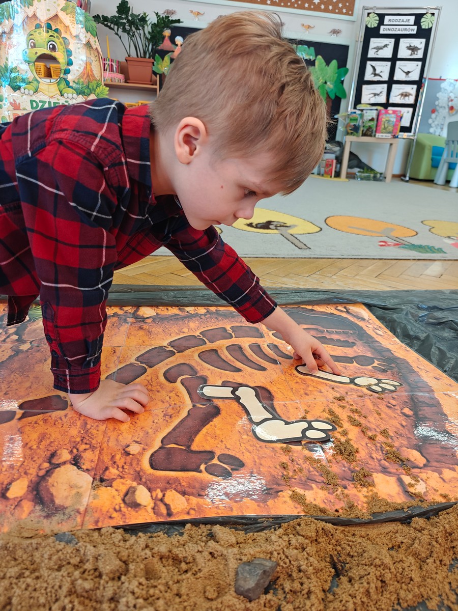 Dzieci z ogromnym zainteresowaniem przeniosły się w odległe czasy, aby poznać niezwykły świat dinozaurów i dowiedzieć się, jak wyglądało życie na Ziemi miliony lat temu. Podczas zajęć przedszkolaki poznawały różne gatunki dinozaurów, ich wygląd, sposób życia oraz ciekawostki związane z prehistorycznym światem. Dzieci z zaciekawieniem oglądały książki i ilustracje, słuchały opowiadań i uczestniczyły w rozmowach. W trakcie realizacji projektu nie zabrakło wielu ciekawych aktywności. Dużym zainteresowaniem cieszyły się zajęcia badawcze i eksperymenty. Dzieci obserwowały eksperyment przedstawiający wybuch wulkanu, dzięki czemu mogły dowiedzieć się, jakie zjawiska przyrodnicze występowały na Ziemi w czasach prehistorycznych. Przedszkolaki wcielały się w rolę małych paleontologów, poszukiwały „dinozaurowe skamieniałości”, tropiły ślady dinozaurów oraz brały udział w zabawach ruchowych i dydaktycznych związanych z tematyką prehistorii. Realizacja projektu była dla dzieci fascynującą przygodą i okazją do zdobywania nowej wiedzy poprzez zabawę, doświadczenia i wspólne odkrywanie tajemnic prehistorycznego świata dinozaurów. Zapraszamy do galerii!
