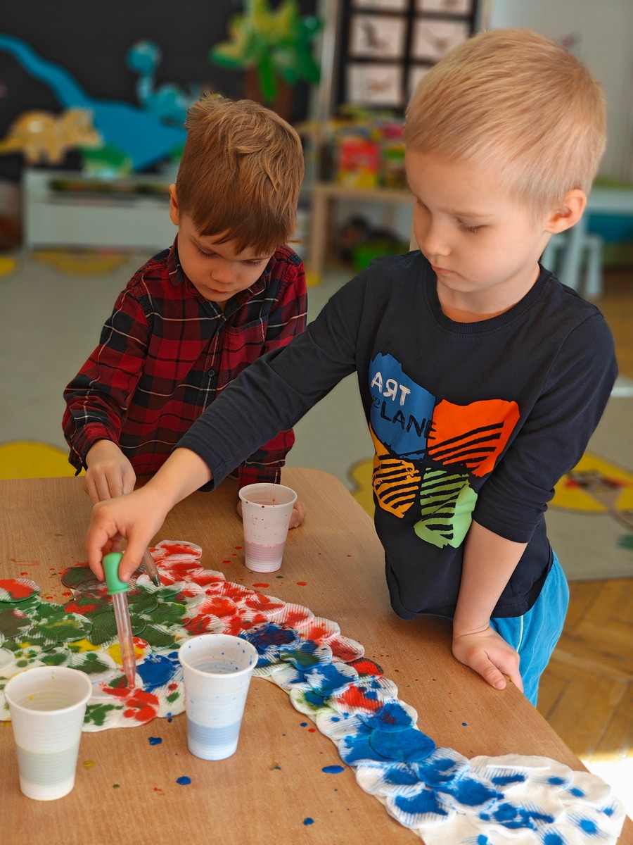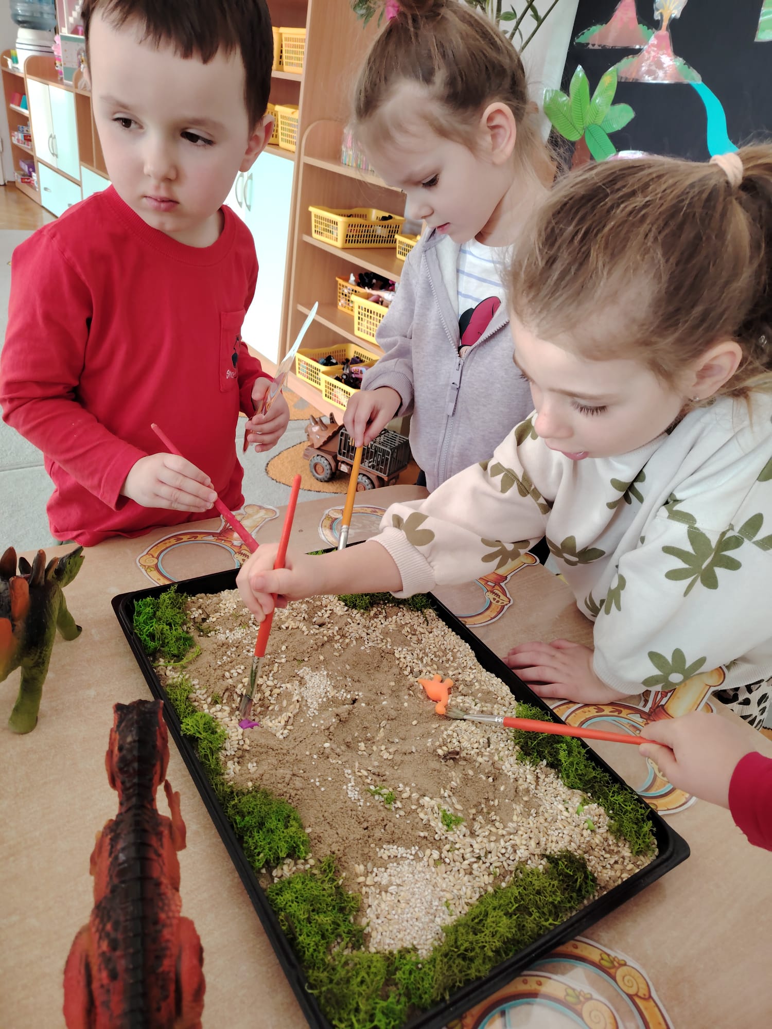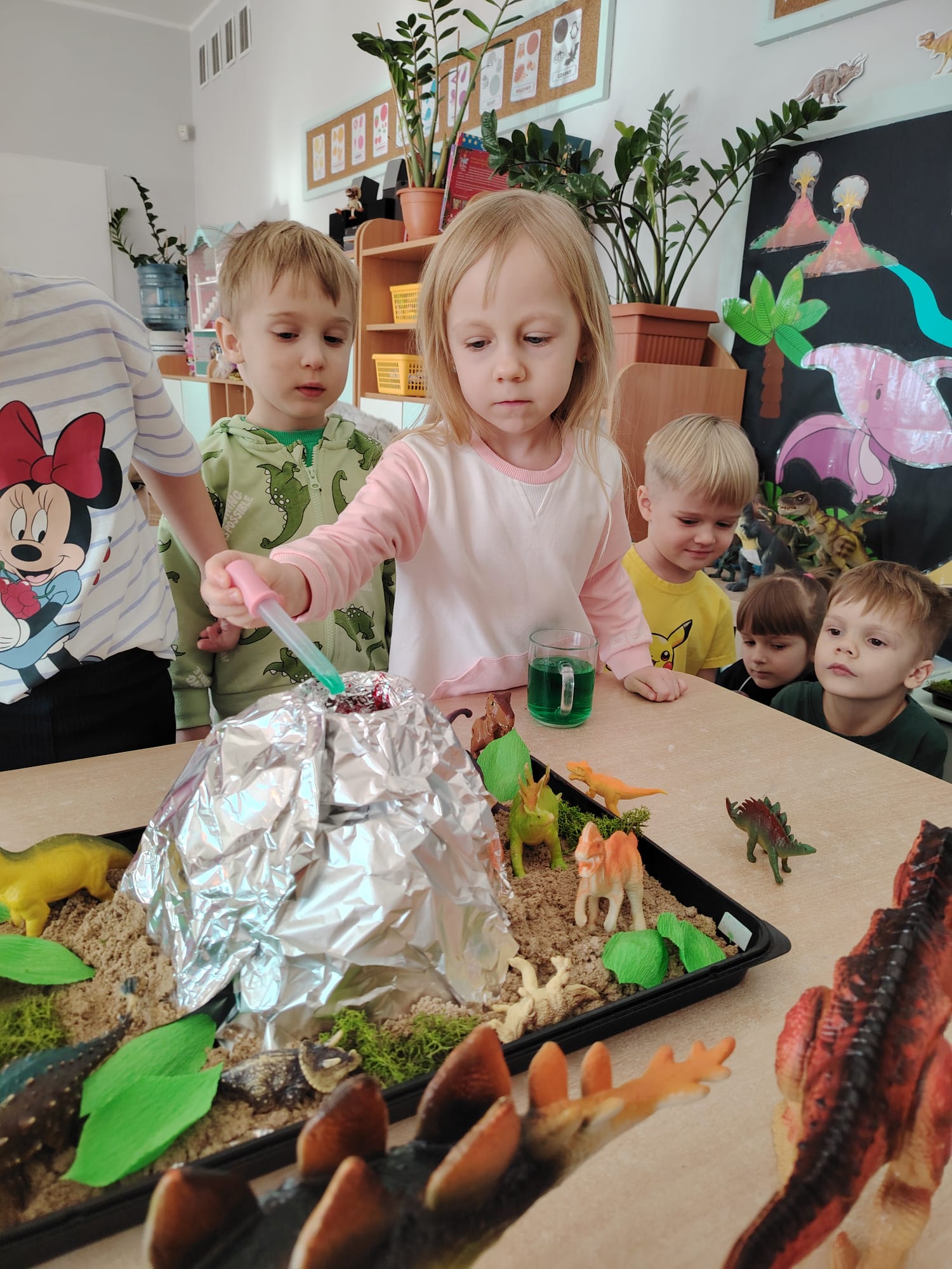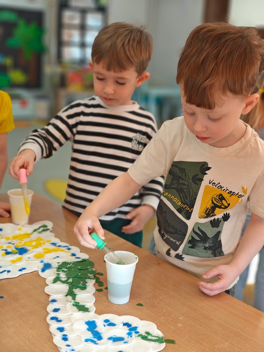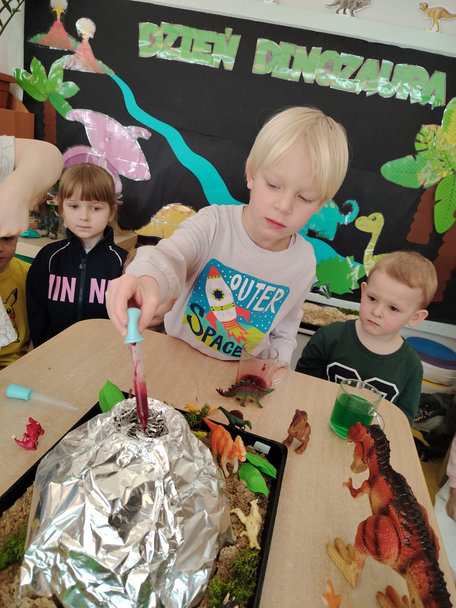 Dzieci z ogromnym zainteresowaniem przeniosły się w odległe czasy, aby poznać niezwykły świat dinozaurów i dowiedzieć się, jak wyglądało życie na Ziemi miliony lat temu. Podczas zajęć przedszkolaki poznawały różne gatunki dinozaurów, ich wygląd, sposób życia oraz ciekawostki związane z prehistorycznym światem. Dzieci z zaciekawieniem oglądały książki i ilustracje, słuchały opowiadań i uczestniczyły w rozmowach. W trakcie realizacji projektu nie zabrakło wielu ciekawych aktywności. Dużym zainteresowaniem cieszyły się zajęcia badawcze i eksperymenty. Dzieci obserwowały eksperyment przedstawiający wybuch wulkanu, dzięki czemu mogły dowiedzieć się, jakie zjawiska przyrodnicze występowały na Ziemi w czasach prehistorycznych. Przedszkolaki wcielały się w rolę małych paleontologów, poszukiwały „dinozaurowe skamieniałości”, tropiły ślady dinozaurów oraz brały udział w zabawach ruchowych i dydaktycznych związanych z tematyką prehistorii. Realizacja projektu była dla dzieci fascynującą przygodą i okazją do zdobywania nowej wiedzy poprzez zabawę, doświadczenia i wspólne odkrywanie tajemnic prehistorycznego świata dinozaurów. Zapraszamy do galerii!