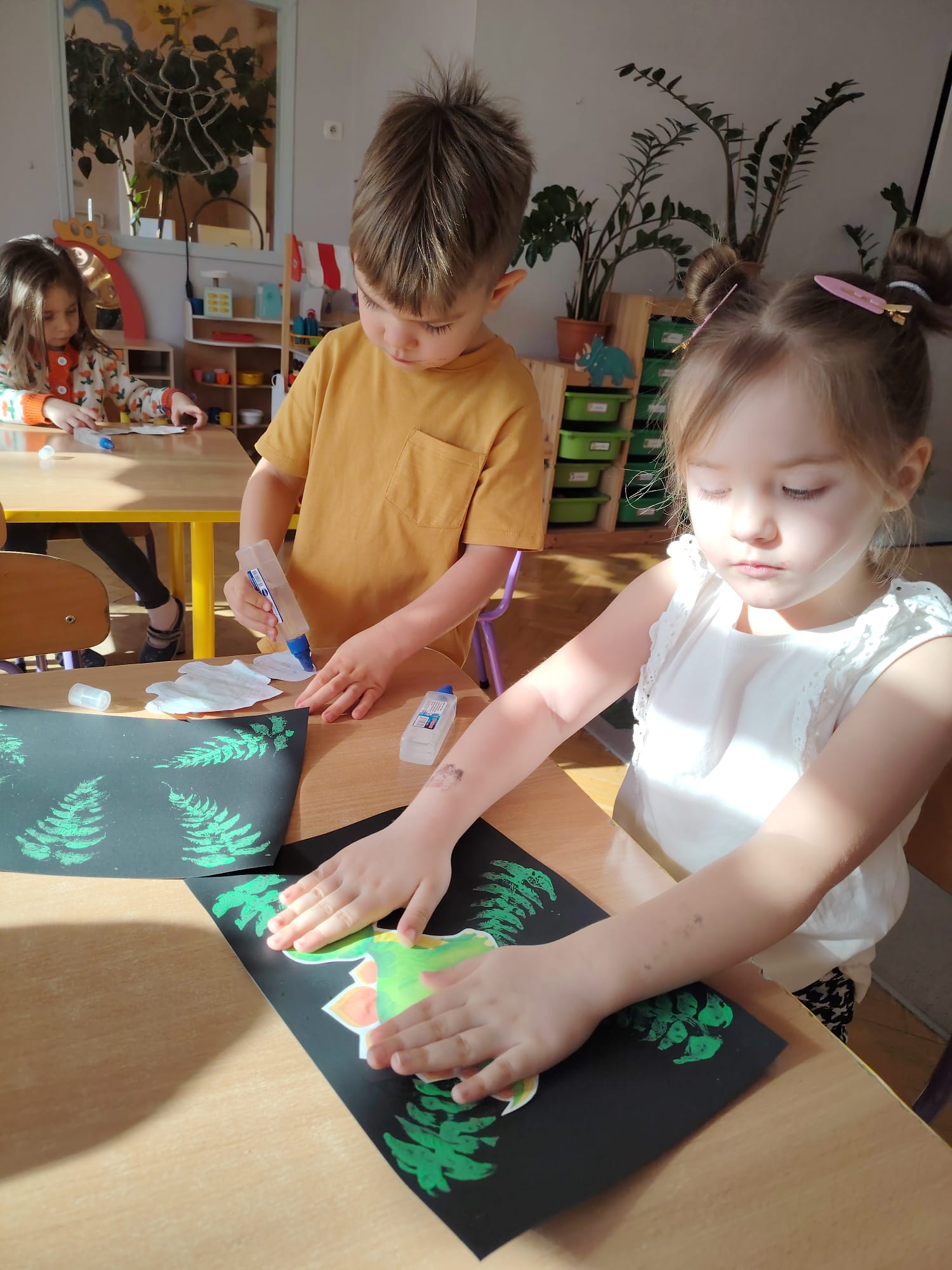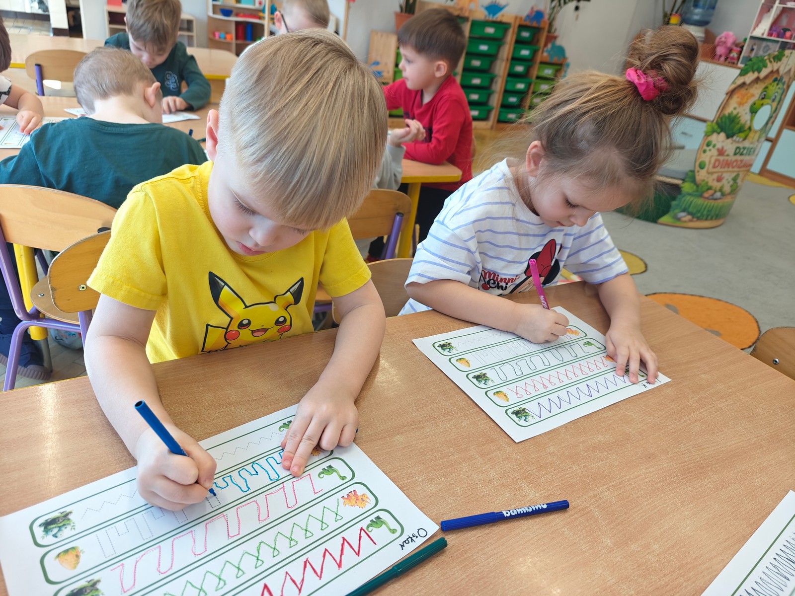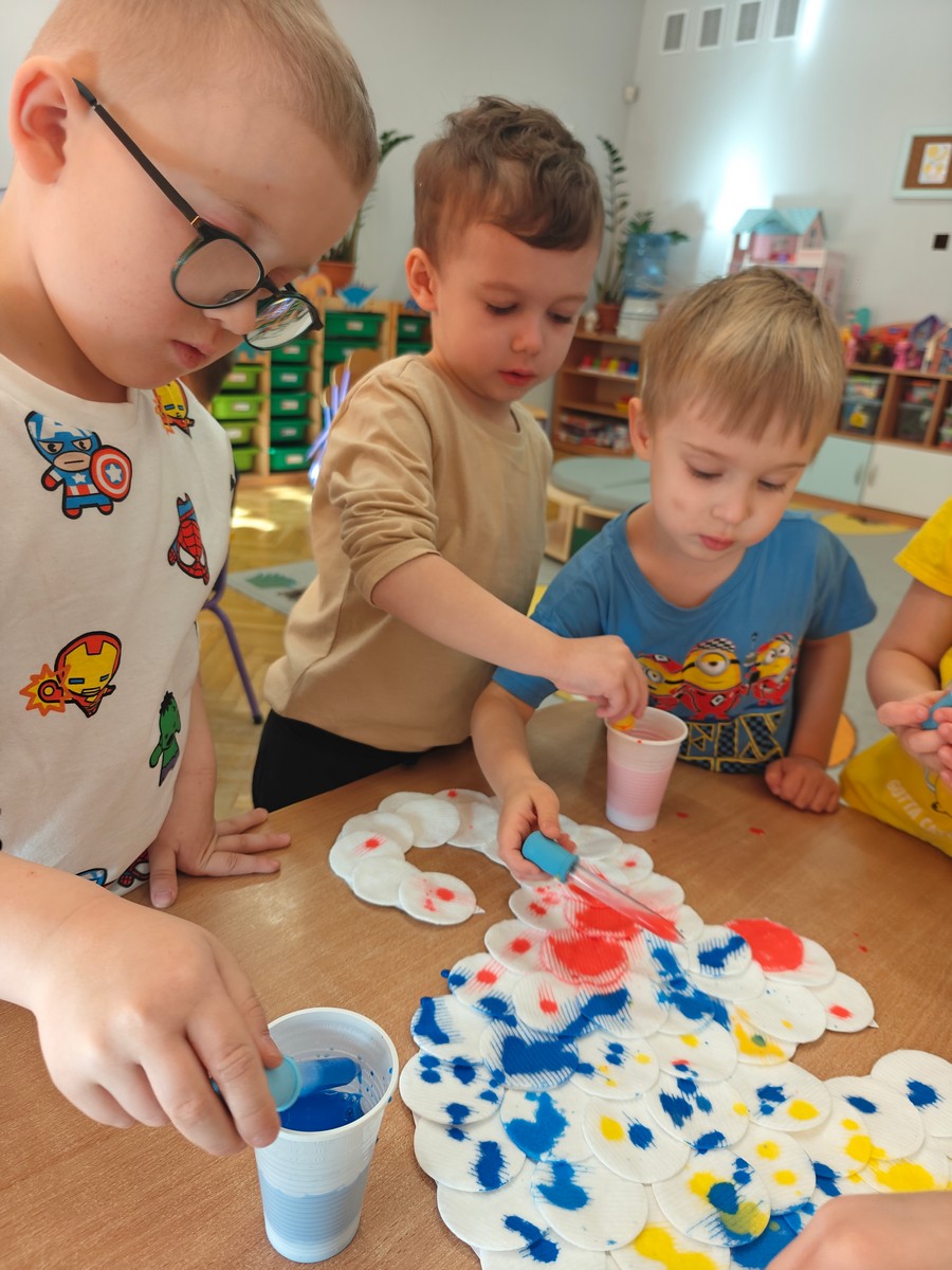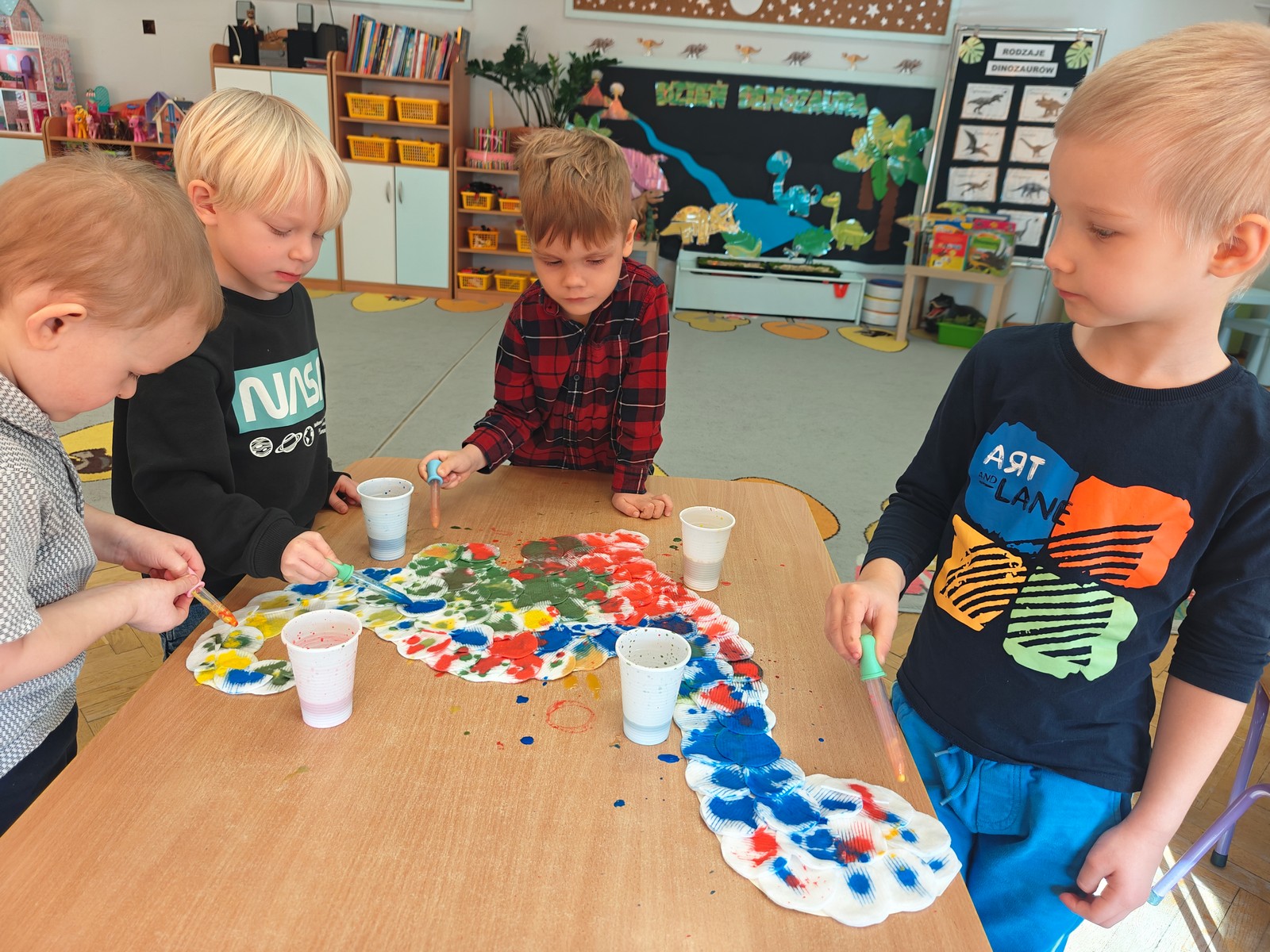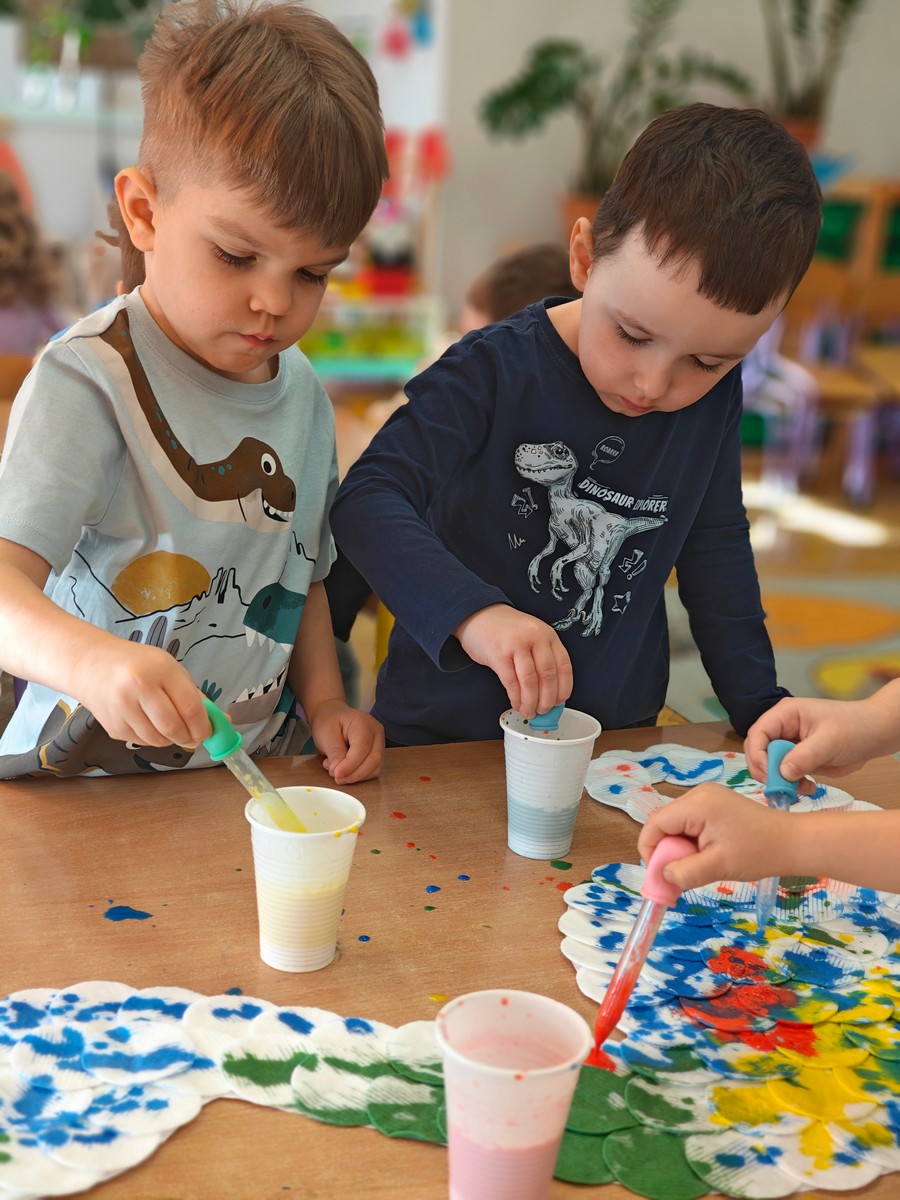 Dzieci z ogromnym zainteresowaniem przeniosły się w odległe czasy, aby poznać niezwykły świat dinozaurów i dowiedzieć się, jak wyglądało życie na Ziemi miliony lat temu. Podczas zajęć przedszkolaki poznawały różne gatunki dinozaurów, ich wygląd, sposób życia oraz ciekawostki związane z prehistorycznym światem. Dzieci z zaciekawieniem oglądały książki i ilustracje, słuchały opowiadań i uczestniczyły w rozmowach. W trakcie realizacji projektu nie zabrakło wielu ciekawych aktywności. Dużym zainteresowaniem cieszyły się zajęcia badawcze i eksperymenty. Dzieci obserwowały eksperyment przedstawiający wybuch wulkanu, dzięki czemu mogły dowiedzieć się, jakie zjawiska przyrodnicze występowały na Ziemi w czasach prehistorycznych. Przedszkolaki wcielały się w rolę małych paleontologów, poszukiwały „dinozaurowe skamieniałości”, tropiły ślady dinozaurów oraz brały udział w zabawach ruchowych i dydaktycznych związanych z tematyką prehistorii. Realizacja projektu była dla dzieci fascynującą przygodą i okazją do zdobywania nowej wiedzy poprzez zabawę, doświadczenia i wspólne odkrywanie tajemnic prehistorycznego świata dinozaurów. Zapraszamy do galerii!