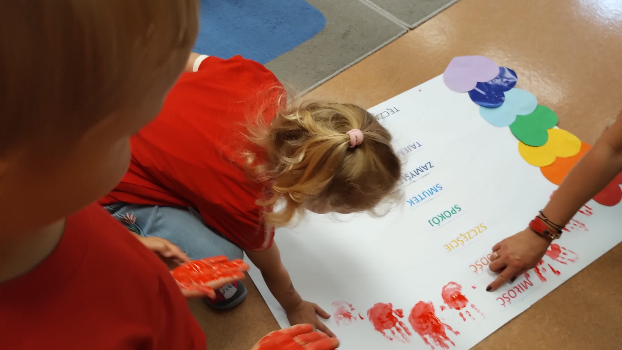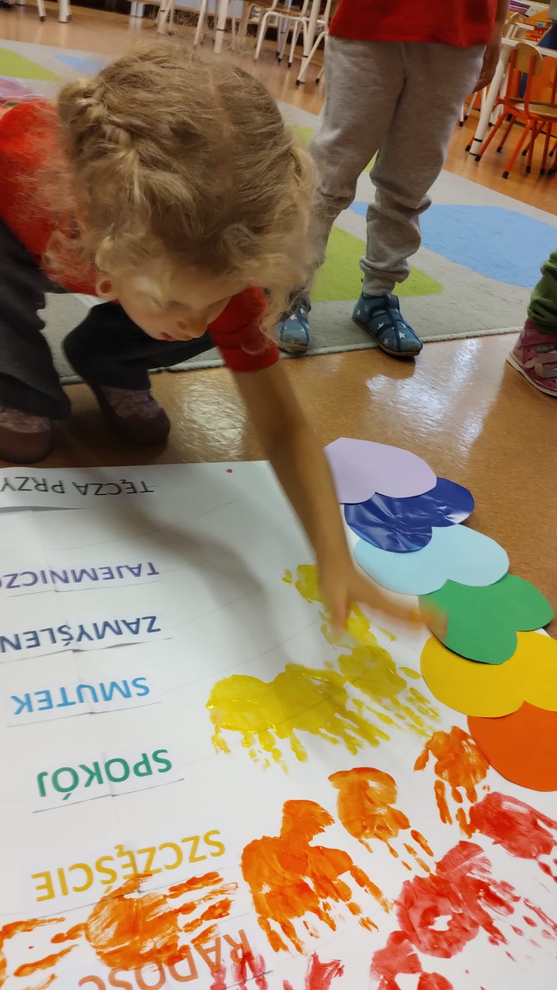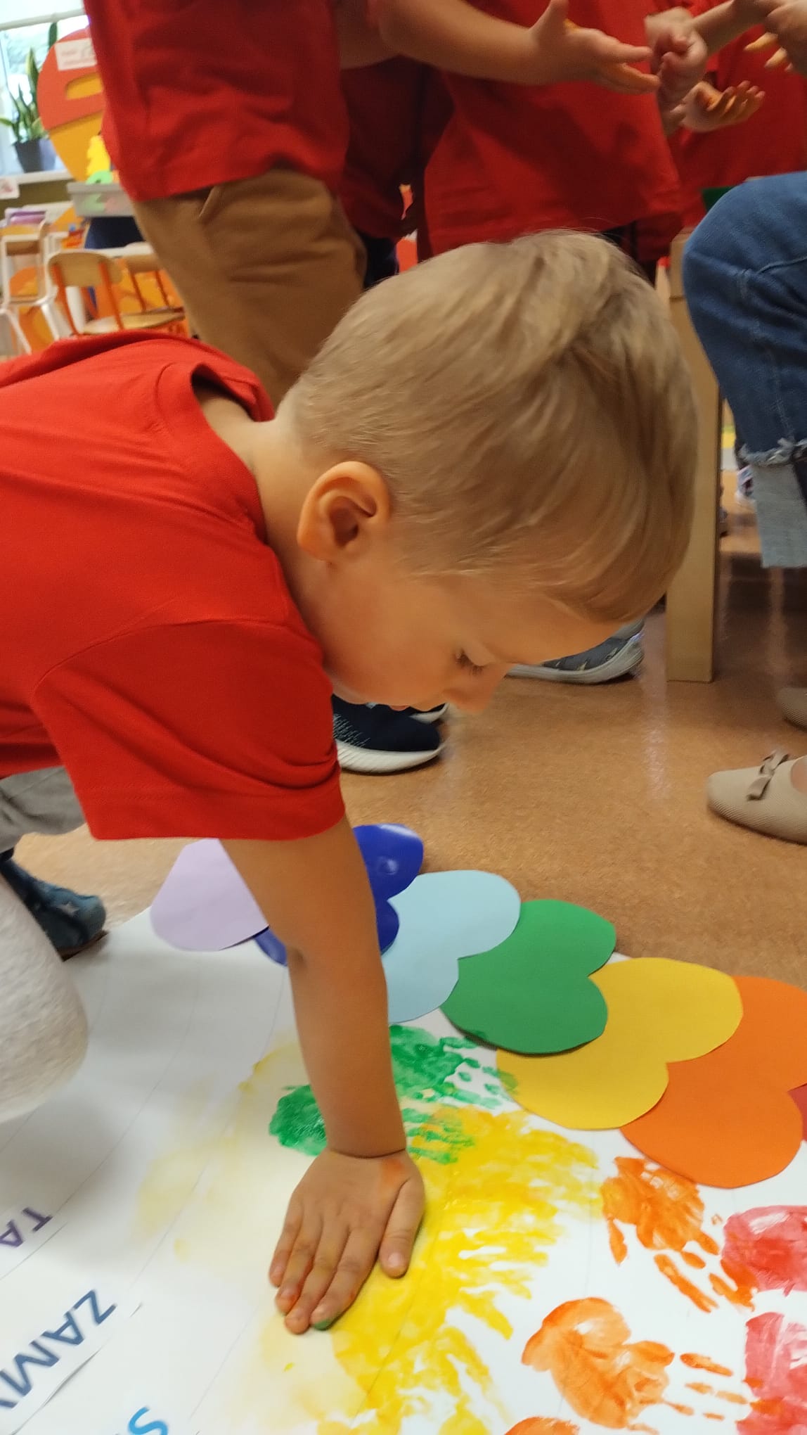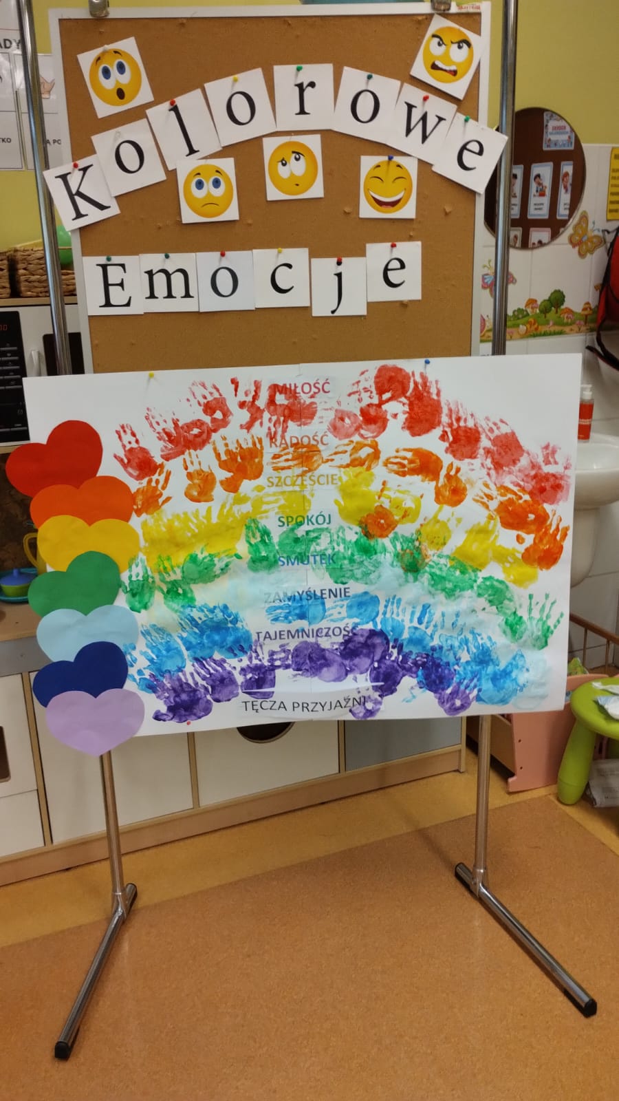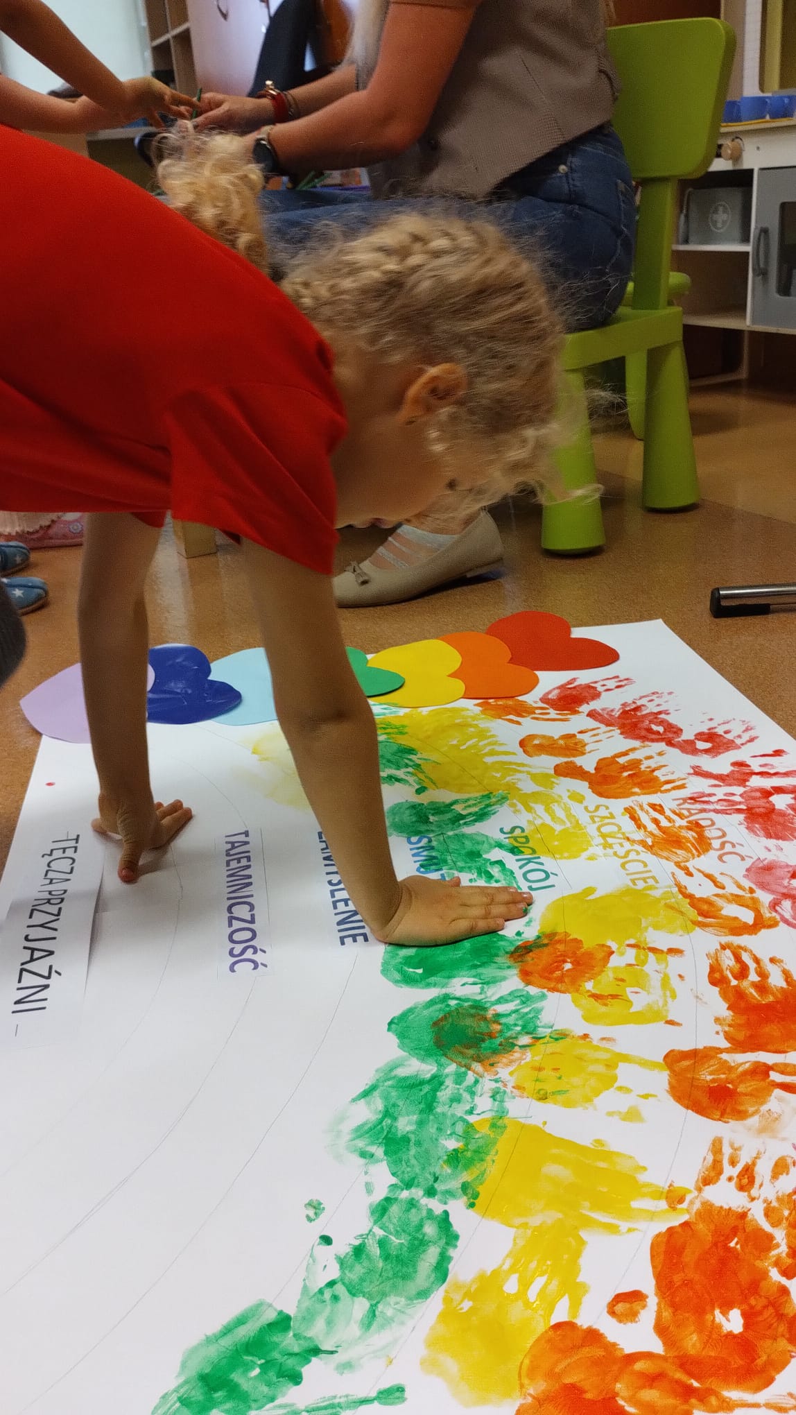 Kulminacyjnym punktem zajęć było wspólne tworzenie „Tęczy Przyjaźni”. Każde dziecko zamoczyło swoją dłoń w kolorowej farbie i odciskało ją na dużym arkuszu papieru, tworząc łuki tęczy. Każdy kolor symbolizował inną emocję – radość, spokój, miłość, wdzięczność , życzliwość i tajemniczość. Wspólna praca była okazją do rozmów, śmiechu i dzielenia się dobrymi emocjami .W ten sposób powstało wyjątkowe dzieło, które nie tylko pięknie ozdobiło naszą salę, ale przede wszystkim było wyrazem wspólnoty i bliskości.