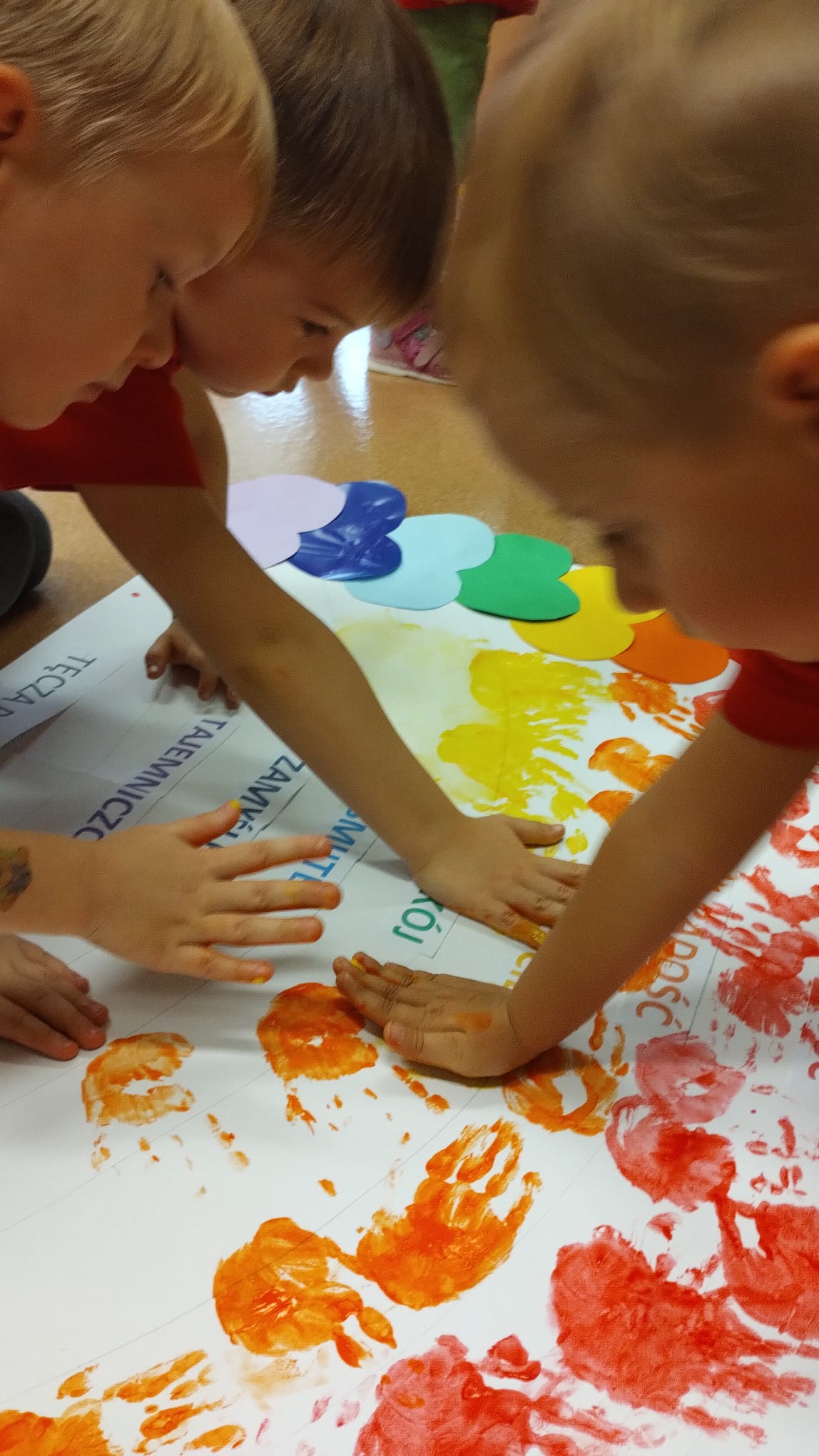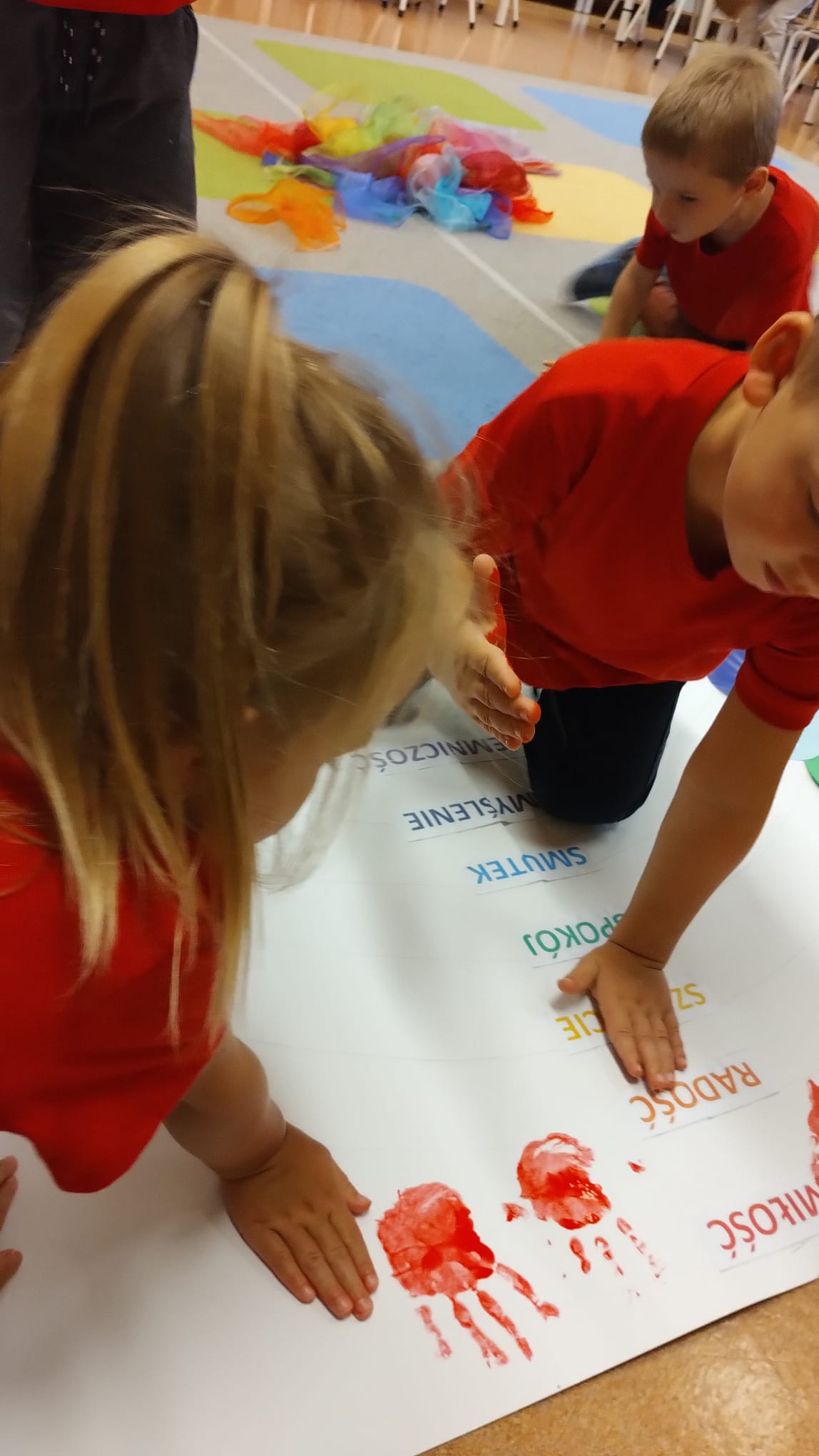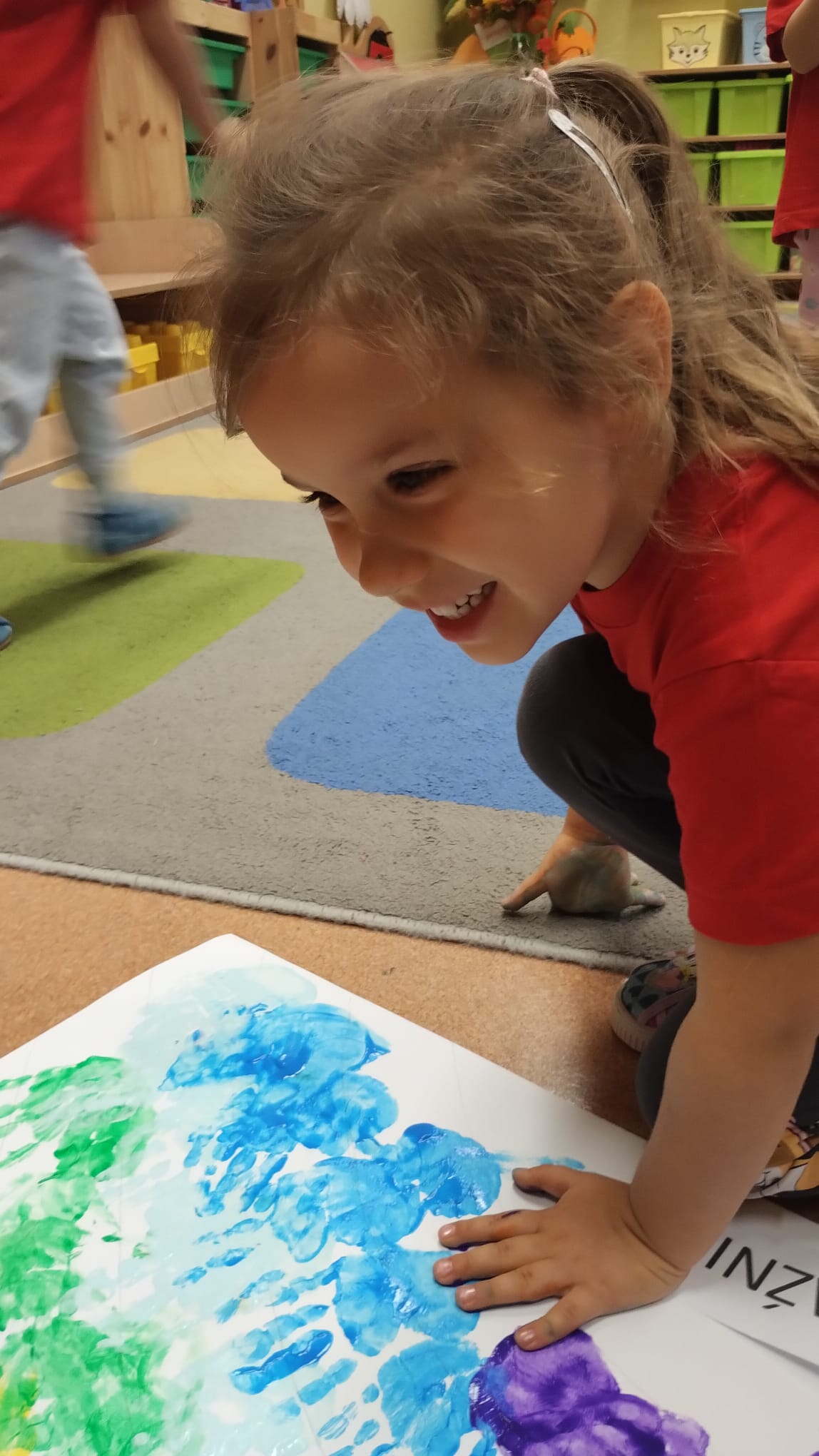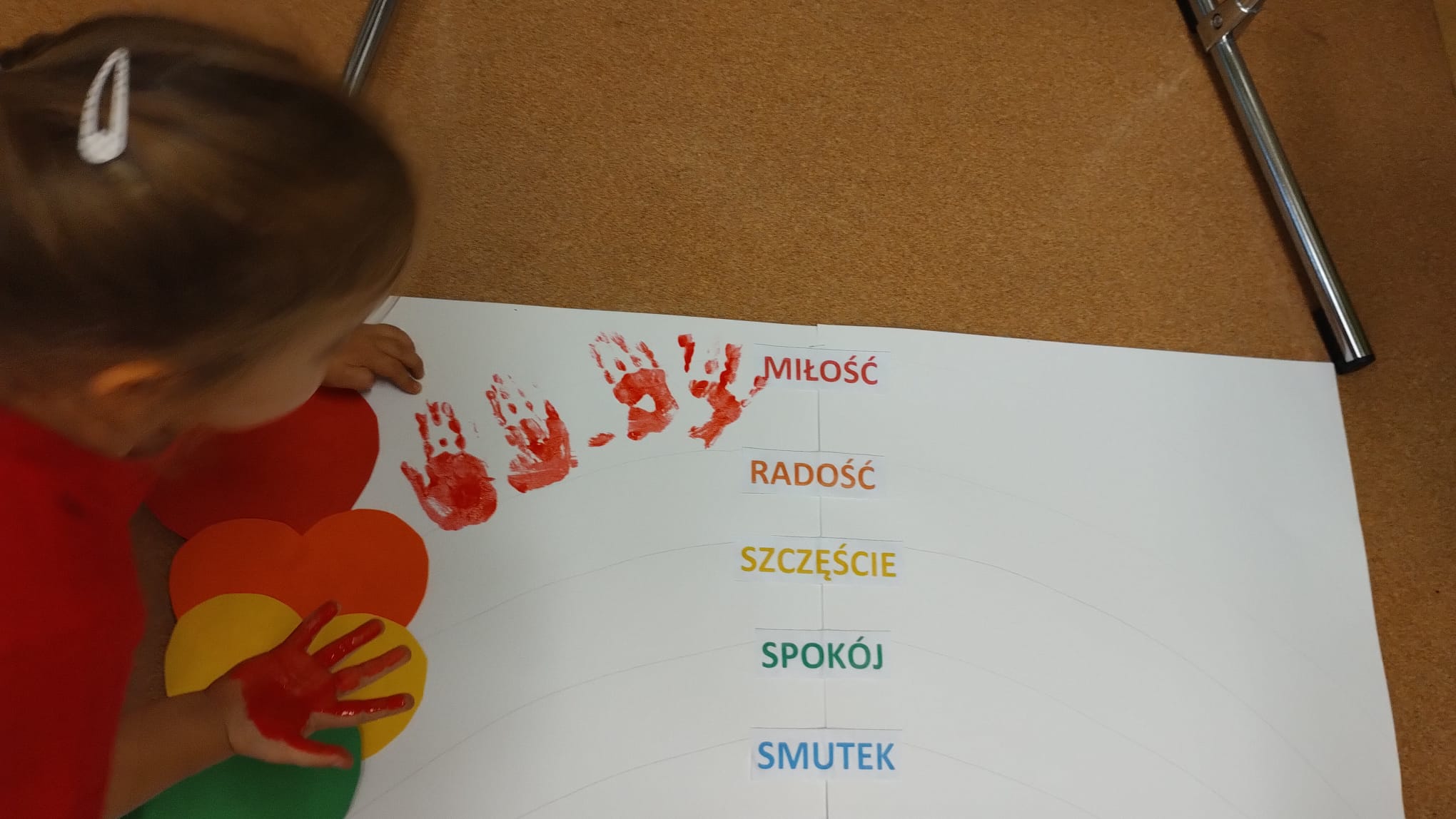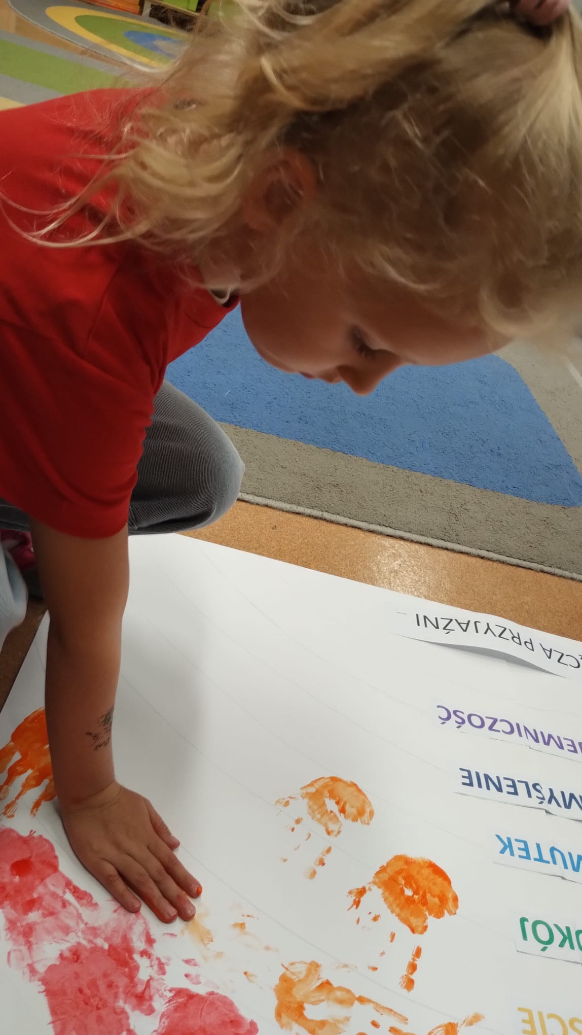 Kulminacyjnym punktem zajęć było wspólne tworzenie „Tęczy Przyjaźni”. Każde dziecko zamoczyło swoją dłoń w kolorowej farbie i odciskało ją na dużym arkuszu papieru, tworząc łuki tęczy. Każdy kolor symbolizował inną emocję – radość, spokój, miłość, wdzięczność , życzliwość i tajemniczość. Wspólna praca była okazją do rozmów, śmiechu i dzielenia się dobrymi emocjami .W ten sposób powstało wyjątkowe dzieło, które nie tylko pięknie ozdobiło naszą salę, ale przede wszystkim było wyrazem wspólnoty i bliskości.