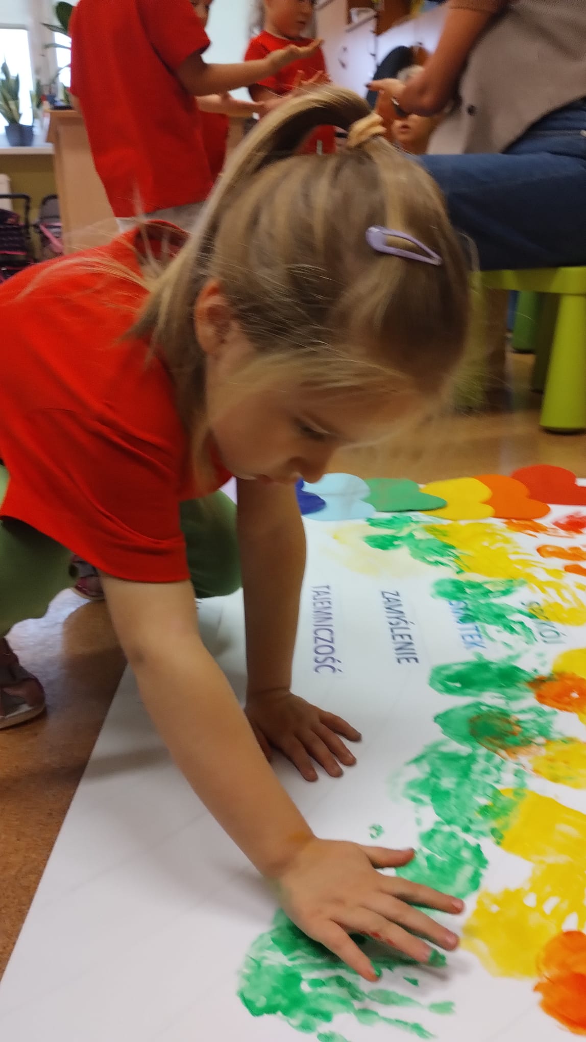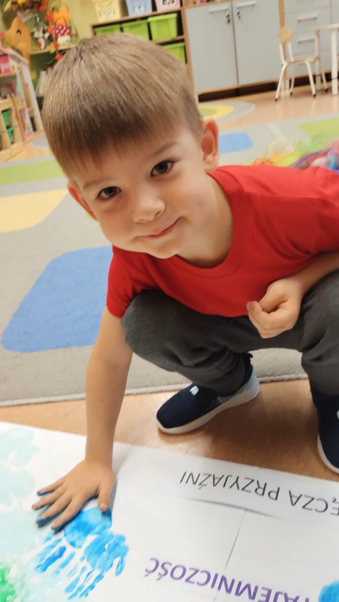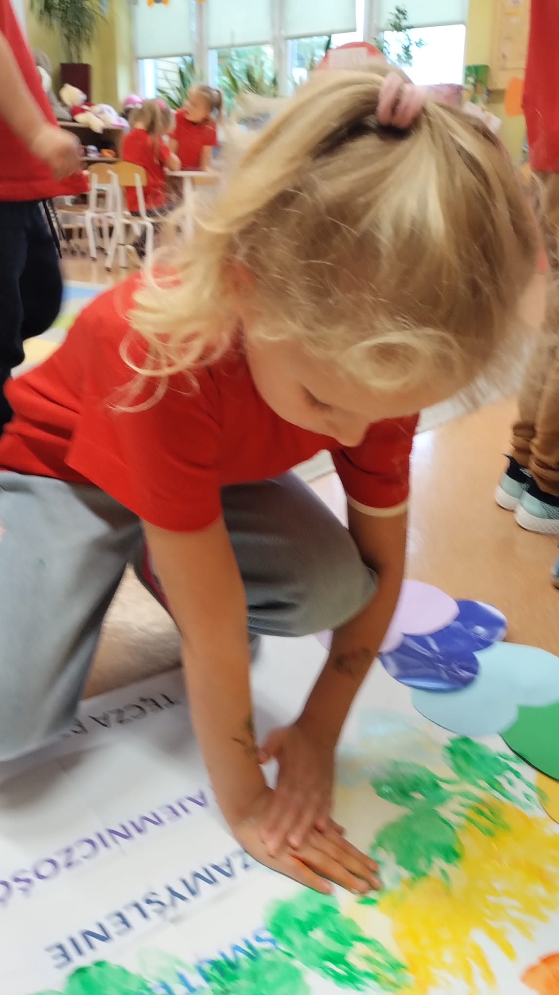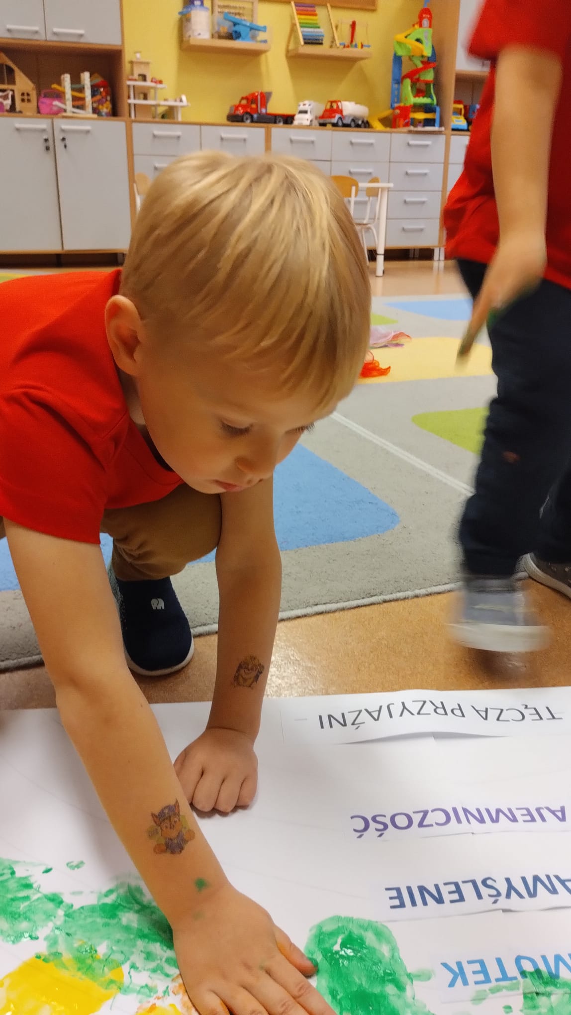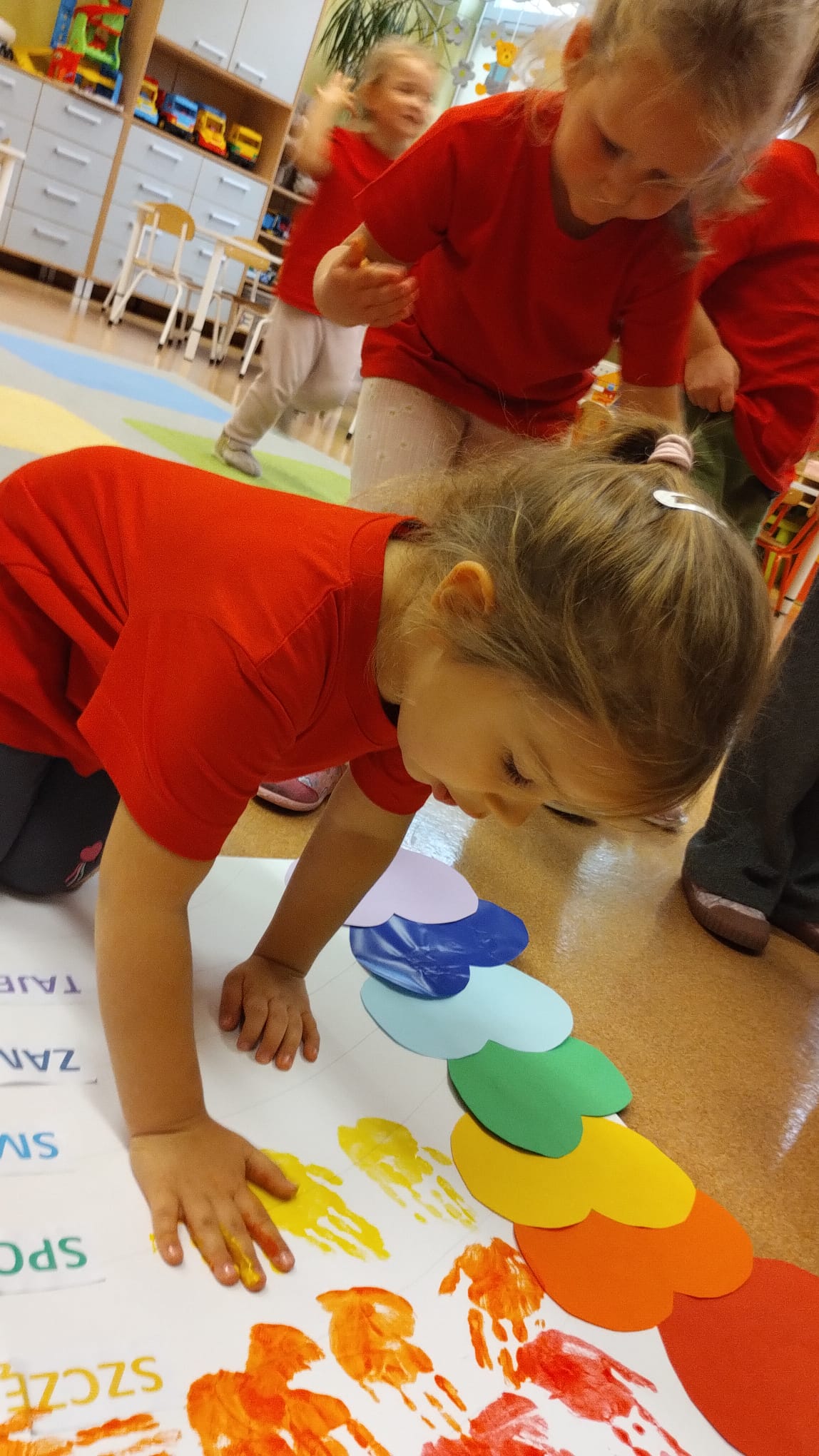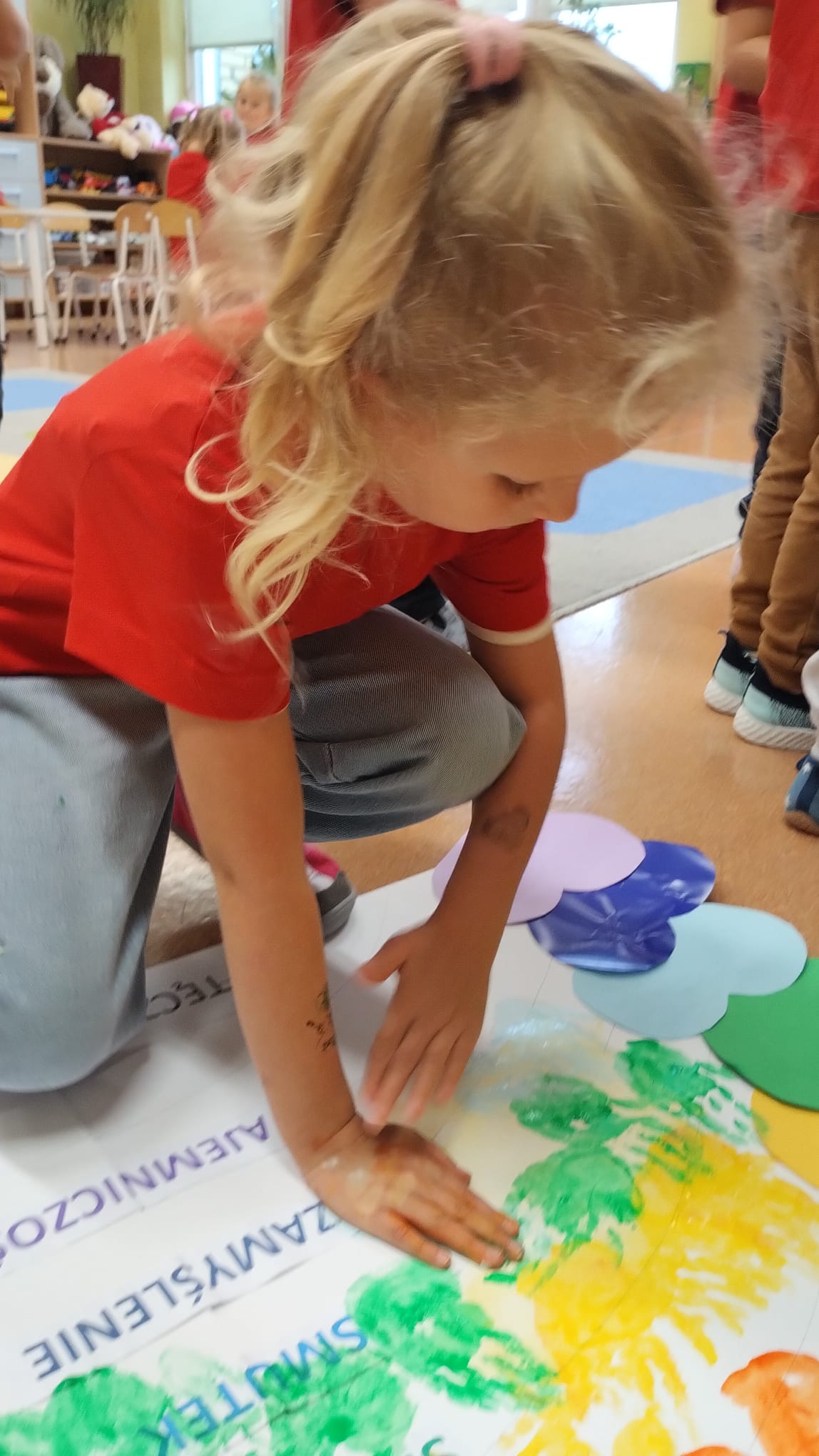 Kulminacyjnym punktem zajęć było wspólne tworzenie „Tęczy Przyjaźni”. Każde dziecko zamoczyło swoją dłoń w kolorowej farbie i odciskało ją na dużym arkuszu papieru, tworząc łuki tęczy. Każdy kolor symbolizował inną emocję – radość, spokój, miłość, wdzięczność , życzliwość i tajemniczość. Wspólna praca była okazją do rozmów, śmiechu i dzielenia się dobrymi emocjami .W ten sposób powstało wyjątkowe dzieło, które nie tylko pięknie ozdobiło naszą salę, ale przede wszystkim było wyrazem wspólnoty i bliskości.