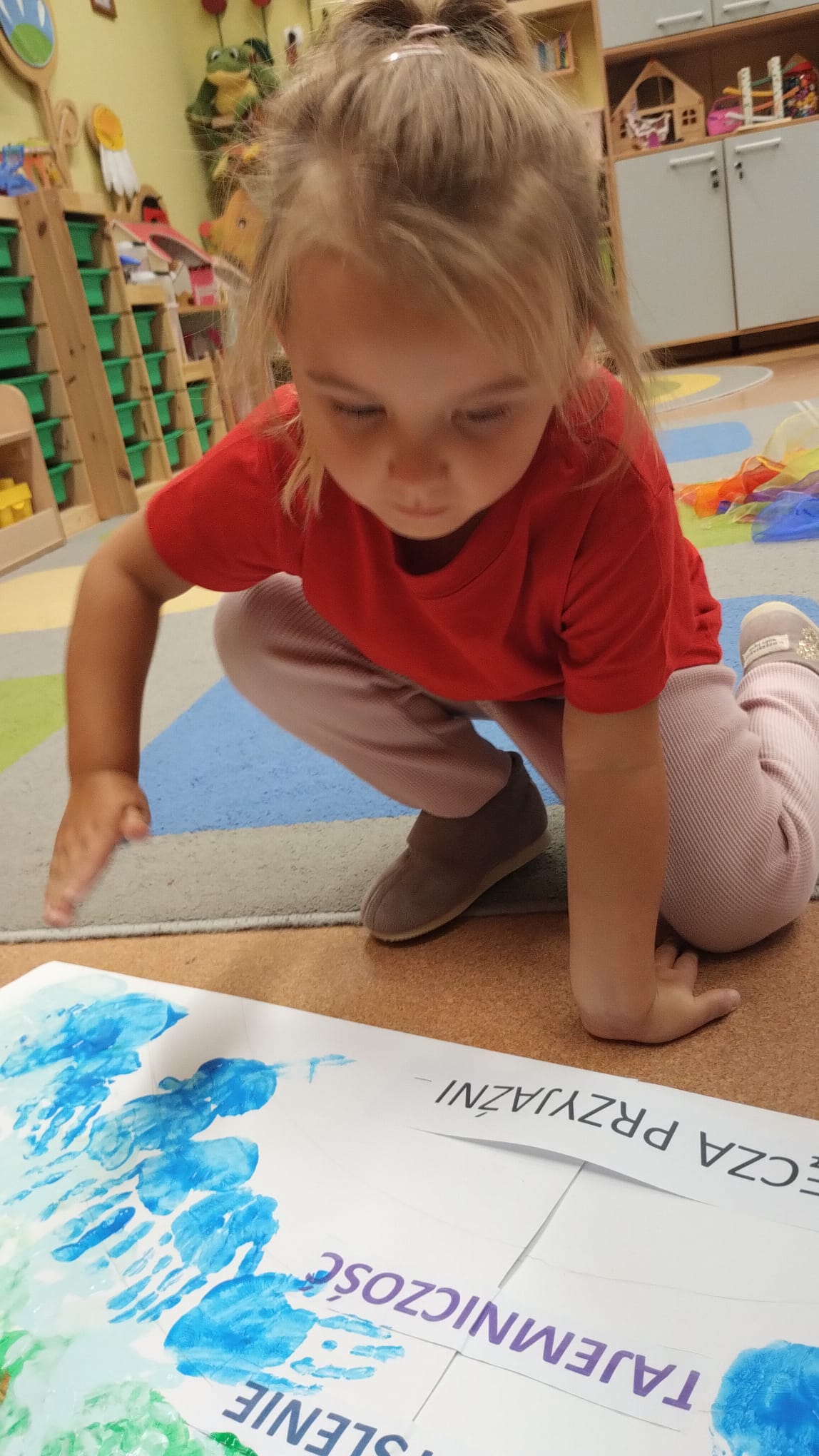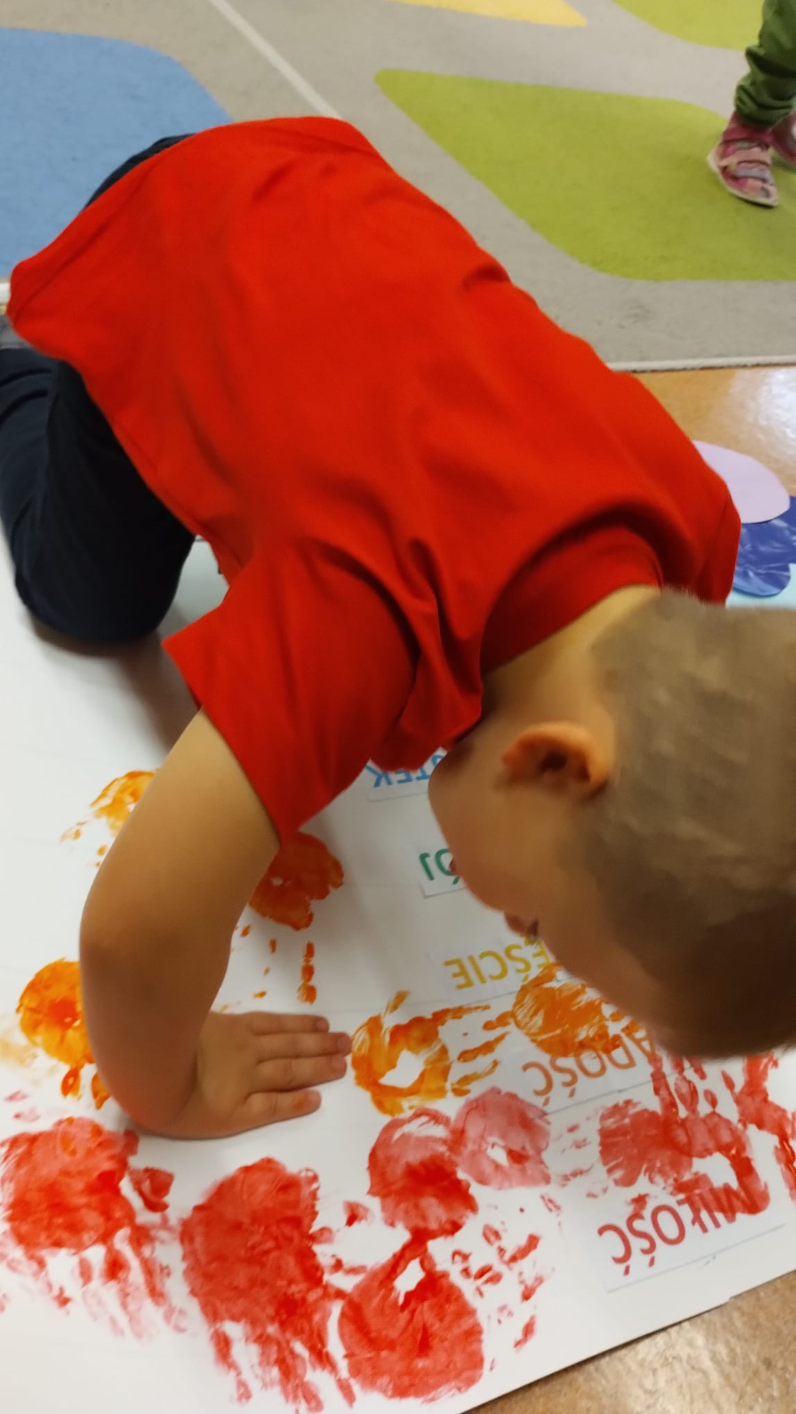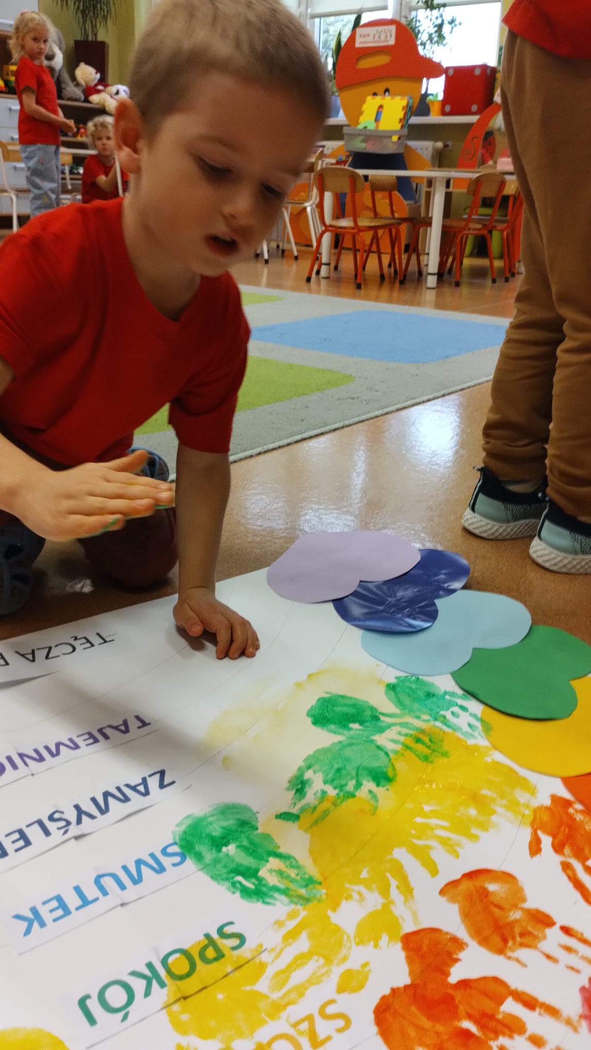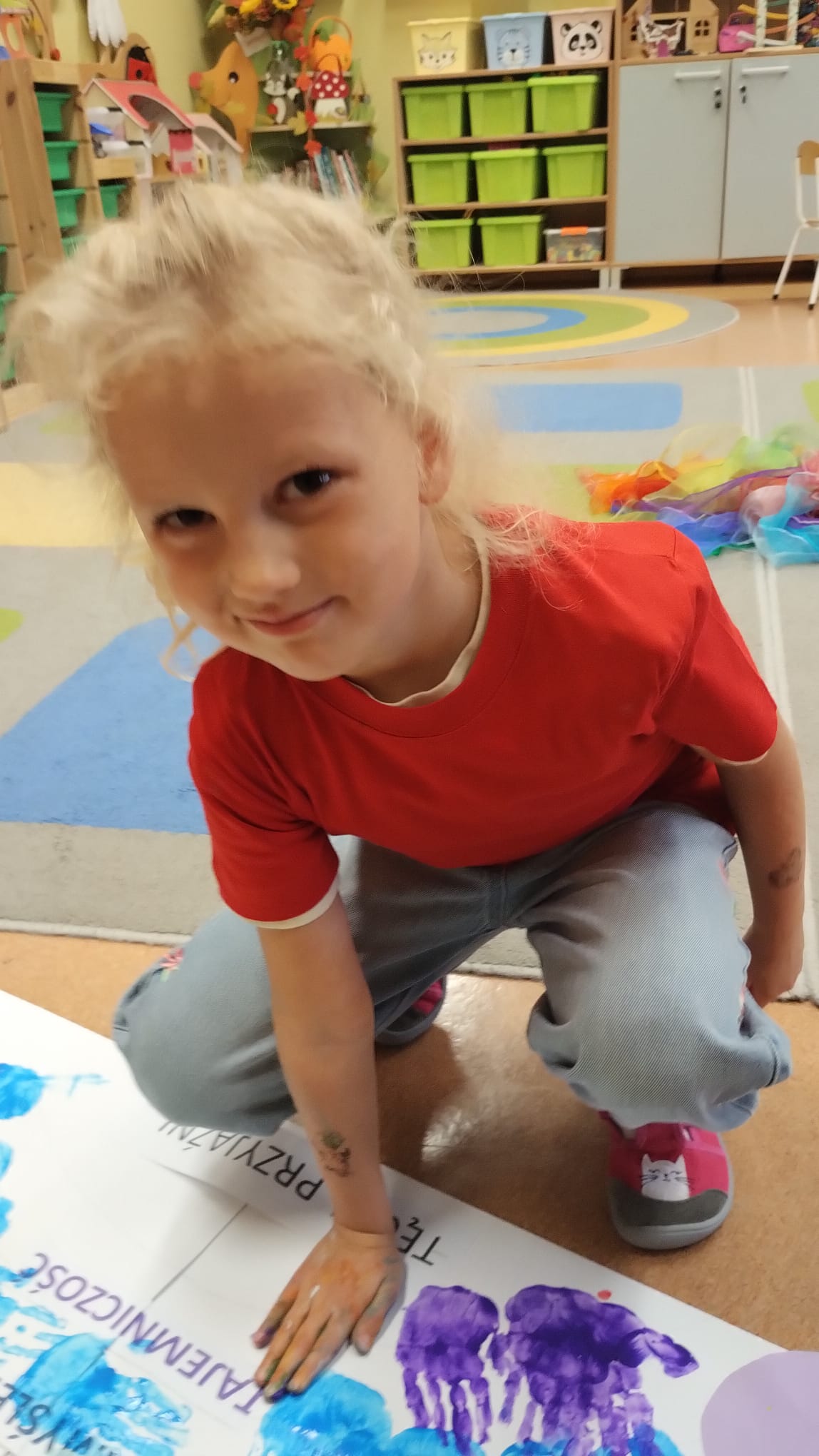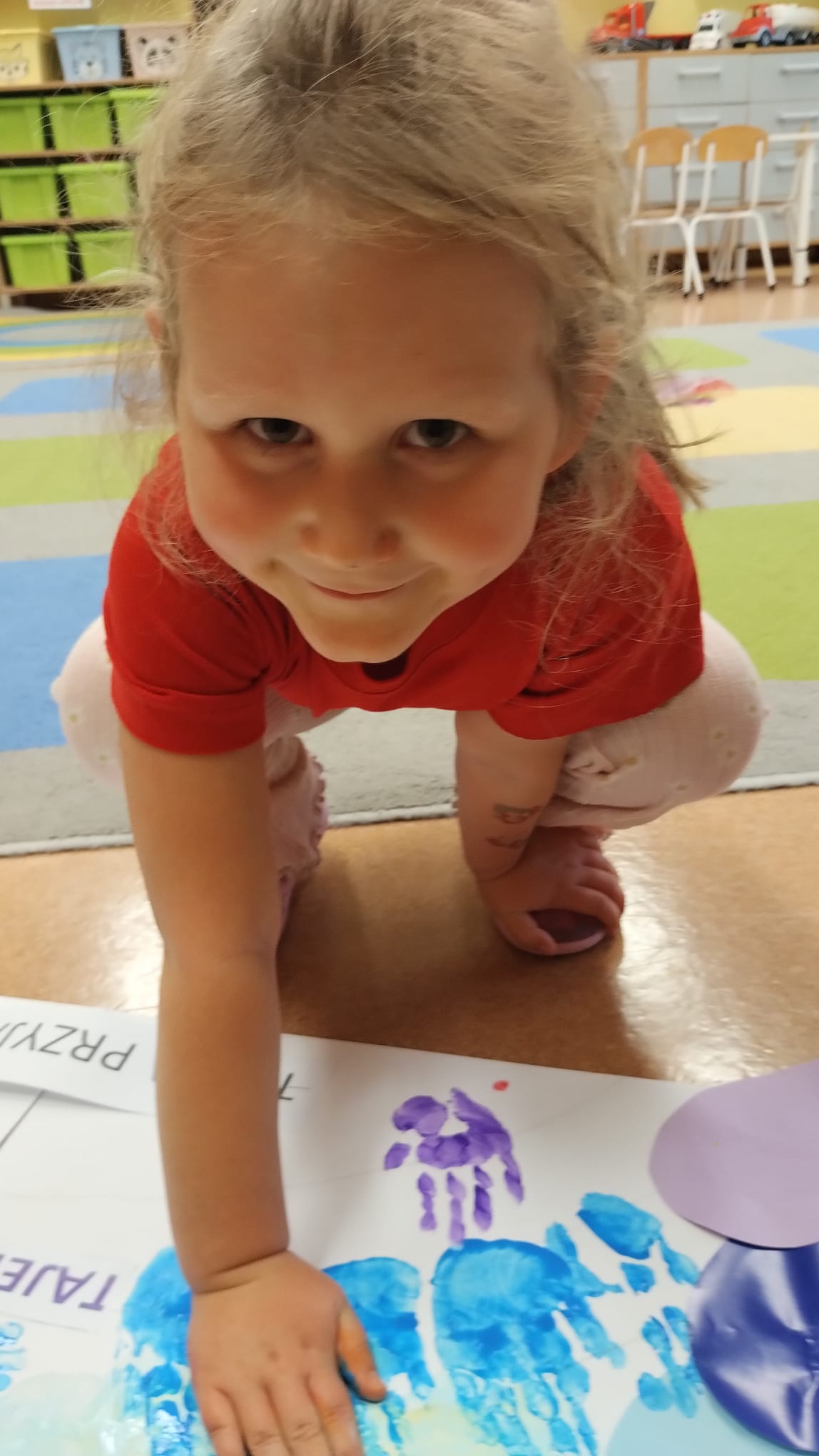 Kulminacyjnym punktem zajęć było wspólne tworzenie „Tęczy Przyjaźni”. Każde dziecko zamoczyło swoją dłoń w kolorowej farbie i odciskało ją na dużym arkuszu papieru, tworząc łuki tęczy. Każdy kolor symbolizował inną emocję – radość, spokój, miłość, wdzięczność , życzliwość i tajemniczość. Wspólna praca była okazją do rozmów, śmiechu i dzielenia się dobrymi emocjami .W ten sposób powstało wyjątkowe dzieło, które nie tylko pięknie ozdobiło naszą salę, ale przede wszystkim było wyrazem wspólnoty i bliskości.