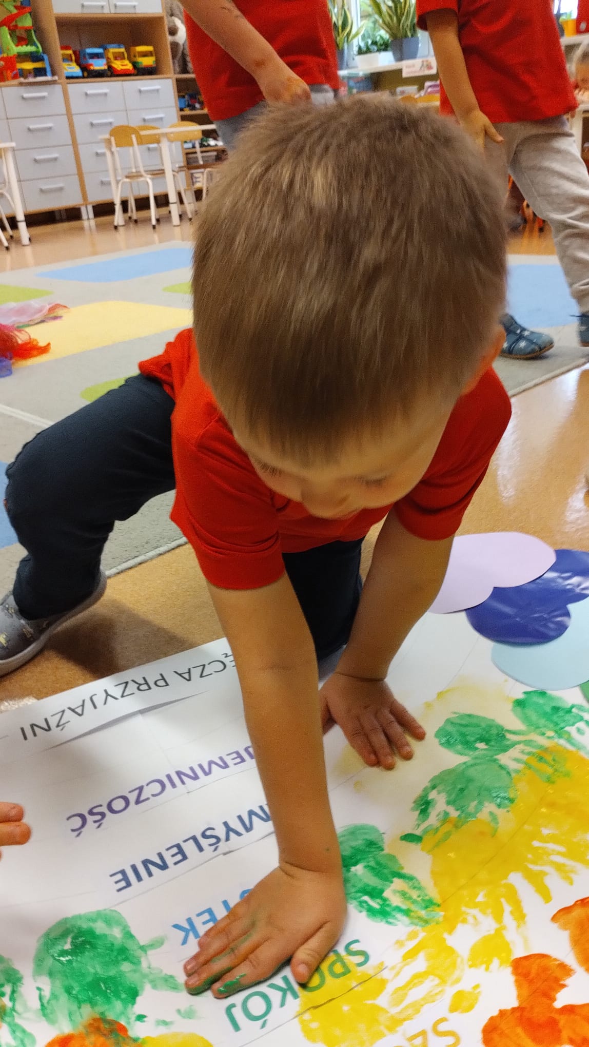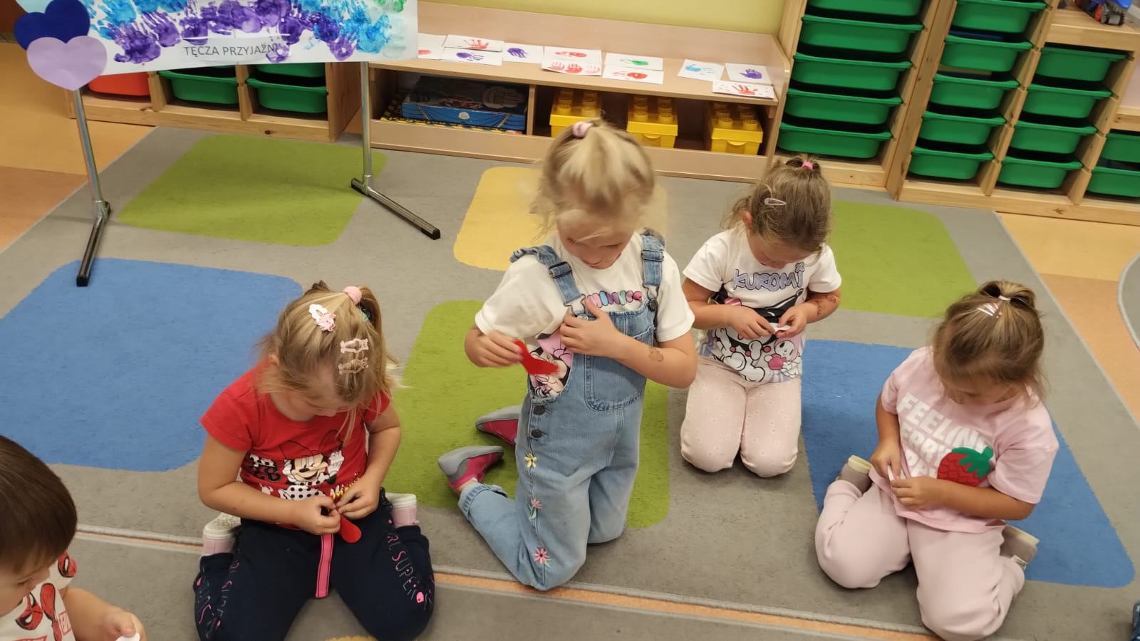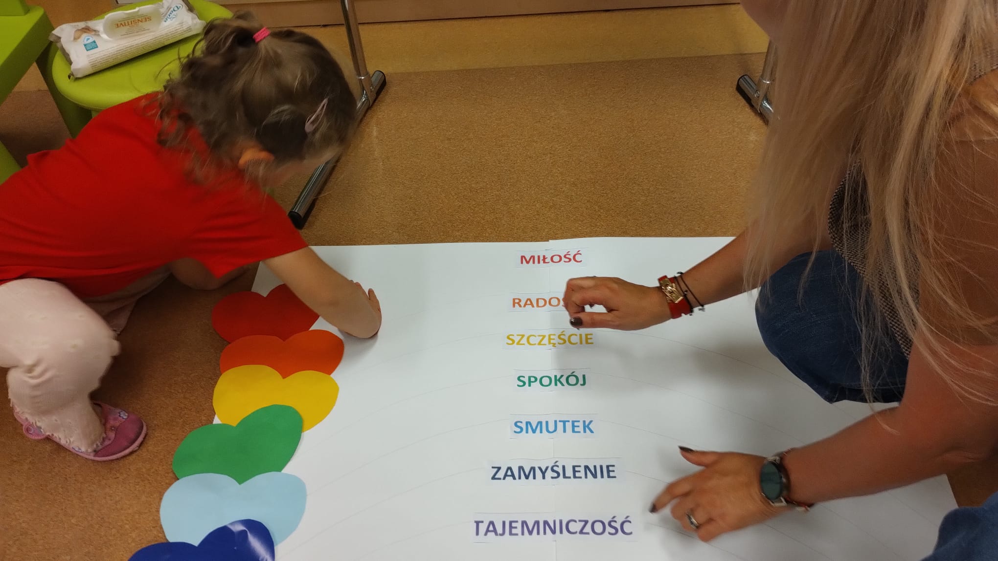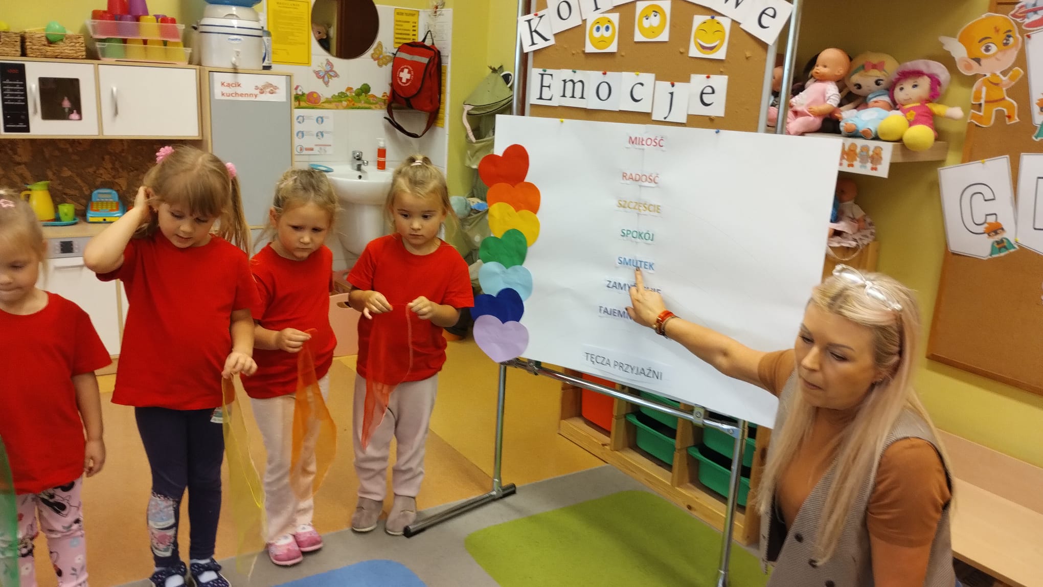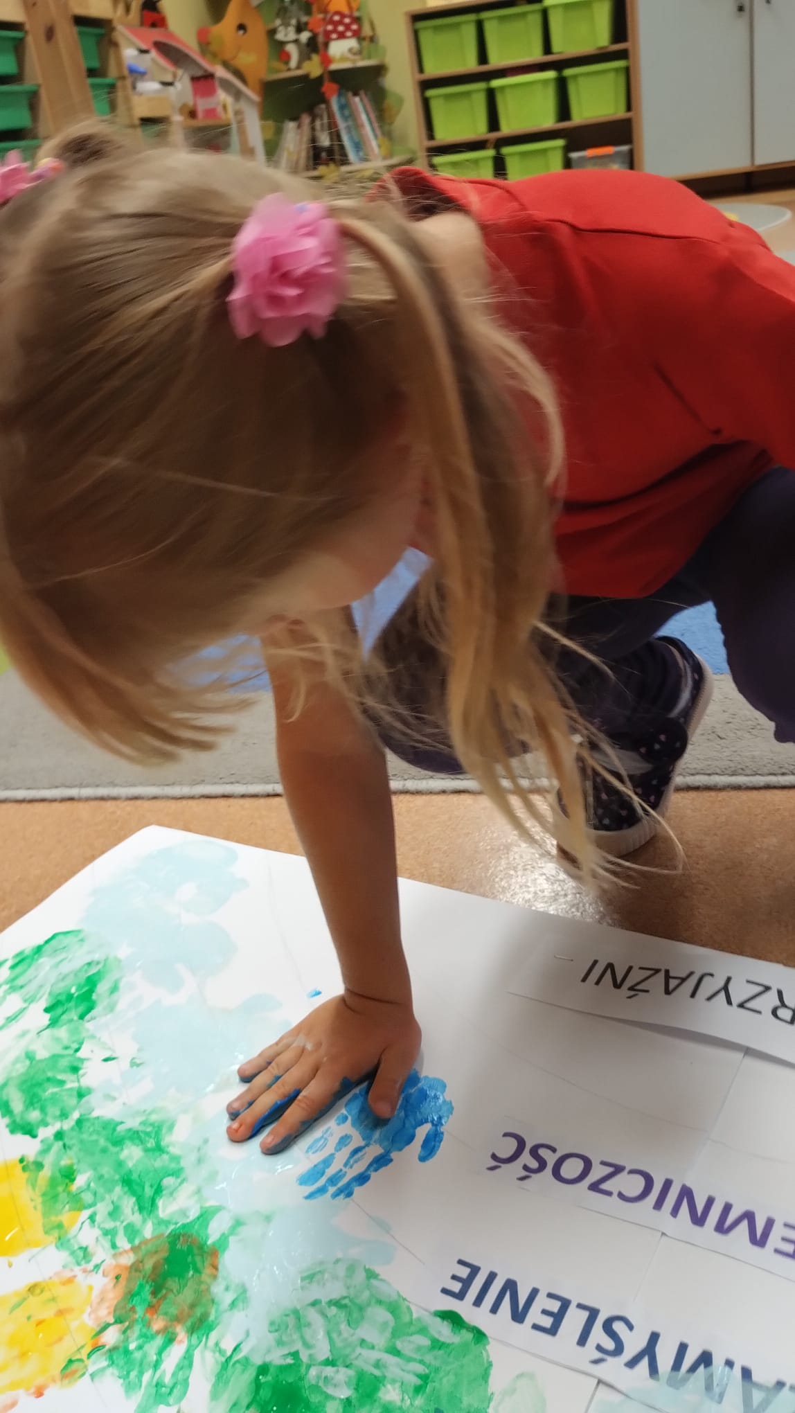Kulminacyjnym punktem zajęć było wspólne tworzenie „Tęczy Przyjaźni”. Każde dziecko zamoczyło swoją dłoń w kolorowej farbie i odciskało ją na dużym arkuszu papieru, tworząc łuki tęczy. Każdy kolor symbolizował inną emocję – radość, spokój, miłość, wdzięczność , życzliwość i tajemniczość. Wspólna praca była okazją do rozmów, śmiechu i dzielenia się dobrymi emocjami .W ten sposób powstało wyjątkowe dzieło, które nie tylko pięknie ozdobiło naszą salę, ale przede wszystkim było wyrazem wspólnoty i bliskości.