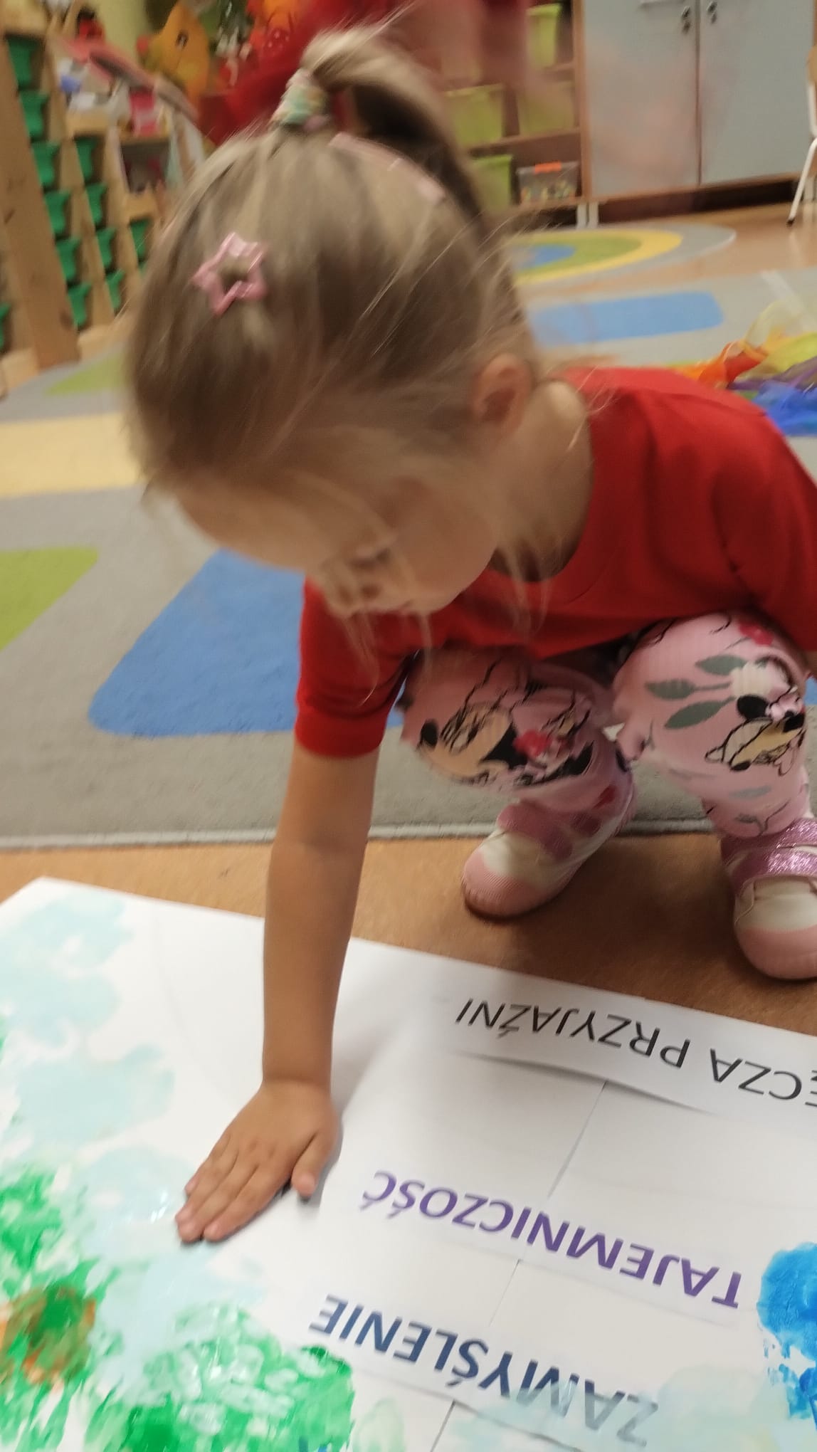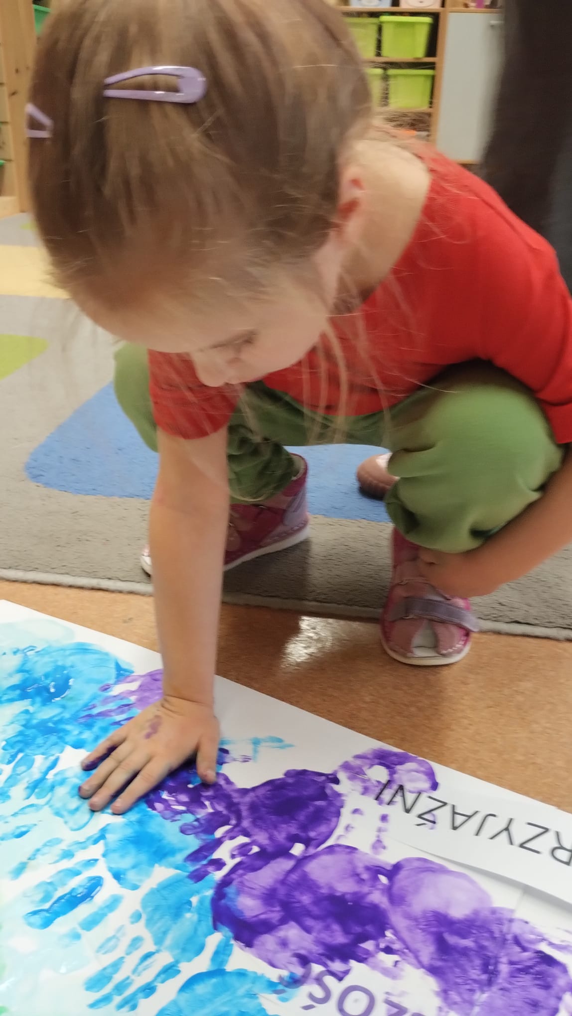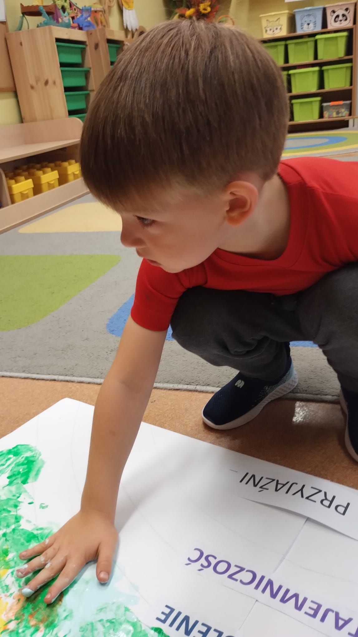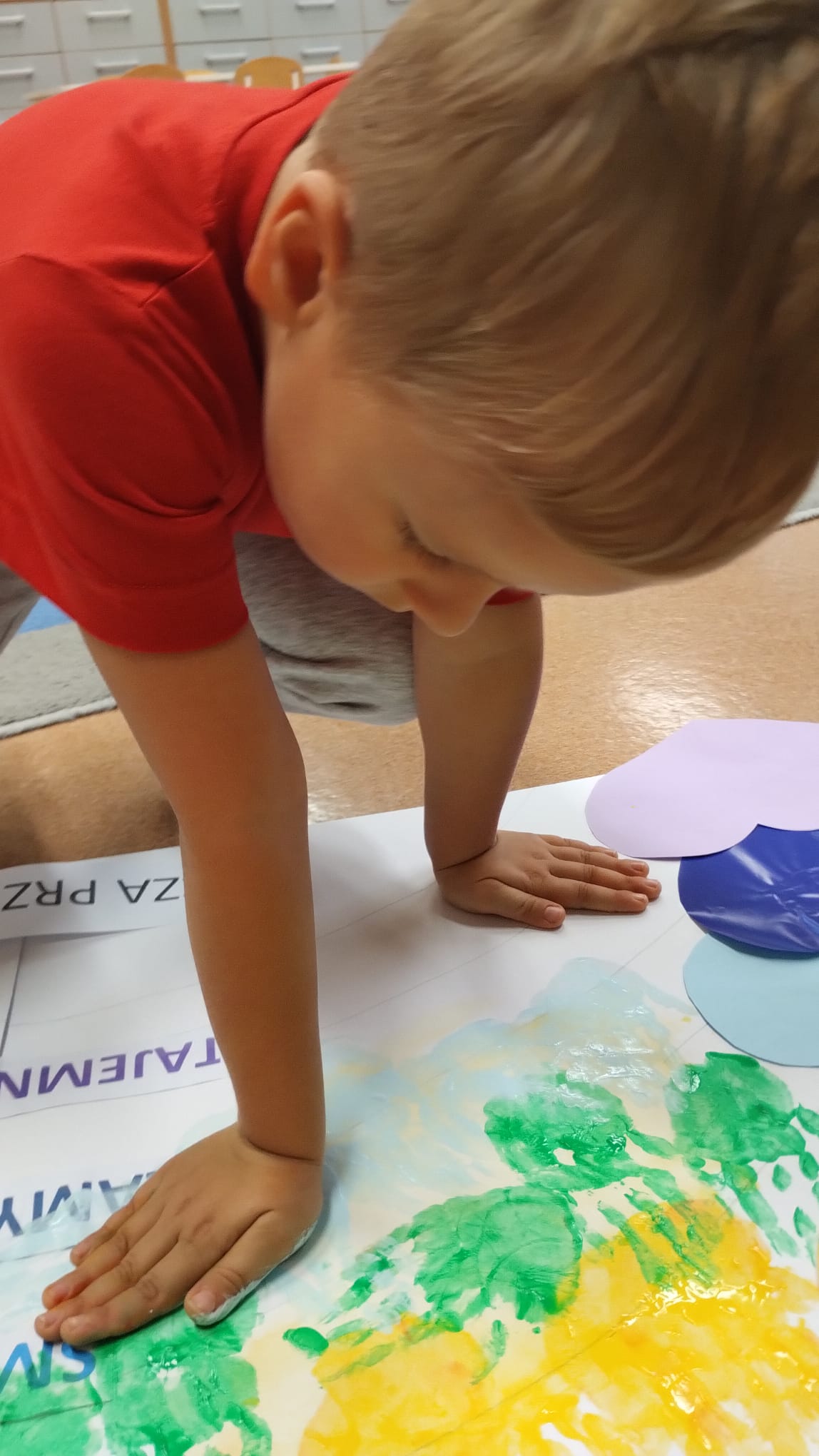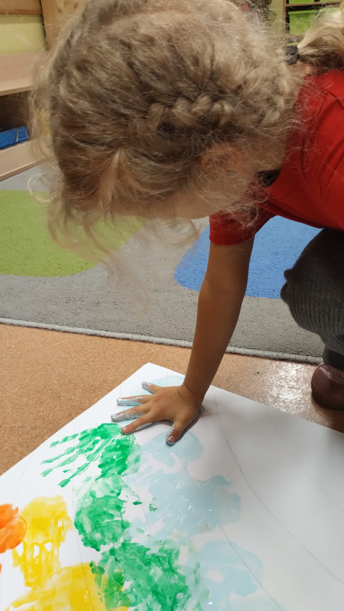 Kulminacyjnym punktem zajęć było wspólne tworzenie „Tęczy Przyjaźni”. Każde dziecko zamoczyło swoją dłoń w kolorowej farbie i odciskało ją na dużym arkuszu papieru, tworząc łuki tęczy. Każdy kolor symbolizował inną emocję – radość, spokój, miłość, wdzięczność , życzliwość i tajemniczość. Wspólna praca była okazją do rozmów, śmiechu i dzielenia się dobrymi emocjami .W ten sposób powstało wyjątkowe dzieło, które nie tylko pięknie ozdobiło naszą salę, ale przede wszystkim było wyrazem wspólnoty i bliskości.
