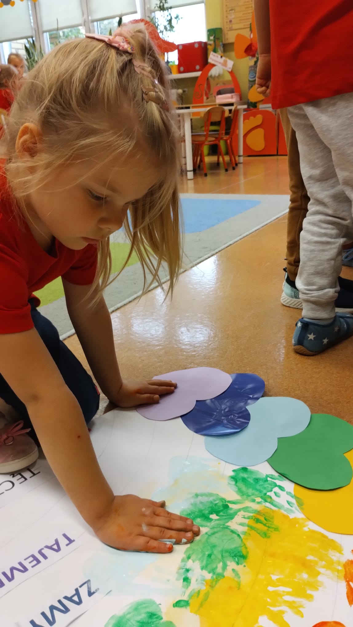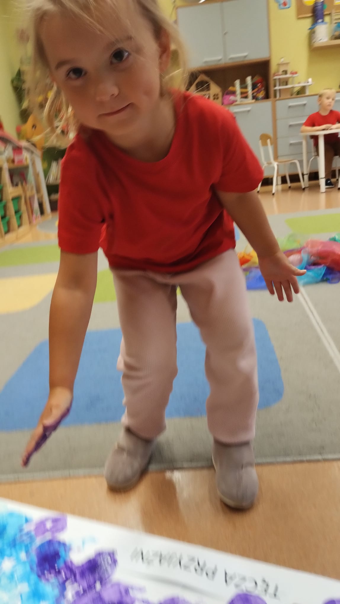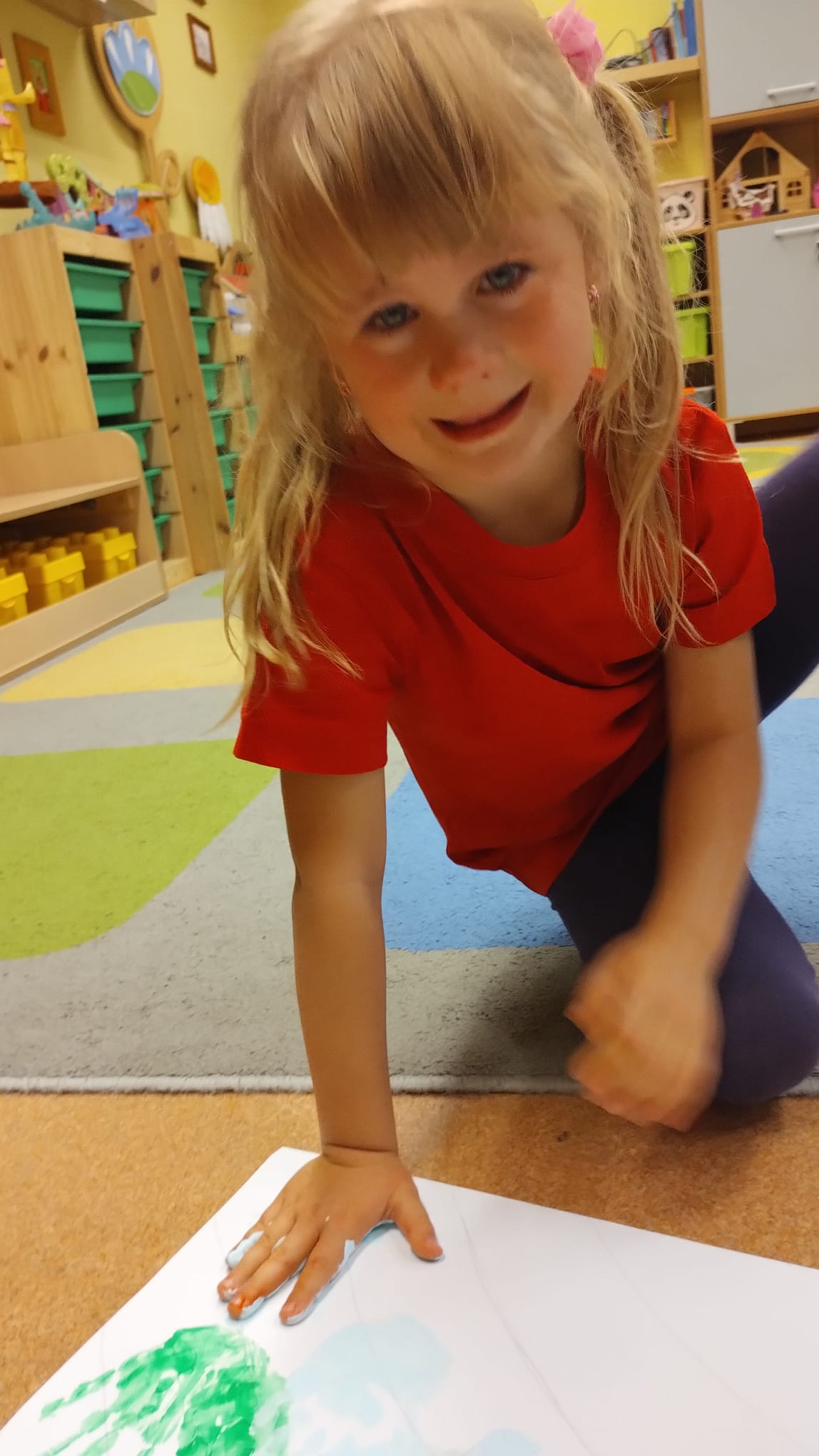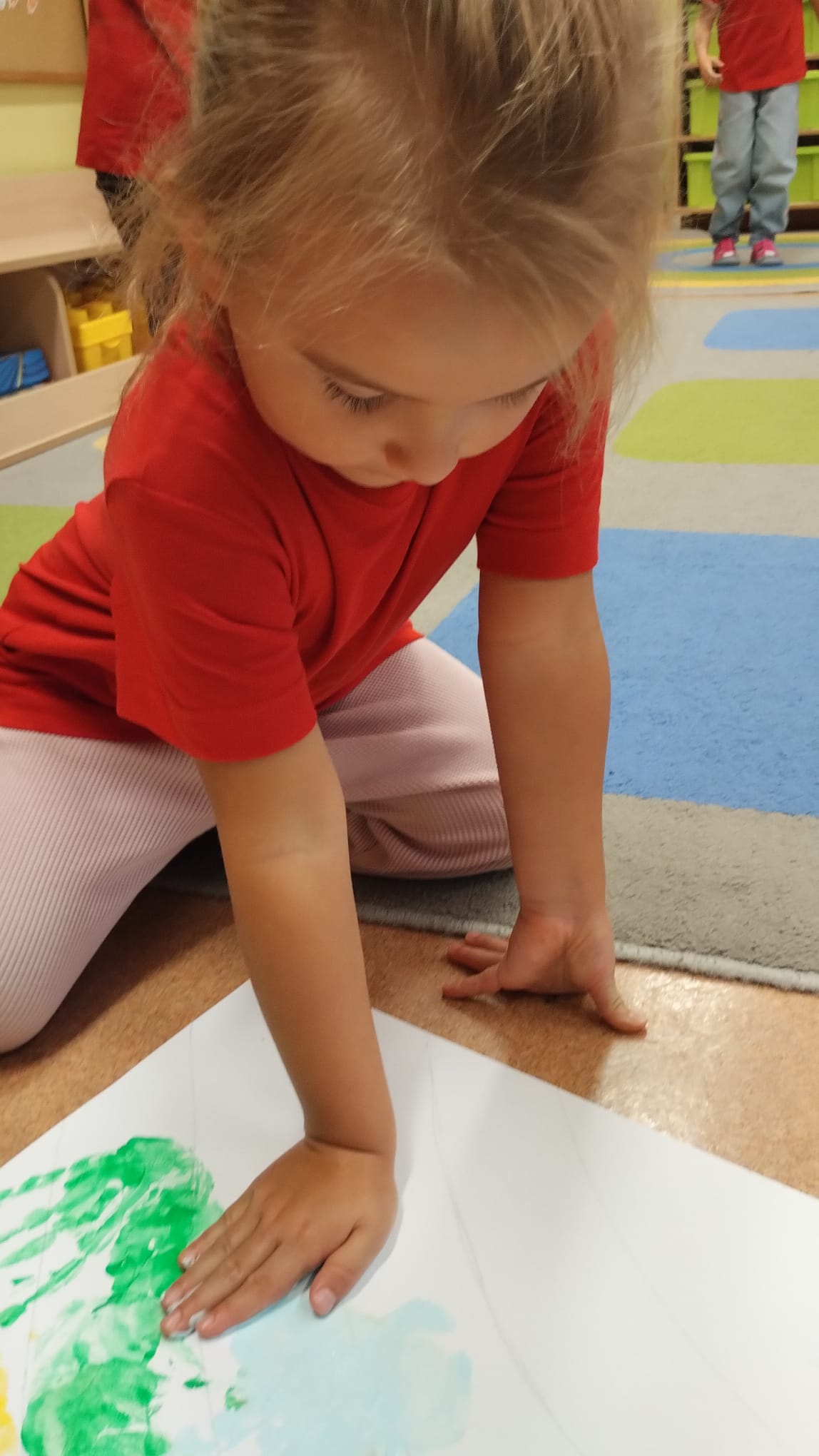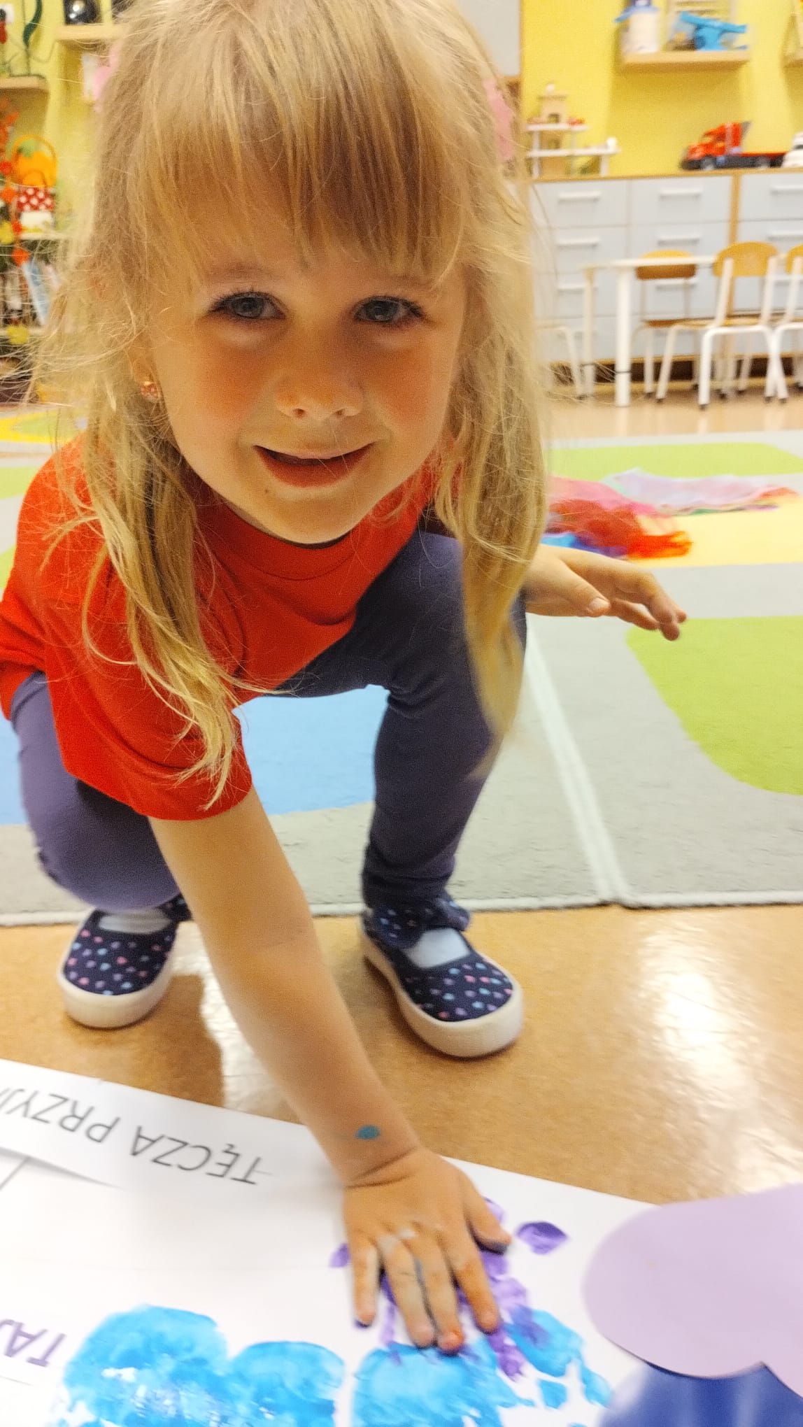 Kulminacyjnym punktem zajęć było wspólne tworzenie „Tęczy Przyjaźni”. Każde dziecko zamoczyło swoją dłoń w kolorowej farbie i odciskało ją na dużym arkuszu papieru, tworząc łuki tęczy. Każdy kolor symbolizował inną emocję – radość, spokój, miłość, wdzięczność , życzliwość i tajemniczość. Wspólna praca była okazją do rozmów, śmiechu i dzielenia się dobrymi emocjami .W ten sposób powstało wyjątkowe dzieło, które nie tylko pięknie ozdobiło naszą salę, ale przede wszystkim było wyrazem wspólnoty i bliskości.