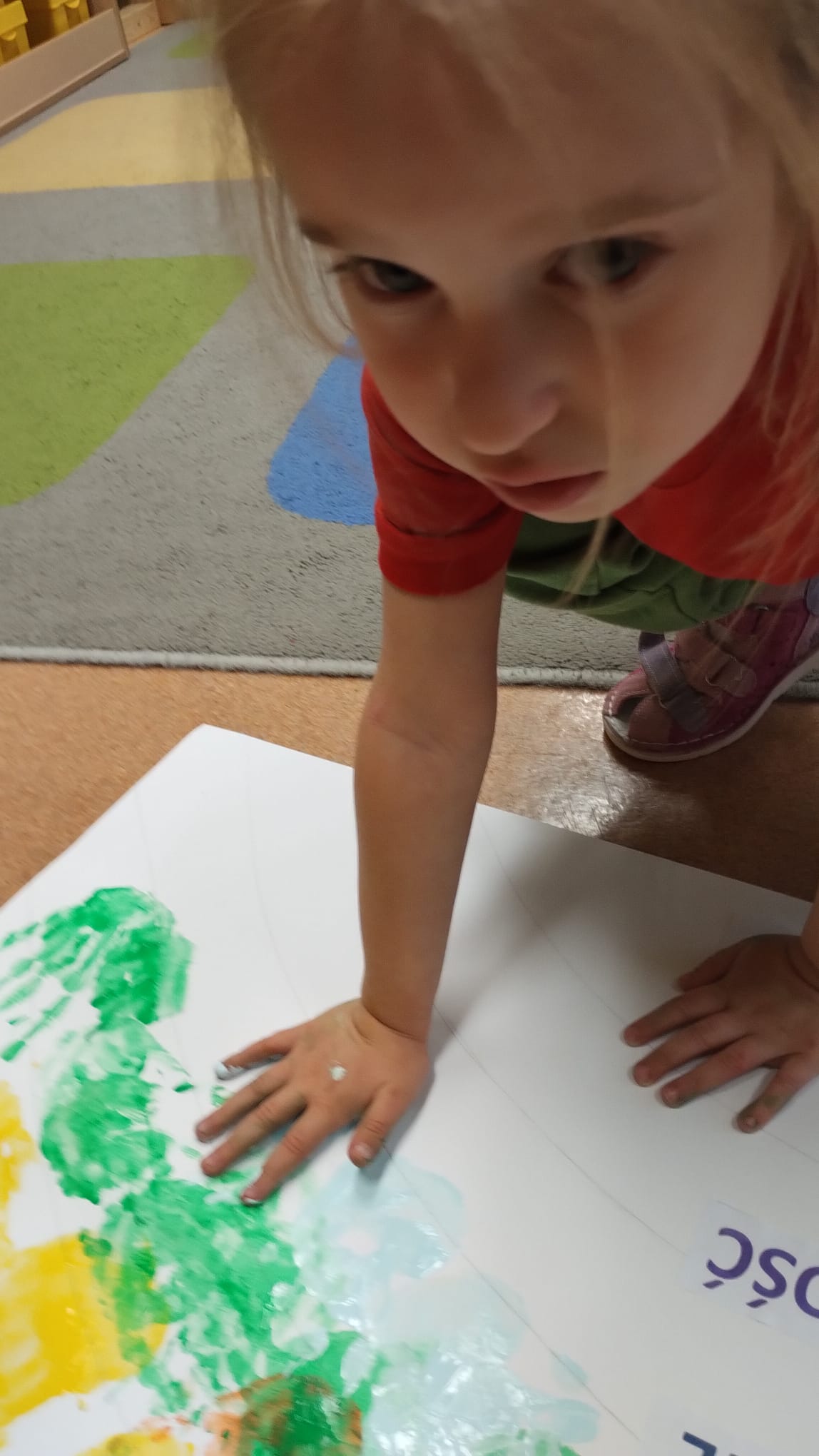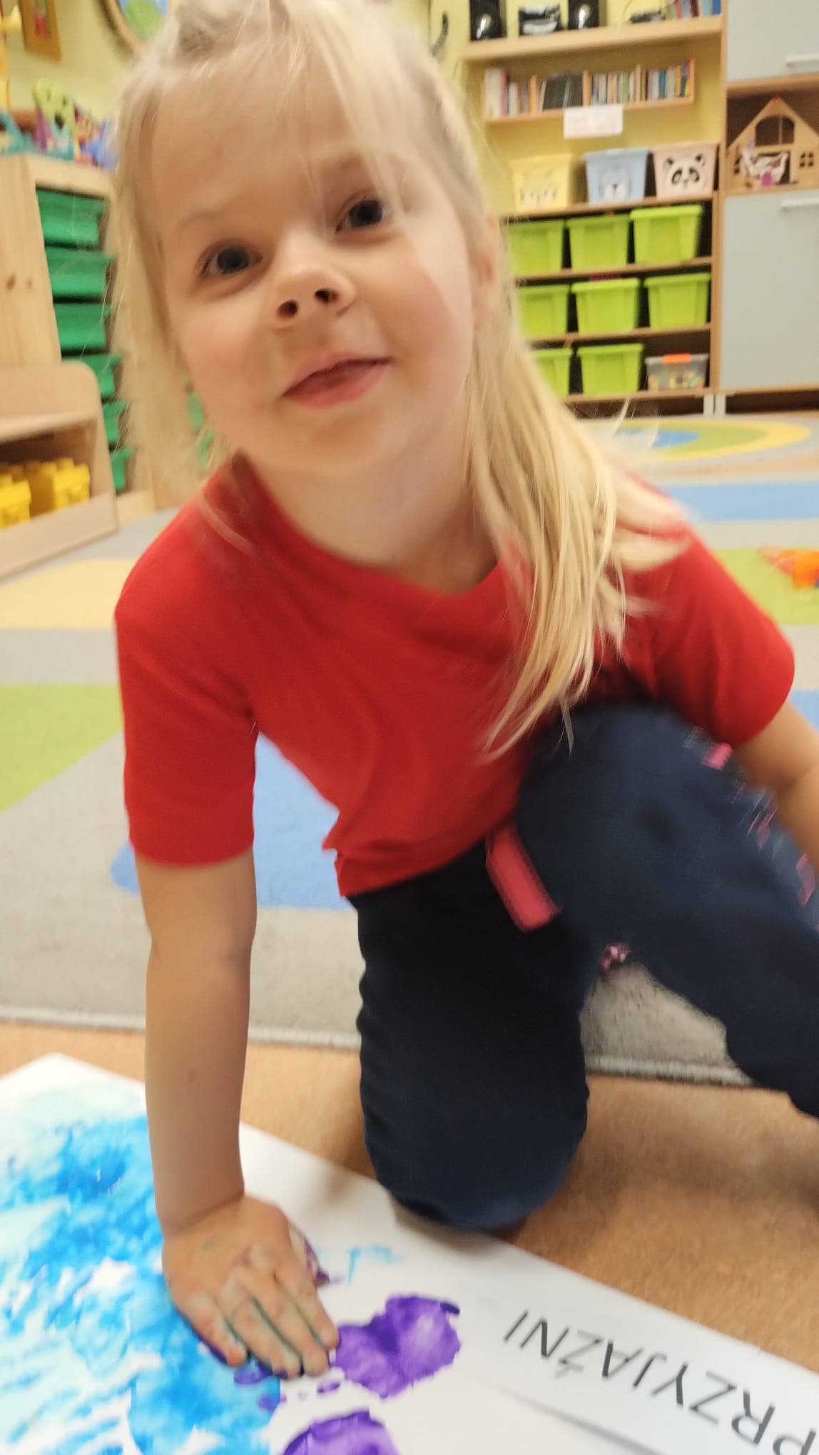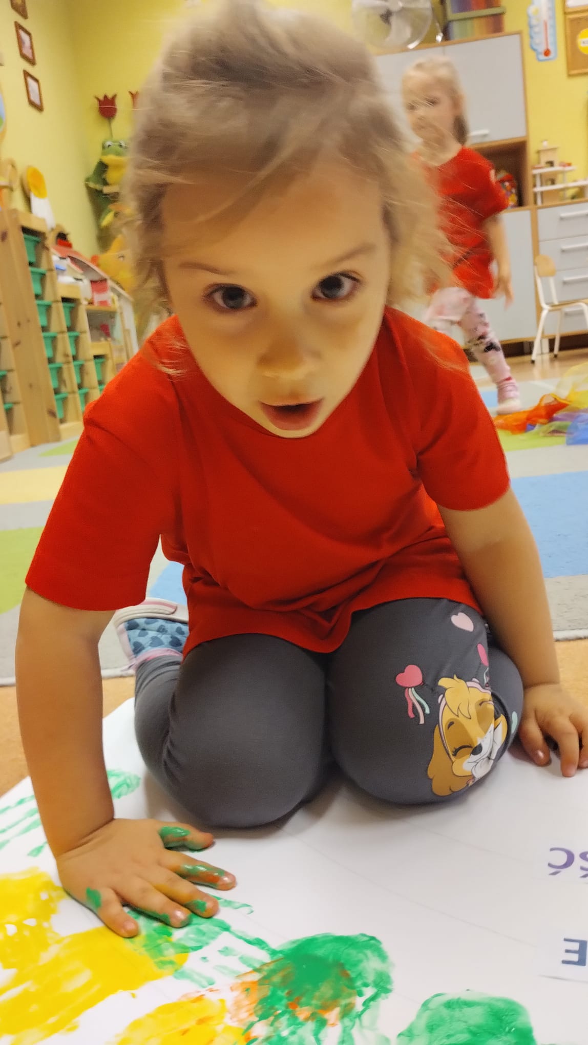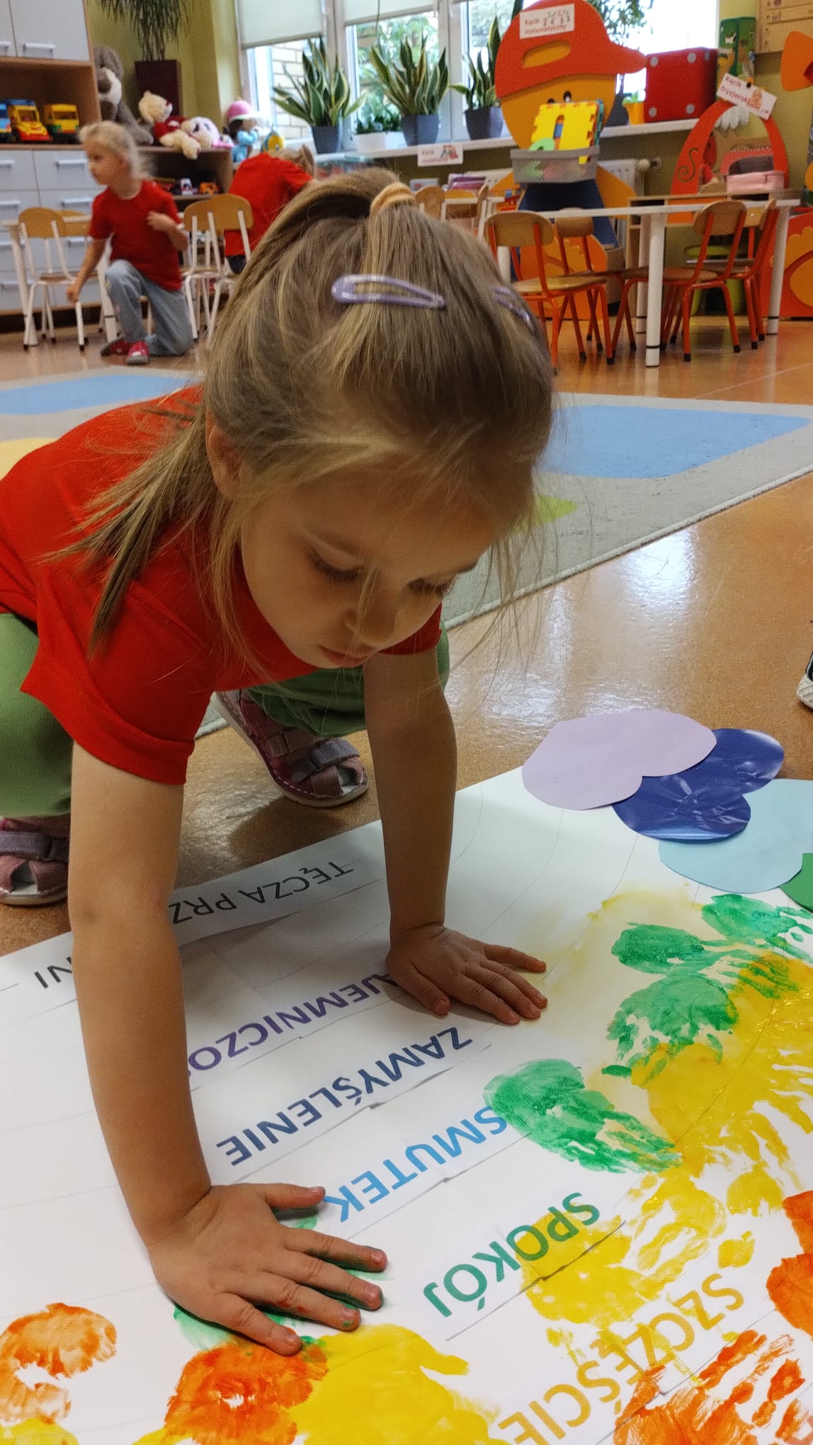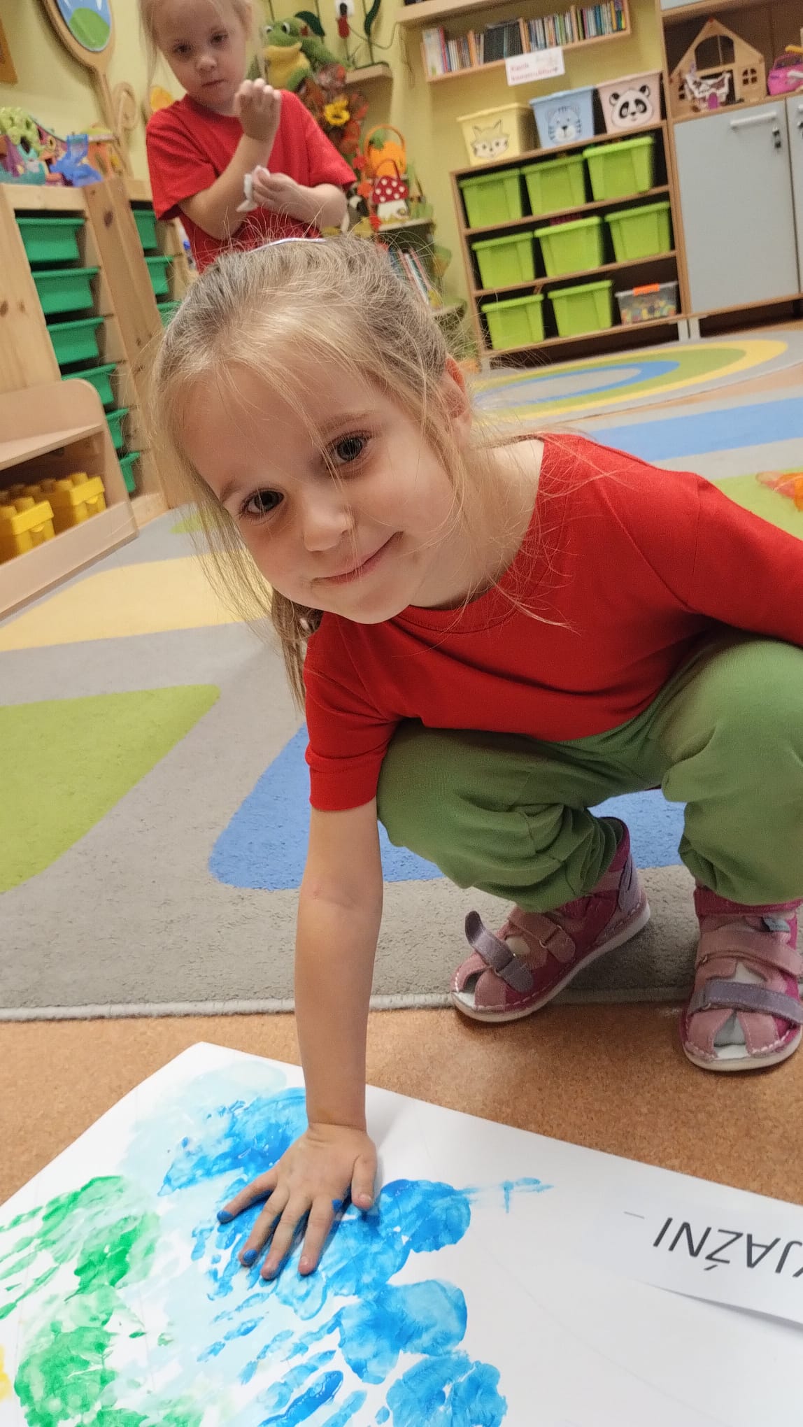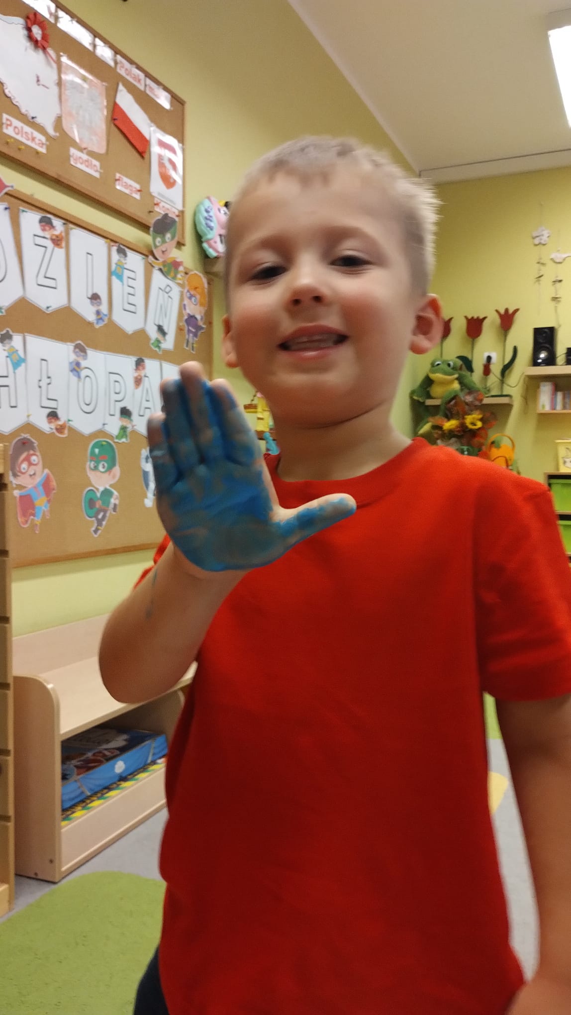 Kulminacyjnym punktem zajęć było wspólne tworzenie „Tęczy Przyjaźni”. Każde dziecko zamoczyło swoją dłoń w kolorowej farbie i odciskało ją na dużym arkuszu papieru, tworząc łuki tęczy. Każdy kolor symbolizował inną emocję – radość, spokój, miłość, wdzięczność , życzliwość i tajemniczość. Wspólna praca była okazją do rozmów, śmiechu i dzielenia się dobrymi emocjami .W ten sposób powstało wyjątkowe dzieło, które nie tylko pięknie ozdobiło naszą salę, ale przede wszystkim było wyrazem wspólnoty i bliskości.