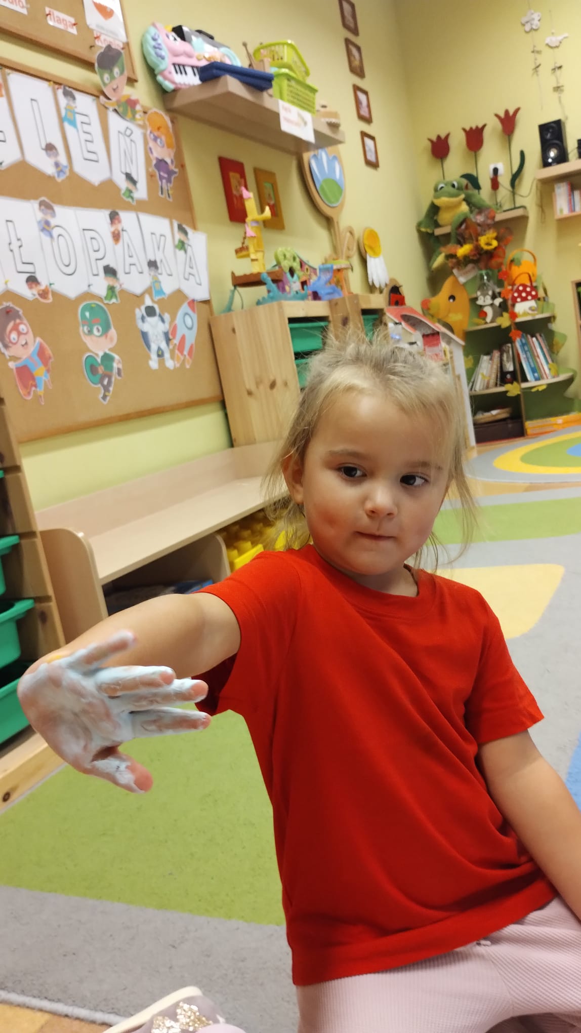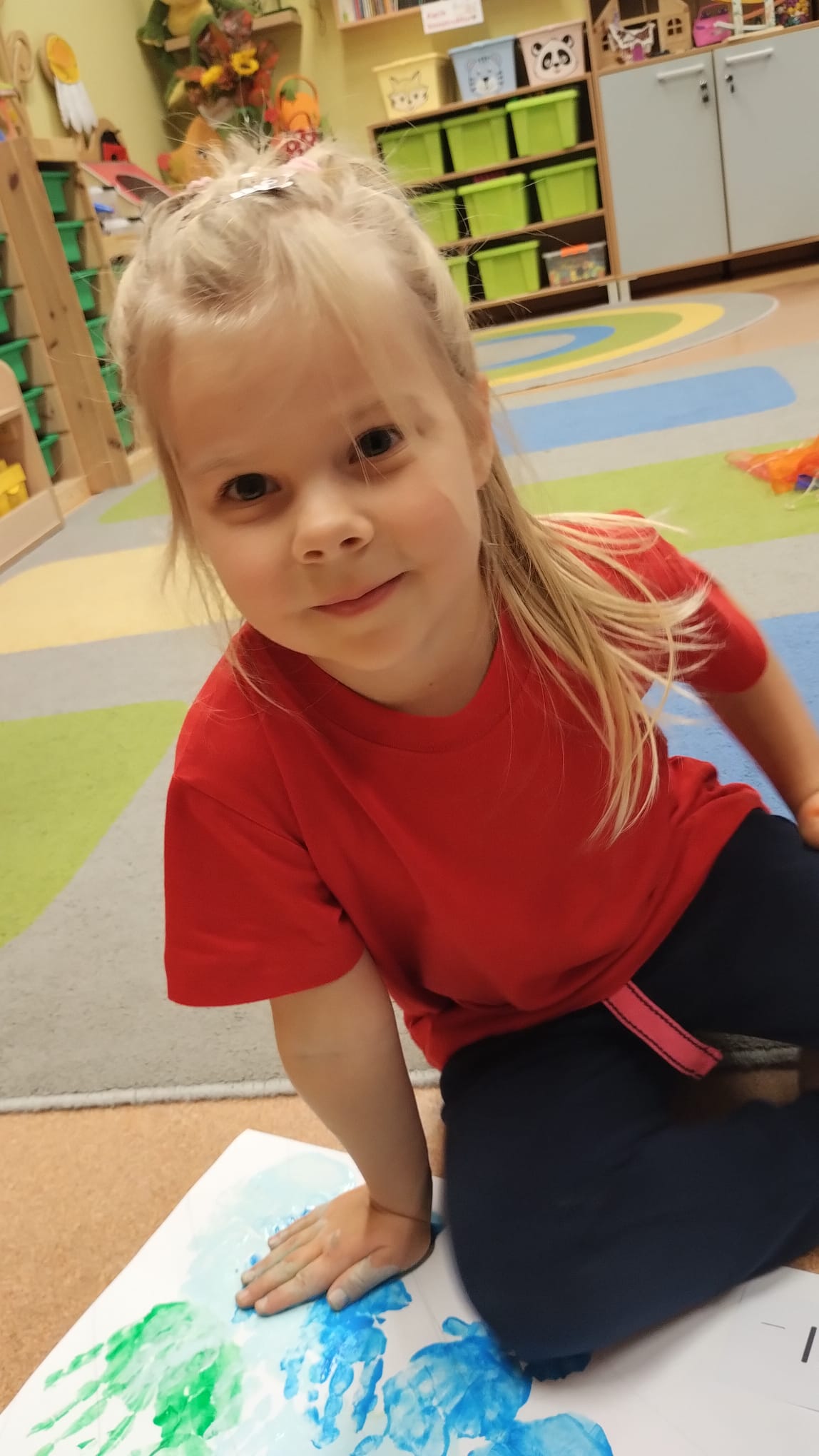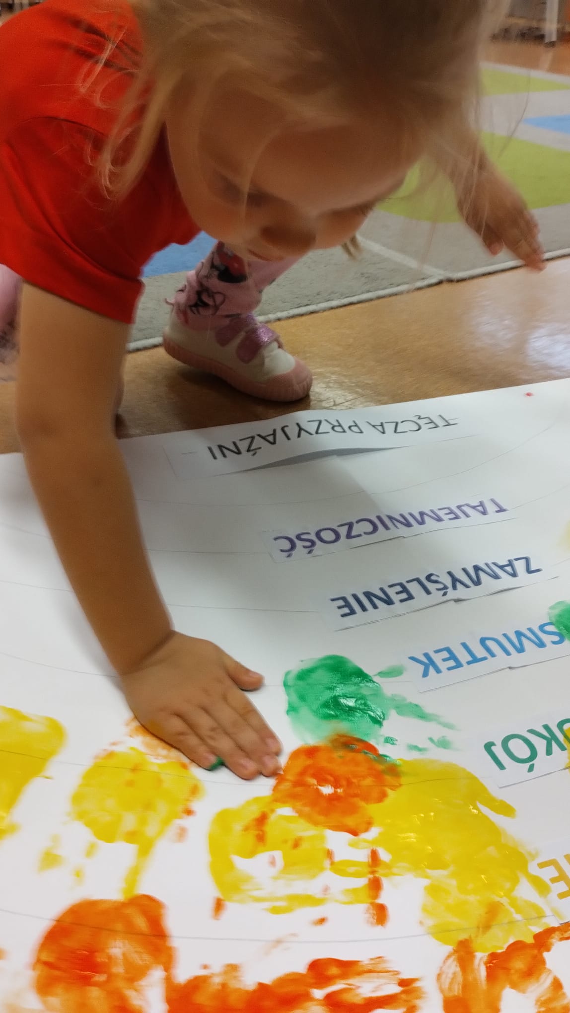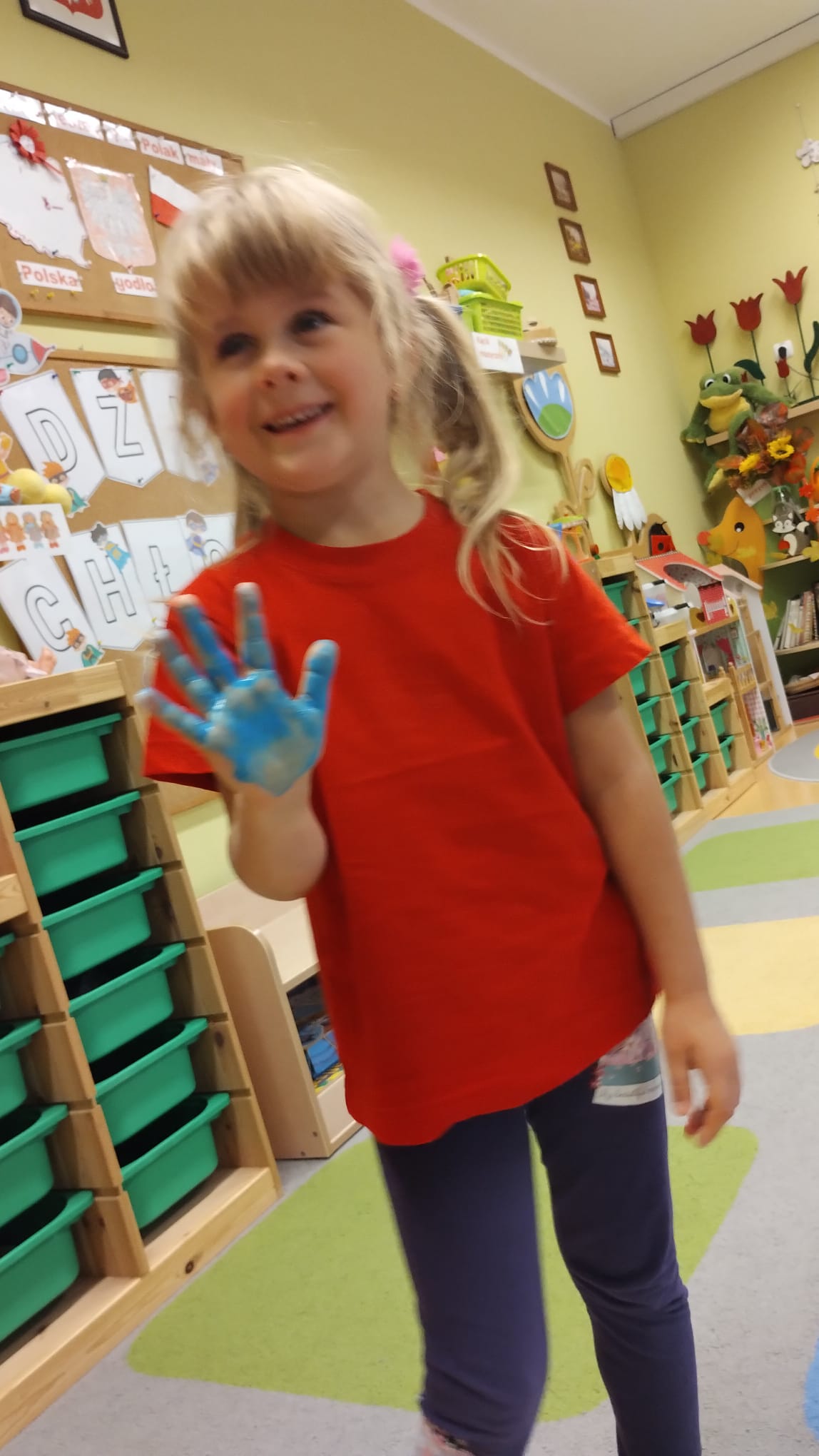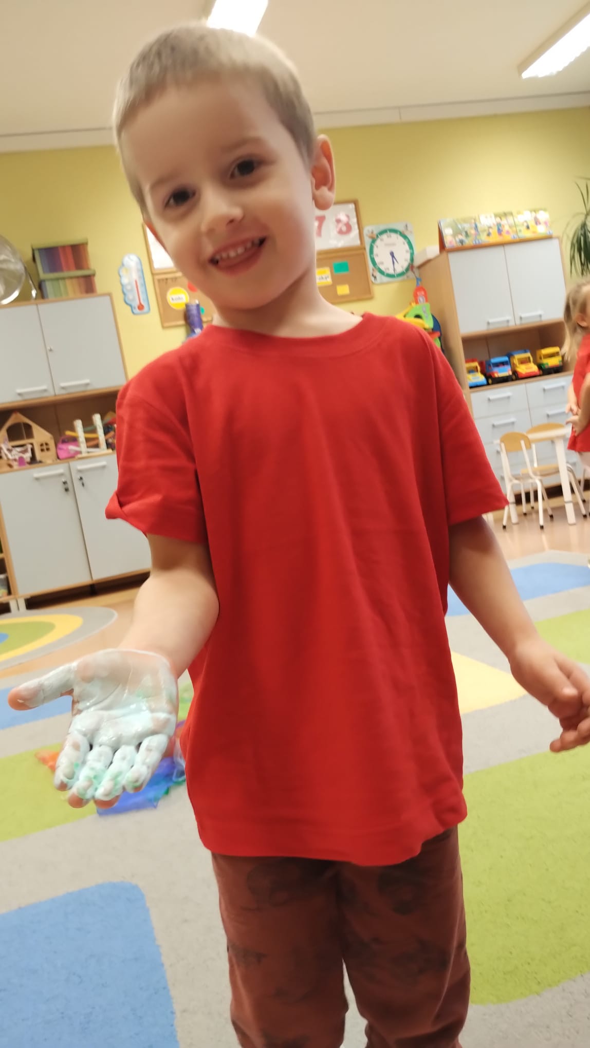 Kulminacyjnym punktem zajęć było wspólne tworzenie „Tęczy Przyjaźni”. Każde dziecko zamoczyło swoją dłoń w kolorowej farbie i odciskało ją na dużym arkuszu papieru, tworząc łuki tęczy. Każdy kolor symbolizował inną emocję – radość, spokój, miłość, wdzięczność , życzliwość i tajemniczość. Wspólna praca była okazją do rozmów, śmiechu i dzielenia się dobrymi emocjami .W ten sposób powstało wyjątkowe dzieło, które nie tylko pięknie ozdobiło naszą salę, ale przede wszystkim było wyrazem wspólnoty i bliskości.