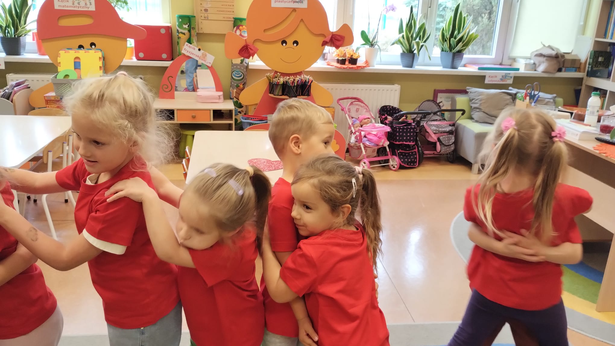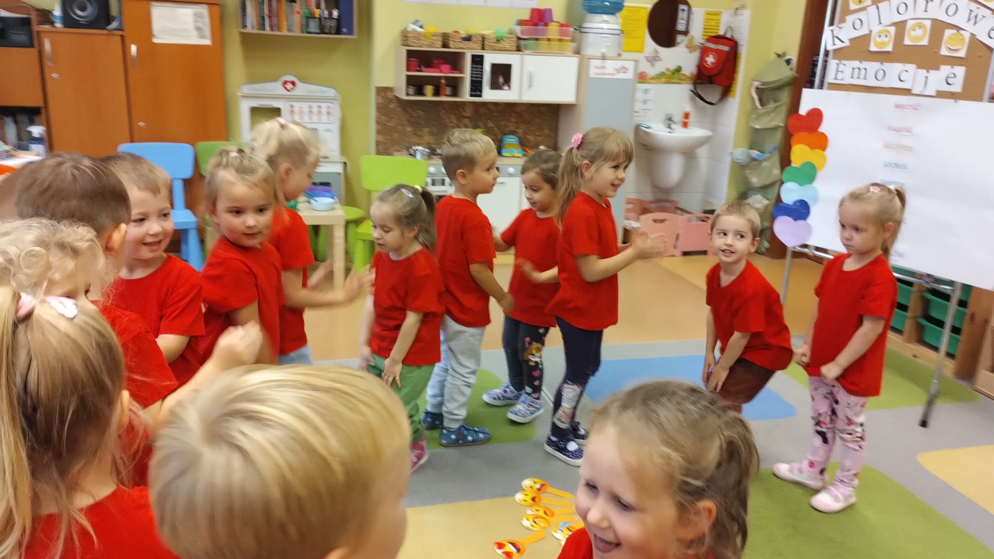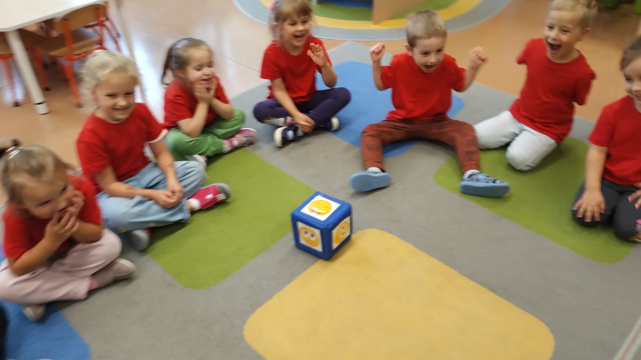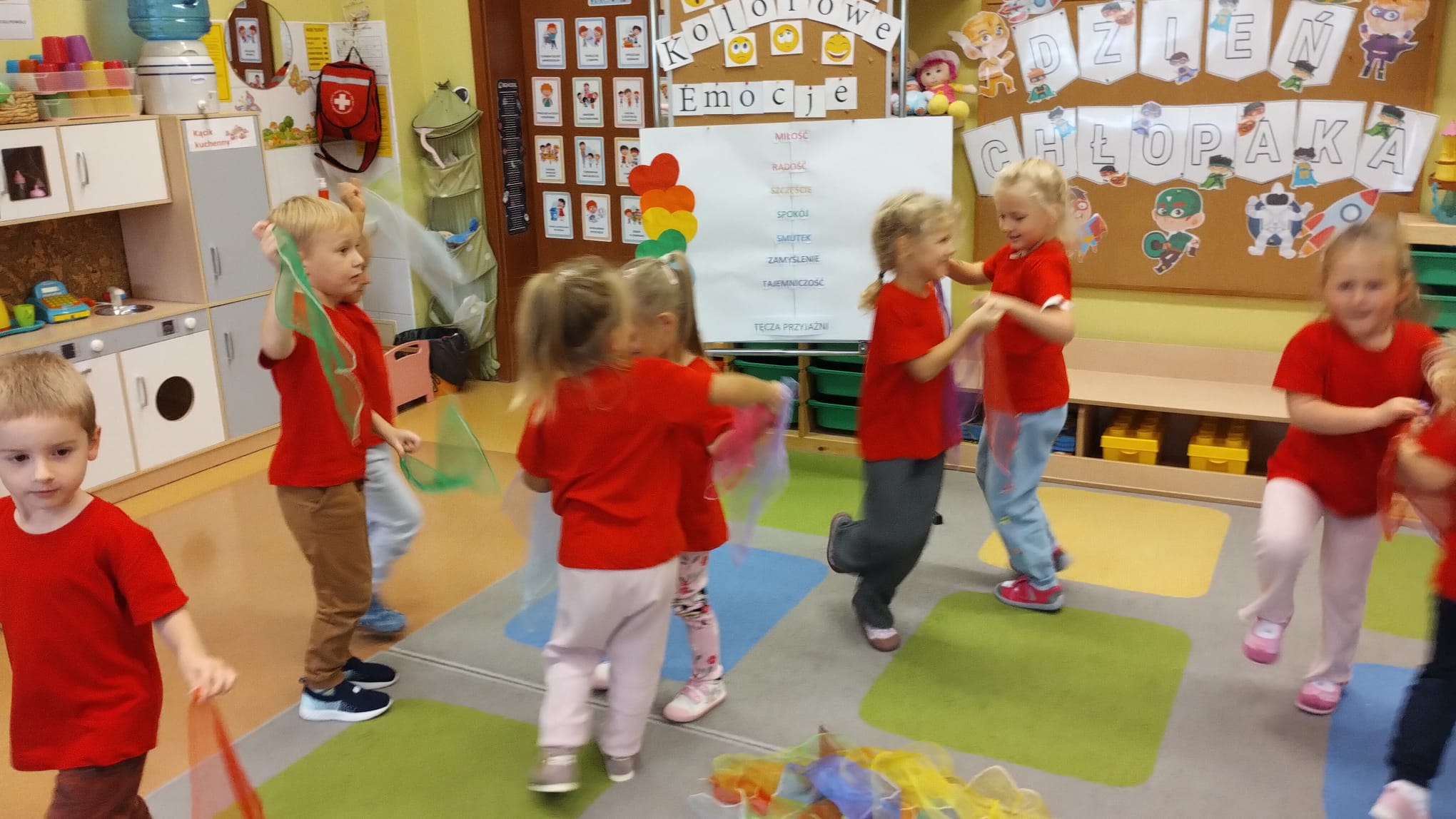 30 września w grupie czterolatków świętowaliśmy Dzień Chłopaka w wyjątkowy sposób – łącząc zabawę z realizacją innowacji pedagogicznej „Kolorowe Emocje”, a także w ramach Tygodnia Budowania Relacji. Dzień rozpoczęliśmy od rozmów o przyjaźni i wzajemnym szacunku. Dzieci poznały różne emocje i uczyły się je rozpoznawać oraz wyrażać – zarówno słowami, jak i gestem czy mimiką. Pomogły nam w tym kolorowe ilustracje oraz zabawy dramowe. Szczególną uwagę poświęciliśmy radości, wdzięczności i życzliwości – emocjom, które towarzyszyły nam przez cały dzień. W ramach Tygodnia Budowania Relacji podejmowaliśmy różnorodne działania mające na celu integrację grupy, wzmacnianie więzi oraz rozwijanie umiejętności społecznych. Nie zabrakło wspólnych zabaw ruchowych, tańców oraz gier zespołowych, które sprzyjały współpracy, empatii i wzajemnemu zrozumieniu. Dzieci spontanicznie dzieliły się swoimi doświadczeniami – mówiły, czym jest przyjaźń, jakie emocje jej towarzyszą i jak można być dobrym przyjacielem, kiedy czują się szczęśliwe, kto im pomaga w trudnych chwilach i dlaczego lubią swoich kolegów i koleżanki.