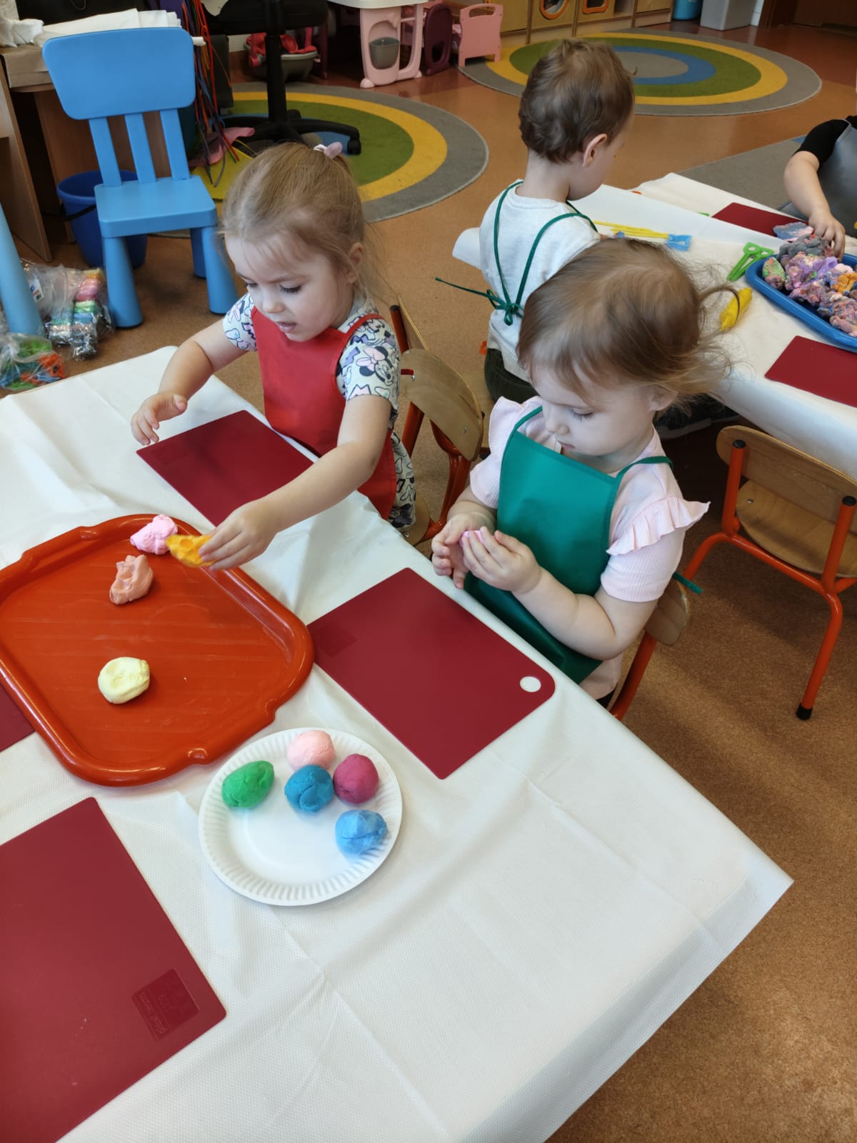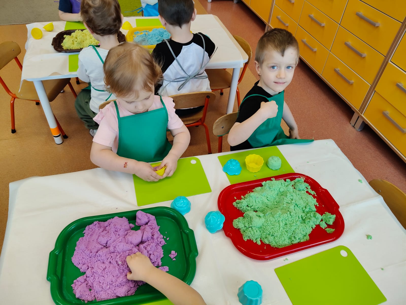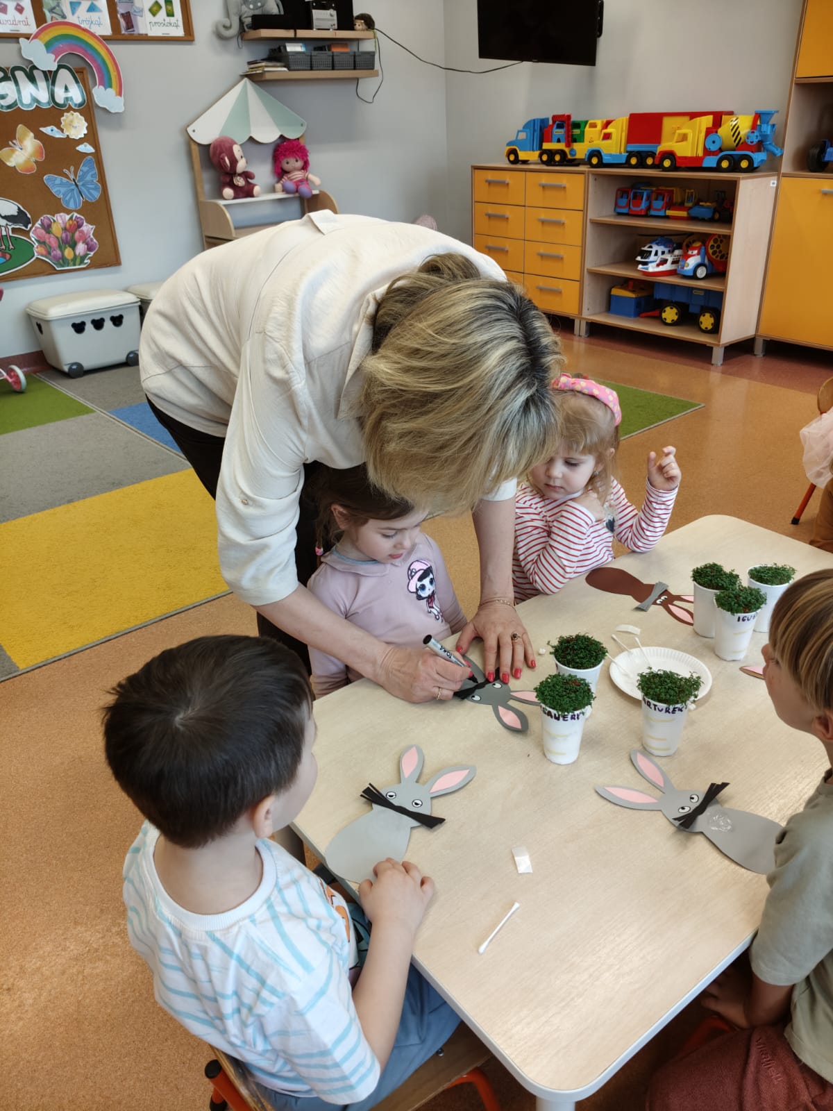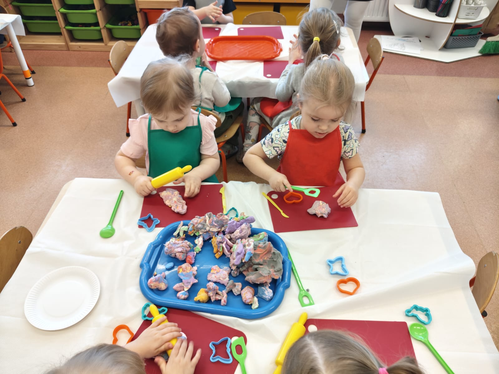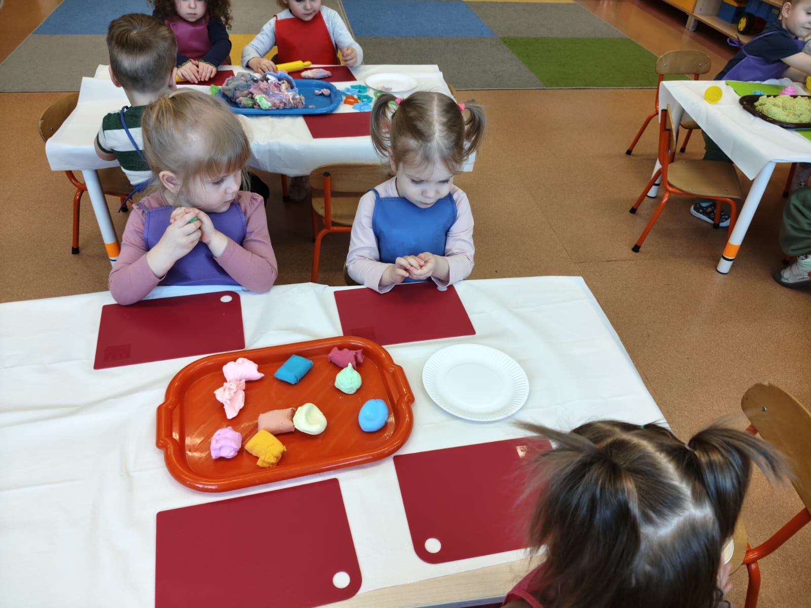 Podczas zajęć dzieci ugniatały, formowały i wycinały kształty przy użyciu foremek, co sprzyjało doskonaleniu koordynacji ręka–oko. Zabawy przebiegały w miłej, świątecznej atmosferze, a wykonane prace stały się piękną dekoracją sali. Zajęcia nie tylko wprowadziły dzieci w tematykę Świąt Wielkanocnych, ale także wspierały ich rozwój.