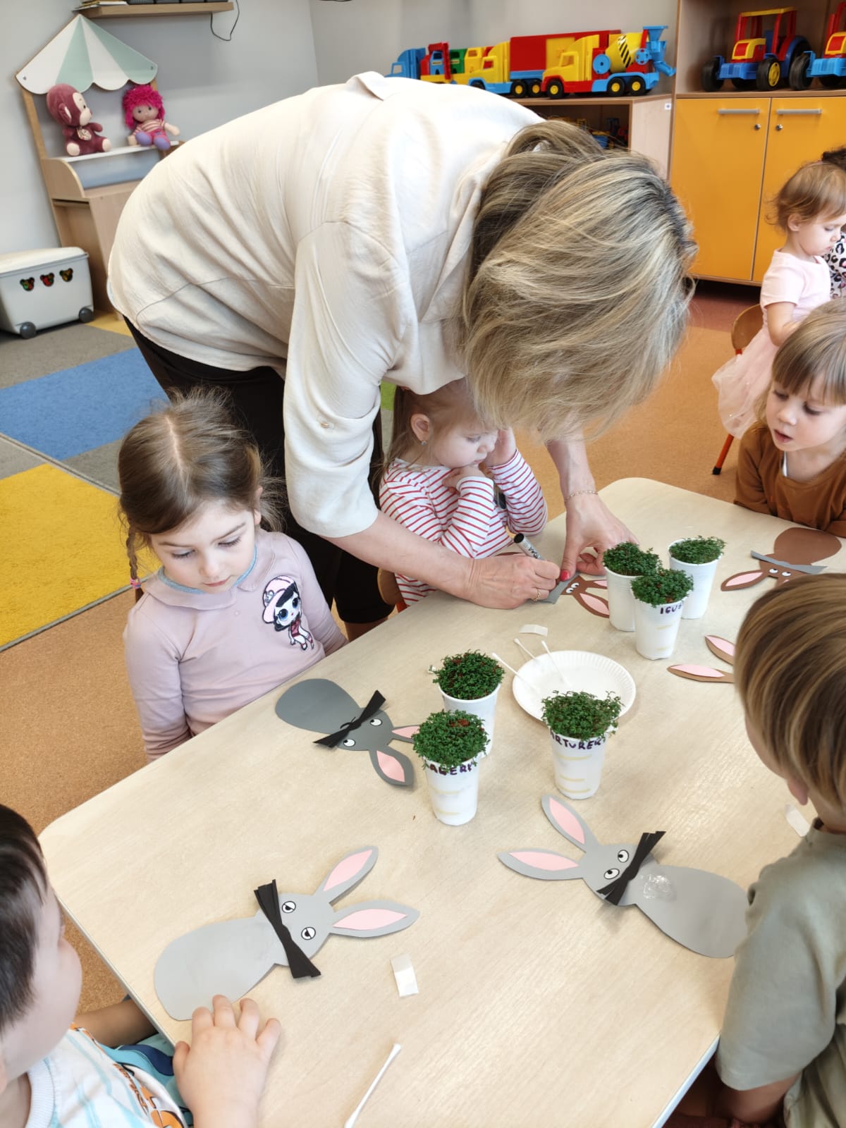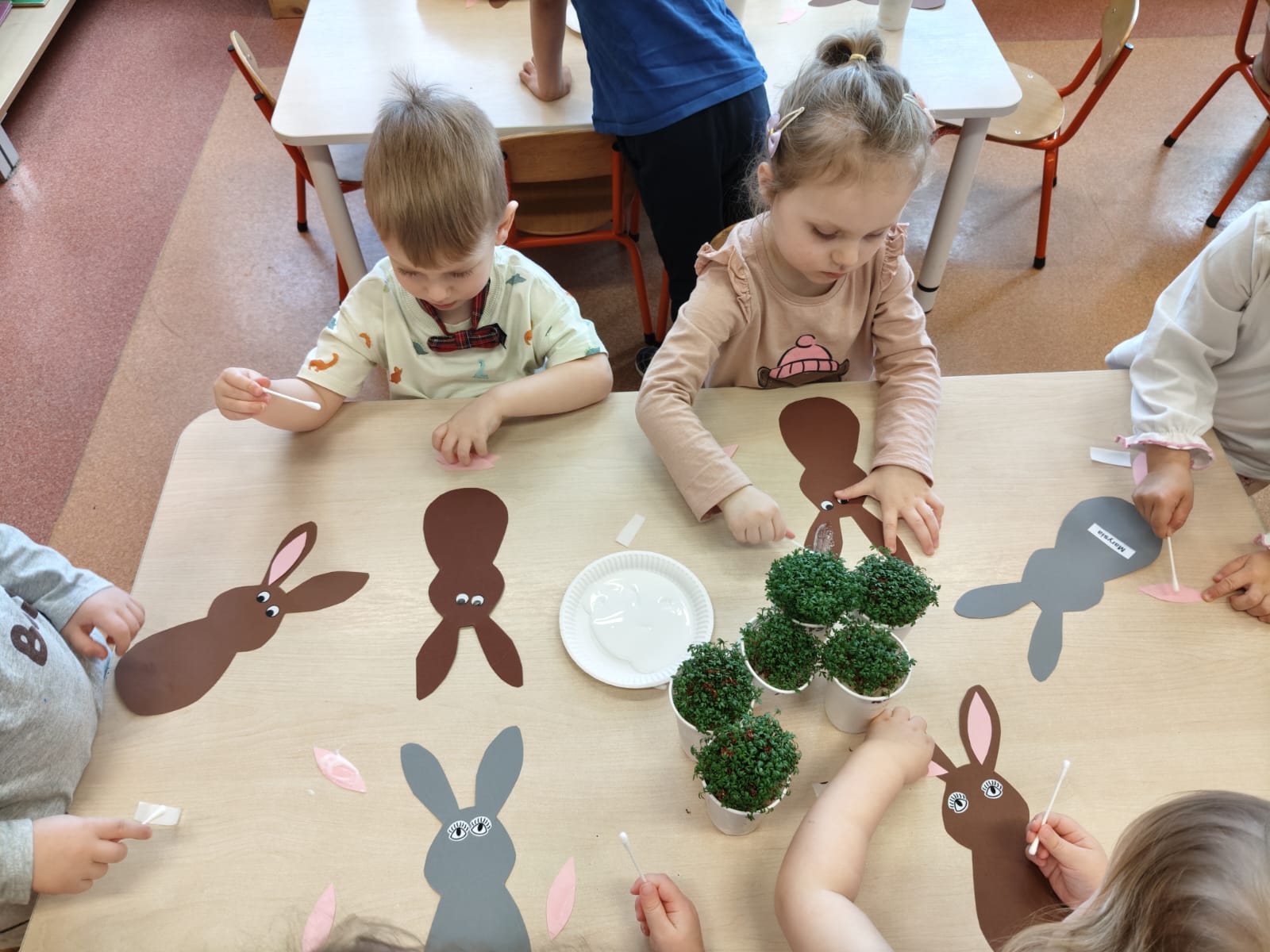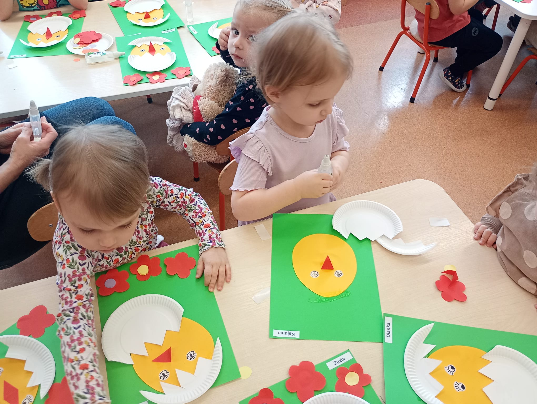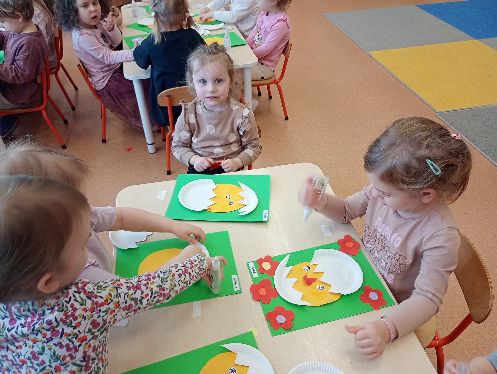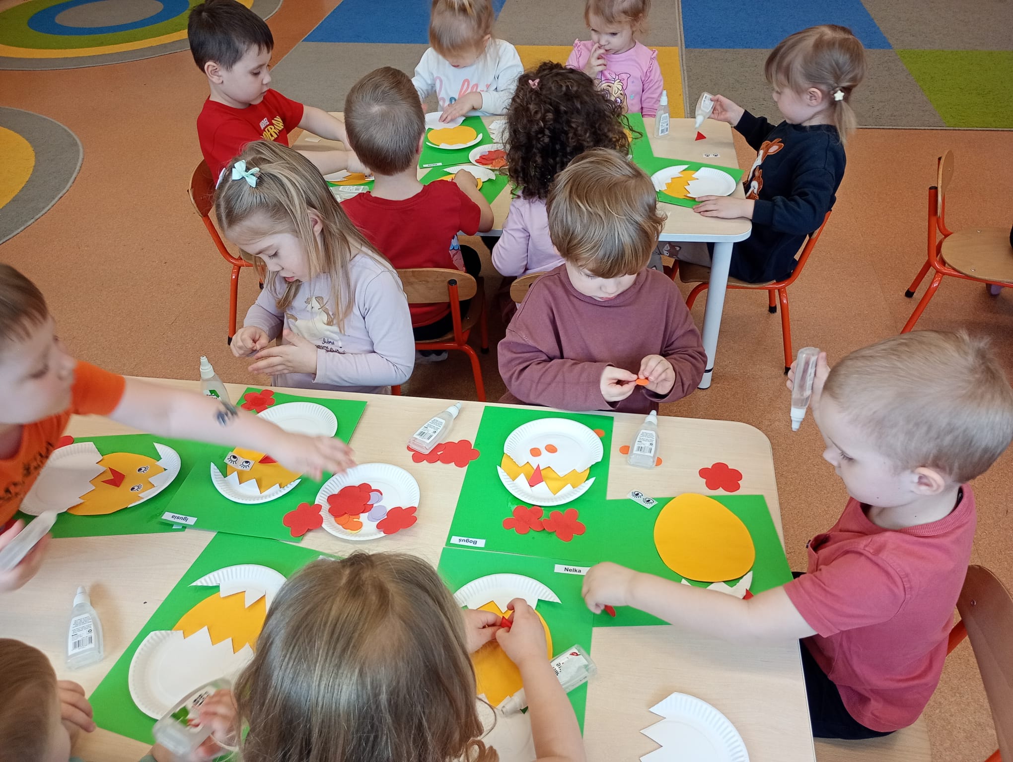 Podczas zajęć dzieci ugniatały, formowały i wycinały kształty przy użyciu foremek, co sprzyjało doskonaleniu koordynacji ręka–oko. Zabawy przebiegały w miłej, świątecznej atmosferze, a wykonane prace stały się piękną dekoracją sali. Zajęcia nie tylko wprowadziły dzieci w tematykę Świąt Wielkanocnych, ale także wspierały ich rozwój.