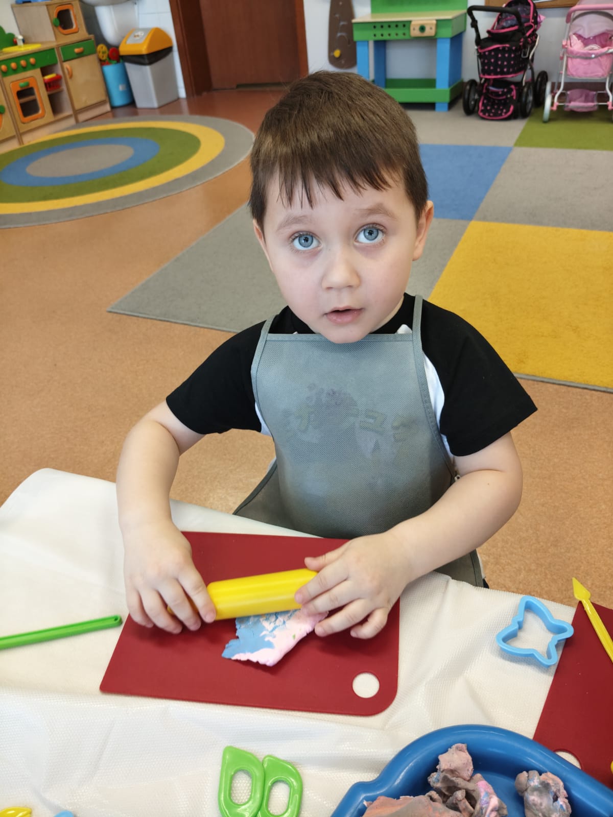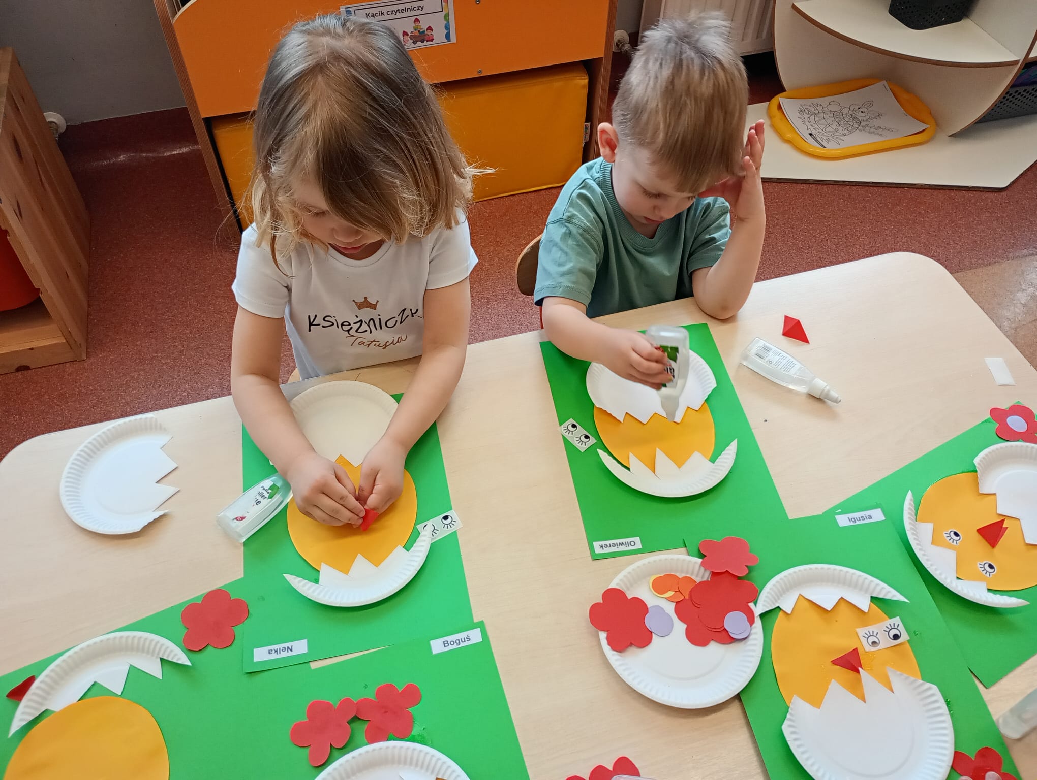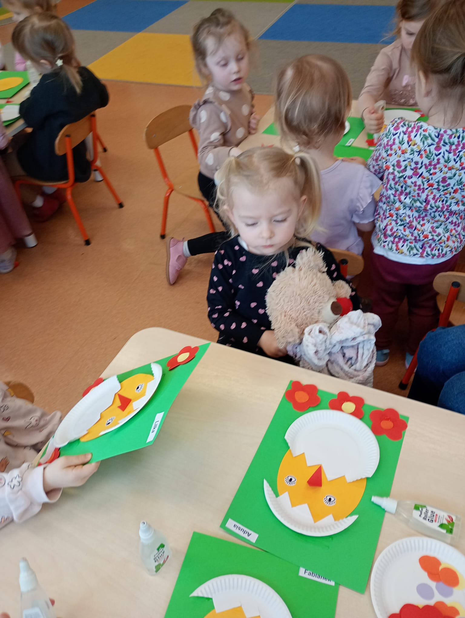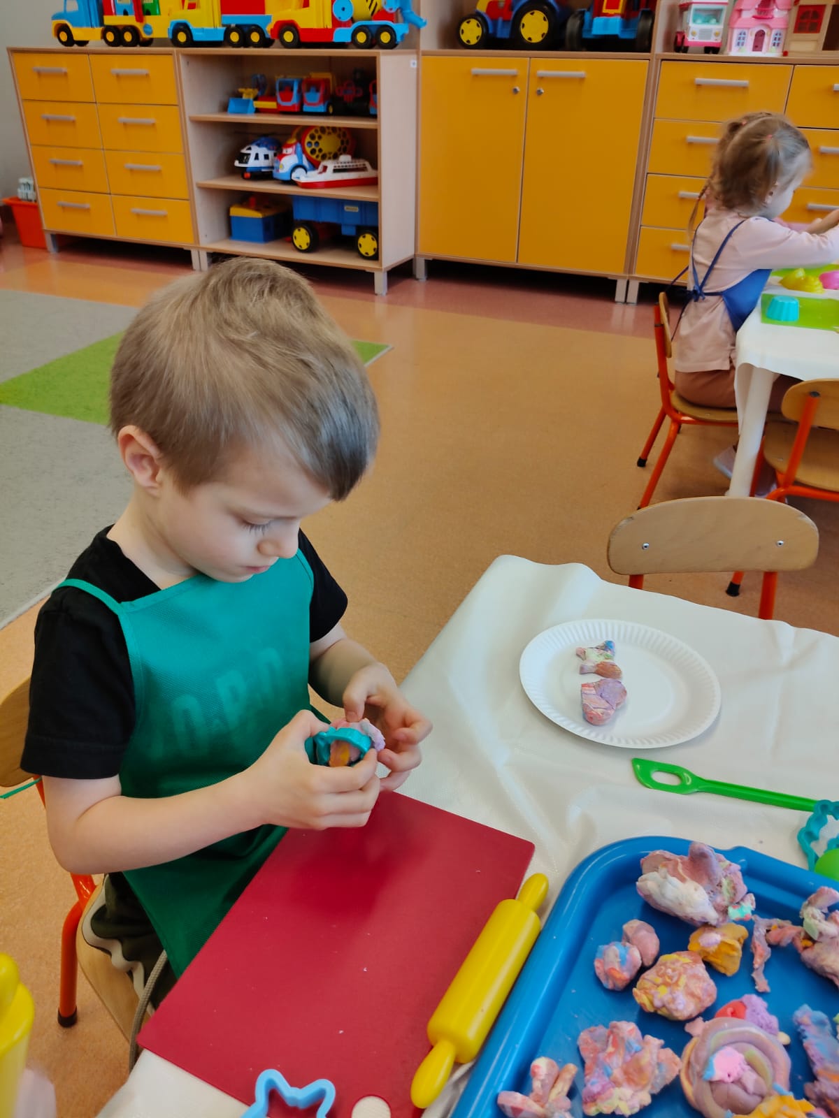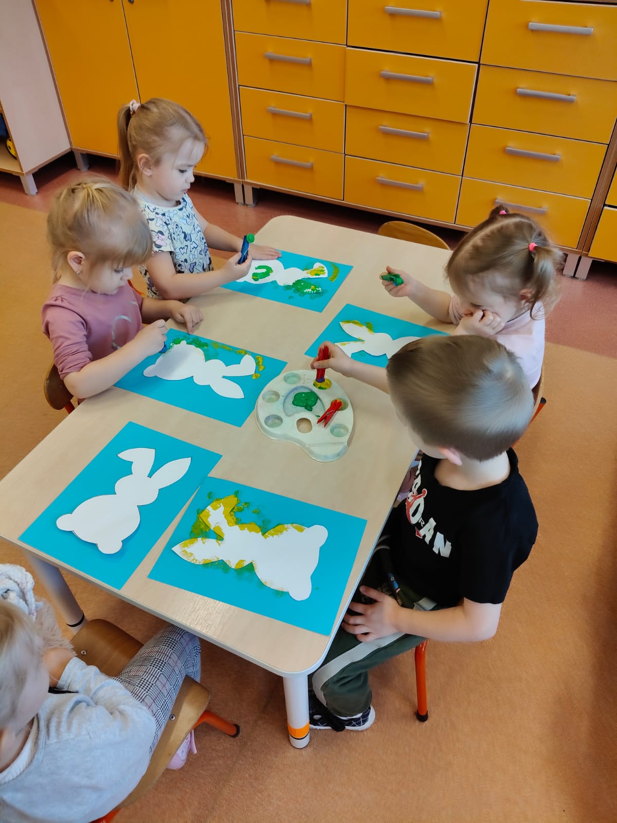 Podczas zajęć dzieci ugniatały, formowały i wycinały kształty przy użyciu foremek, co sprzyjało doskonaleniu koordynacji ręka–oko. Zabawy przebiegały w miłej, świątecznej atmosferze, a wykonane prace stały się piękną dekoracją sali. Zajęcia nie tylko wprowadziły dzieci w tematykę Świąt Wielkanocnych, ale także wspierały ich rozwój.