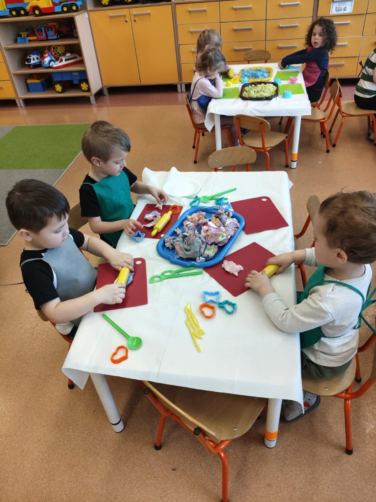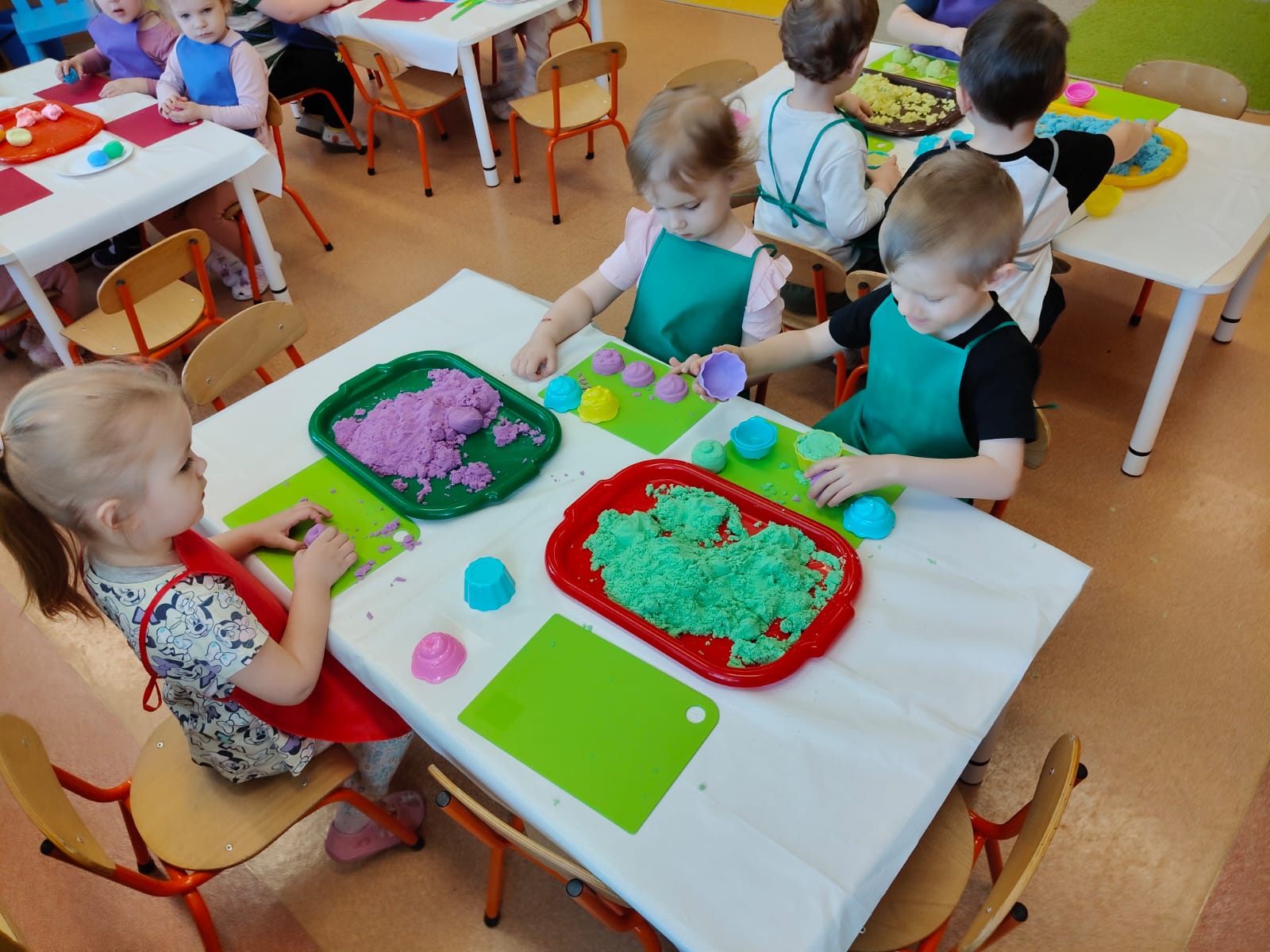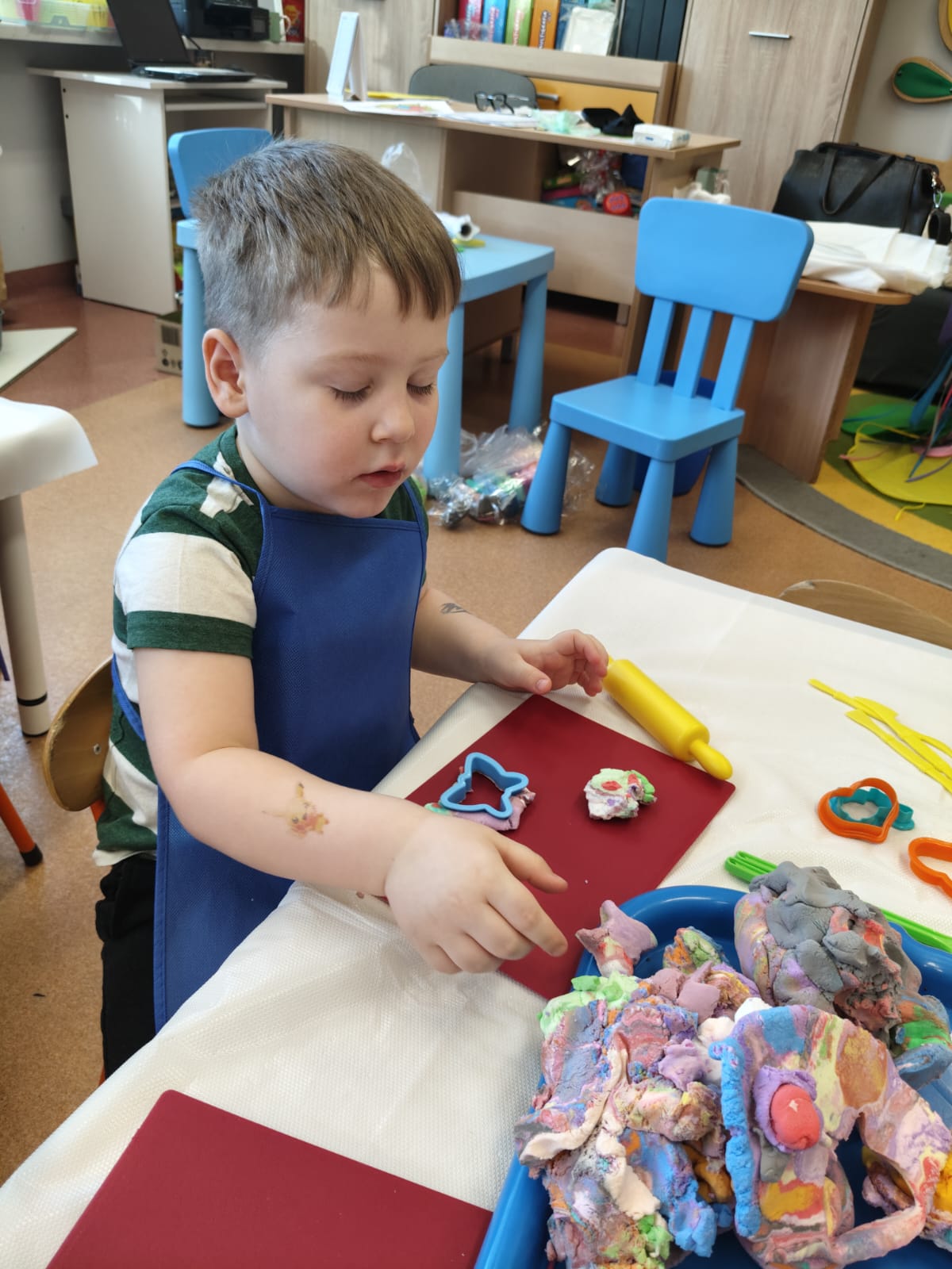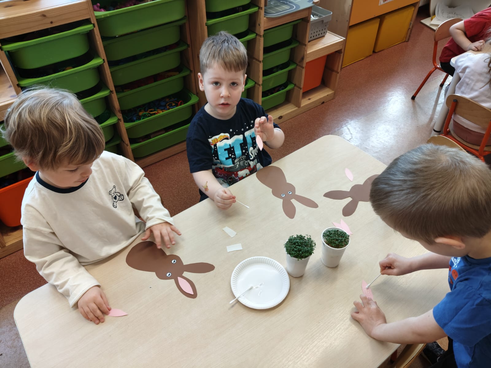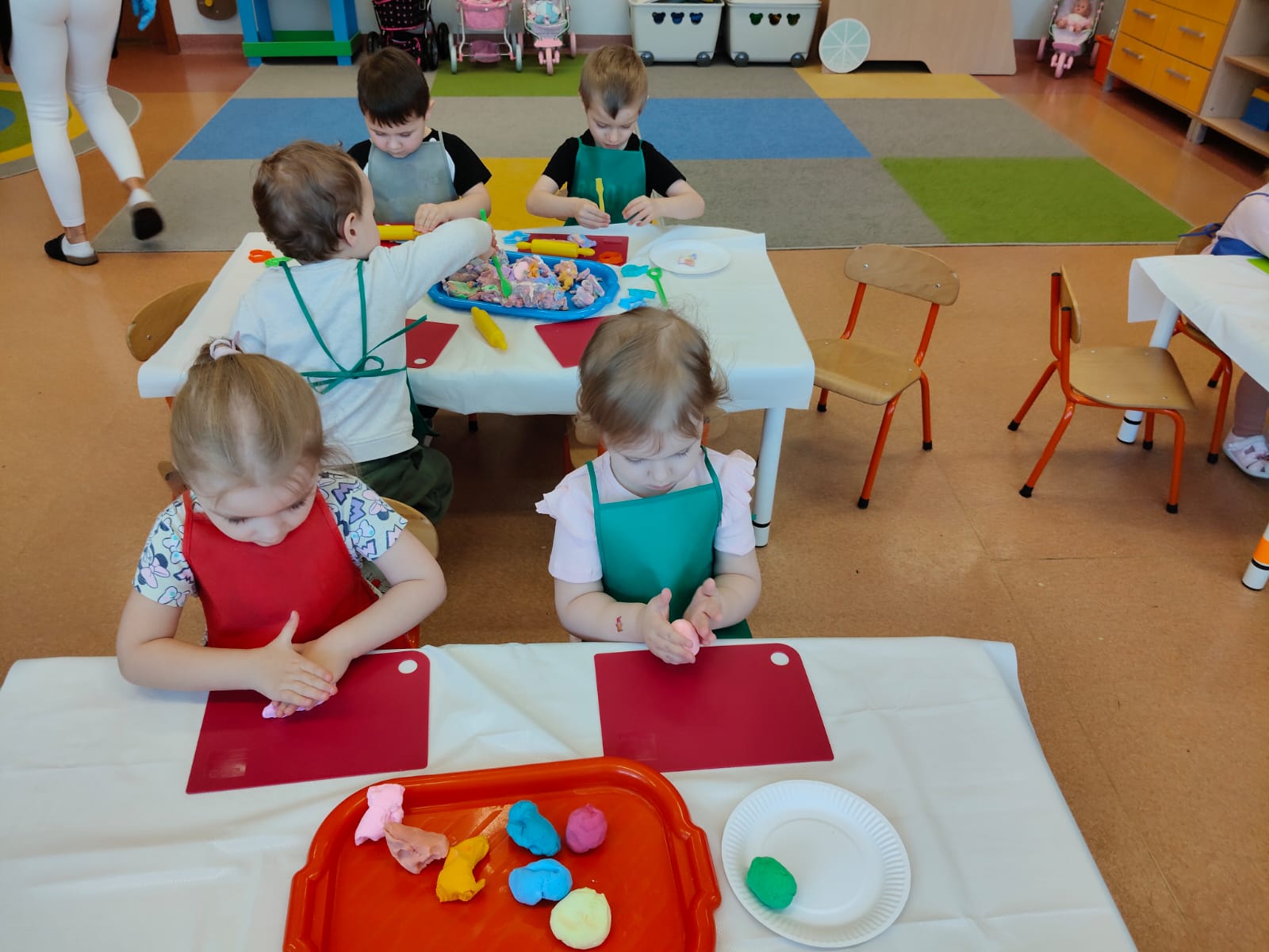 Podczas zajęć dzieci ugniatały, formowały i wycinały kształty przy użyciu foremek, co sprzyjało doskonaleniu koordynacji ręka–oko. Zabawy przebiegały w miłej, świątecznej atmosferze, a wykonane prace stały się piękną dekoracją sali. Zajęcia nie tylko wprowadziły dzieci w tematykę Świąt Wielkanocnych, ale także wspierały ich rozwój.