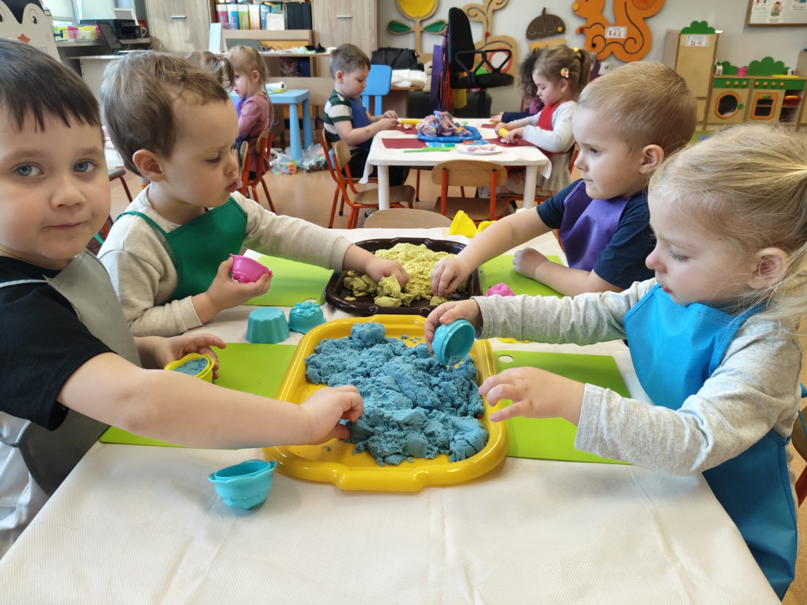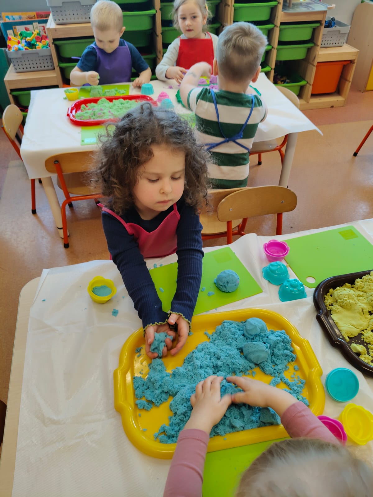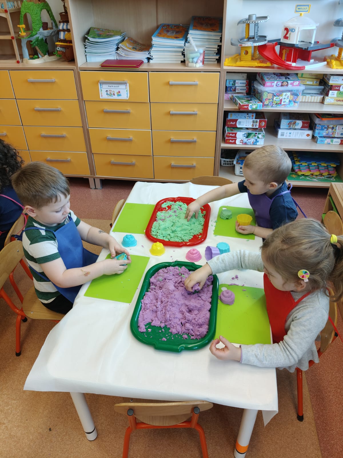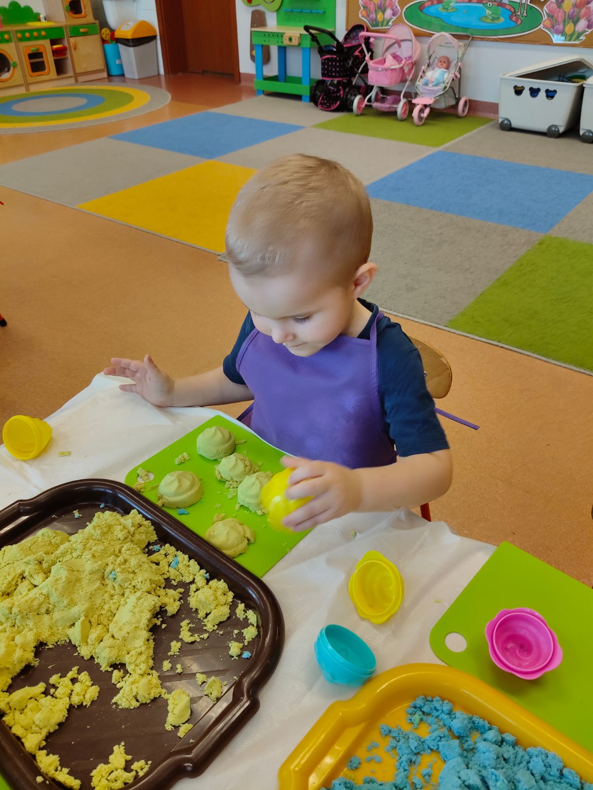 Czas przedświąteczny w grupie maluszków obfitował w przeróżne wielkanocne zabawy plastyczne. Dzieci miały okazję rozwijać swoją wyobraźnię i sprawność manualną poprzez tworzenie wielkanocnych motywów, takich jak pisanki, zajączki czy kurczaczki a praca z różnorodnymi materiałami sensorycznymi – piaskiem kinetycznym i ciastoliną dostarczyła im wielu wrażeń dotykowych oraz radości z eksperymentowania.