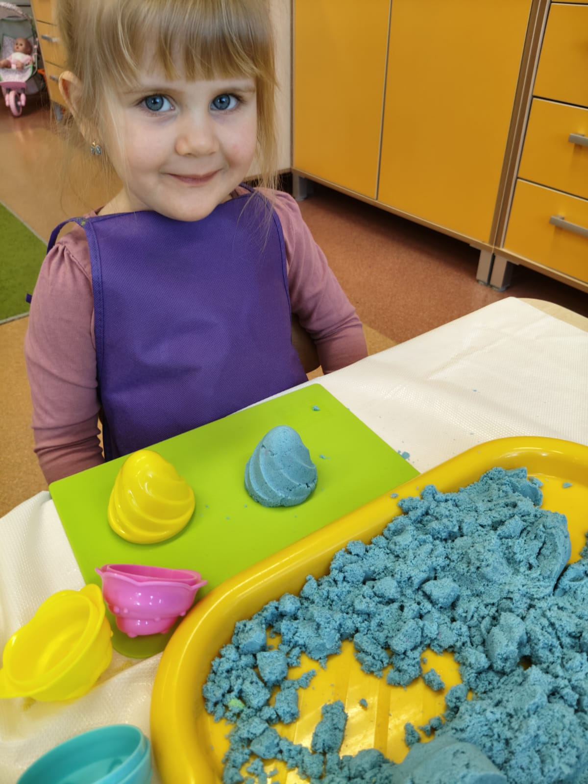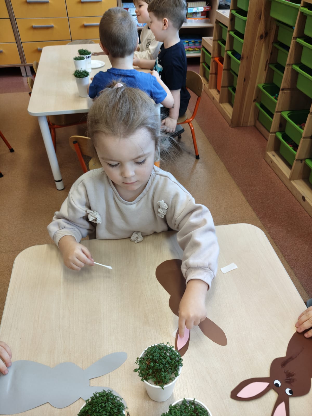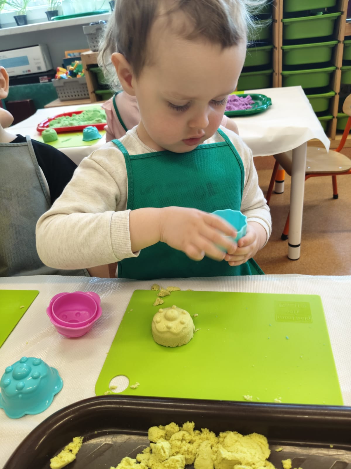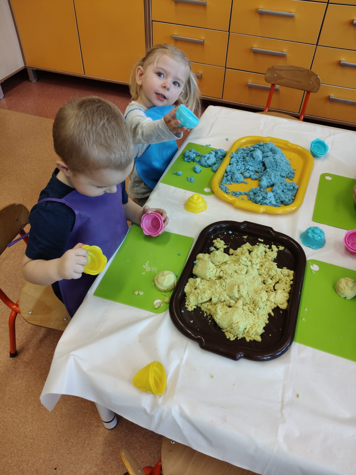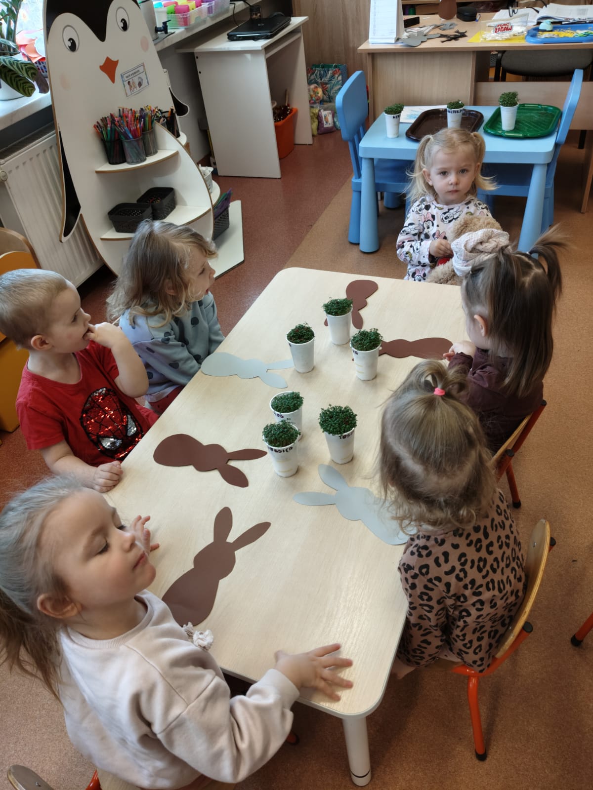 Czas przedświąteczny w grupie maluszków obfitował w przeróżne wielkanocne zabawy plastyczne. Dzieci miały okazję rozwijać swoją wyobraźnię i sprawność manualną poprzez tworzenie wielkanocnych motywów, takich jak pisanki, zajączki czy kurczaczki a praca z różnorodnymi materiałami sensorycznymi – piaskiem kinetycznym i ciastoliną dostarczyła im wielu wrażeń dotykowych oraz radości z eksperymentowania.
