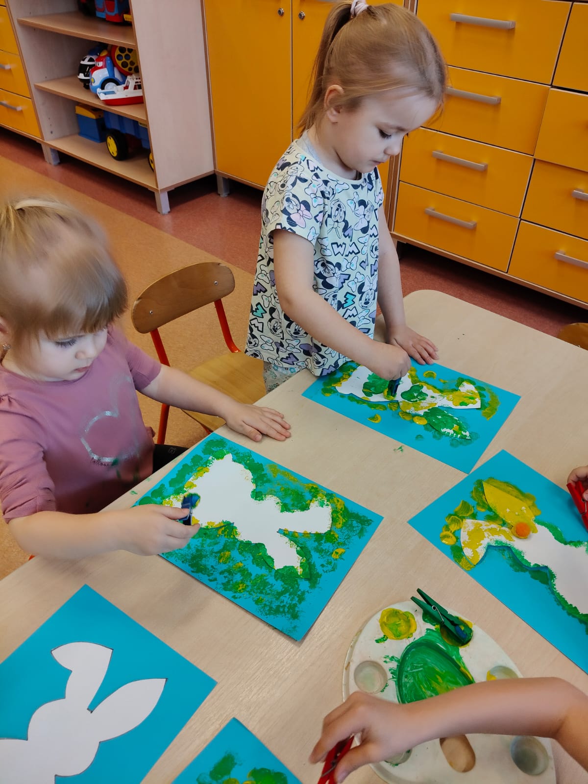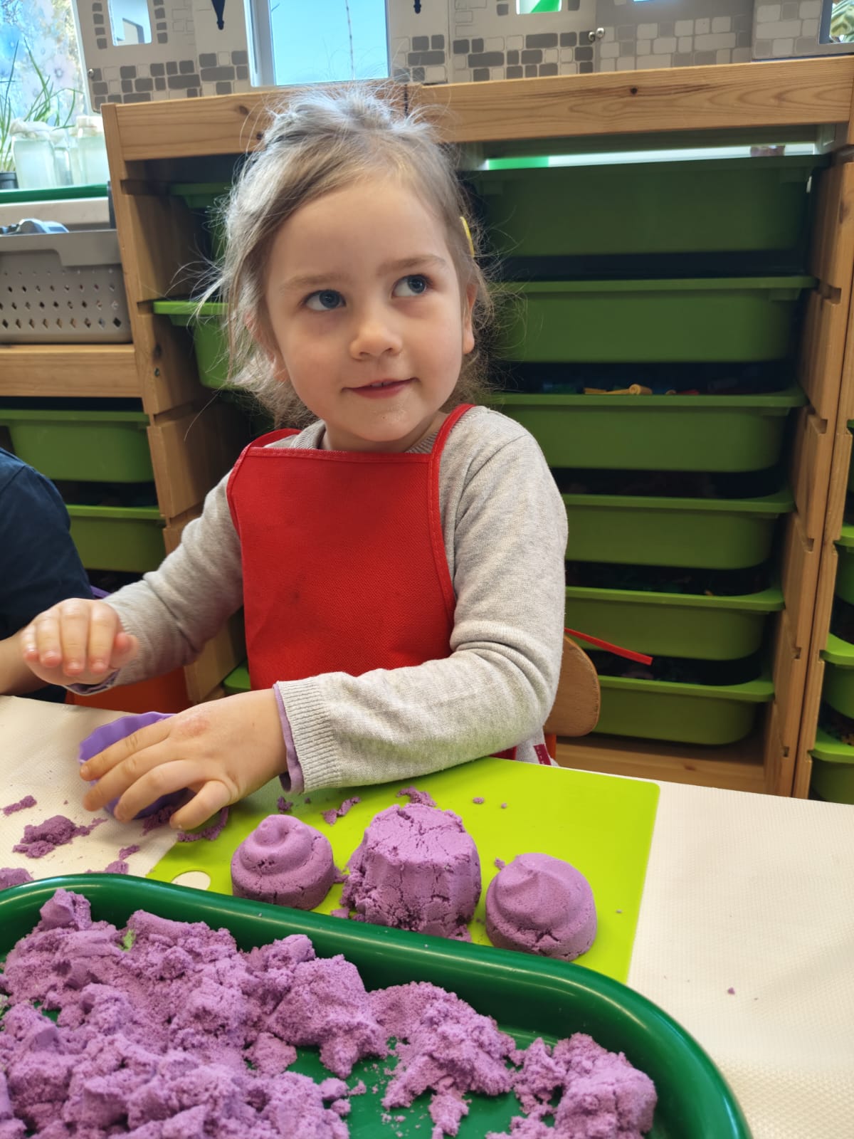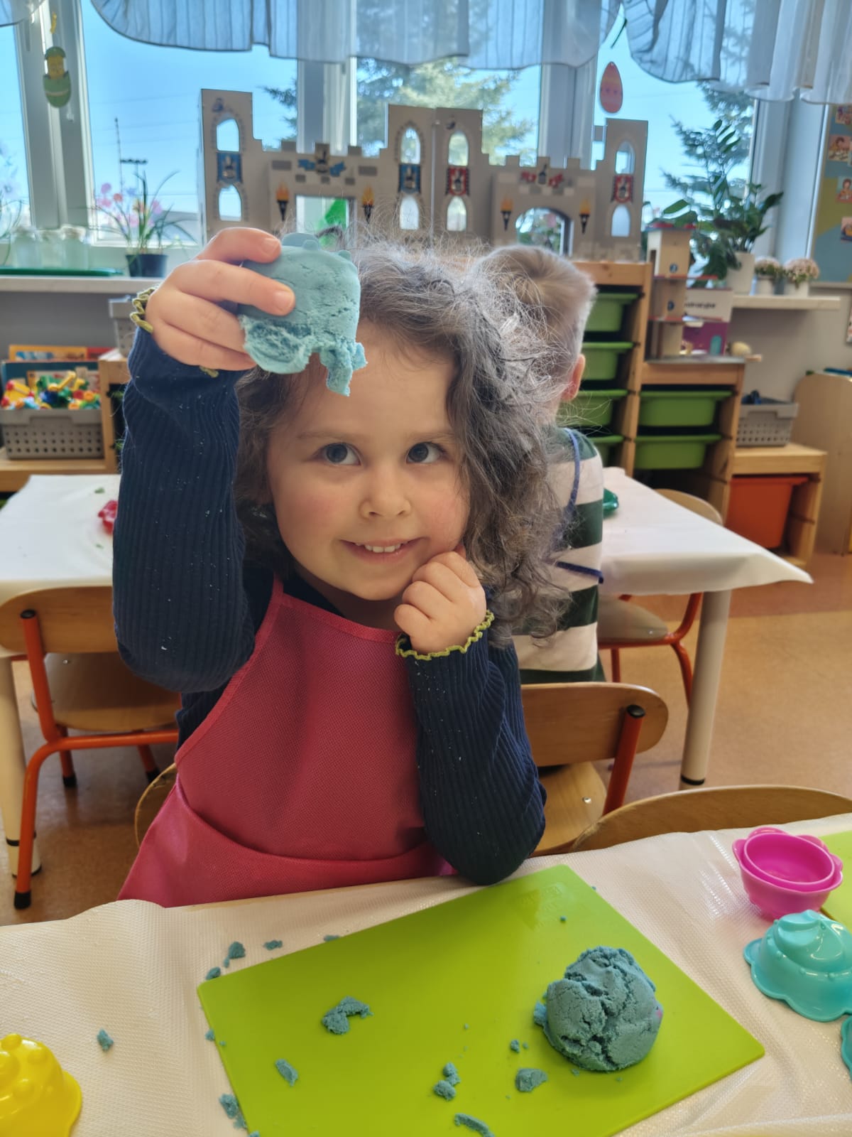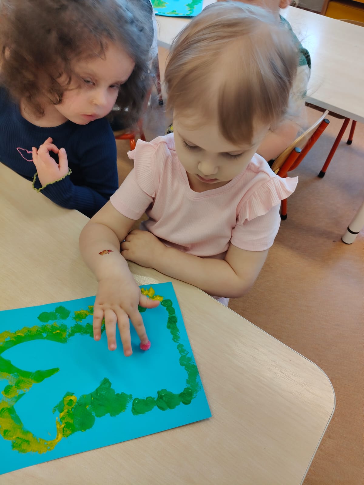 Czas przedświąteczny w grupie maluszków obfitował w przeróżne wielkanocne zabawy plastyczne. Dzieci miały okazję rozwijać swoją wyobraźnię i sprawność manualną poprzez tworzenie wielkanocnych motywów, takich jak pisanki, zajączki czy kurczaczki a praca z różnorodnymi materiałami sensorycznymi – piaskiem kinetycznym i ciastoliną dostarczyła im wielu wrażeń dotykowych oraz radości z eksperymentowania.
