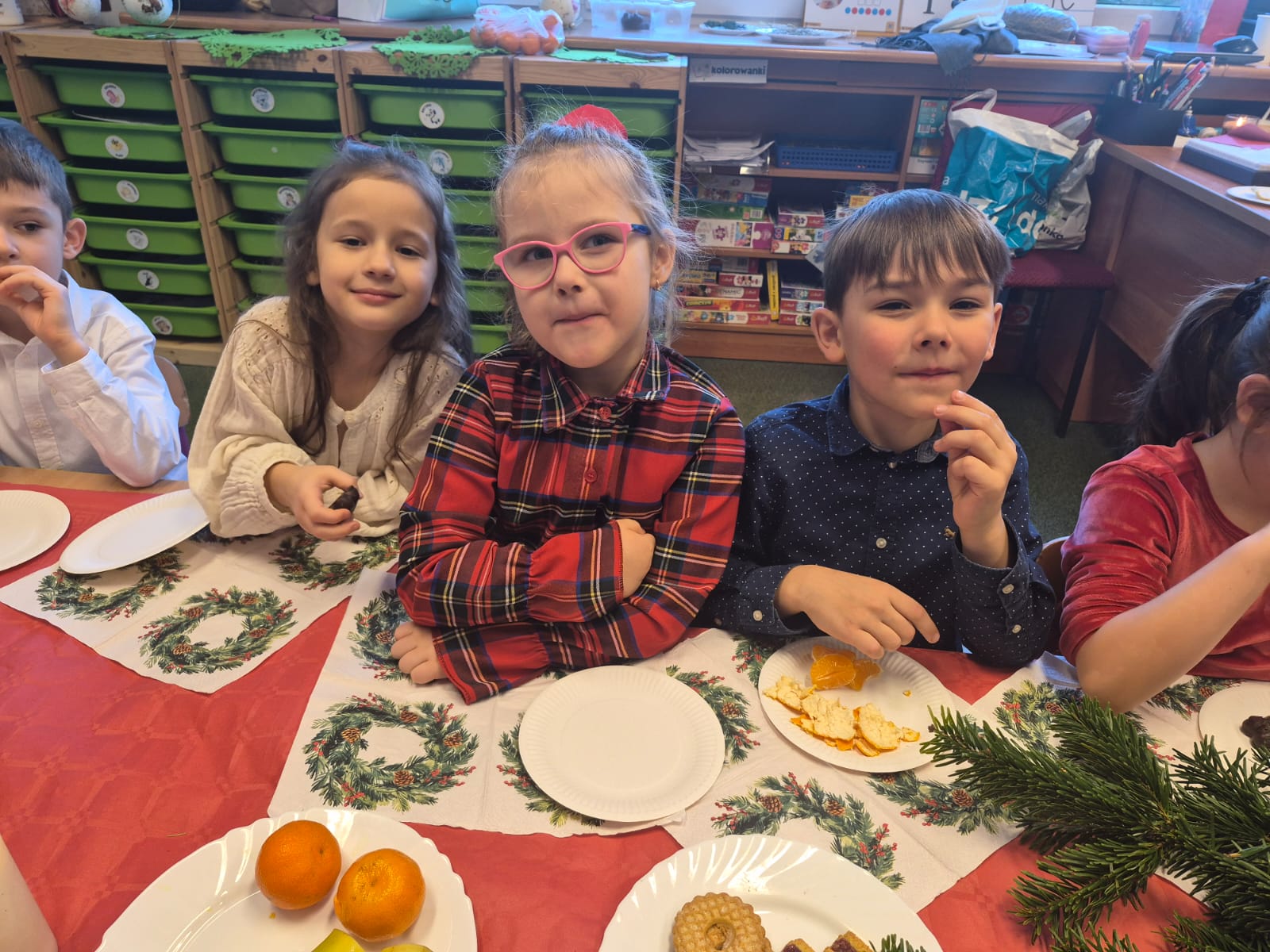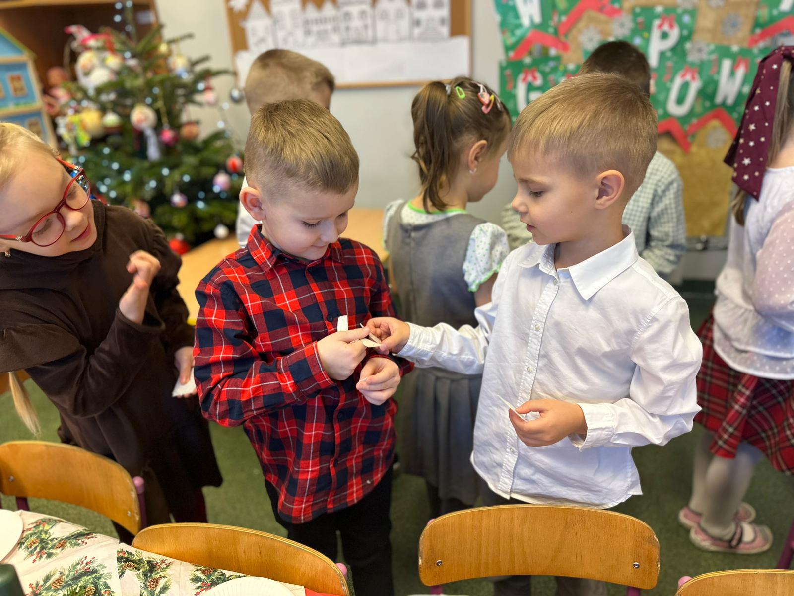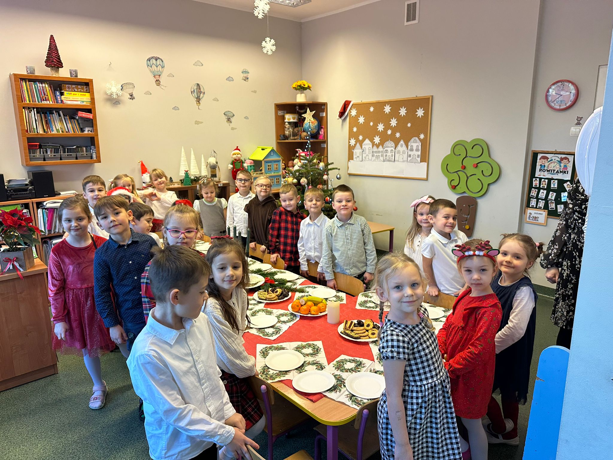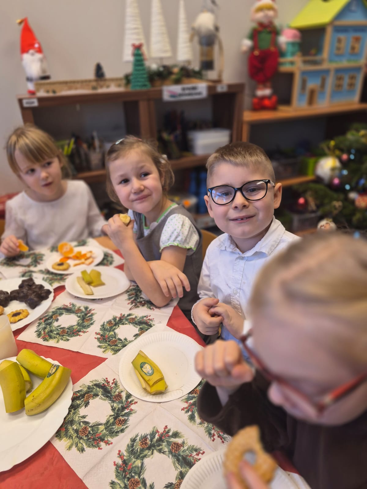 Przedszkole to miejsce gdzie uczymy się nie tylko pisać, śpiewać, tańczyć, poznawać literki ale również współdziałać i współtworzyć idealne miejsce do wszechstronnego rozwoju. W dniu 19. 12.2025 przedszkolaki z gr III zasiadły do wigilii grupowej. Jak w każdej rodzinie, również w naszej przedszkolnej najważniejsze były życzenia świąteczne i podzielenie się opłatkiem. Powiedzenie sobie nawzajem czegoś miłego staje się magicznym tym bardziej, że w chwili zapominamy o tych innych niemiłych sytuacjach. Następnie dzieci odświętnie ubrane zasiadły do pięknie nakrytego stołu, z siankiem pod obrusem ,by wspólnie zaśpiewać kolędę i cieszyć się swoim towarzystwem. Po uroczystej wigilii dzieci zagrały na kolorowych dzwonkach kolędę Jesteśmy przedszkolną rodzinką i wspólnie tworzymy piękne wspomnienia i wspólnie uczymy się wielu zasad życia. Życzymy wszystkim tak pięknych wspomnień z przedszkola jakie my mamy.