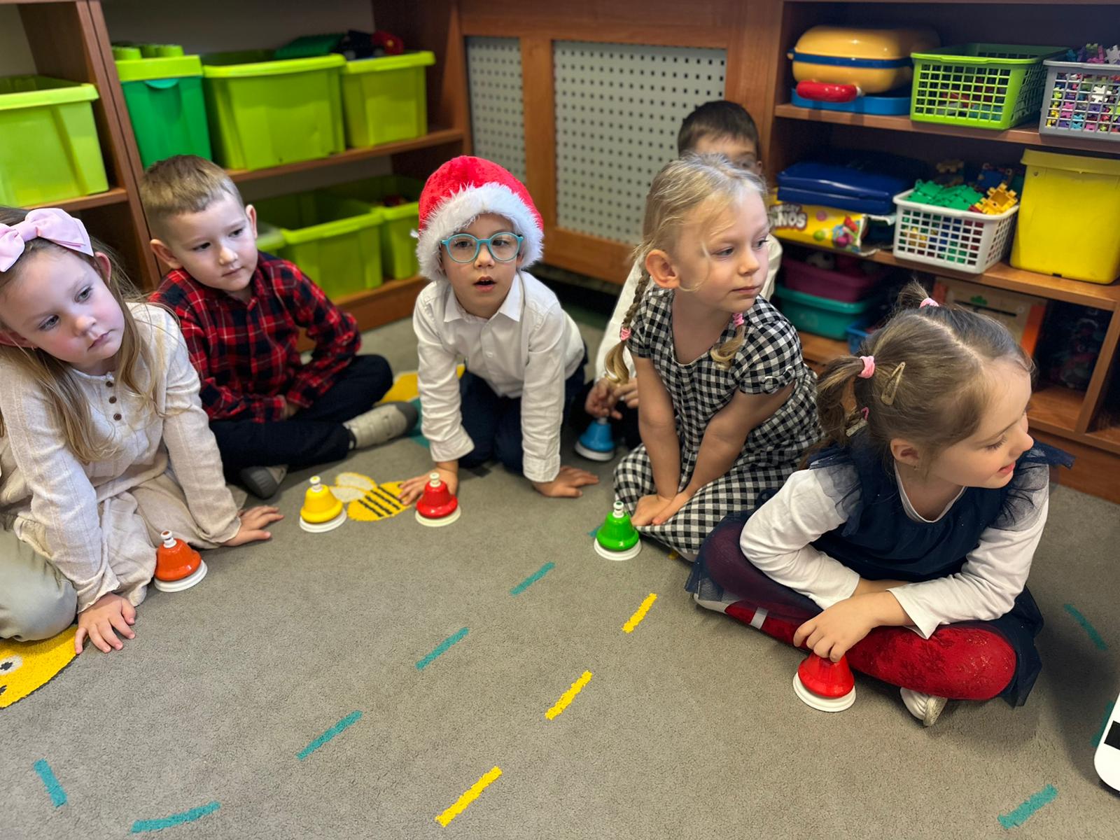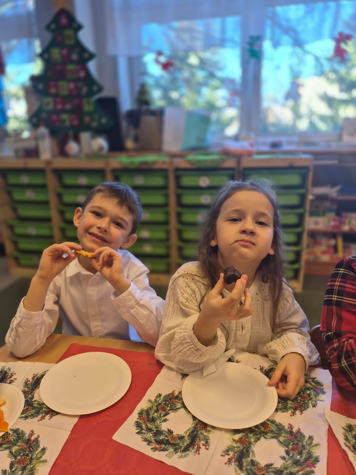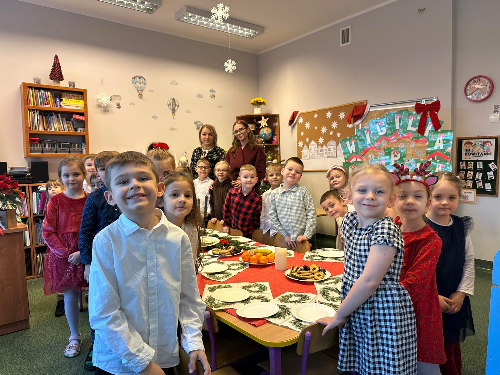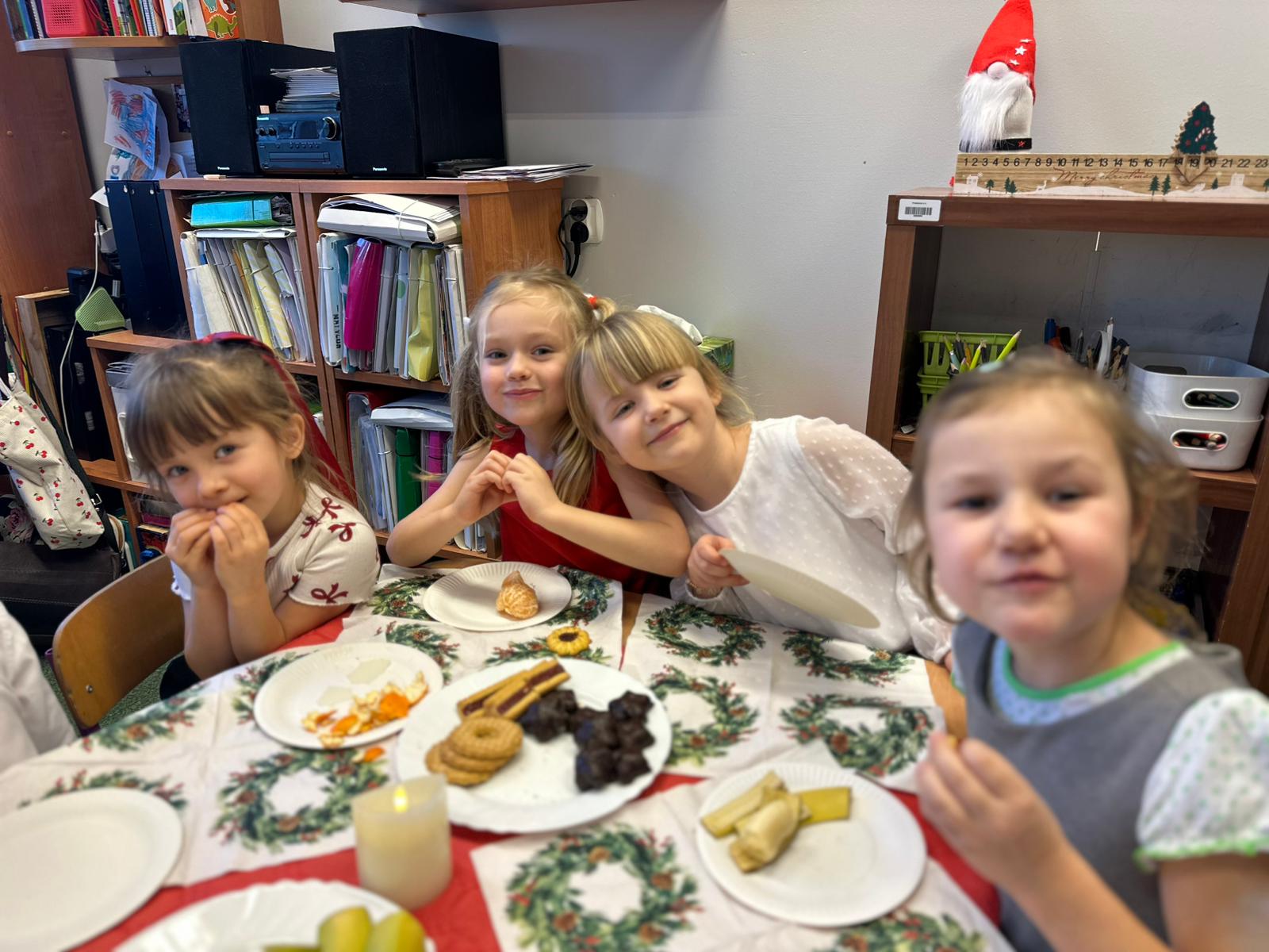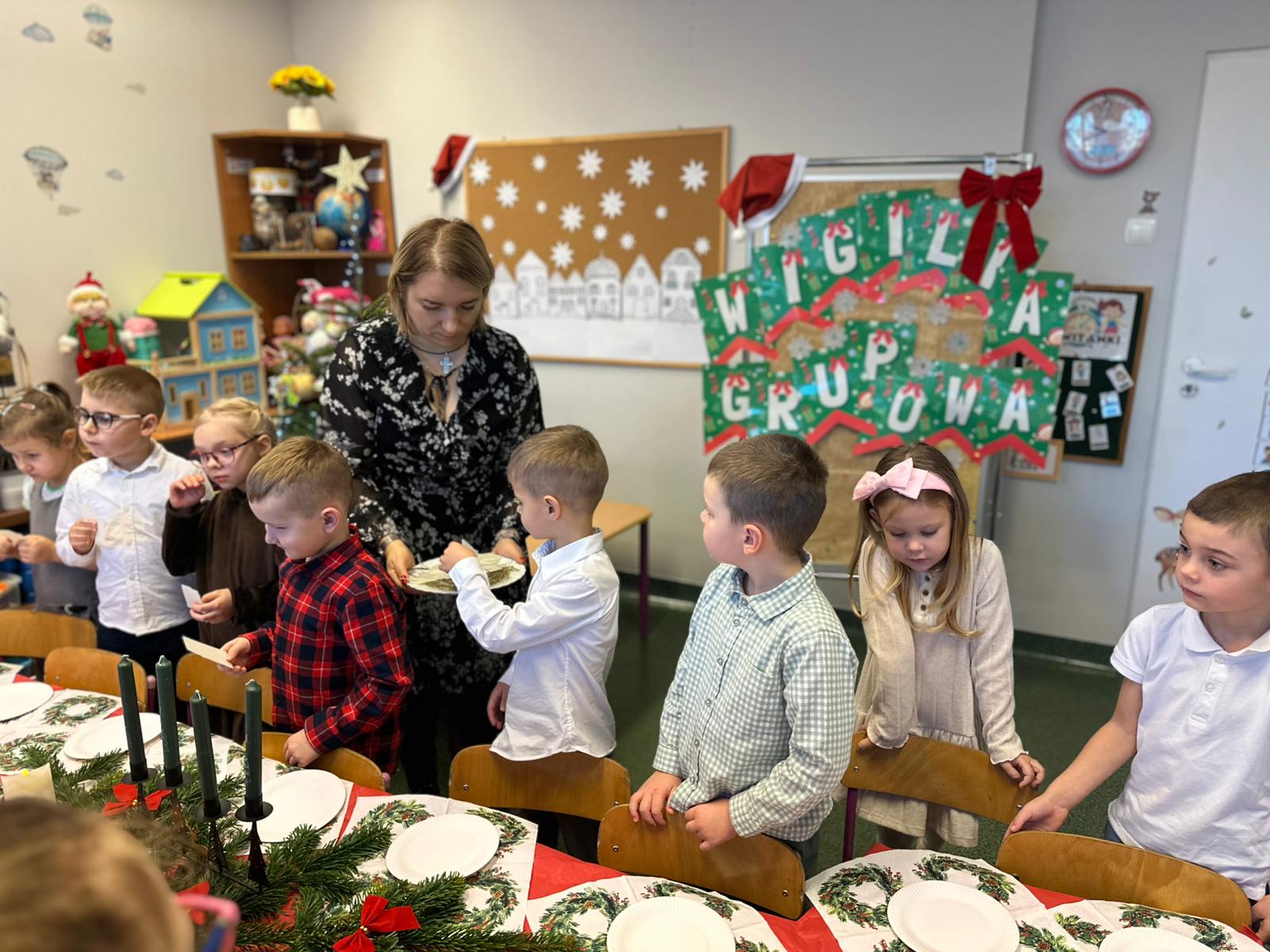 Przedszkole to miejsce gdzie uczymy się nie tylko pisać, śpiewać, tańczyć, poznawać literki ale również współdziałać i współtworzyć idealne miejsce do wszechstronnego rozwoju. W dniu 19. 12.2025 przedszkolaki z gr III zasiadły do wigilii grupowej. Jak w każdej rodzinie, również w naszej przedszkolnej najważniejsze były życzenia świąteczne i podzielenie się opłatkiem. Powiedzenie sobie nawzajem czegoś miłego staje się magicznym tym bardziej, że w chwili zapominamy o tych innych niemiłych sytuacjach. Następnie dzieci odświętnie ubrane zasiadły do pięknie nakrytego stołu, z siankiem pod obrusem ,by wspólnie zaśpiewać kolędę i cieszyć się swoim towarzystwem. Po uroczystej wigilii dzieci zagrały na kolorowych dzwonkach kolędę Jesteśmy przedszkolną rodzinką i wspólnie tworzymy piękne wspomnienia i wspólnie uczymy się wielu zasad życia. Życzymy wszystkim tak pięknych wspomnień z przedszkola jakie my mamy.