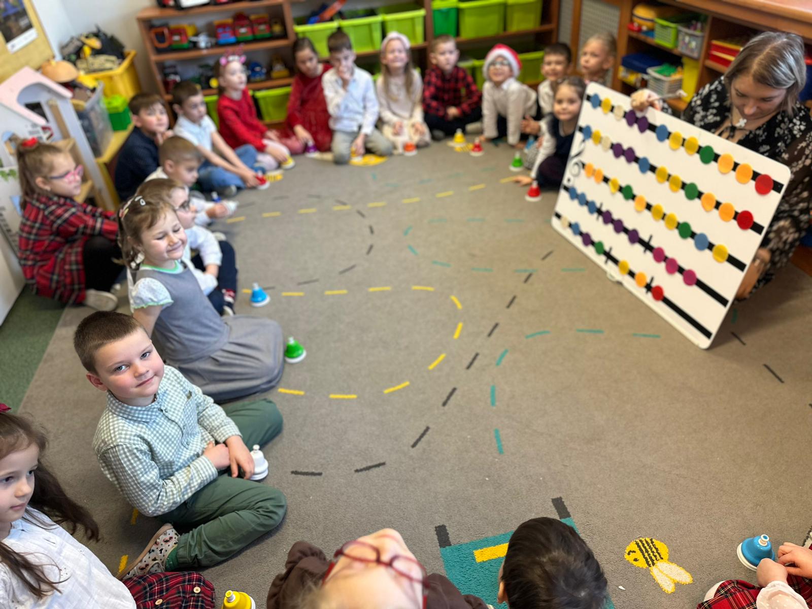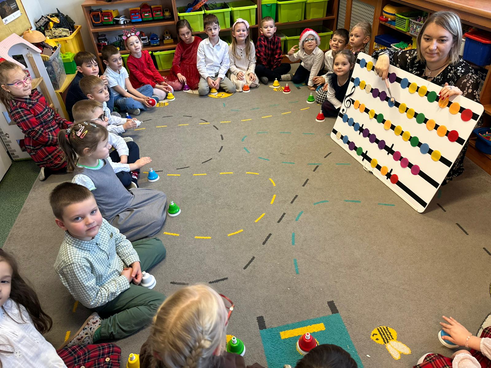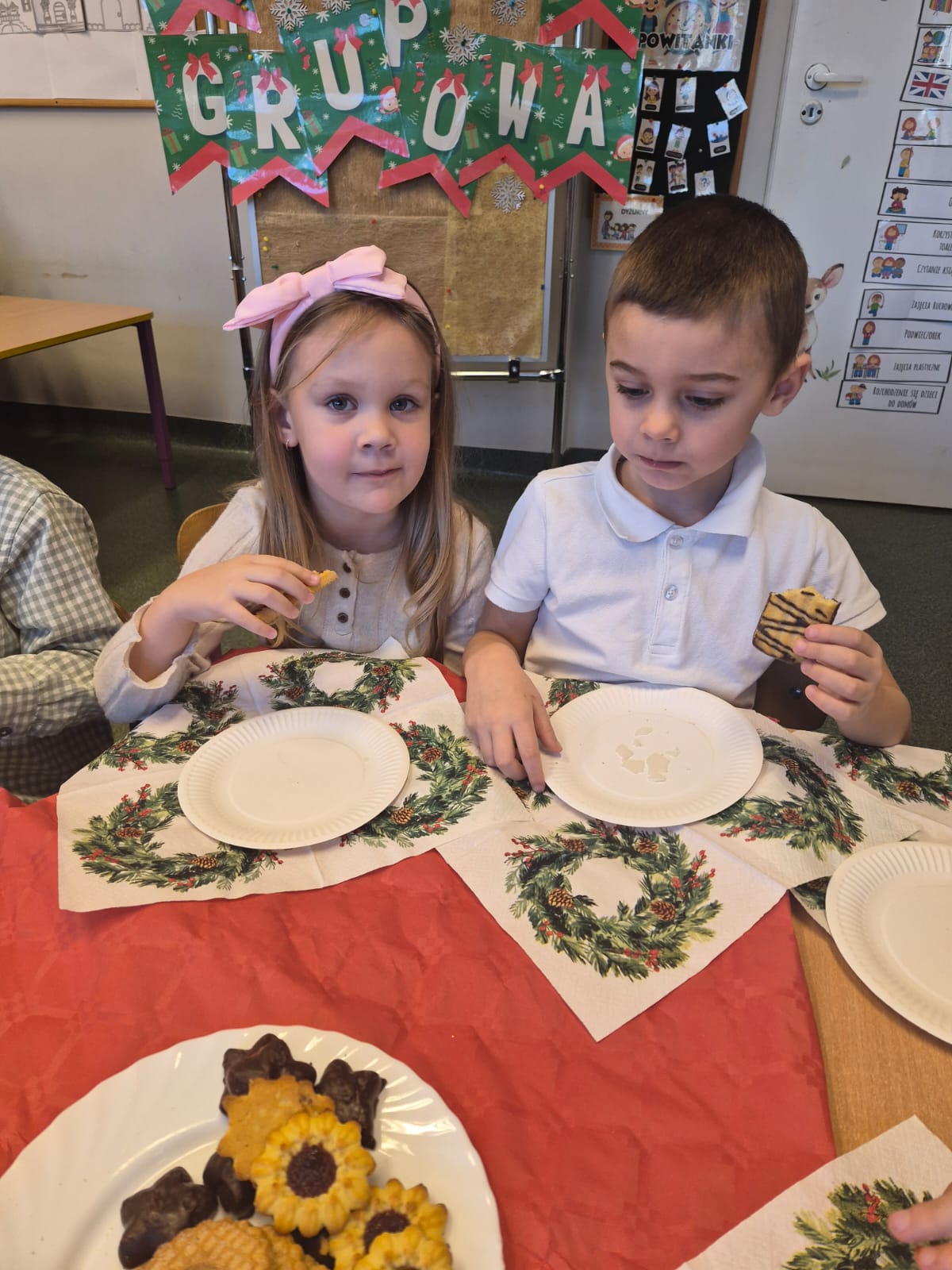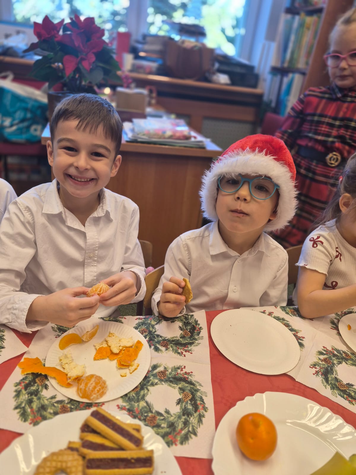 Przedszkole to miejsce gdzie uczymy się nie tylko pisać, śpiewać, tańczyć, poznawać literki ale również współdziałać i współtworzyć idealne miejsce do wszechstronnego rozwoju. W dniu 19. 12.2025 przedszkolaki z gr III zasiadły do wigilii grupowej. Jak w każdej rodzinie, również w naszej przedszkolnej najważniejsze były życzenia świąteczne i podzielenie się opłatkiem. Powiedzenie sobie nawzajem czegoś miłego staje się magicznym tym bardziej, że w chwili zapominamy o tych innych niemiłych sytuacjach. Następnie dzieci odświętnie ubrane zasiadły do pięknie nakrytego stołu, z siankiem pod obrusem ,by wspólnie zaśpiewać kolędę i cieszyć się swoim towarzystwem. Po uroczystej wigilii dzieci zagrały na kolorowych dzwonkach kolędę Jesteśmy przedszkolną rodzinką i wspólnie tworzymy piękne wspomnienia i wspólnie uczymy się wielu zasad życia. Życzymy wszystkim tak pięknych wspomnień z przedszkola jakie my mamy.