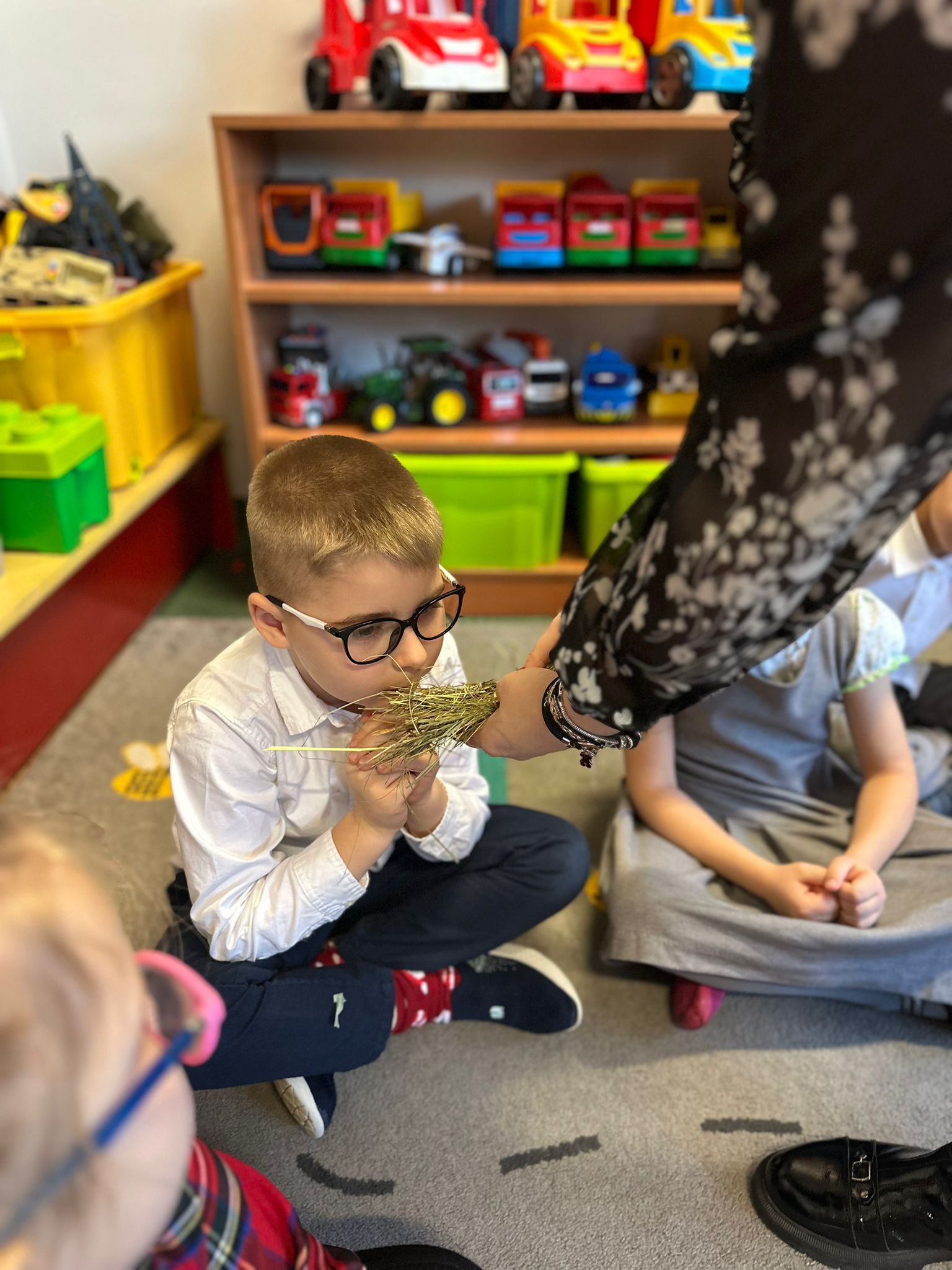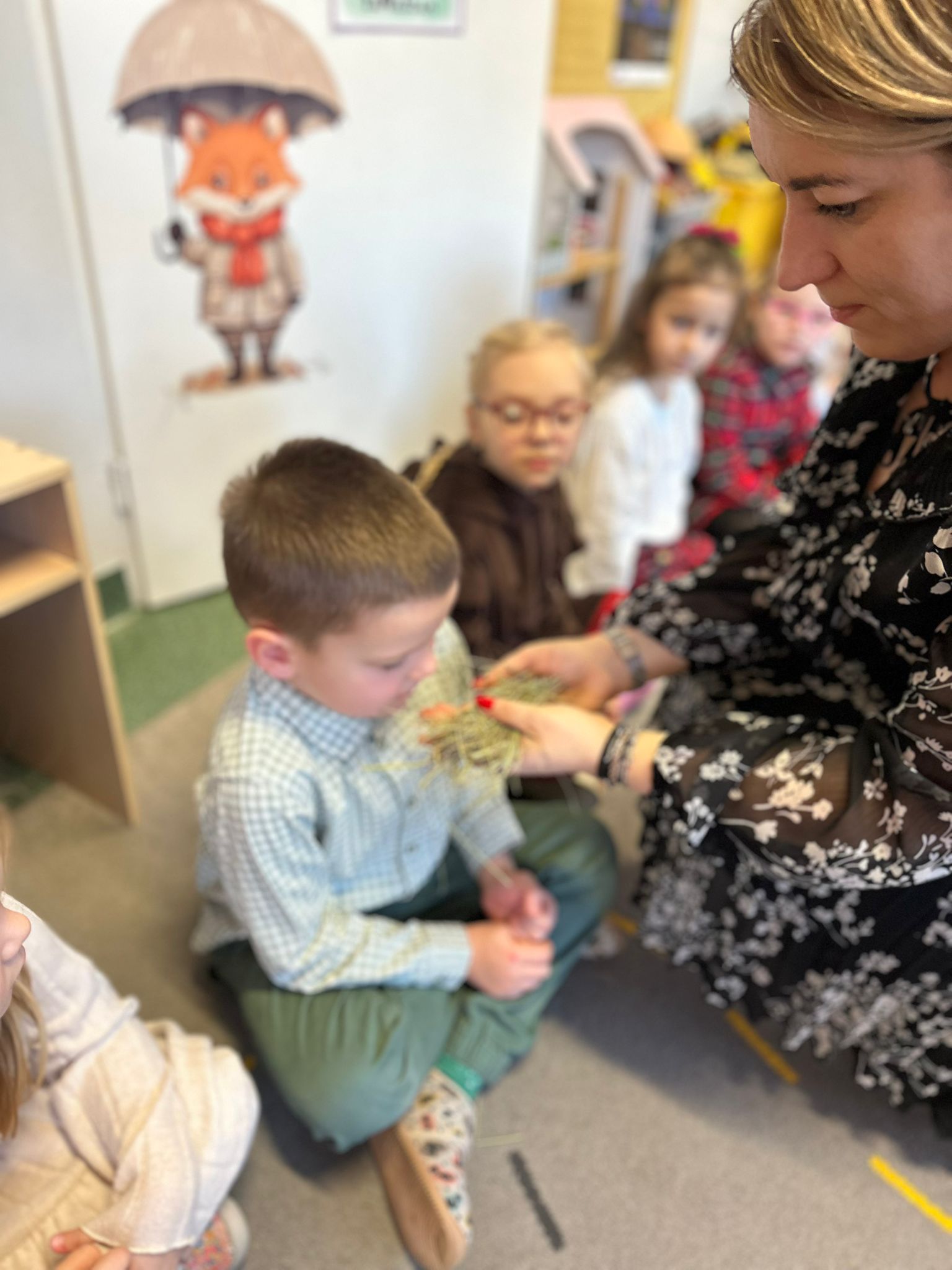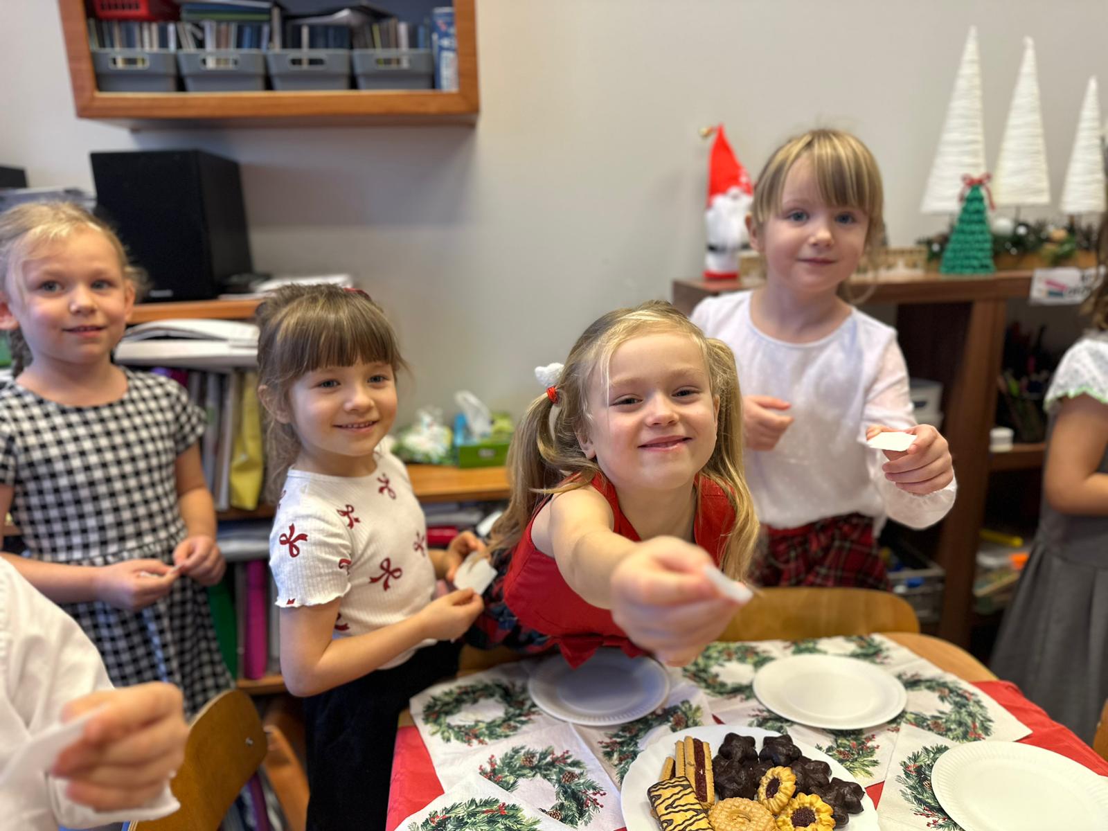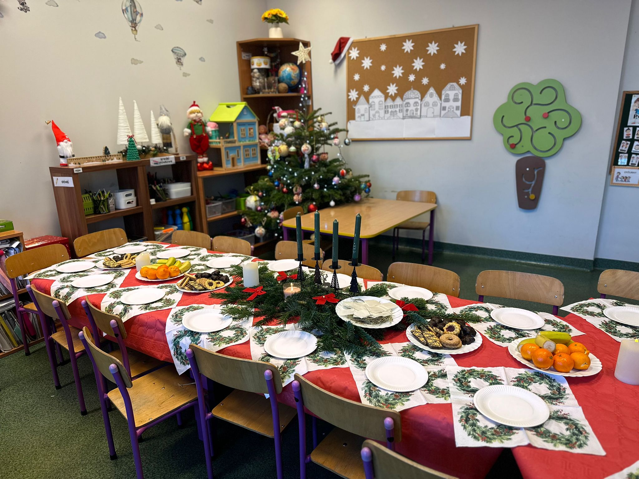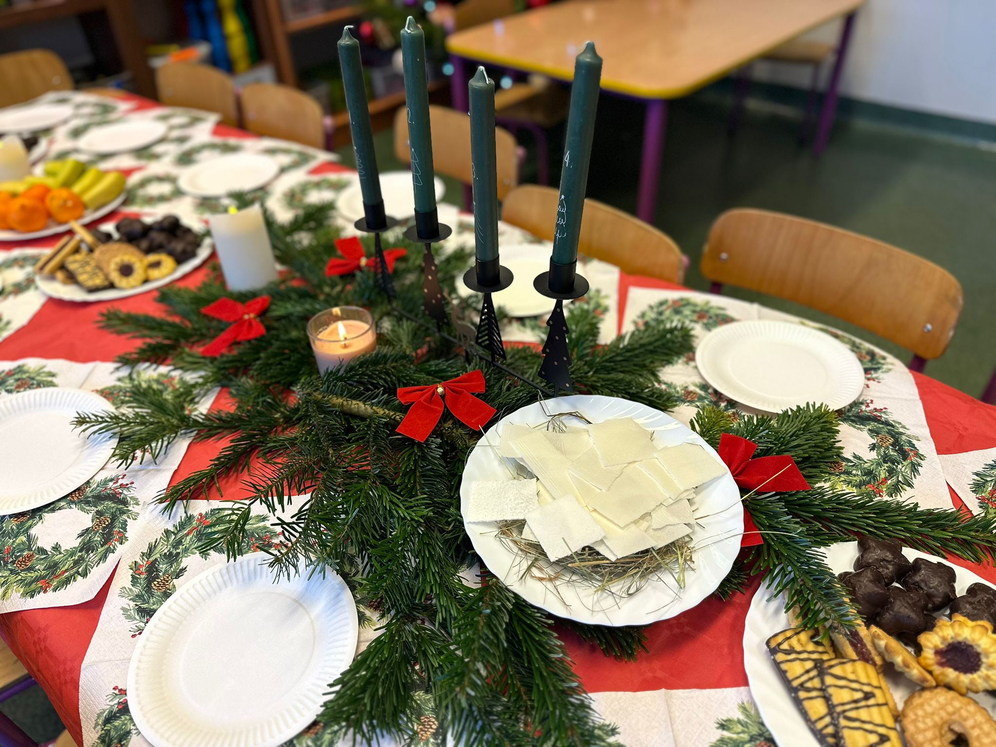 Przedszkole to miejsce gdzie uczymy się nie tylko pisać, śpiewać, tańczyć, poznawać literki ale również współdziałać i współtworzyć idealne miejsce do wszechstronnego rozwoju. W dniu 19. 12.2025 przedszkolaki z gr III zasiadły do wigilii grupowej. Jak w każdej rodzinie, również w naszej przedszkolnej najważniejsze były życzenia świąteczne i podzielenie się opłatkiem. Powiedzenie sobie nawzajem czegoś miłego staje się magicznym tym bardziej, że w chwili zapominamy o tych innych niemiłych sytuacjach. Następnie dzieci odświętnie ubrane zasiadły do pięknie nakrytego stołu, z siankiem pod obrusem ,by wspólnie zaśpiewać kolędę i cieszyć się swoim towarzystwem. Po uroczystej wigilii dzieci zagrały na kolorowych dzwonkach kolędę Jesteśmy przedszkolną rodzinką i wspólnie tworzymy piękne wspomnienia i wspólnie uczymy się wielu zasad życia. Życzymy wszystkim tak pięknych wspomnień z przedszkola jakie my mamy.