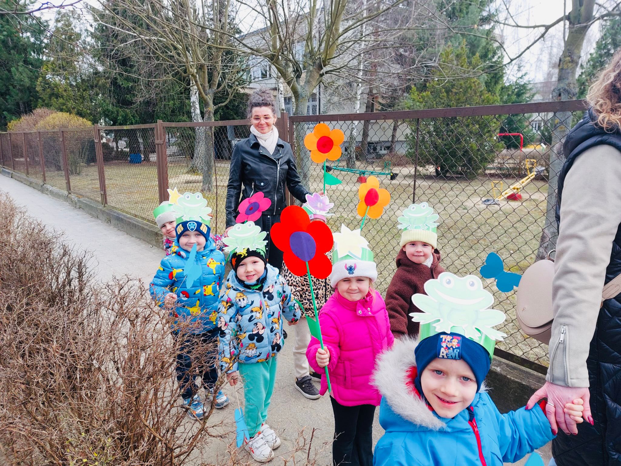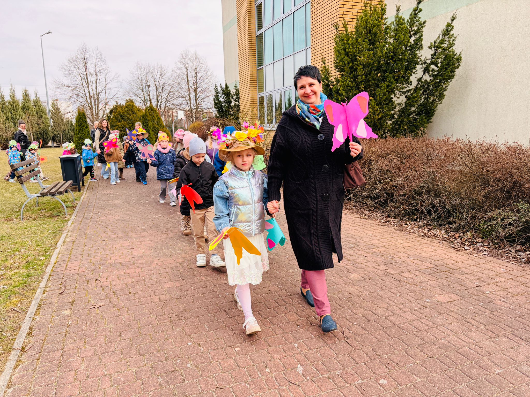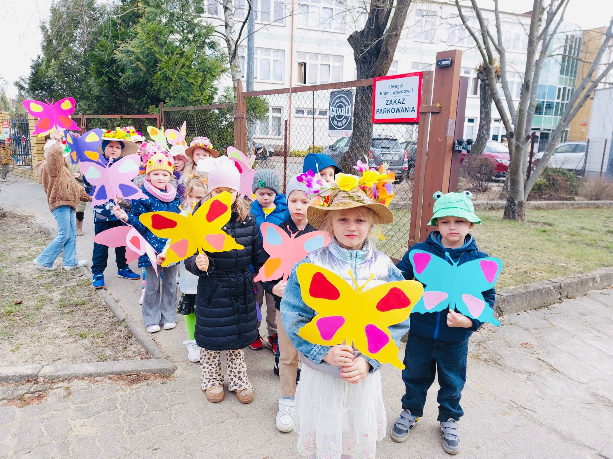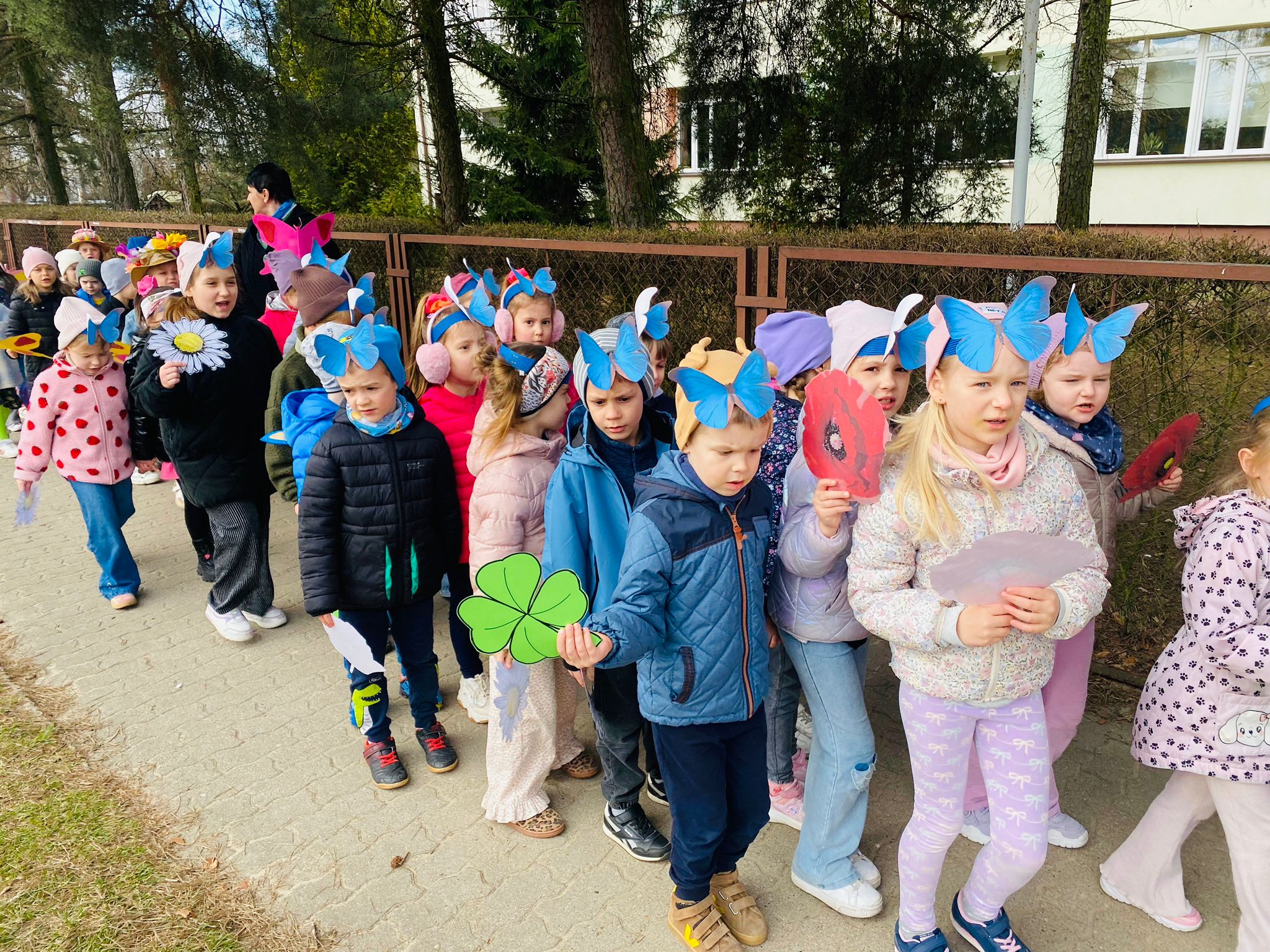 Dzieci wspólnie zaśpiewały piosenkę przed budynkiem przedszkola, a następnie wyruszyły w kolorowym pochodzie ulicami osiedla. Z kwiatami i motylami w dłoniach oraz uśmiechem na twarzach dzieci śpiewały wiosenne piosenki, wprowadzając wszystkich w radosny nastrój. Wiosno! Jak dobrze, że jesteś J
