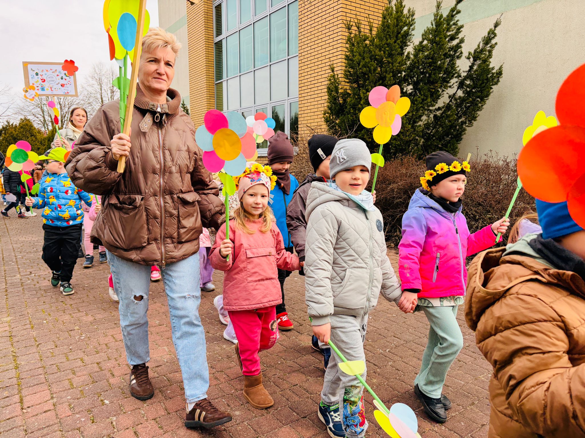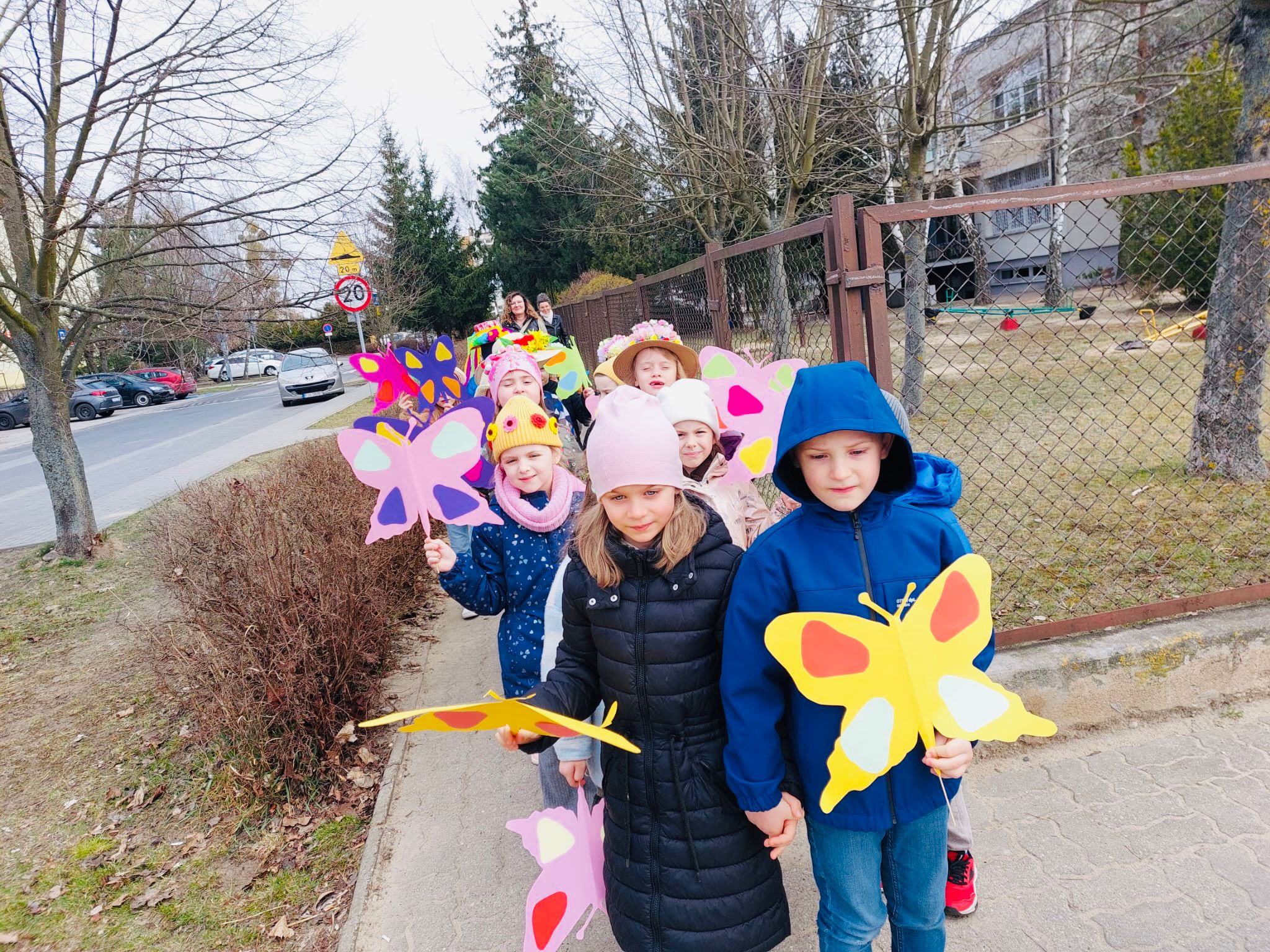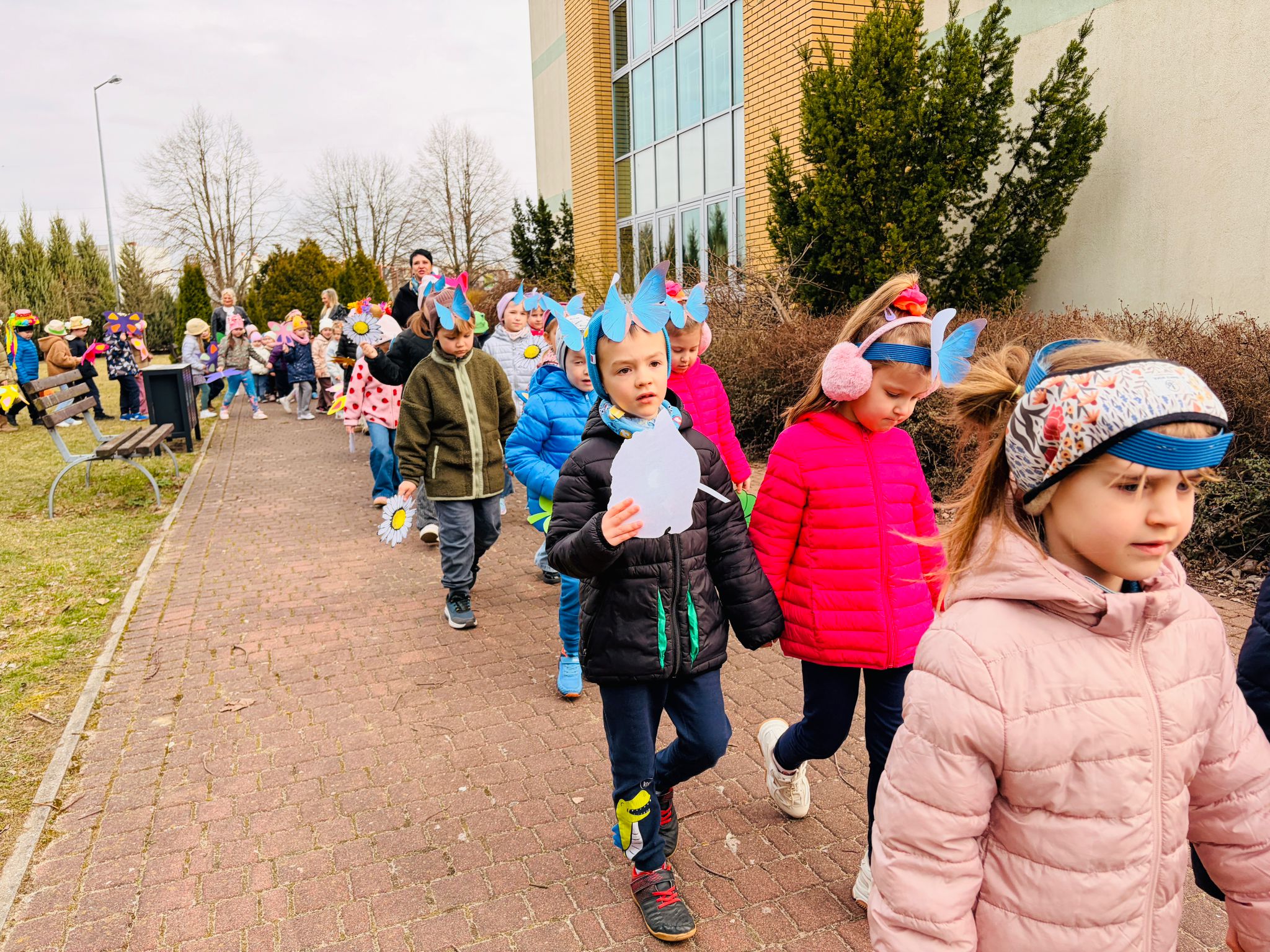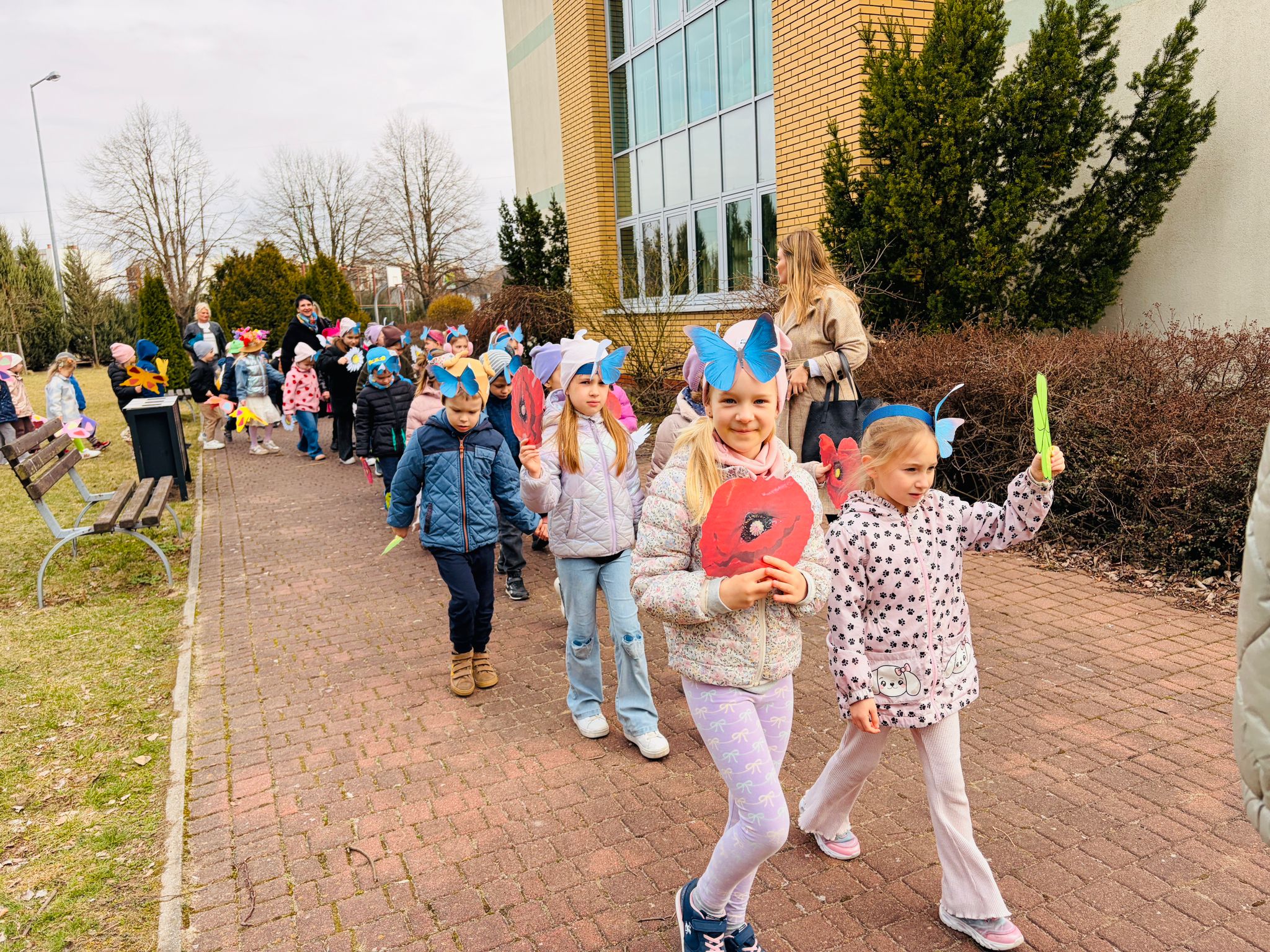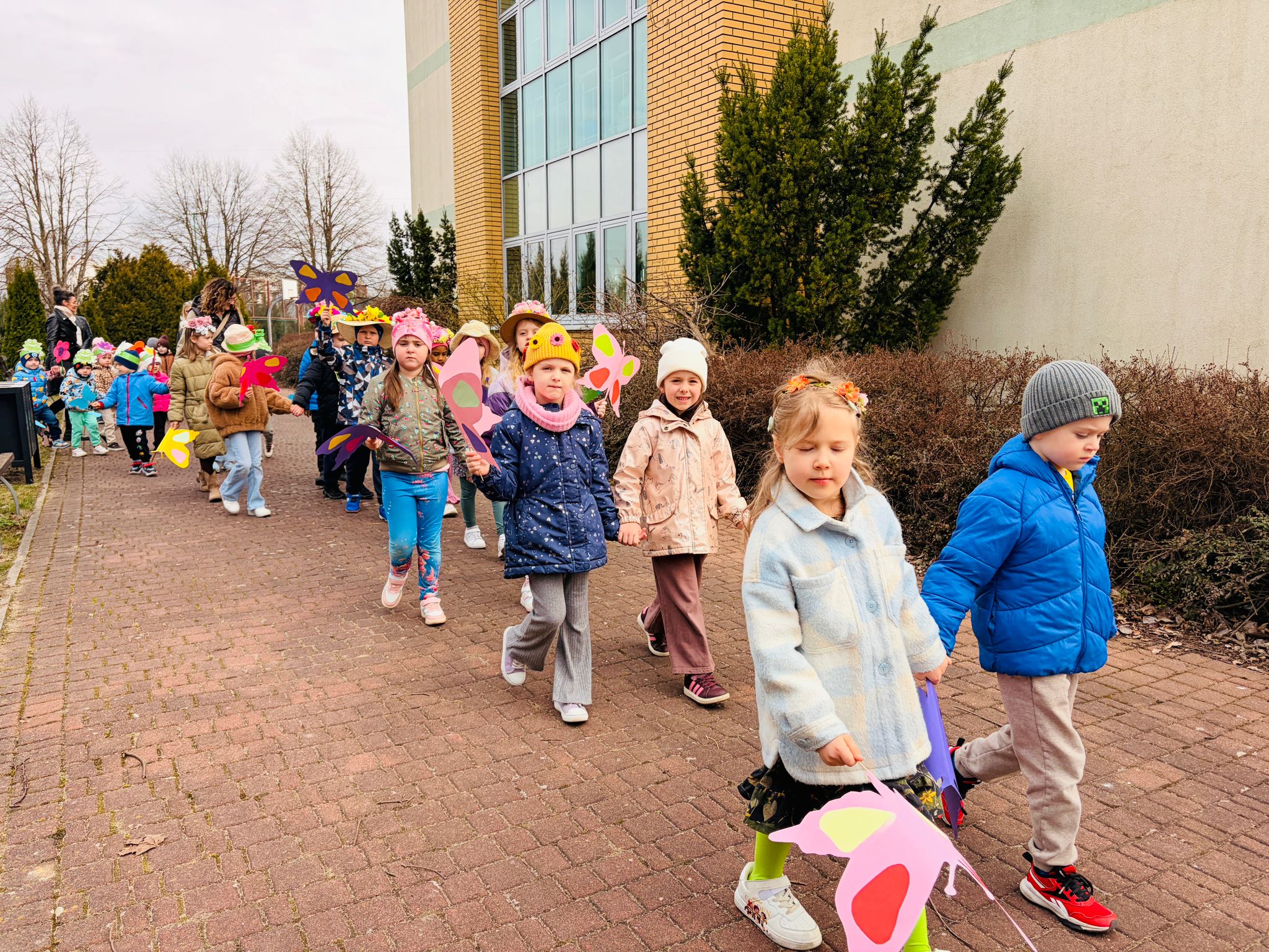 Dzieci wspólnie zaśpiewały piosenkę przed budynkiem przedszkola, a następnie wyruszyły w kolorowym pochodzie ulicami osiedla. Z kwiatami i motylami w dłoniach oraz uśmiechem na twarzach dzieci śpiewały wiosenne piosenki, wprowadzając wszystkich w radosny nastrój. Wiosno! Jak dobrze, że jesteś J