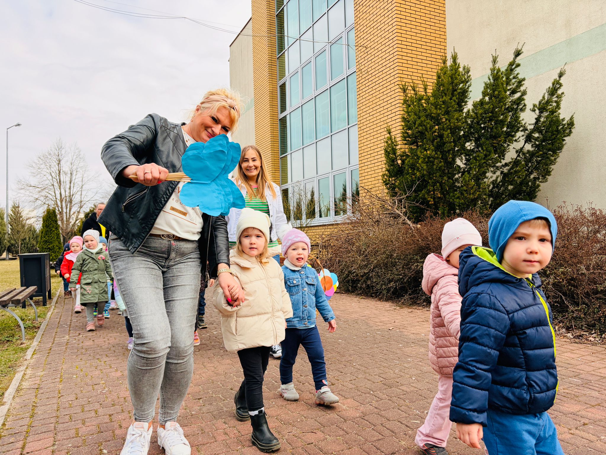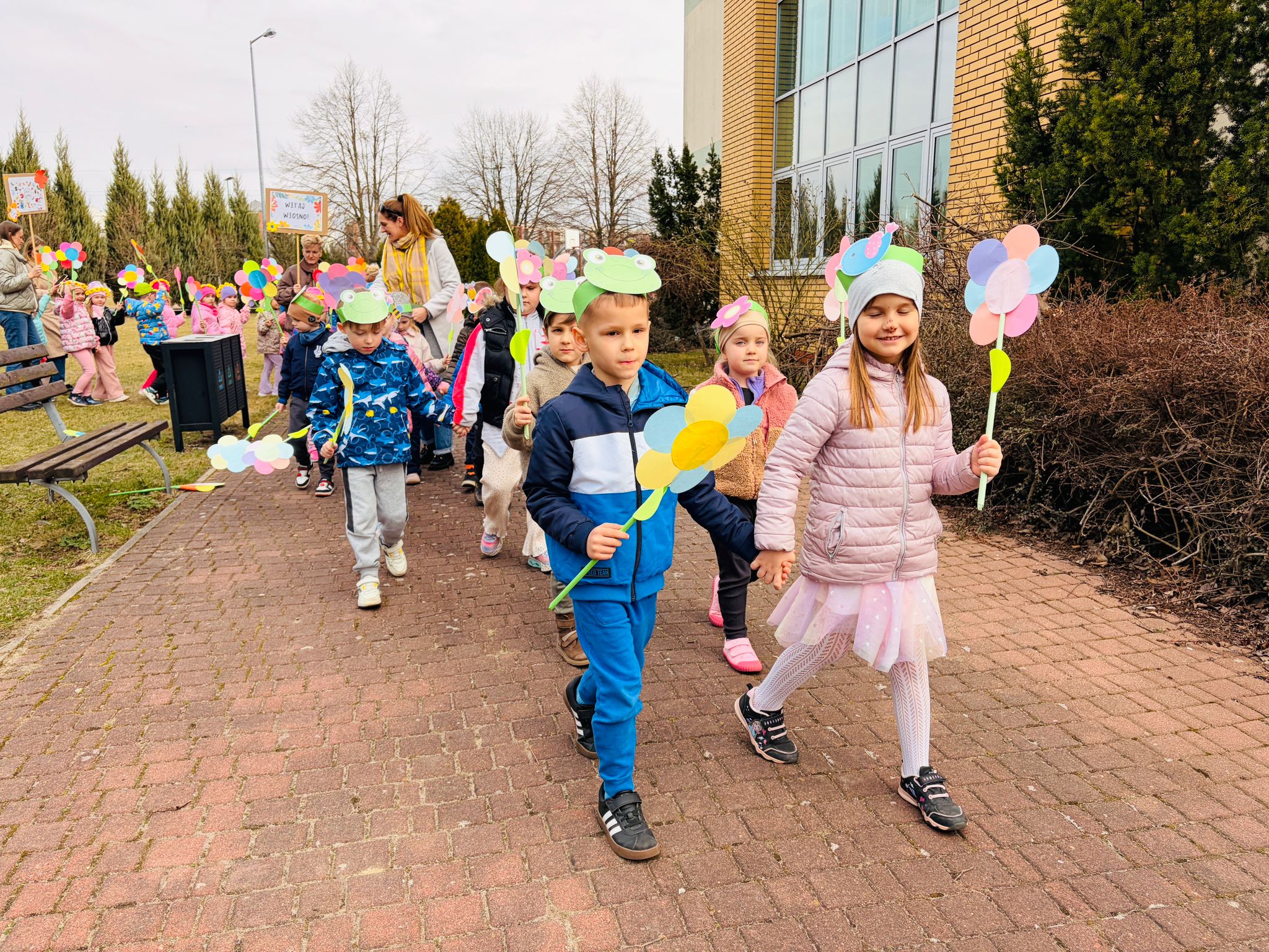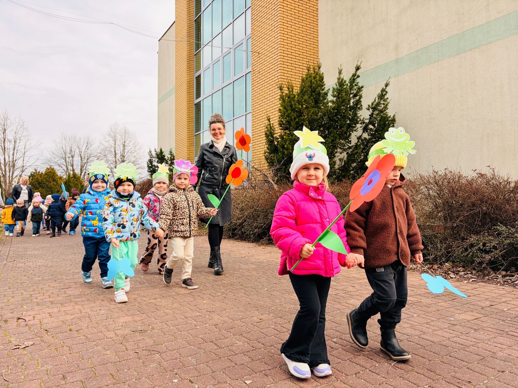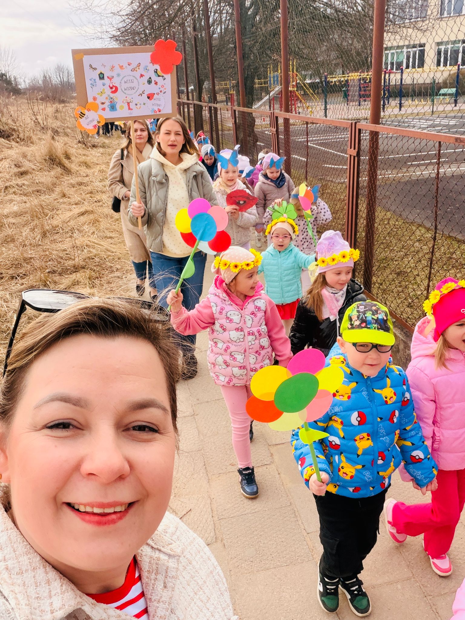 Dzieci wspólnie zaśpiewały piosenkę przed budynkiem przedszkola, a następnie wyruszyły w kolorowym pochodzie ulicami osiedla. Z kwiatami i motylami w dłoniach oraz uśmiechem na twarzach dzieci śpiewały wiosenne piosenki, wprowadzając wszystkich w radosny nastrój. Wiosno! Jak dobrze, że jesteś J