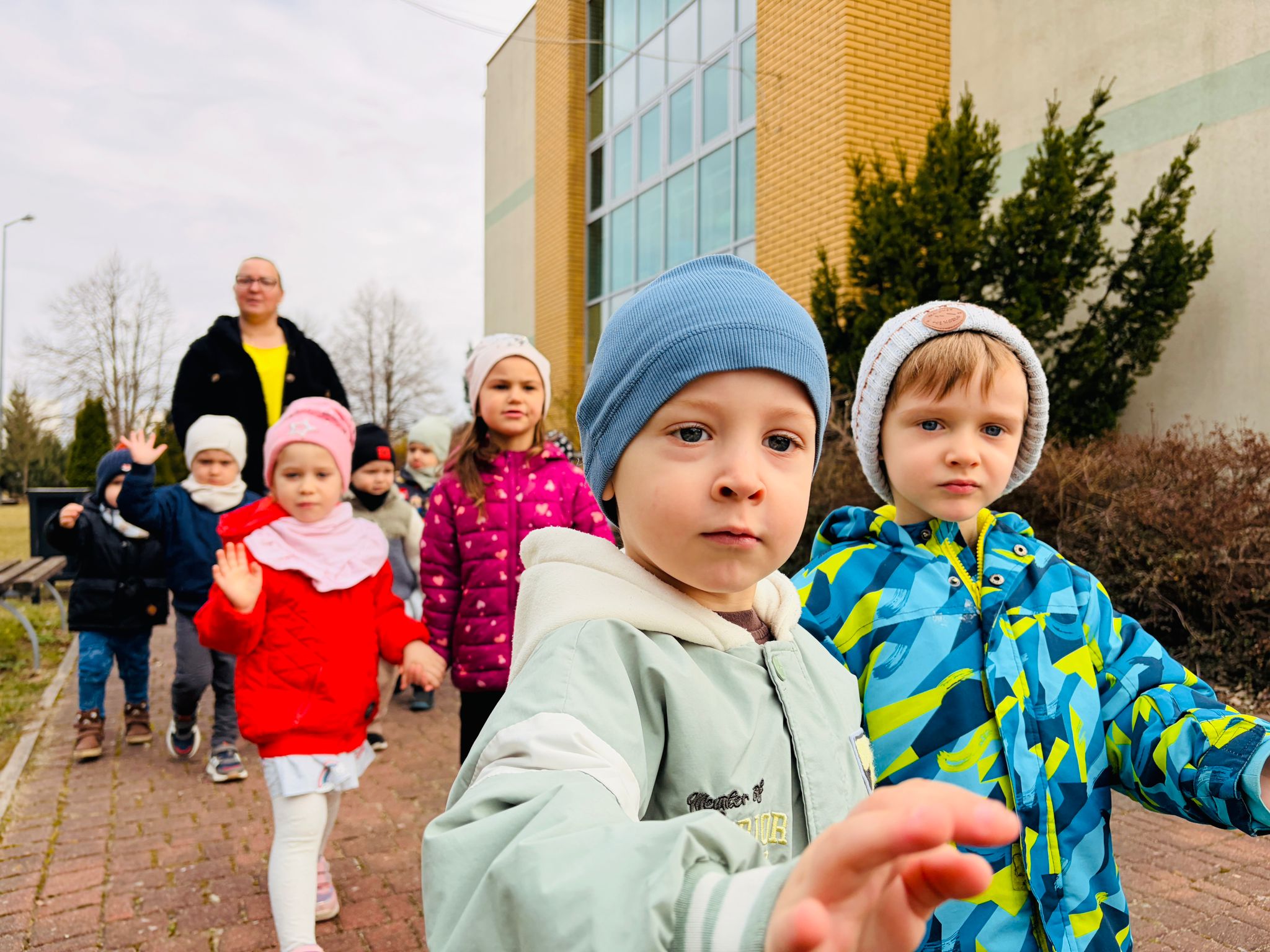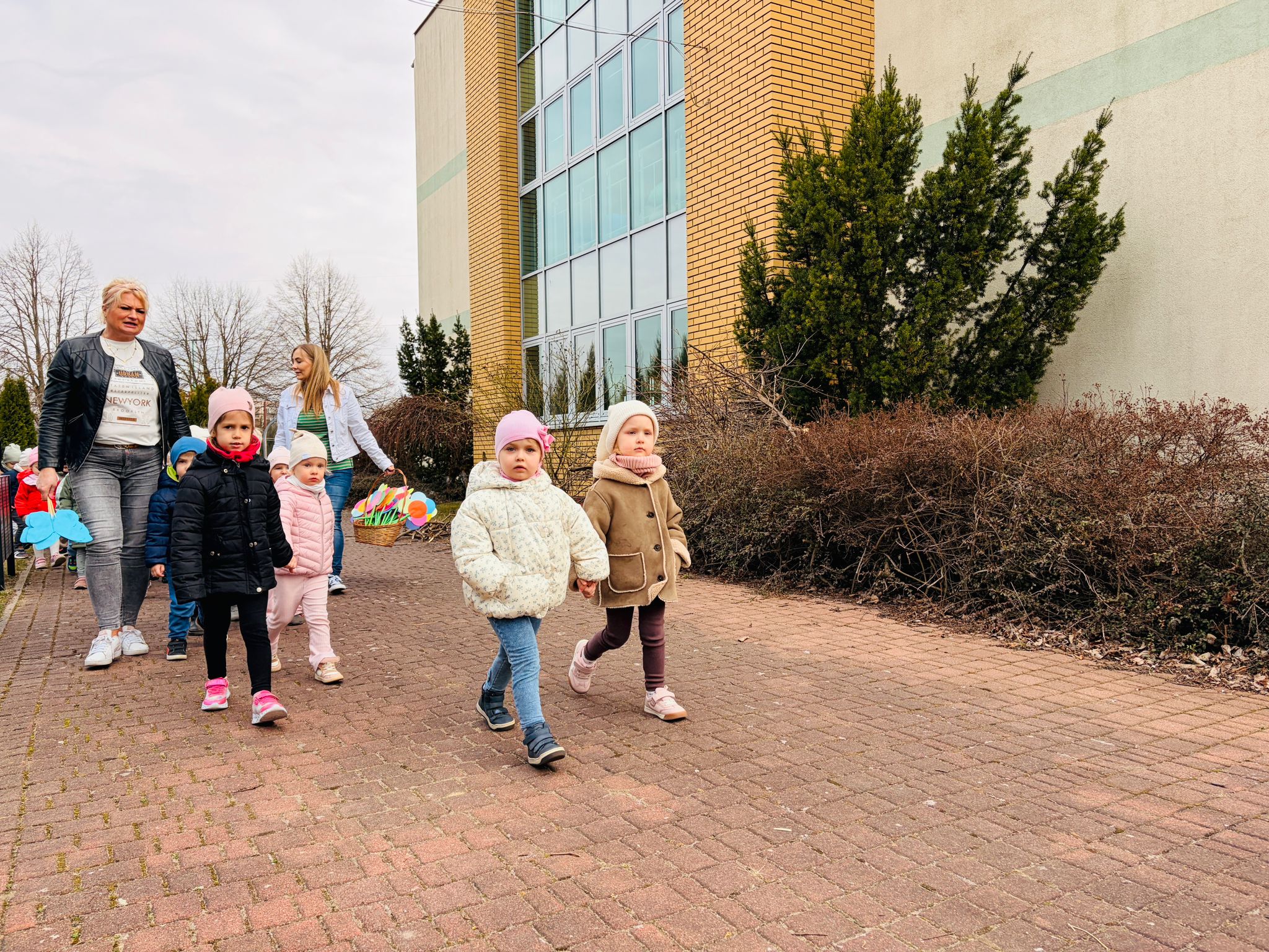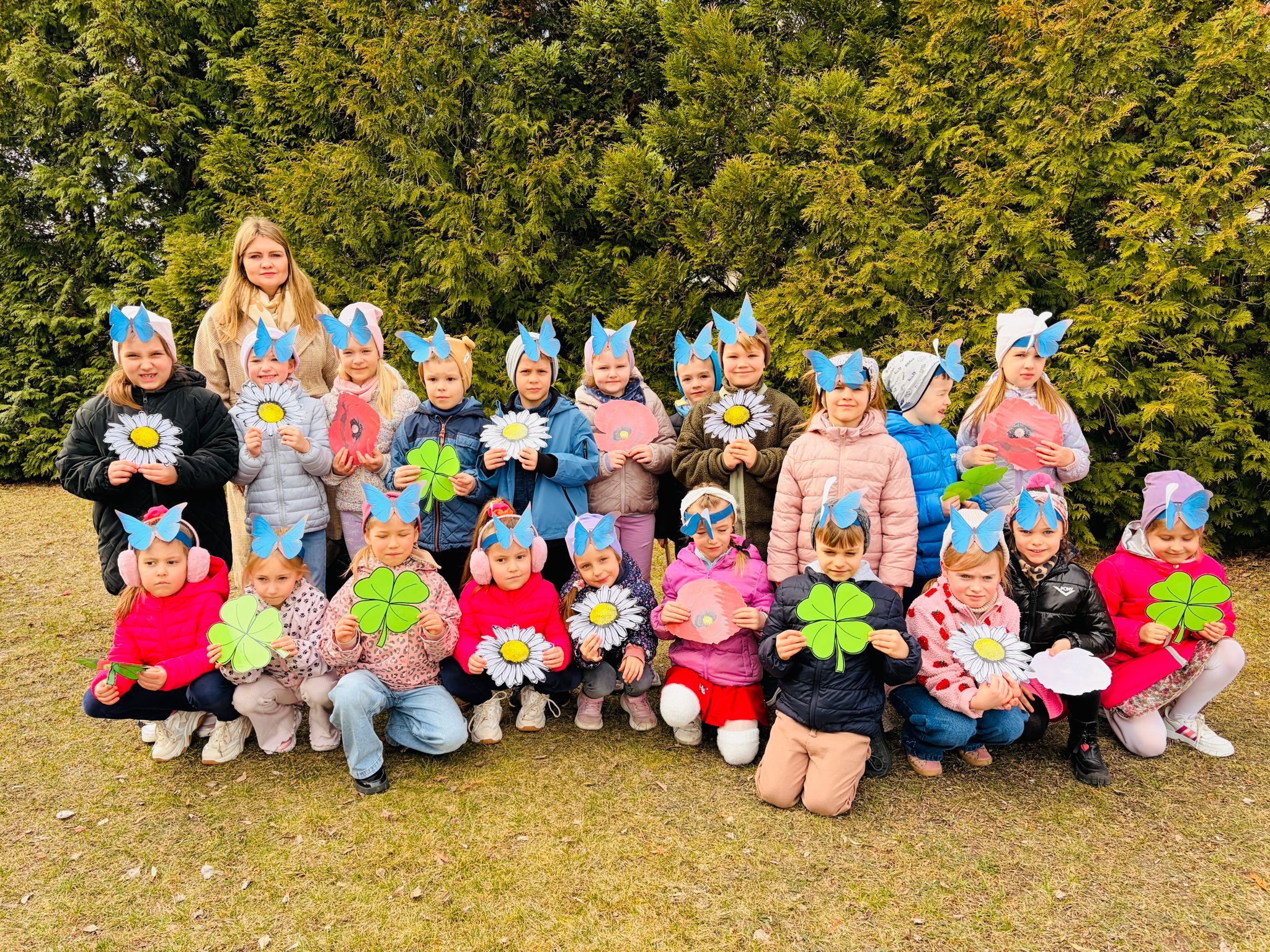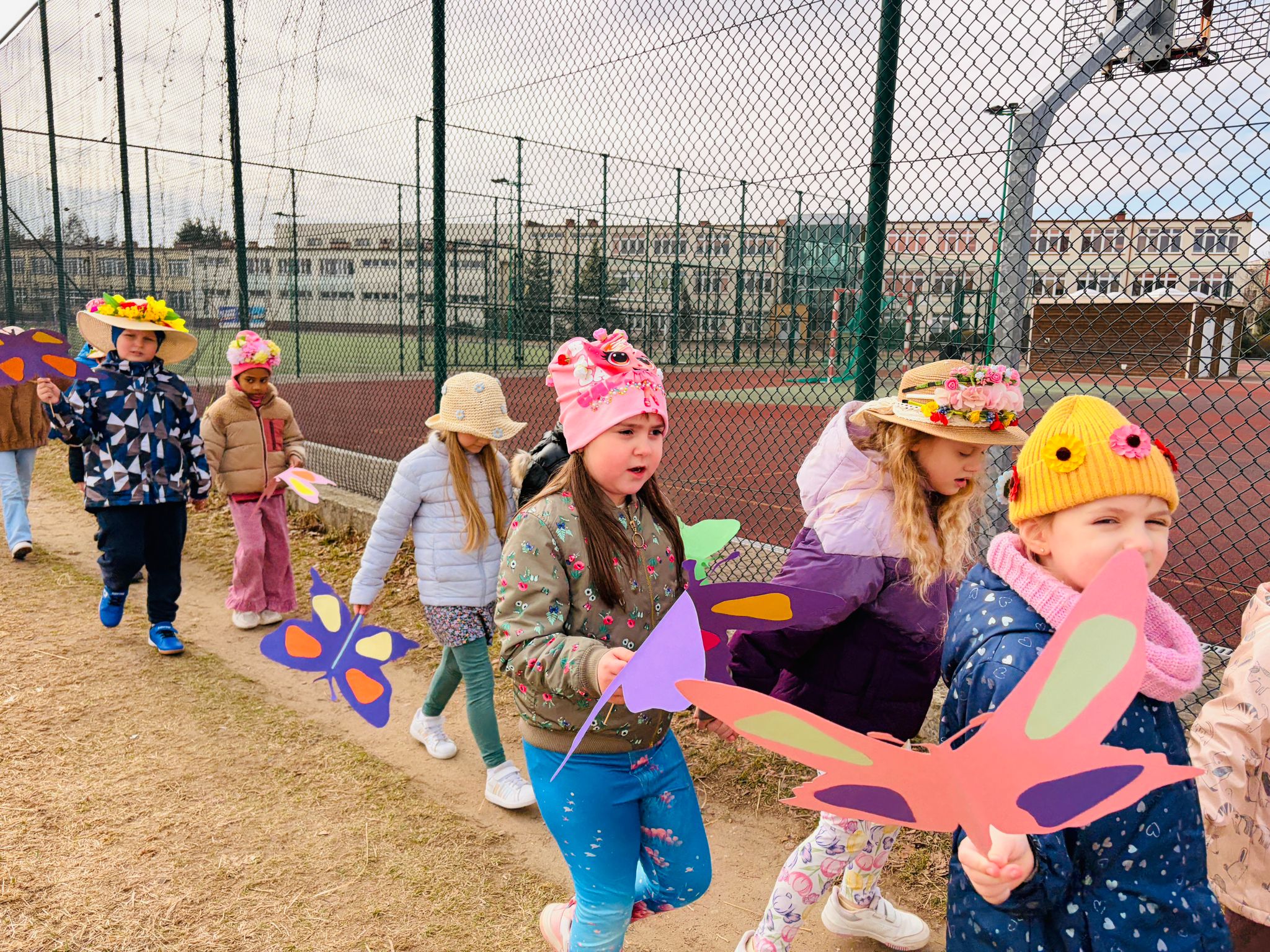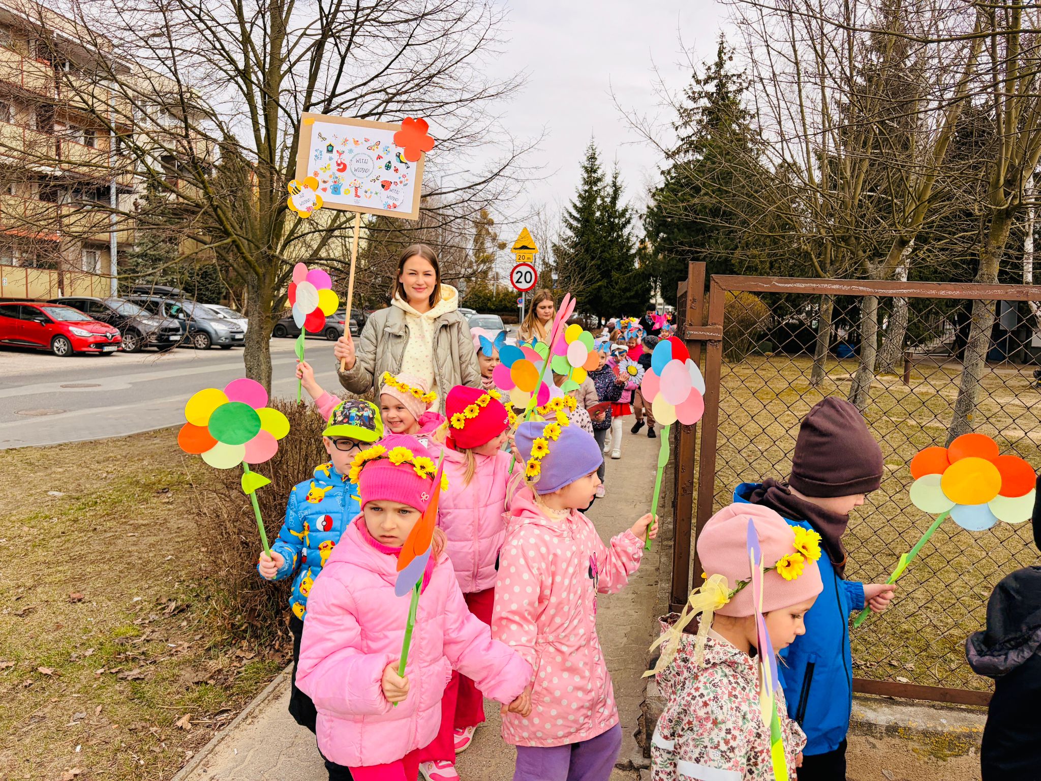 Dzieci wspólnie zaśpiewały piosenkę przed budynkiem przedszkola, a następnie wyruszyły w kolorowym pochodzie ulicami osiedla. Z kwiatami i motylami w dłoniach oraz uśmiechem na twarzach dzieci śpiewały wiosenne piosenki, wprowadzając wszystkich w radosny nastrój. Wiosno! Jak dobrze, że jesteś J