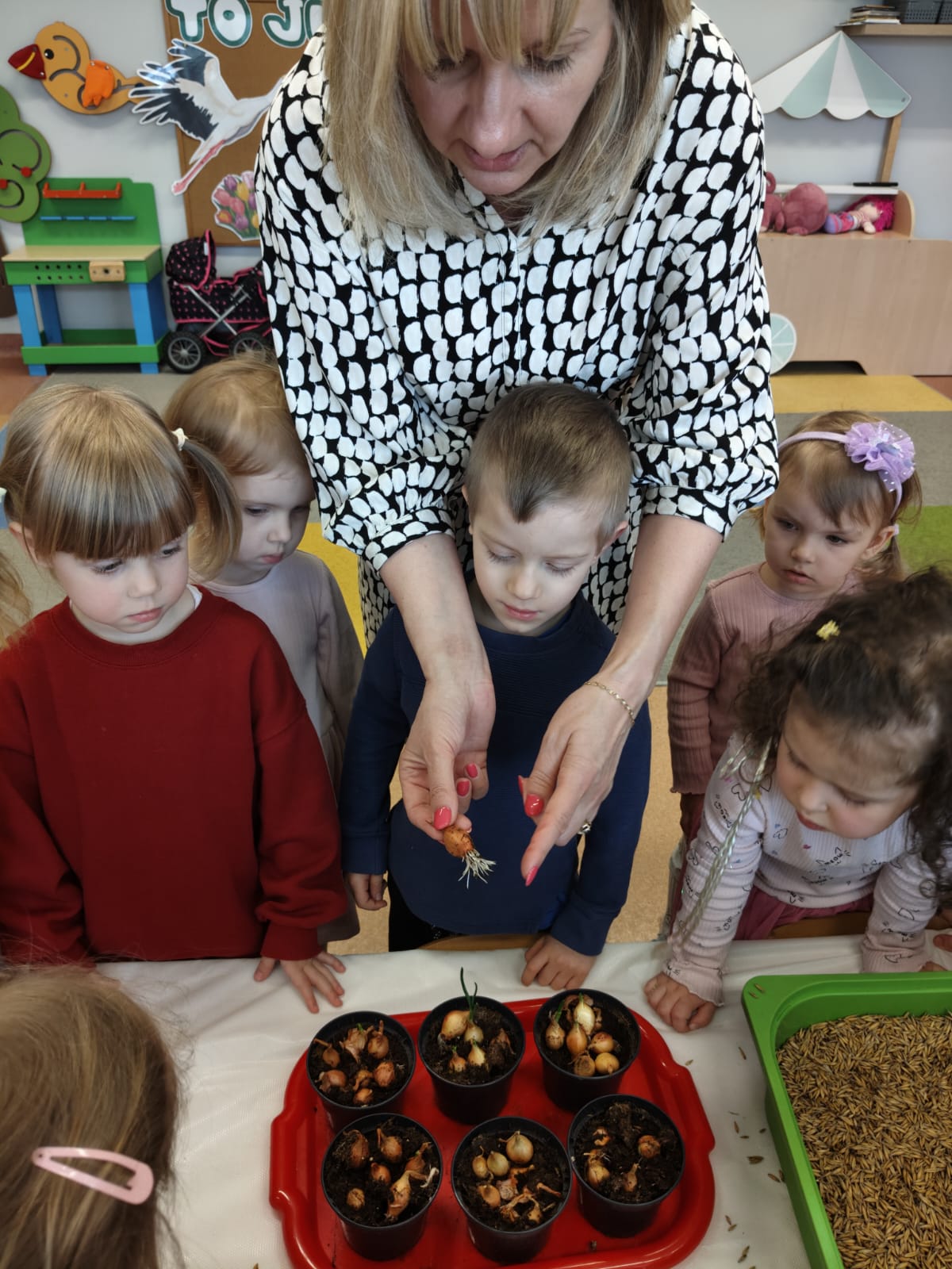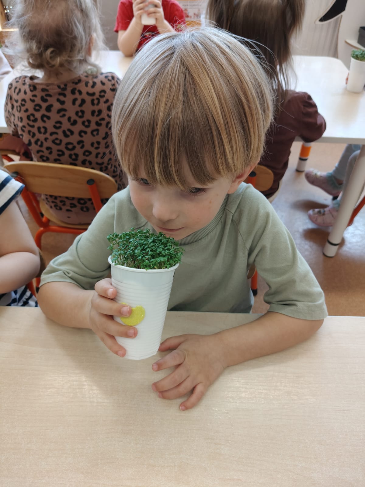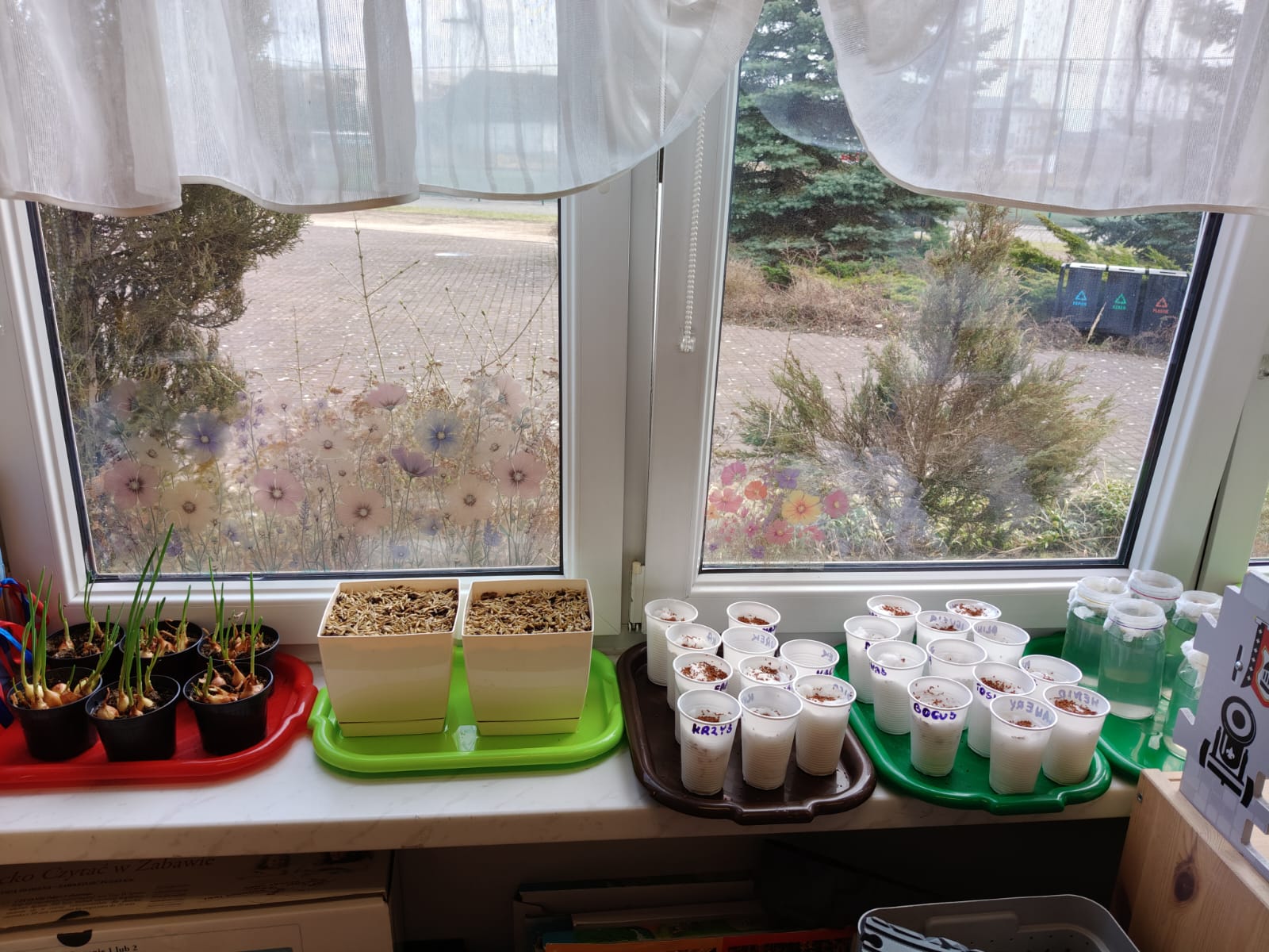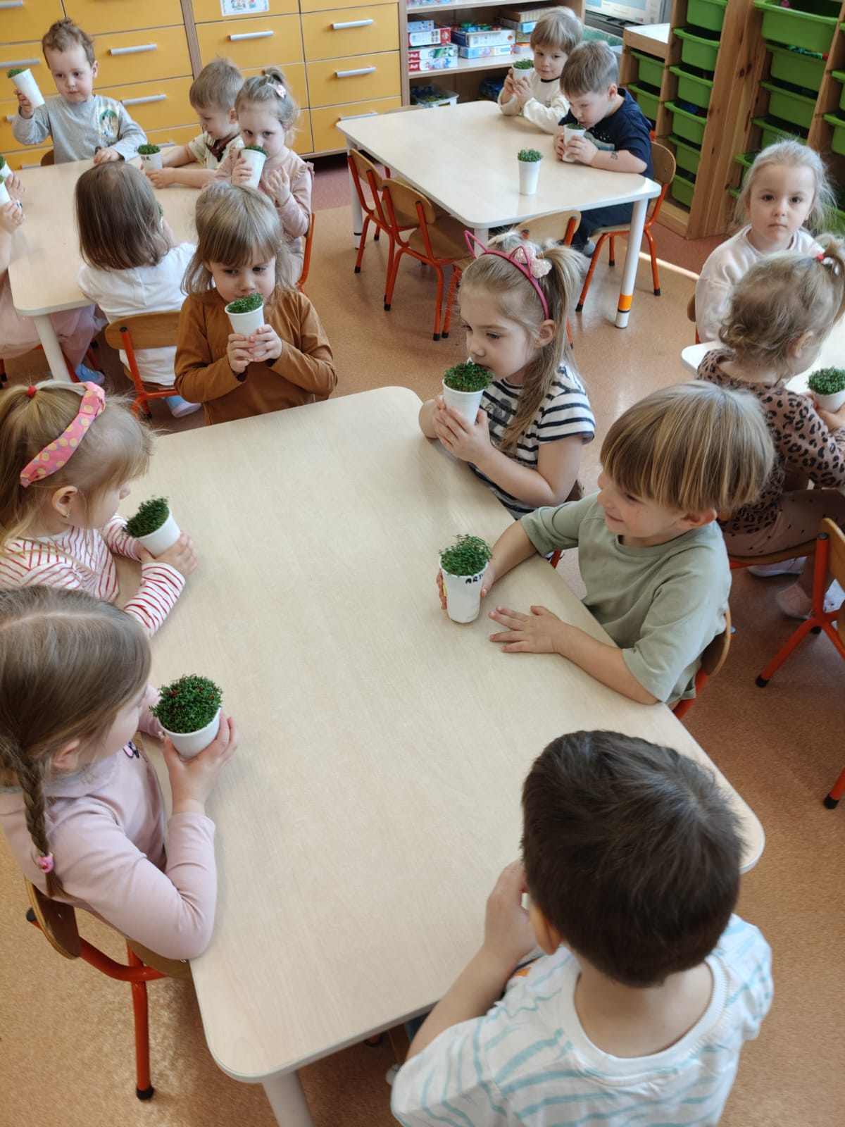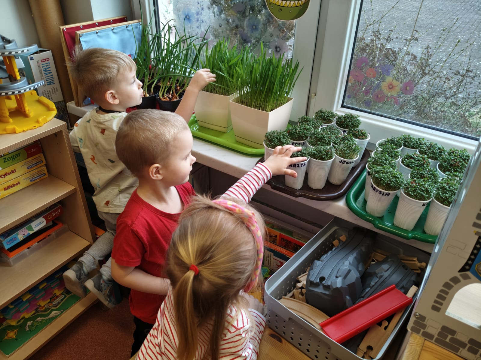 Wraz z nadejściem wiosny z powodzeniem założyliśmy zielony kącik na parapecie okiennym. Dzieci przy niewielkiej pomocy, przygotowały niezbędny warsztat pracy tj.: ziemię, nasiona, cebulki, wodę. Następnie samodzielnie zasiały nasiona rzeżuchy w pojemniczkach z namoczoną watą, w słoiczkach z wodą na gazie ziarenka fasoli, a w pojemniczkach z ziemią zasadziły cebulki i kolorowe bratki. Założone uprawy dzieci pielęgnowały, podlewał oraz każdego dnia obserwowały zmiany zachodzące w roślinach, zauważały kiełkowanie, wzrost łodyg, liści, dowiedziały się, co jest potrzebne roślinom do wzrostu. Miały możliwość zapoznania się z różnymi rodzajami nasion oraz dowiedziały jakie są sposoby uprawy roślin i ich pielęgnacji. Od momentu zakładania zielonego ogródka, doświadczały wielu wrażeń zmysłowych. Przygotowanie podłoża, dotykanie różnych części roślin, czynności pielęgnacyjne – to stymulacja zmysłu dotyku. Przy sprawdzaniu twardości nasion, przy sadzenie aktywowały czucie głębokie. Przyglądanie się efektom hodowli, wyszukiwanie zmian i innych ciekawostek pobudzało do pracy zmysł wzroku, nie zapominaliśmy także o zmysłach powonienia i smaku. Uprawa ogródka ziołowego była również naturalną okazją do rozmów z dziećmi o zasadach zdrowego żywienia. Udział w projekcie był dla dzieci wyzwaniem, które stawiało je w roli aktywnych i czujnych obserwatorów otaczającego świata. Rozbudzało zainteresowania, mobilizowało do poszukiwania odpowiedzi na różne pytania, uczyło twórczego myślenia i zaspokajało potrzeby poznawcze. Dzieci uczyły się planowania i organizacji pracy, współpracy, pozytywnej komunikacji. Doświadczały radości, satysfakcji, oraz wzmacniały poczucie własnej wartości.