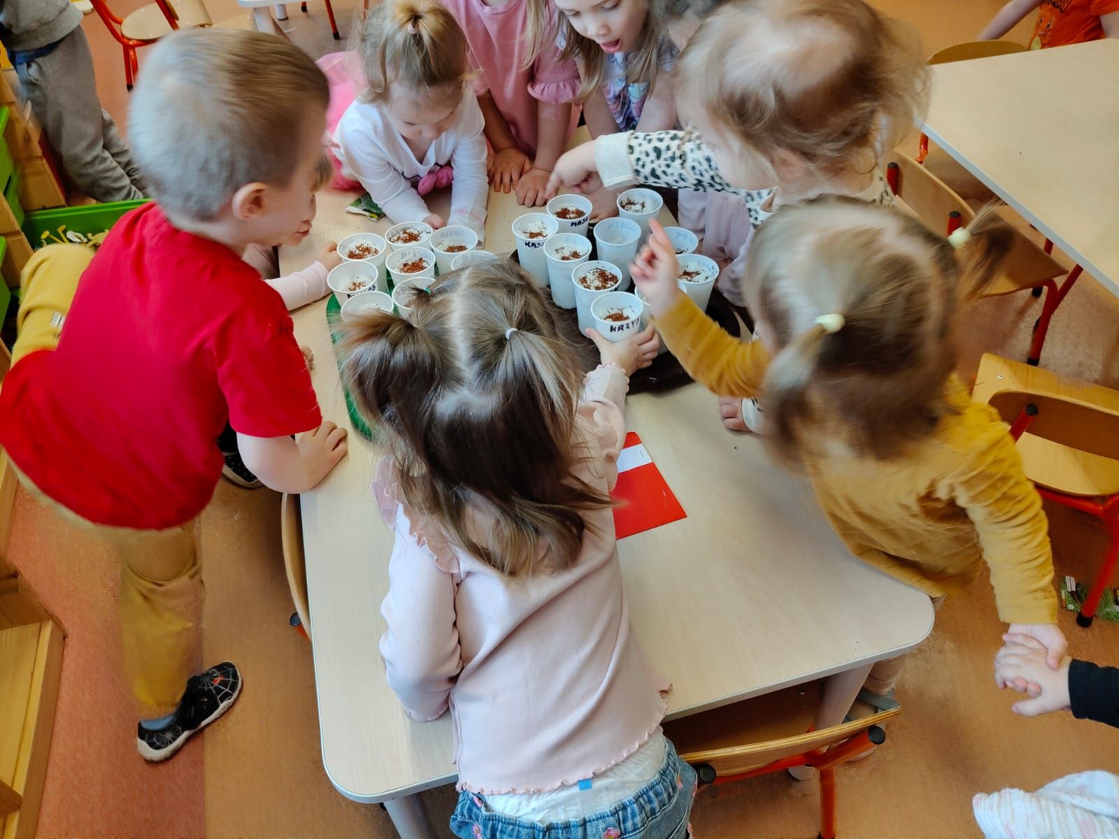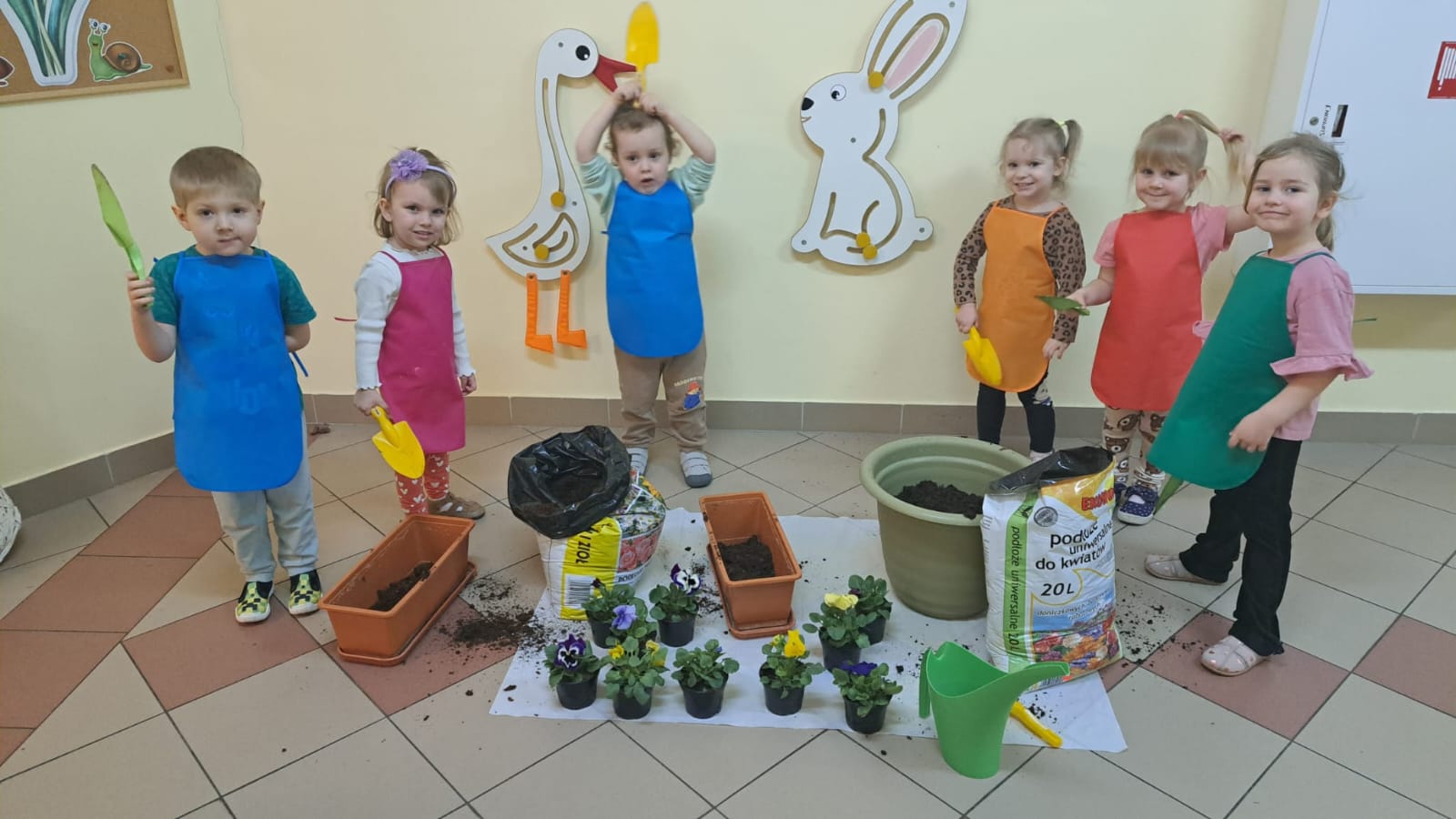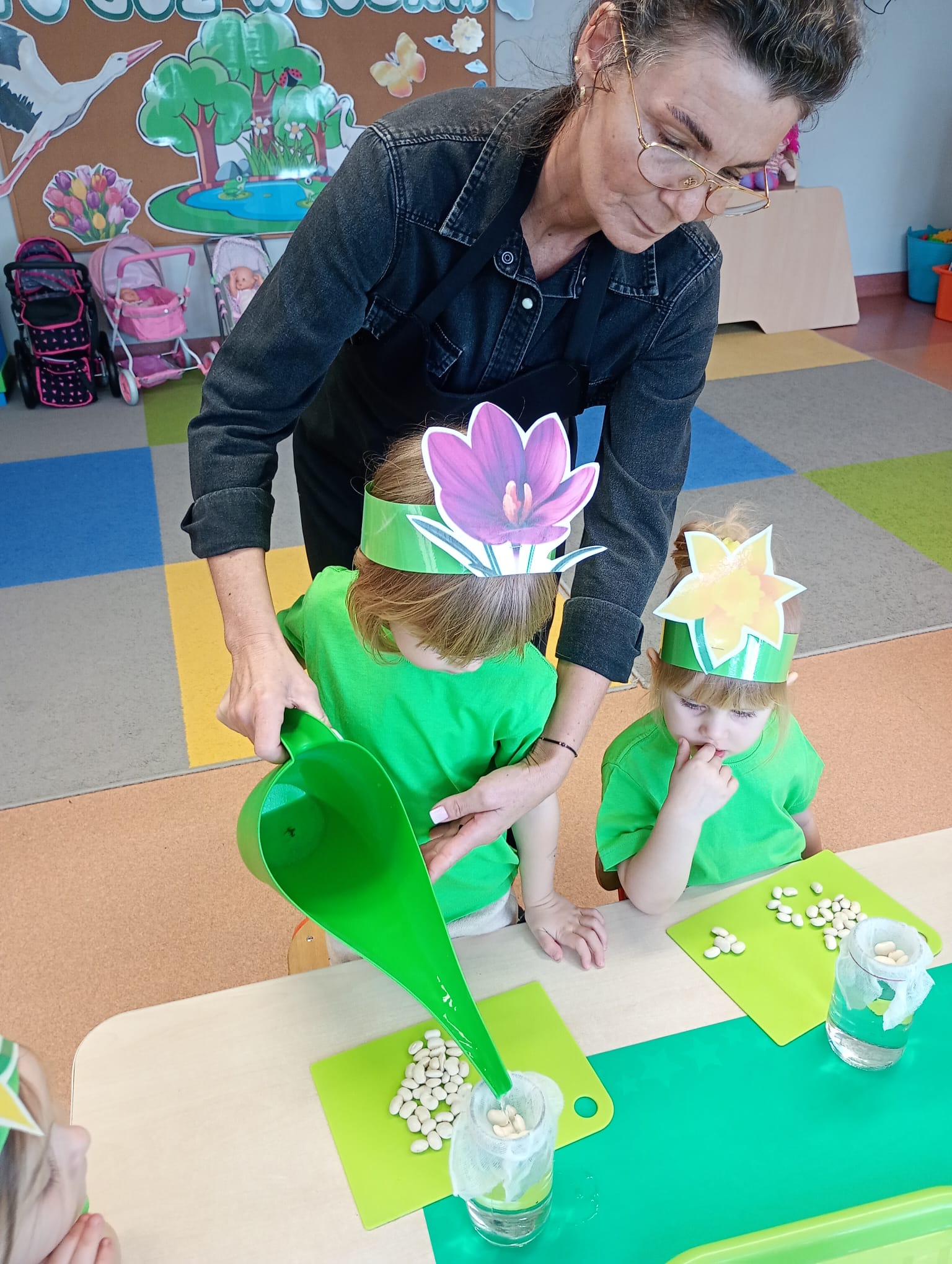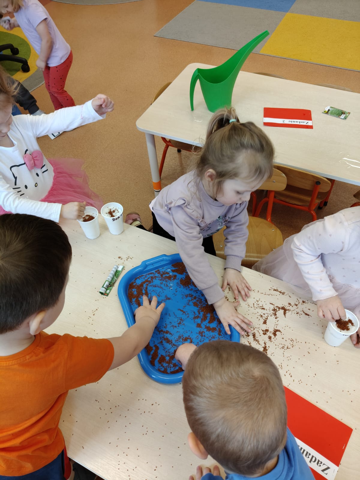 Wraz z nadejściem wiosny z powodzeniem założyliśmy zielony kącik na parapecie okiennym. Dzieci przy niewielkiej pomocy, przygotowały niezbędny warsztat pracy tj.: ziemię, nasiona, cebulki, wodę. Następnie samodzielnie zasiały nasiona rzeżuchy w pojemniczkach z namoczoną watą, w słoiczkach z wodą na gazie ziarenka fasoli, a w pojemniczkach z ziemią zasadziły cebulki i kolorowe bratki. Założone uprawy dzieci pielęgnowały, podlewał oraz każdego dnia obserwowały zmiany zachodzące w roślinach, zauważały kiełkowanie, wzrost łodyg, liści, dowiedziały się, co jest potrzebne roślinom do wzrostu. Miały możliwość zapoznania się z różnymi rodzajami nasion oraz dowiedziały jakie są sposoby uprawy roślin i ich pielęgnacji. Od momentu zakładania zielonego ogródka, doświadczały wielu wrażeń zmysłowych. Przygotowanie podłoża, dotykanie różnych części roślin, czynności pielęgnacyjne – to stymulacja zmysłu dotyku. Przy sprawdzaniu twardości nasion, przy sadzenie aktywowały czucie głębokie. Przyglądanie się efektom hodowli, wyszukiwanie zmian i innych ciekawostek pobudzało do pracy zmysł wzroku, nie zapominaliśmy także o zmysłach powonienia i smaku. Uprawa ogródka ziołowego była również naturalną okazją do rozmów z dziećmi o zasadach zdrowego żywienia. Udział w projekcie był dla dzieci wyzwaniem, które stawiało je w roli aktywnych i czujnych obserwatorów otaczającego świata. Rozbudzało zainteresowania, mobilizowało do poszukiwania odpowiedzi na różne pytania, uczyło twórczego myślenia i zaspokajało potrzeby poznawcze. Dzieci uczyły się planowania i organizacji pracy, współpracy, pozytywnej komunikacji. Doświadczały radości, satysfakcji, oraz wzmacniały poczucie własnej wartości.