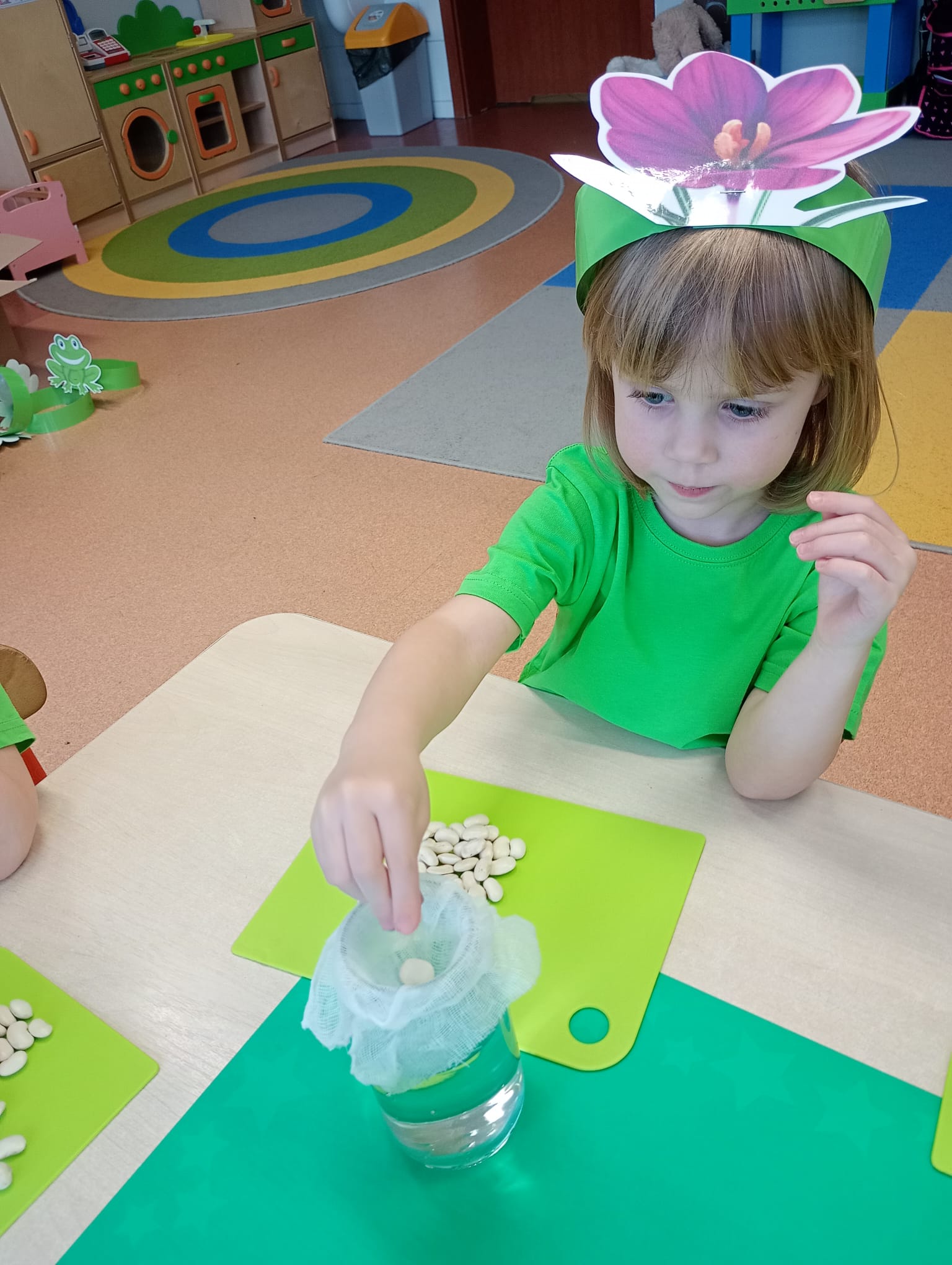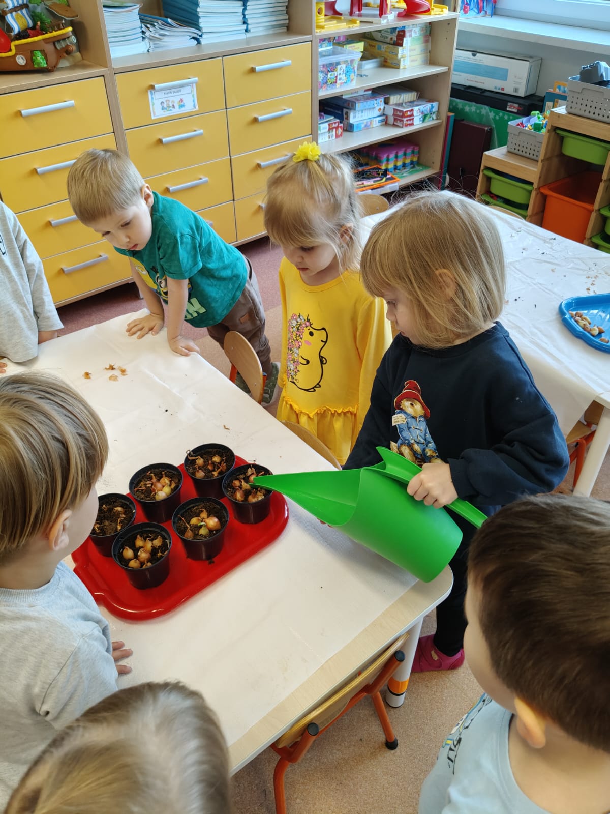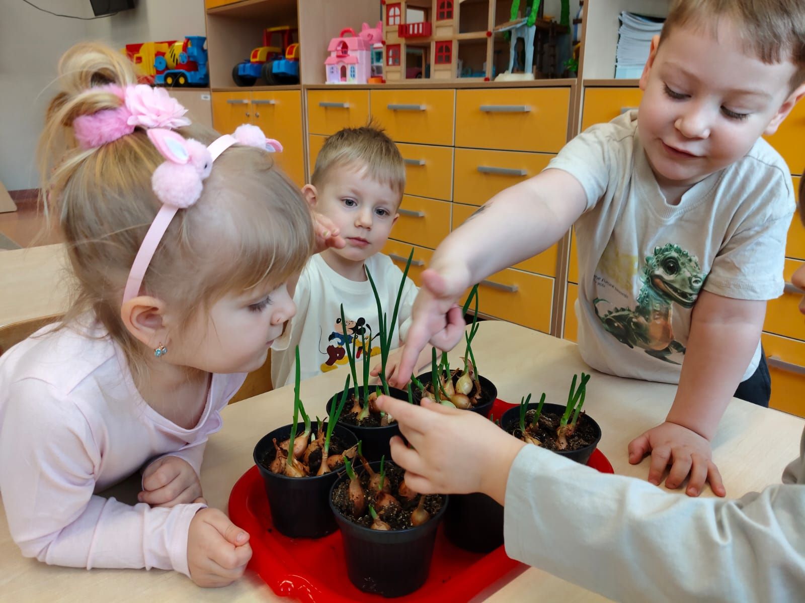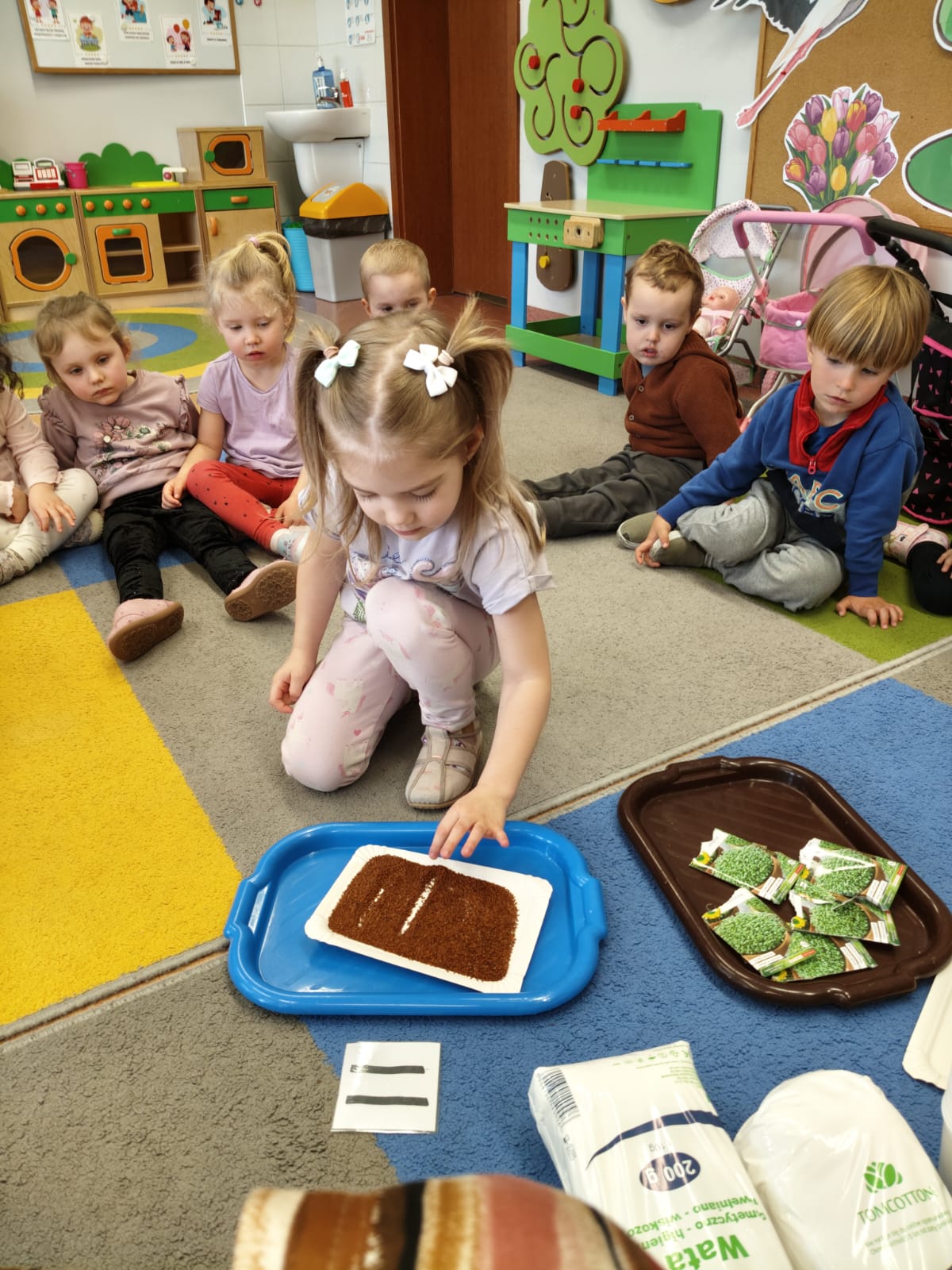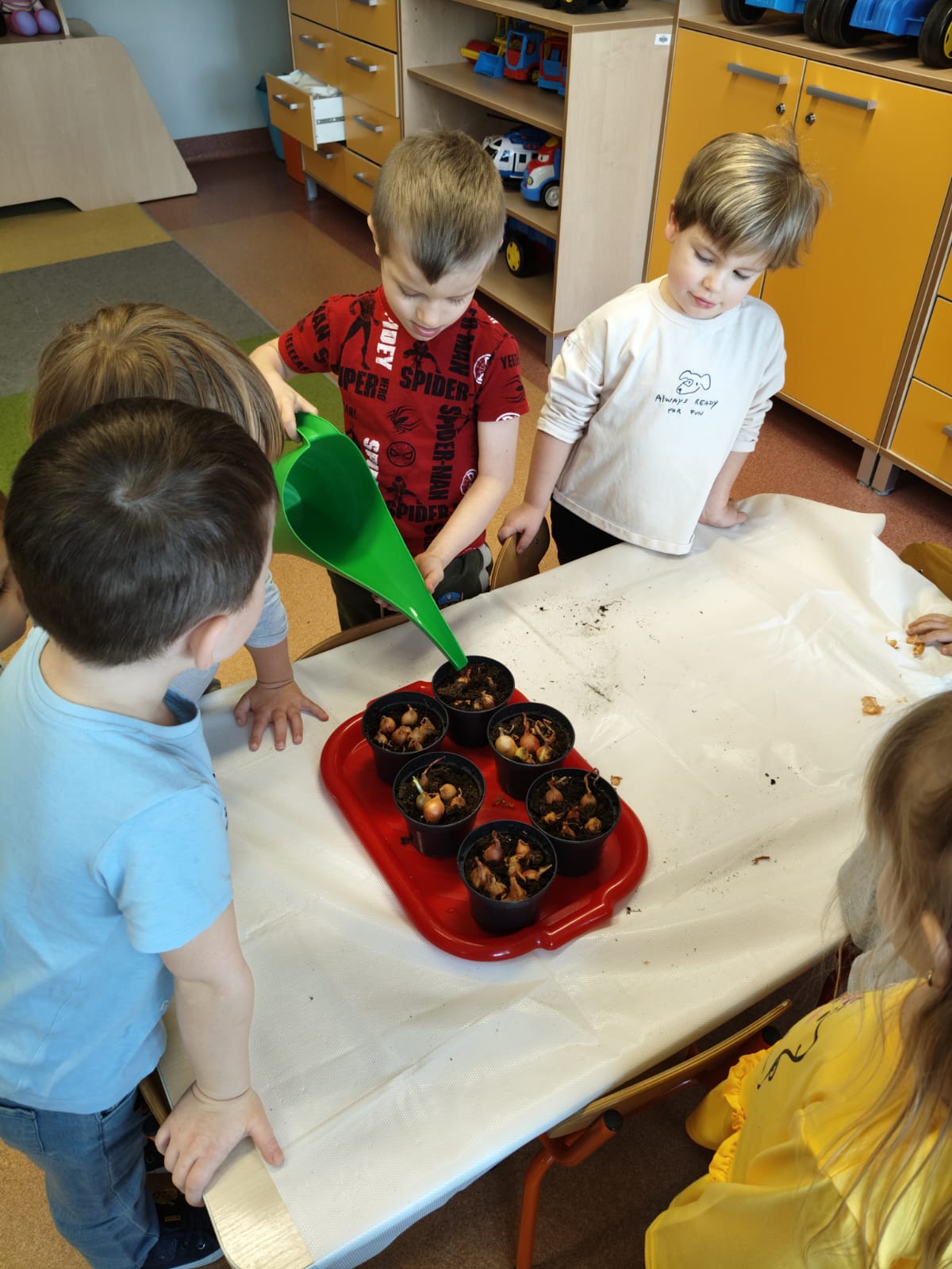 Wraz z nadejściem wiosny z powodzeniem założyliśmy zielony kącik na parapecie okiennym. Dzieci przy niewielkiej pomocy, przygotowały niezbędny warsztat pracy tj.: ziemię, nasiona, cebulki, wodę. Następnie samodzielnie zasiały nasiona rzeżuchy w pojemniczkach z namoczoną watą, w słoiczkach z wodą na gazie ziarenka fasoli, a w pojemniczkach z ziemią zasadziły cebulki i kolorowe bratki. Założone uprawy dzieci pielęgnowały, podlewał oraz każdego dnia obserwowały zmiany zachodzące w roślinach, zauważały kiełkowanie, wzrost łodyg, liści, dowiedziały się, co jest potrzebne roślinom do wzrostu. Miały możliwość zapoznania się z różnymi rodzajami nasion oraz dowiedziały jakie są sposoby uprawy roślin i ich pielęgnacji. Od momentu zakładania zielonego ogródka, doświadczały wielu wrażeń zmysłowych. Przygotowanie podłoża, dotykanie różnych części roślin, czynności pielęgnacyjne – to stymulacja zmysłu dotyku. Przy sprawdzaniu twardości nasion, przy sadzenie aktywowały czucie głębokie. Przyglądanie się efektom hodowli, wyszukiwanie zmian i innych ciekawostek pobudzało do pracy zmysł wzroku, nie zapominaliśmy także o zmysłach powonienia i smaku. Uprawa ogródka ziołowego była również naturalną okazją do rozmów z dziećmi o zasadach zdrowego żywienia. Udział w projekcie był dla dzieci wyzwaniem, które stawiało je w roli aktywnych i czujnych obserwatorów otaczającego świata. Rozbudzało zainteresowania, mobilizowało do poszukiwania odpowiedzi na różne pytania, uczyło twórczego myślenia i zaspokajało potrzeby poznawcze. Dzieci uczyły się planowania i organizacji pracy, współpracy, pozytywnej komunikacji. Doświadczały radości, satysfakcji, oraz wzmacniały poczucie własnej wartości.