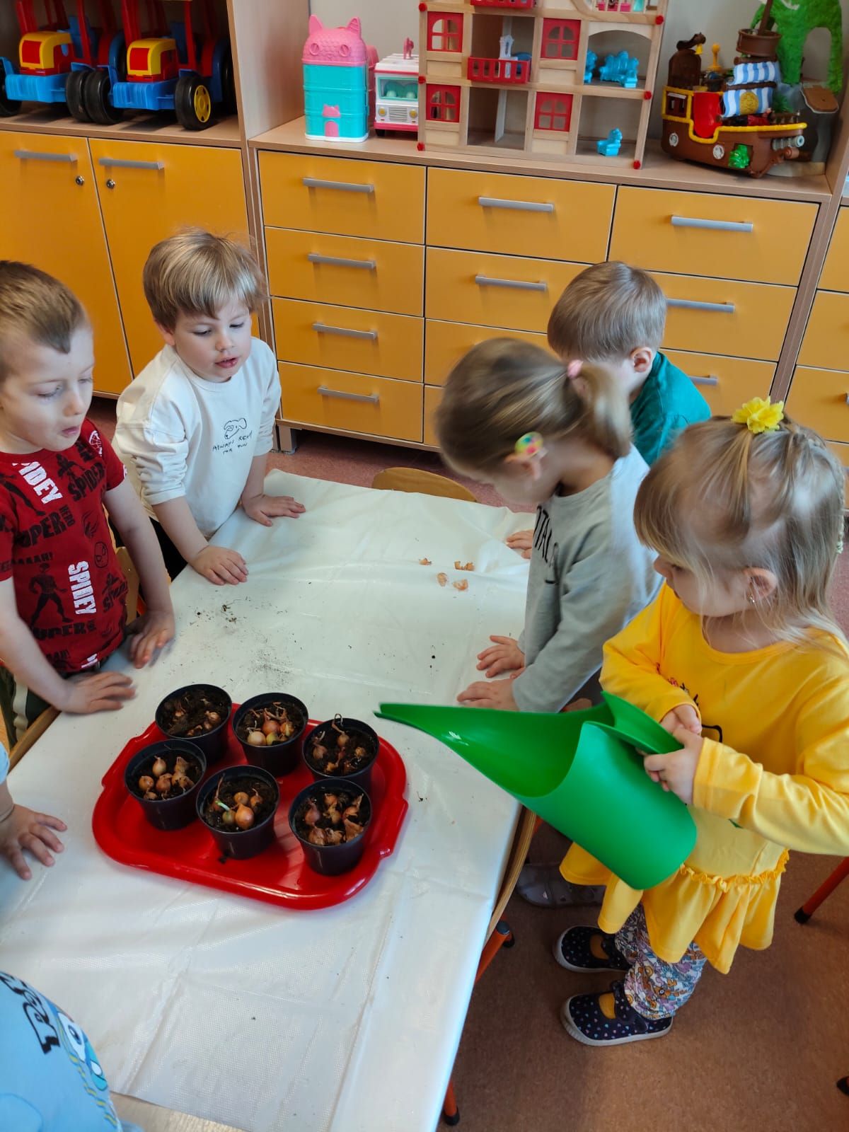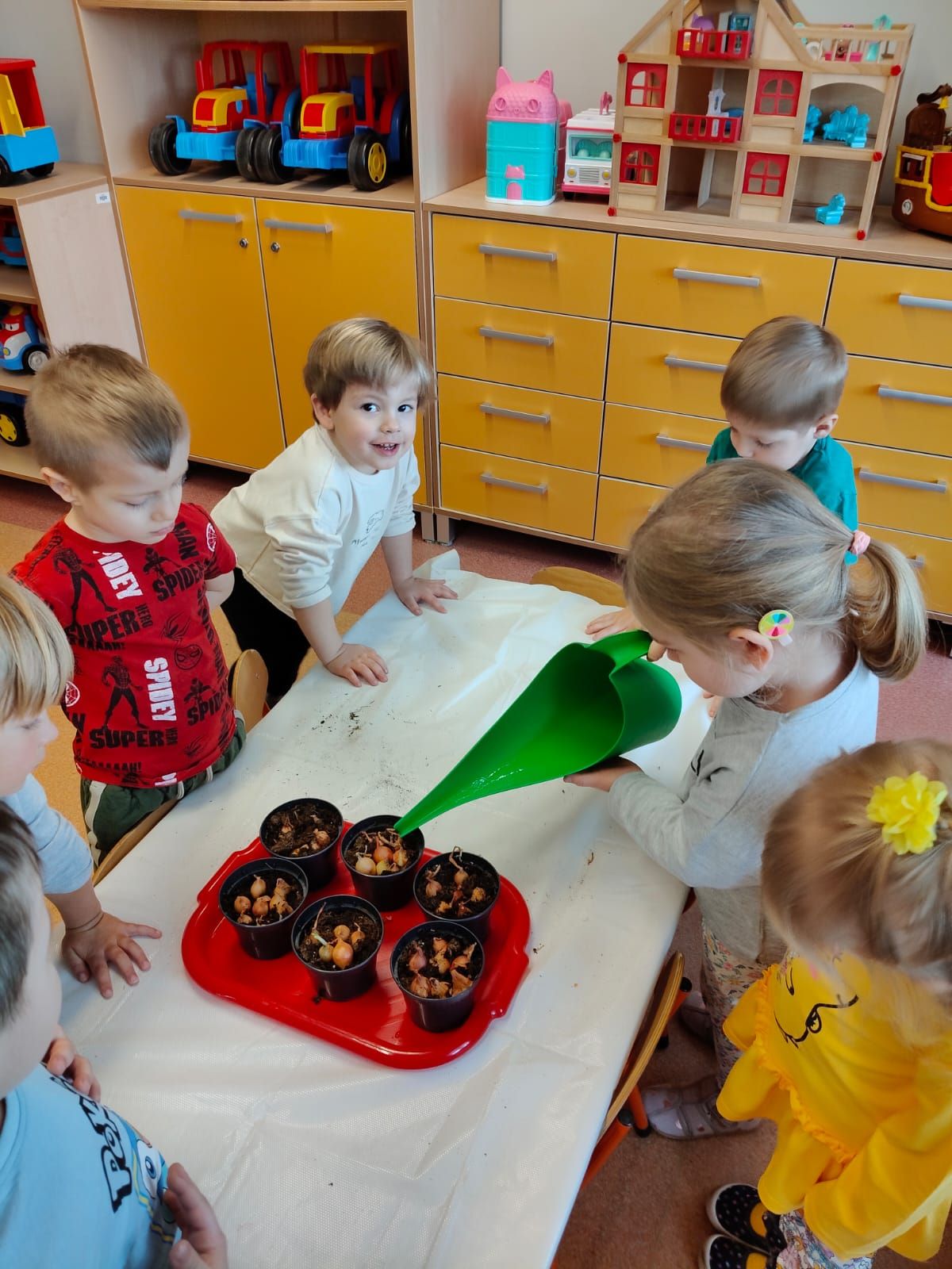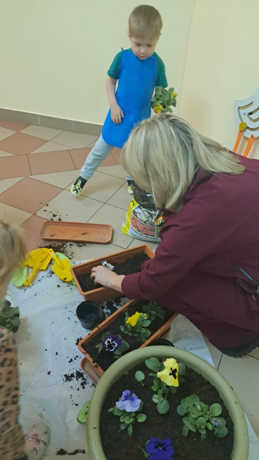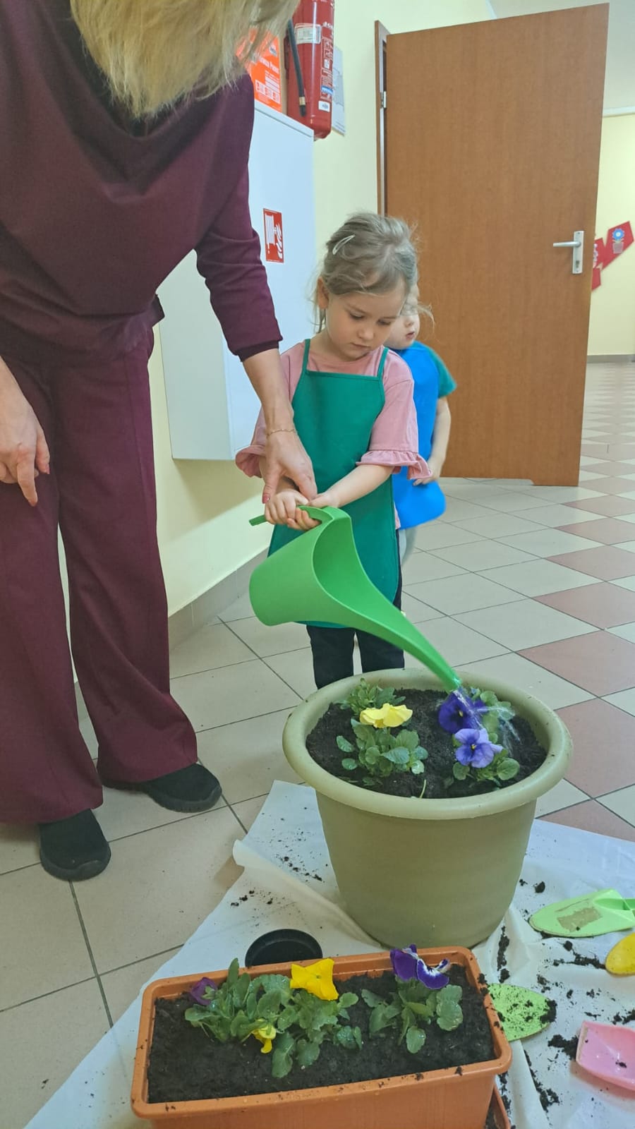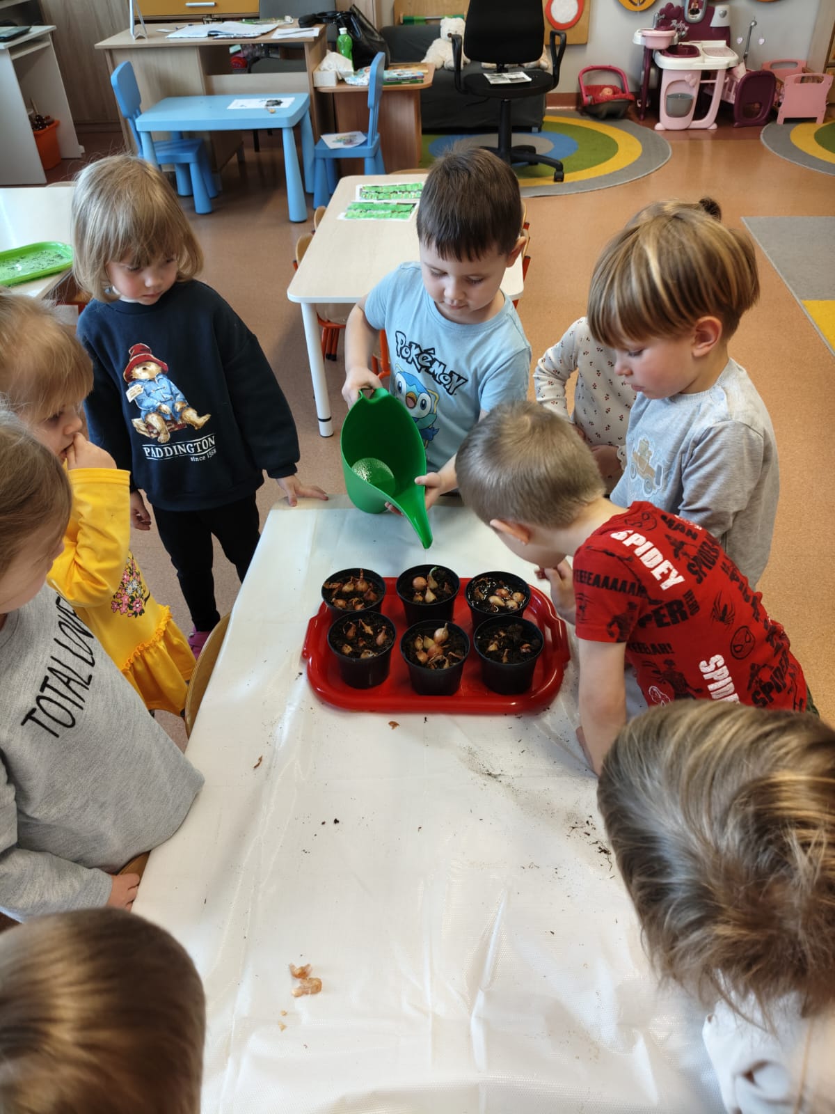Wraz z nadejściem wiosny z powodzeniem założyliśmy zielony kącik na parapecie okiennym. Dzieci przy niewielkiej pomocy, przygotowały niezbędny warsztat pracy tj.: ziemię, nasiona, cebulki, wodę. Następnie samodzielnie zasiały nasiona rzeżuchy w pojemniczkach z namoczoną watą, w słoiczkach z wodą na gazie ziarenka fasoli, a w pojemniczkach z ziemią zasadziły cebulki i kolorowe bratki. Założone uprawy dzieci pielęgnowały, podlewał oraz każdego dnia obserwowały zmiany zachodzące w roślinach, zauważały kiełkowanie, wzrost łodyg, liści, dowiedziały się, co jest potrzebne roślinom do wzrostu. Miały możliwość zapoznania się z różnymi rodzajami nasion oraz dowiedziały jakie są sposoby uprawy roślin i ich pielęgnacji. Od momentu zakładania zielonego ogródka, doświadczały wielu wrażeń zmysłowych. Przygotowanie podłoża, dotykanie różnych części roślin, czynności pielęgnacyjne – to stymulacja zmysłu dotyku. Przy sprawdzaniu twardości nasion, przy sadzenie aktywowały czucie głębokie. Przyglądanie się efektom hodowli, wyszukiwanie zmian i innych ciekawostek pobudzało do pracy zmysł wzroku, nie zapominaliśmy także o zmysłach powonienia i smaku. Uprawa ogródka ziołowego była również naturalną okazją do rozmów z dziećmi o zasadach zdrowego żywienia. Udział w projekcie był dla dzieci wyzwaniem, które stawiało je w roli aktywnych i czujnych obserwatorów otaczającego świata. Rozbudzało zainteresowania, mobilizowało do poszukiwania odpowiedzi na różne pytania, uczyło twórczego myślenia i zaspokajało potrzeby poznawcze. Dzieci uczyły się planowania i organizacji pracy, współpracy, pozytywnej komunikacji. Doświadczały radości, satysfakcji, oraz wzmacniały poczucie własnej wartości.