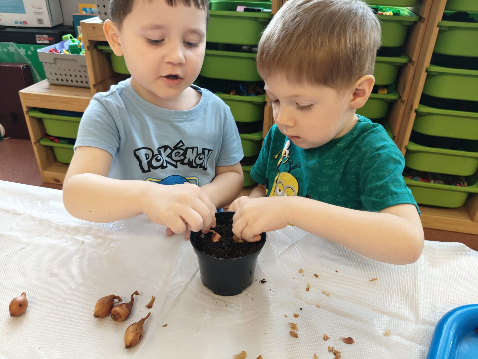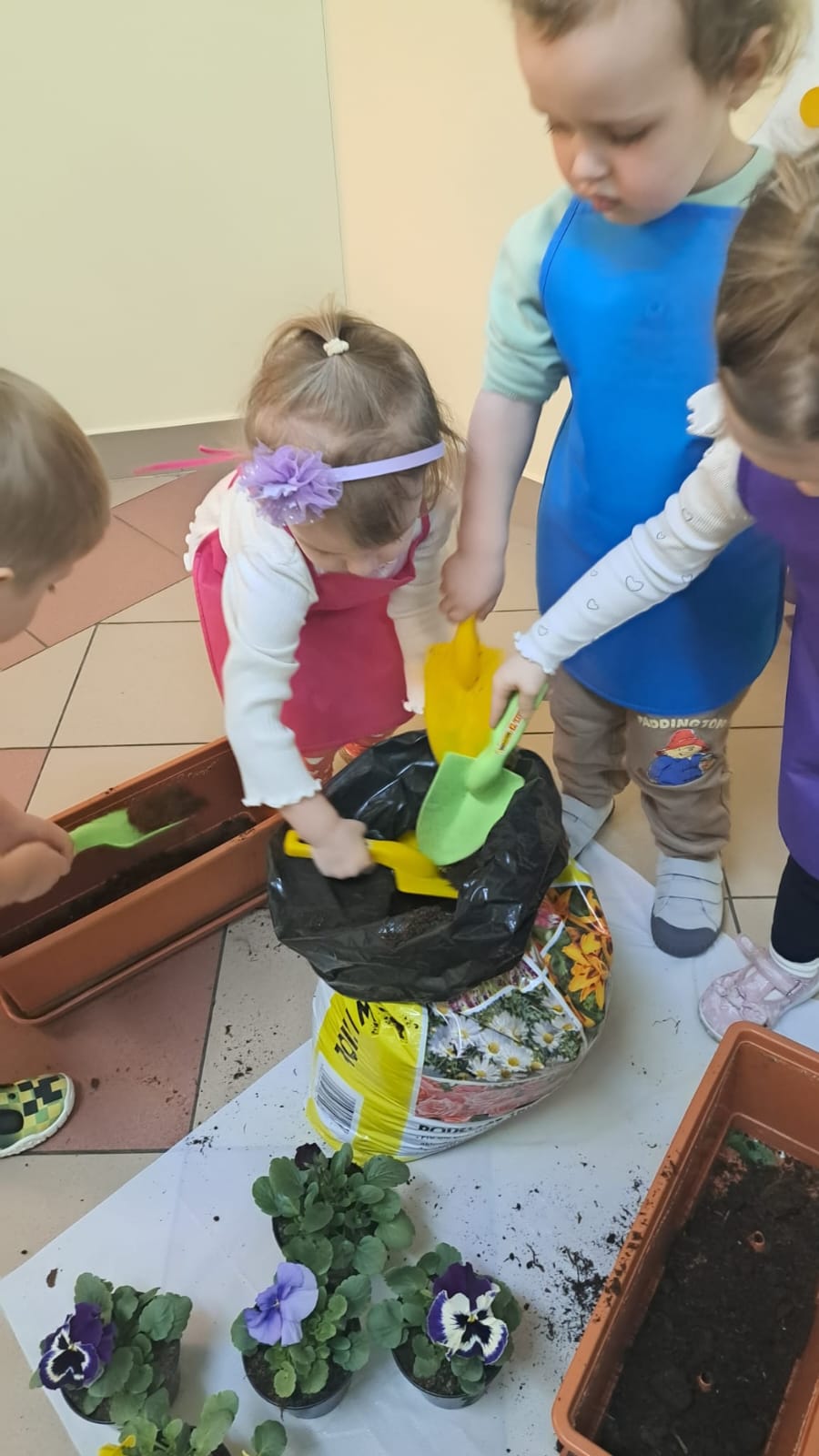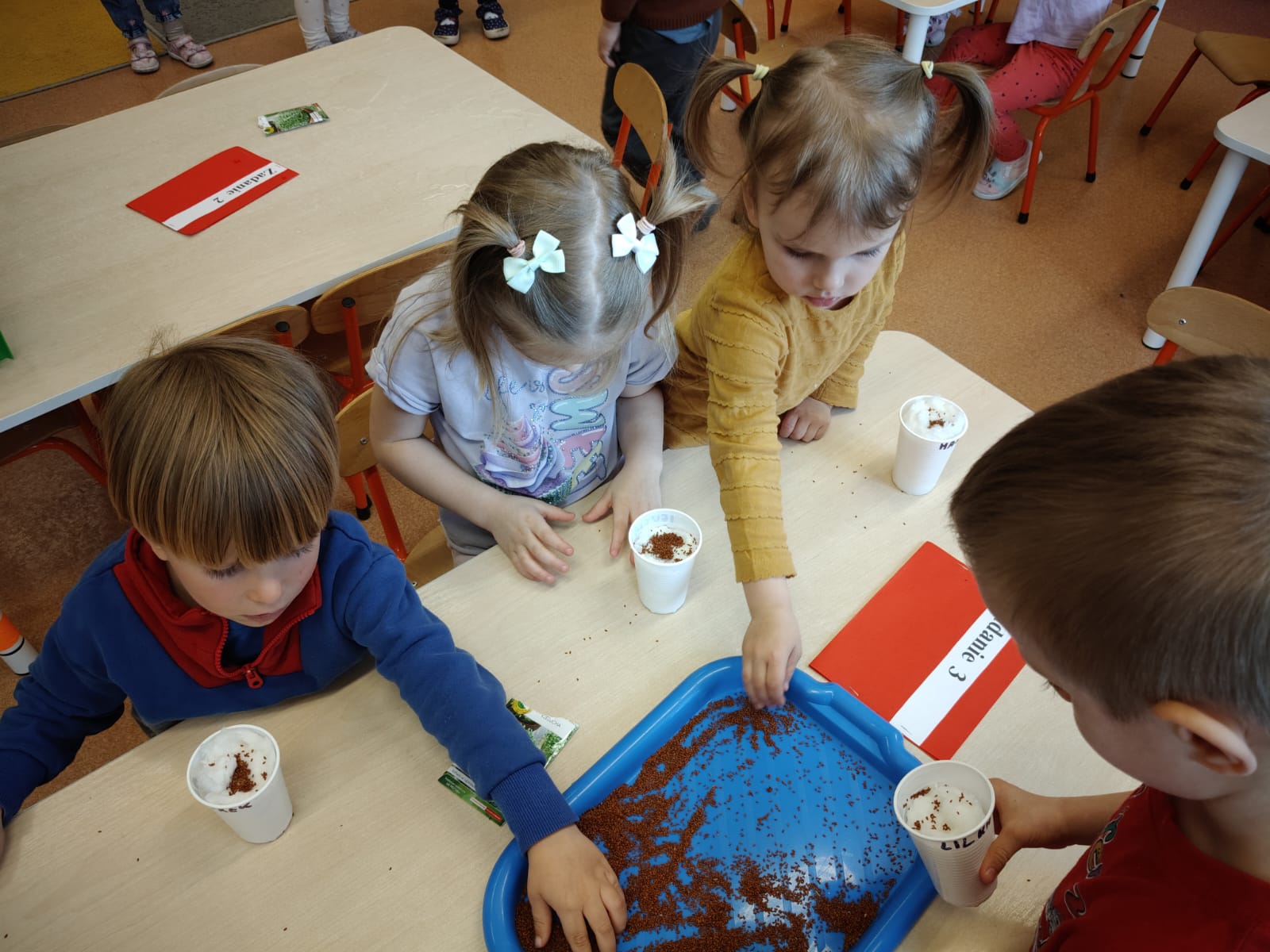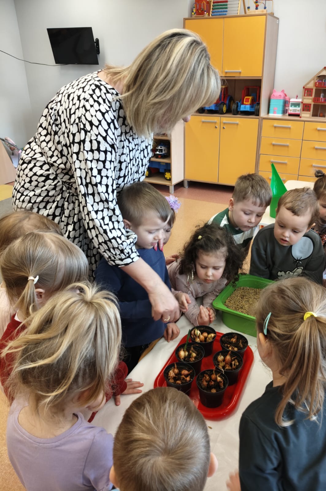 Wraz z nadejściem wiosny z powodzeniem założyliśmy zielony kącik na parapecie okiennym. Dzieci przy niewielkiej pomocy, przygotowały niezbędny warsztat pracy tj.: ziemię, nasiona, cebulki, wodę. Następnie samodzielnie zasiały nasiona rzeżuchy w pojemniczkach z namoczoną watą, w słoiczkach z wodą na gazie ziarenka fasoli, a w pojemniczkach z ziemią zasadziły cebulki i kolorowe bratki. Założone uprawy dzieci pielęgnowały, podlewał oraz każdego dnia obserwowały zmiany zachodzące w roślinach, zauważały kiełkowanie, wzrost łodyg, liści, dowiedziały się, co jest potrzebne roślinom do wzrostu. Miały możliwość zapoznania się z różnymi rodzajami nasion oraz dowiedziały jakie są sposoby uprawy roślin i ich pielęgnacji. Od momentu zakładania zielonego ogródka, doświadczały wielu wrażeń zmysłowych. Przygotowanie podłoża, dotykanie różnych części roślin, czynności pielęgnacyjne – to stymulacja zmysłu dotyku. Przy sprawdzaniu twardości nasion, przy sadzenie aktywowały czucie głębokie. Przyglądanie się efektom hodowli, wyszukiwanie zmian i innych ciekawostek pobudzało do pracy zmysł wzroku, nie zapominaliśmy także o zmysłach powonienia i smaku. Uprawa ogródka ziołowego była również naturalną okazją do rozmów z dziećmi o zasadach zdrowego żywienia. Udział w projekcie był dla dzieci wyzwaniem, które stawiało je w roli aktywnych i czujnych obserwatorów otaczającego świata. Rozbudzało zainteresowania, mobilizowało do poszukiwania odpowiedzi na różne pytania, uczyło twórczego myślenia i zaspokajało potrzeby poznawcze. Dzieci uczyły się planowania i organizacji pracy, współpracy, pozytywnej komunikacji. Doświadczały radości, satysfakcji, oraz wzmacniały poczucie własnej wartości.