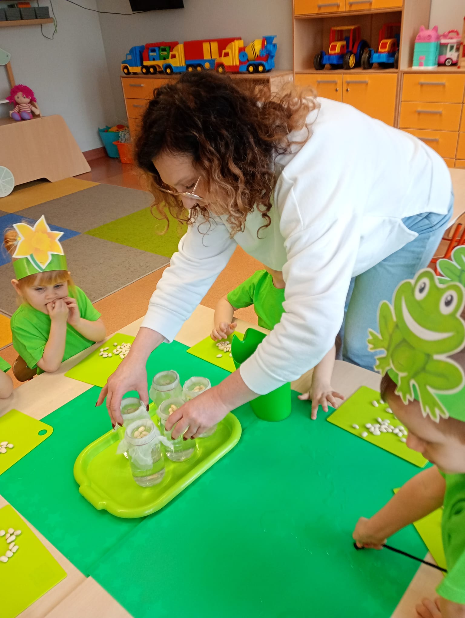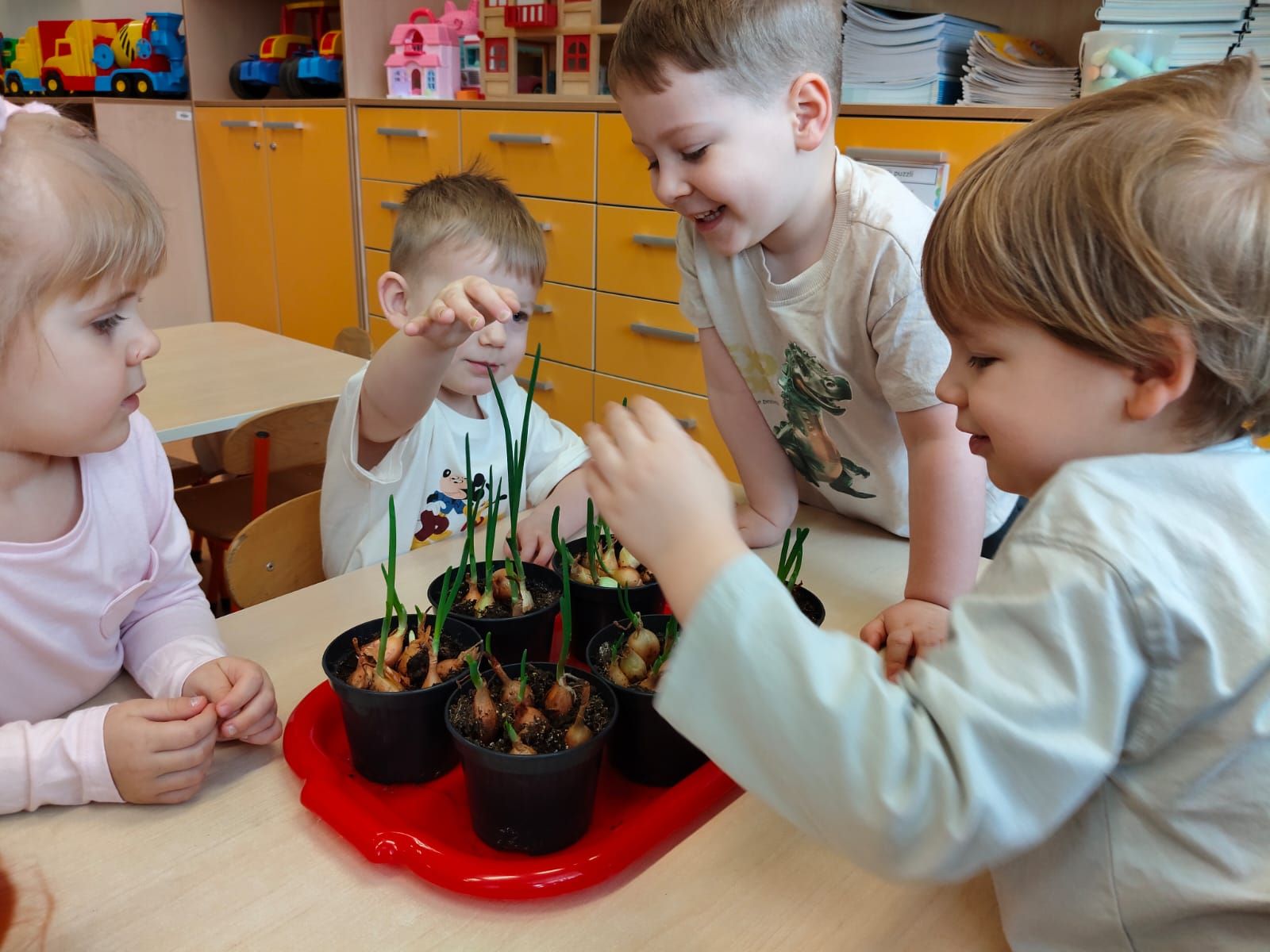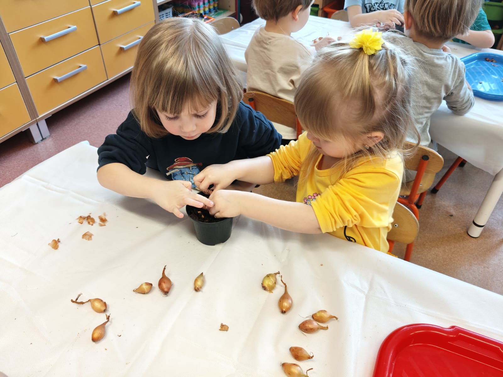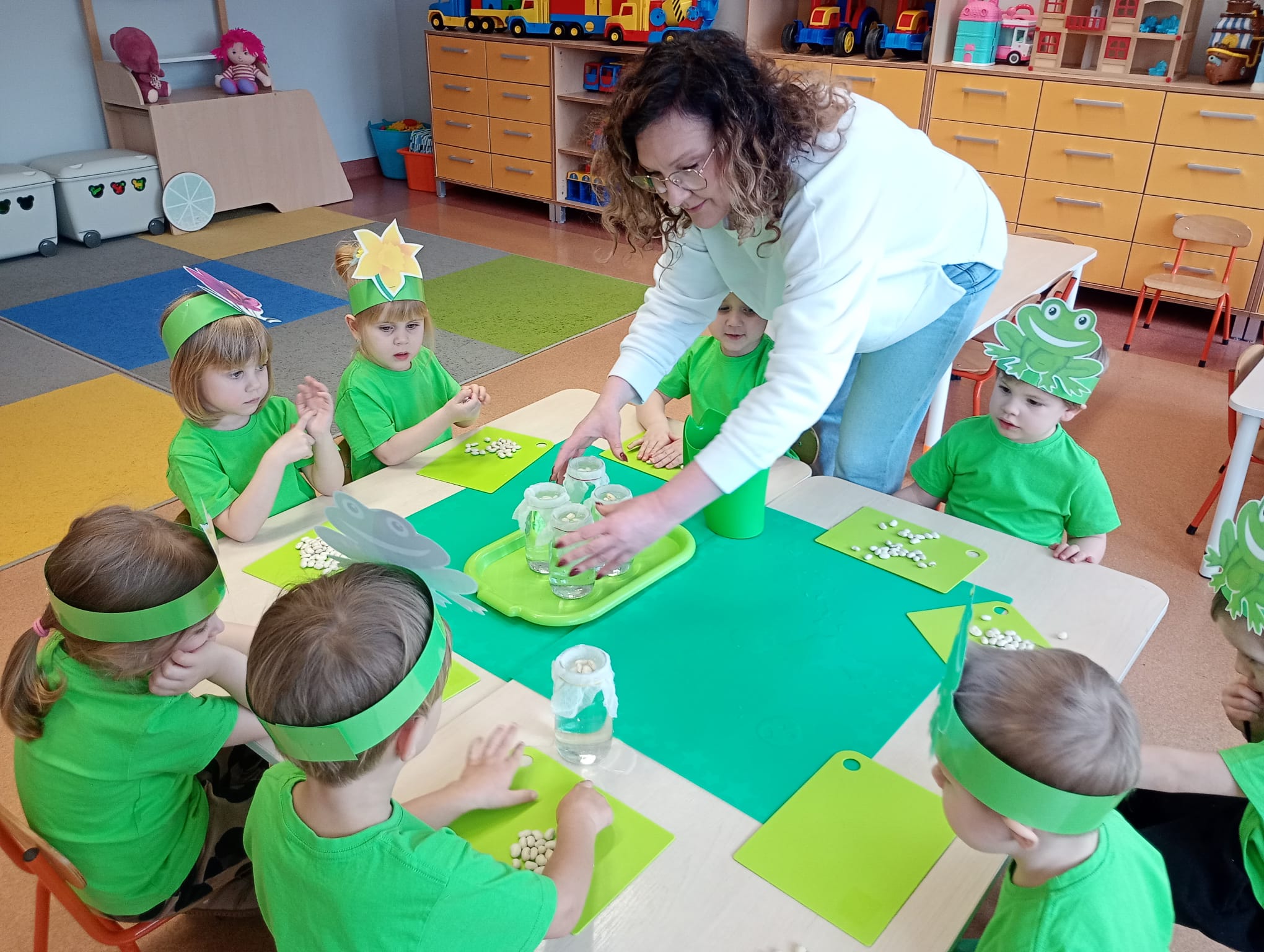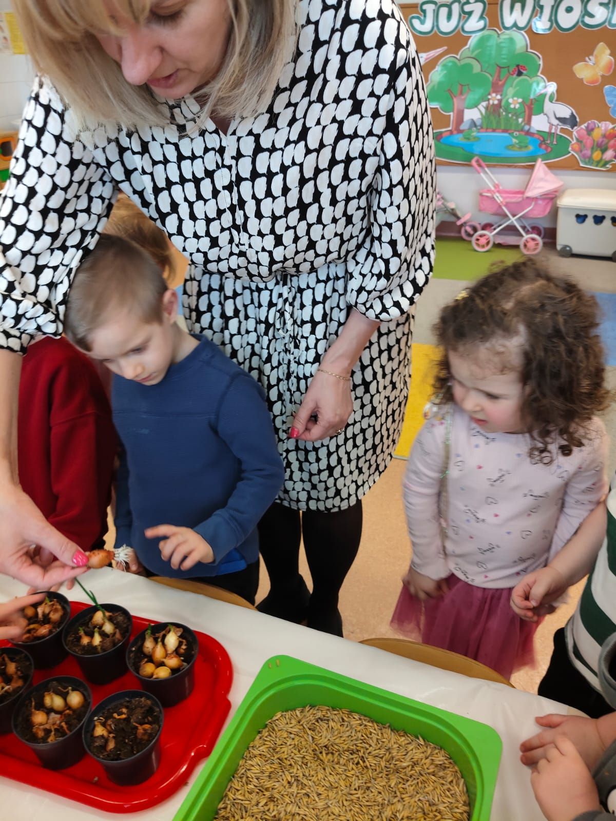 Wraz z nadejściem wiosny z powodzeniem założyliśmy zielony kącik na parapecie okiennym. Dzieci przy niewielkiej pomocy, przygotowały niezbędny warsztat pracy tj.: ziemię, nasiona, cebulki, wodę. Następnie samodzielnie zasiały nasiona rzeżuchy w pojemniczkach z namoczoną watą, w słoiczkach z wodą na gazie ziarenka fasoli, a w pojemniczkach z ziemią zasadziły cebulki i kolorowe bratki. Założone uprawy dzieci pielęgnowały, podlewał oraz każdego dnia obserwowały zmiany zachodzące w roślinach, zauważały kiełkowanie, wzrost łodyg, liści, dowiedziały się, co jest potrzebne roślinom do wzrostu. Miały możliwość zapoznania się z różnymi rodzajami nasion oraz dowiedziały jakie są sposoby uprawy roślin i ich pielęgnacji. Od momentu zakładania zielonego ogródka, doświadczały wielu wrażeń zmysłowych. Przygotowanie podłoża, dotykanie różnych części roślin, czynności pielęgnacyjne – to stymulacja zmysłu dotyku. Przy sprawdzaniu twardości nasion, przy sadzenie aktywowały czucie głębokie. Przyglądanie się efektom hodowli, wyszukiwanie zmian i innych ciekawostek pobudzało do pracy zmysł wzroku, nie zapominaliśmy także o zmysłach powonienia i smaku. Uprawa ogródka ziołowego była również naturalną okazją do rozmów z dziećmi o zasadach zdrowego żywienia. Udział w projekcie był dla dzieci wyzwaniem, które stawiało je w roli aktywnych i czujnych obserwatorów otaczającego świata. Rozbudzało zainteresowania, mobilizowało do poszukiwania odpowiedzi na różne pytania, uczyło twórczego myślenia i zaspokajało potrzeby poznawcze. Dzieci uczyły się planowania i organizacji pracy, współpracy, pozytywnej komunikacji. Doświadczały radości, satysfakcji, oraz wzmacniały poczucie własnej wartości.